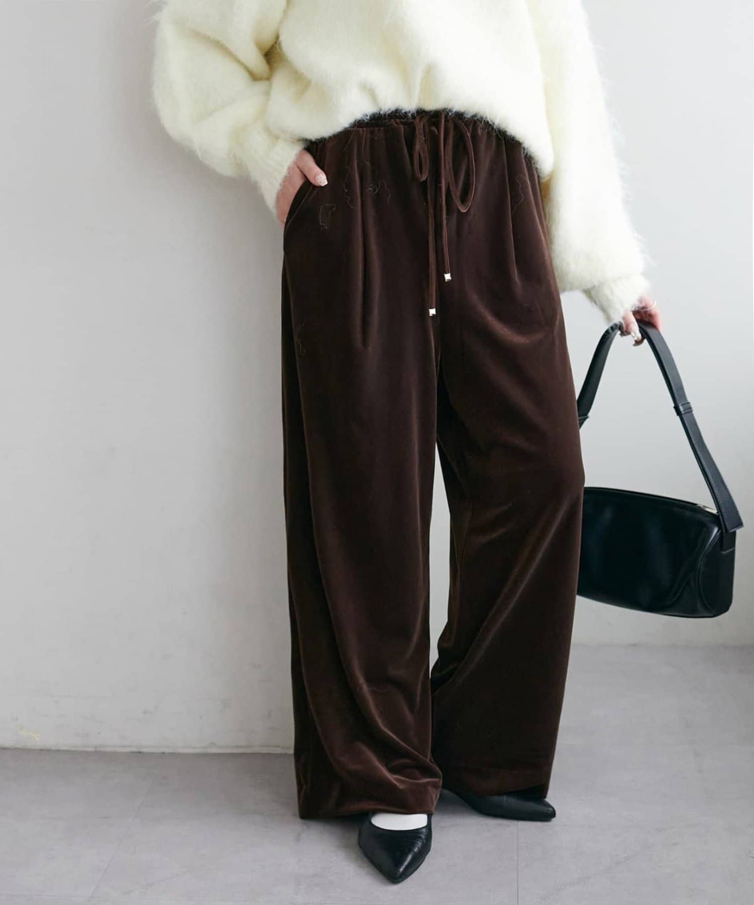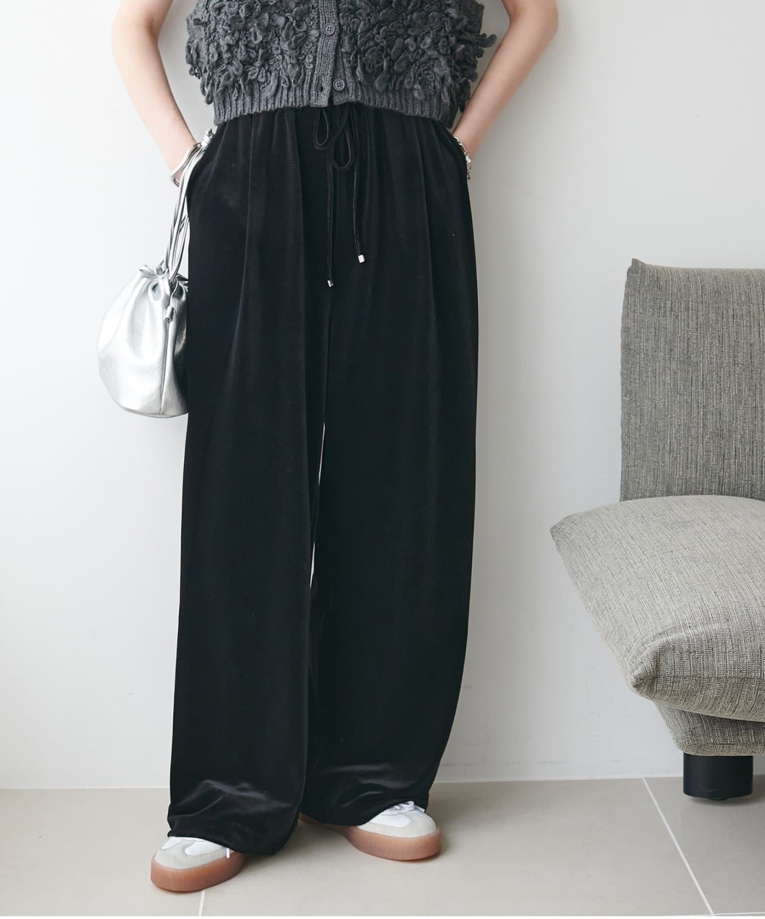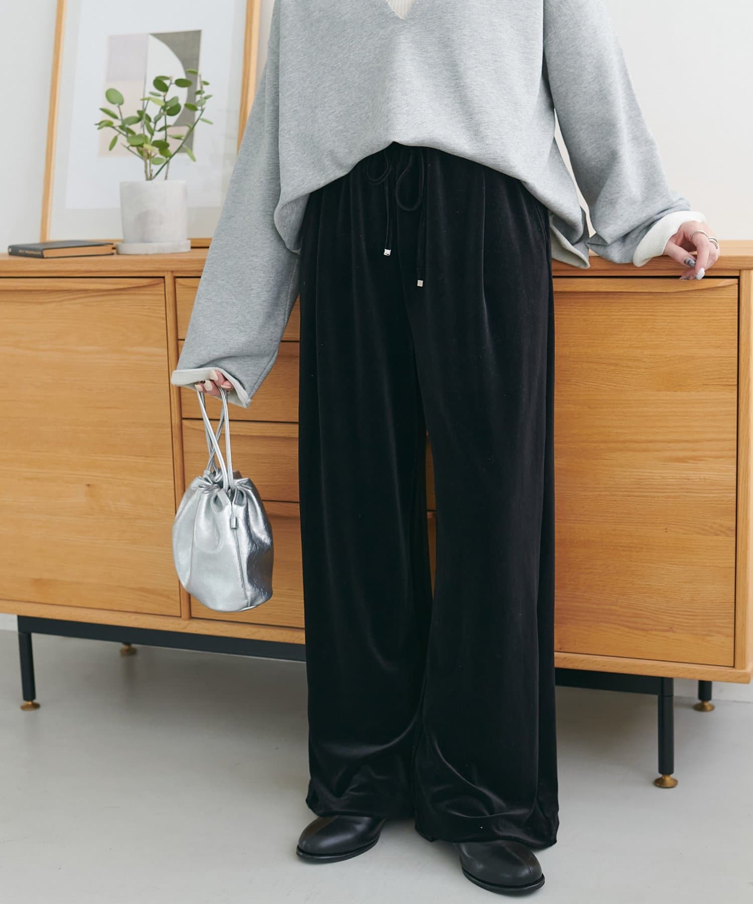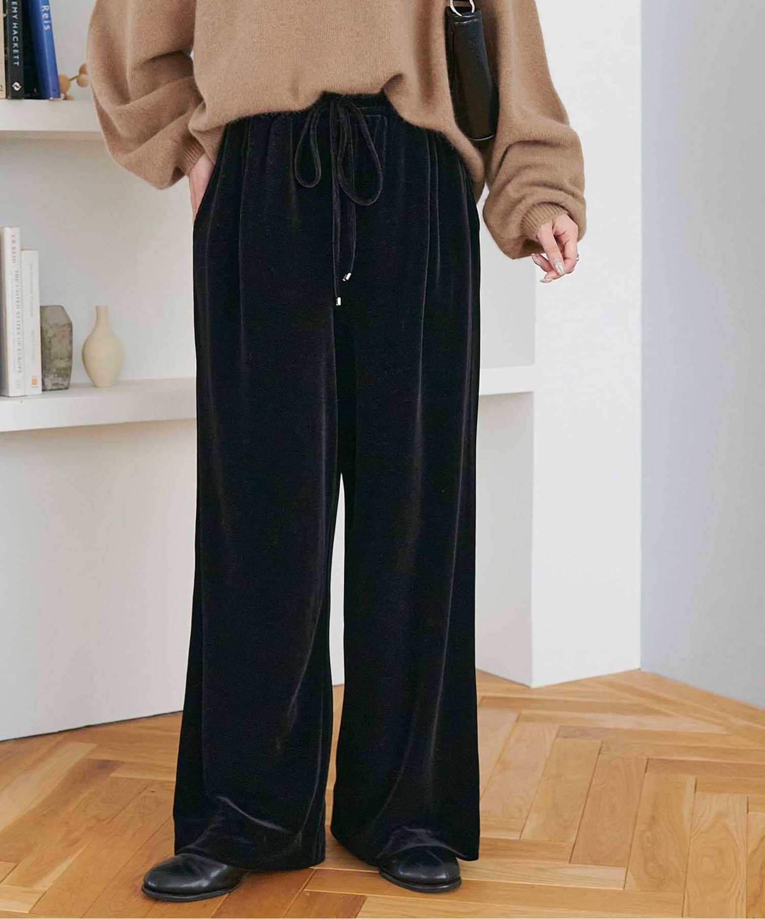 リラックス感のあるシルエットが魅力のベロアワイドパンツ