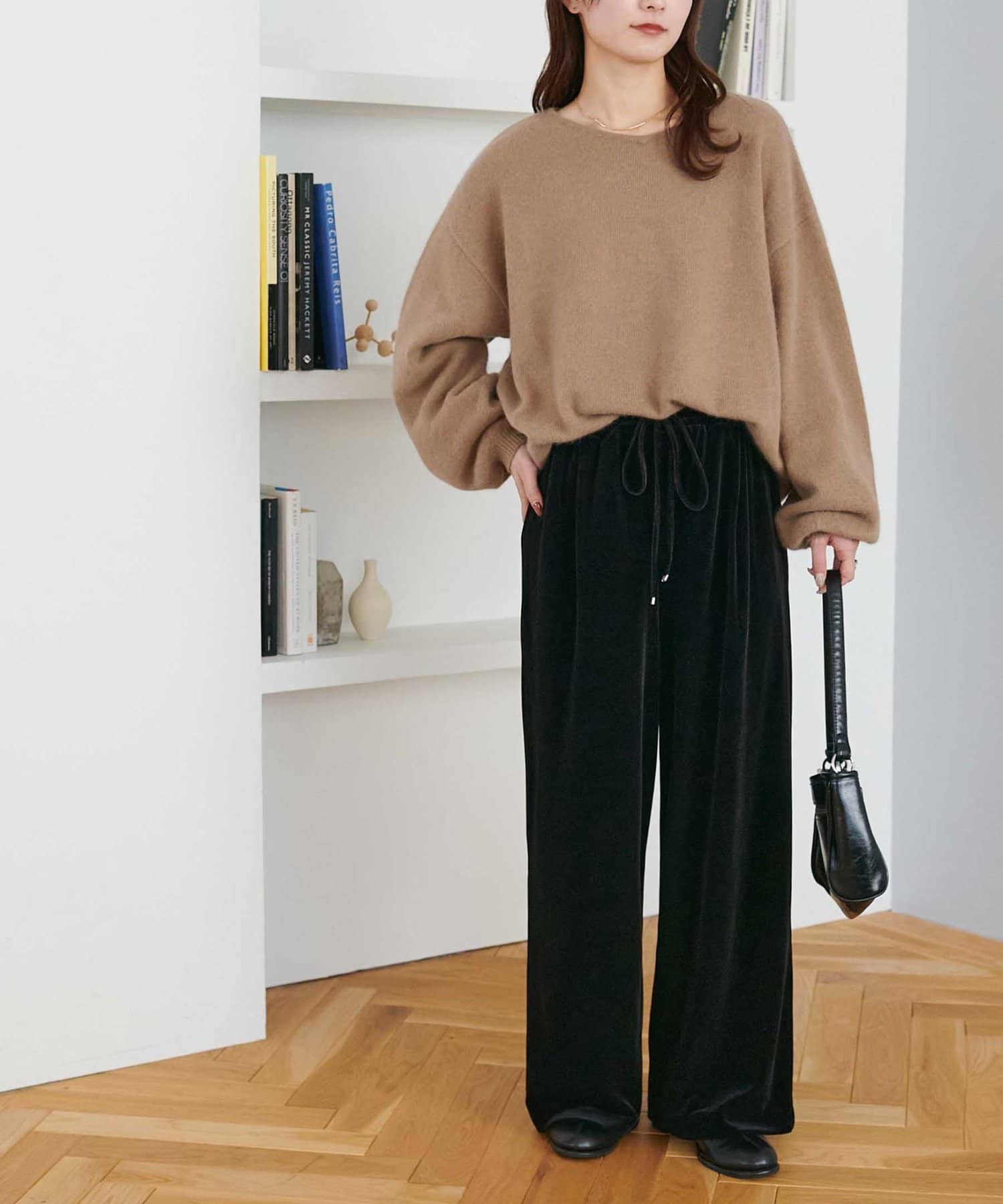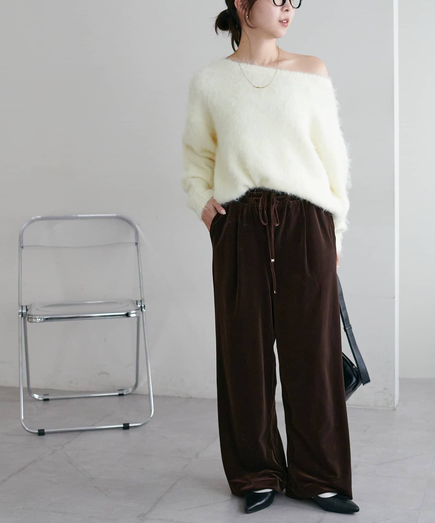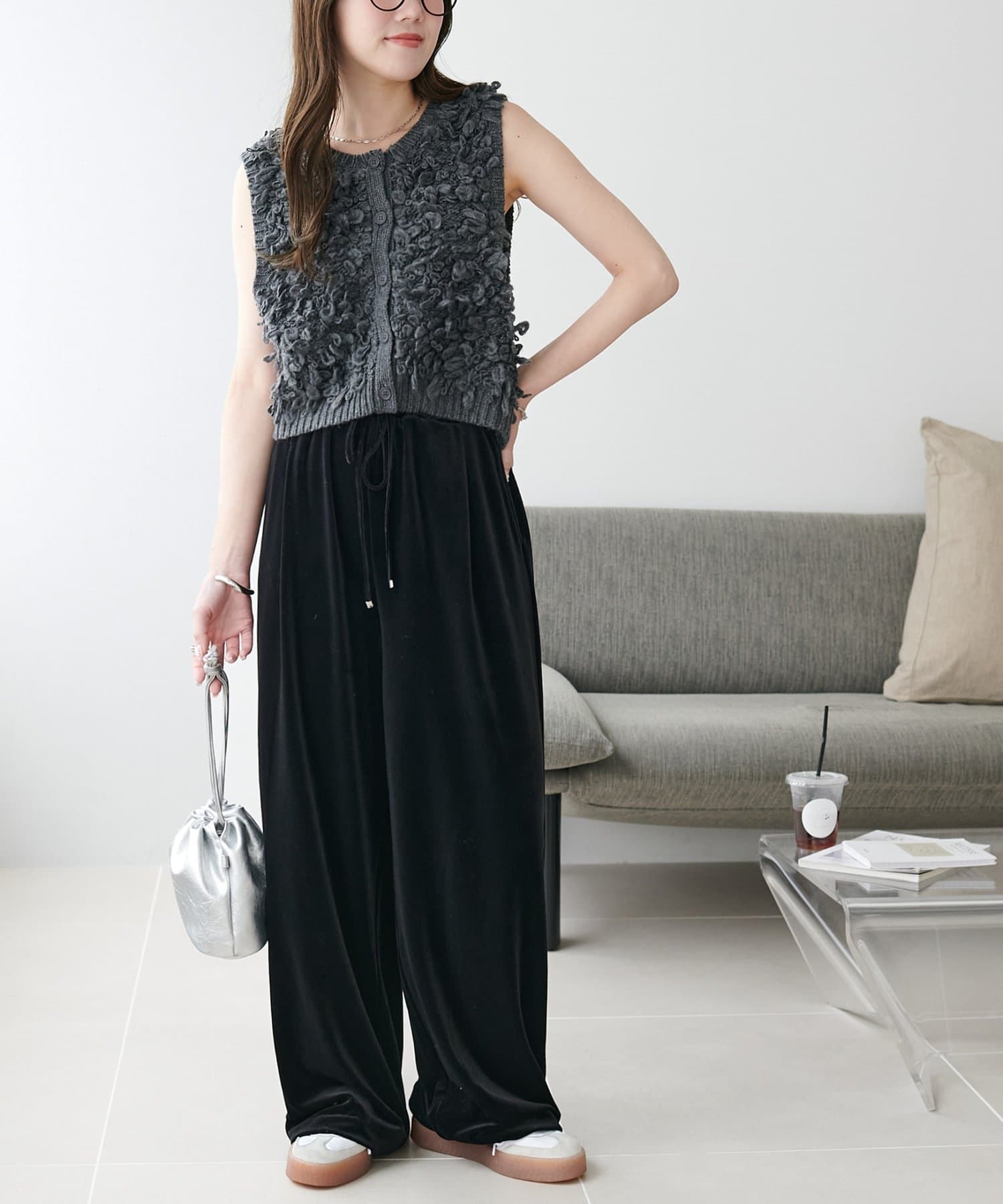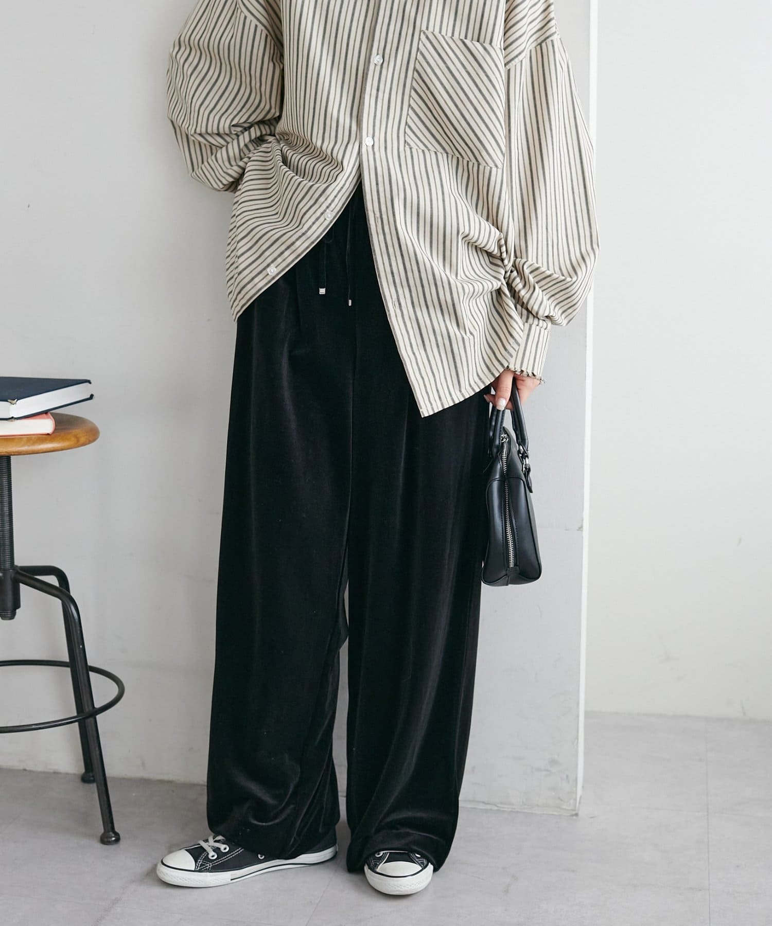 リラックス感のあるシルエットが魅力のベロアワイドパンツ