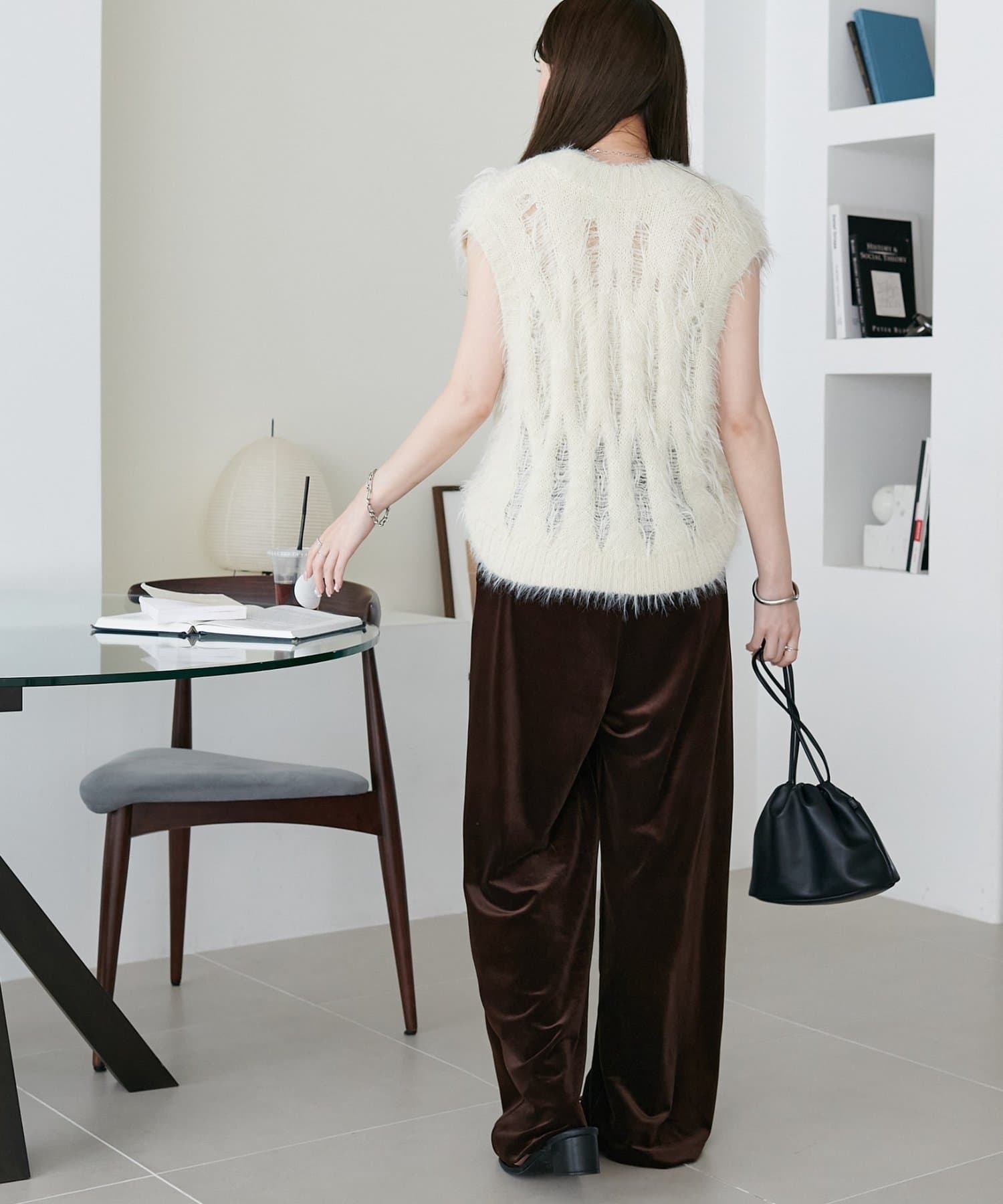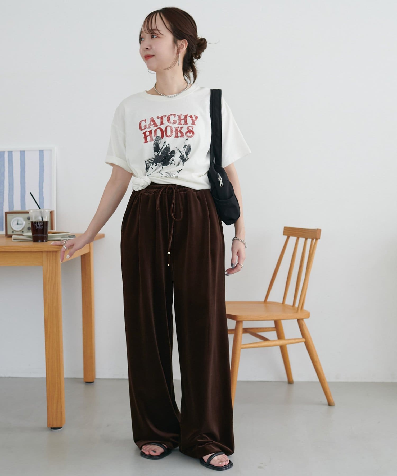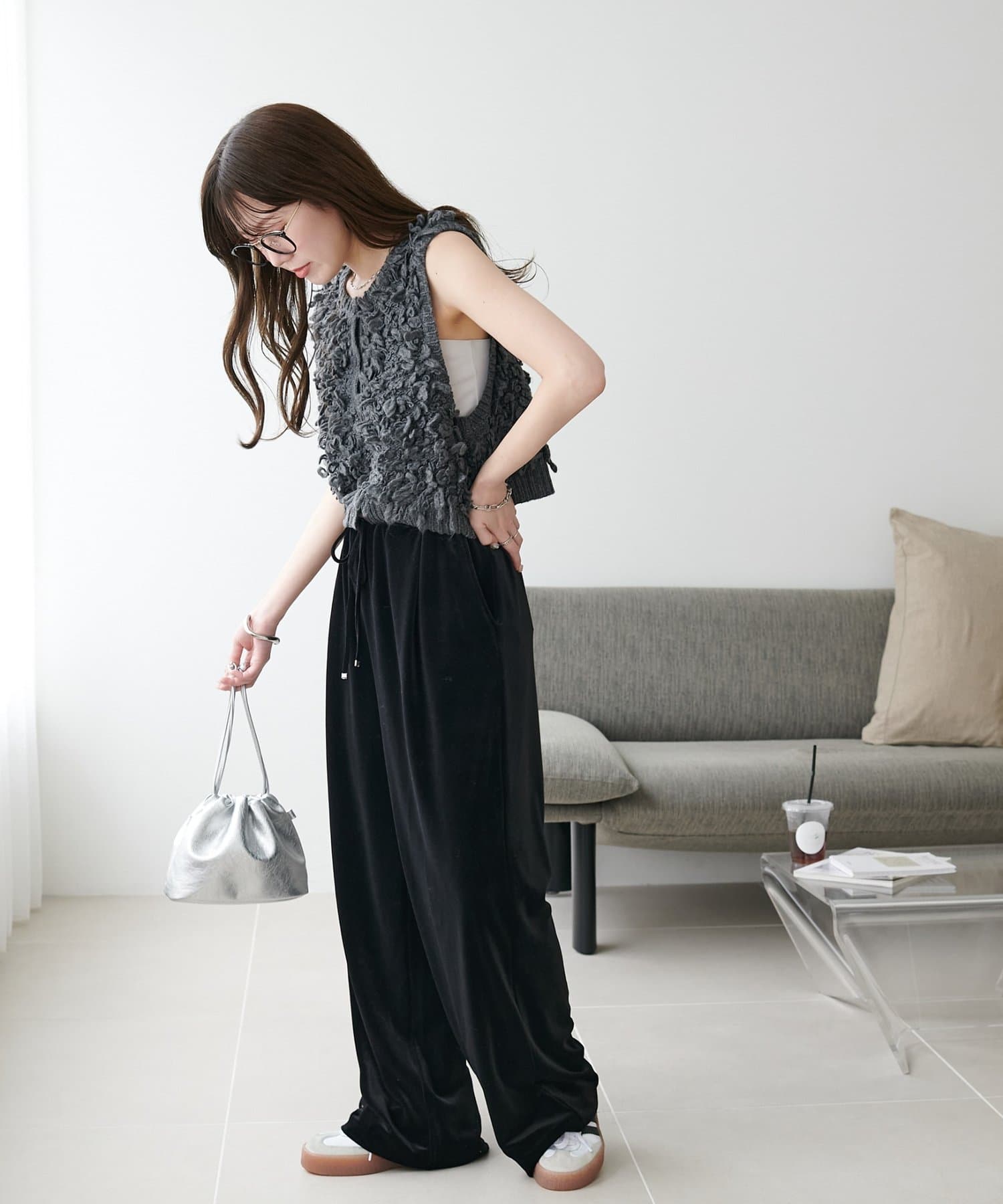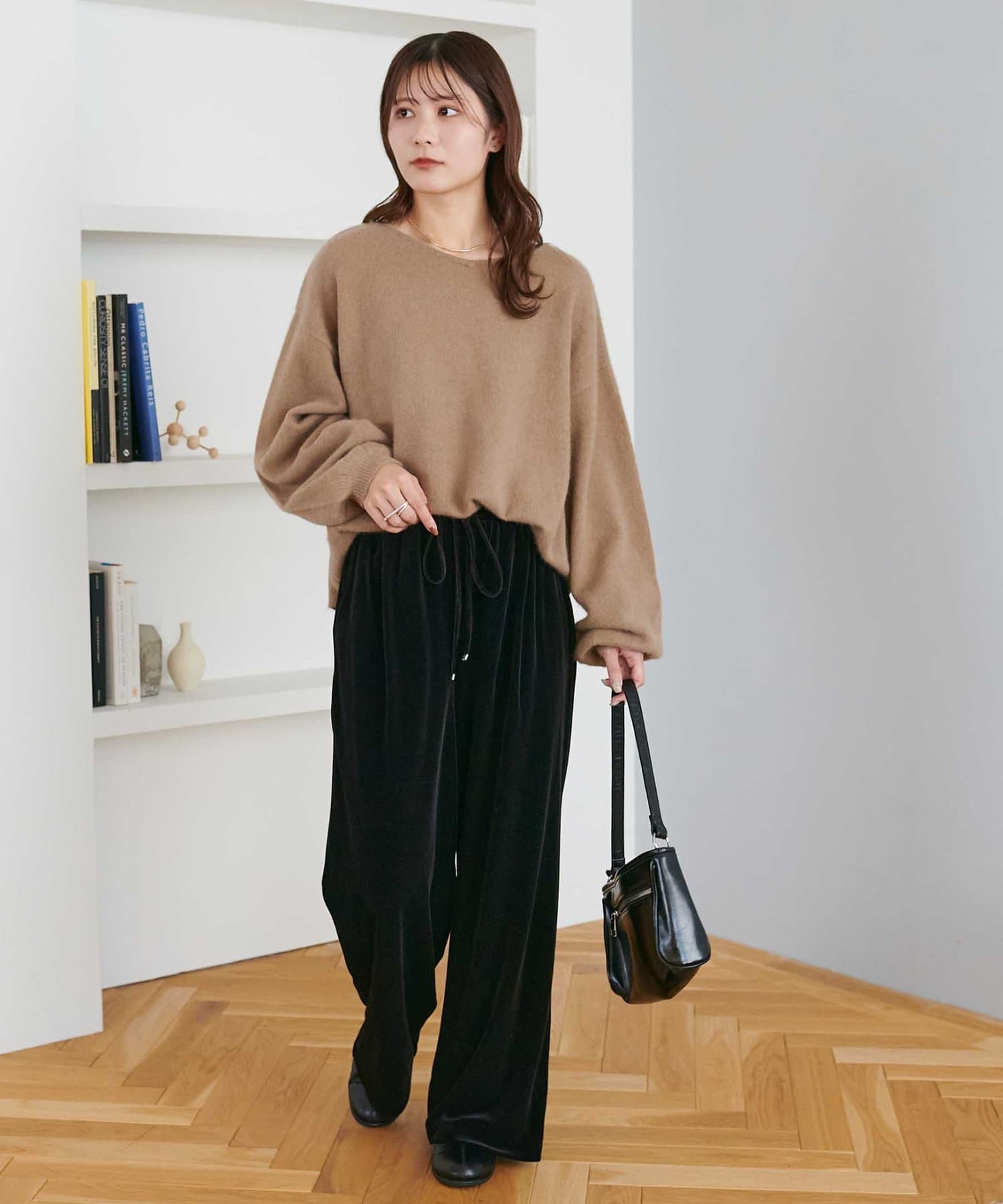 リラックス感のあるシルエットが魅力のベロアワイドパンツ