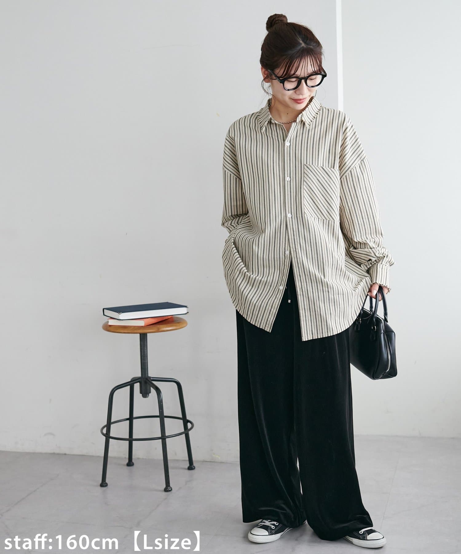 163cmスタッフ(Lサイズ着用):ベロアの程よい光沢感が高見えするアイテム!Tシャツ合わせでもカジュアルになりすぎないが嬉しいです。