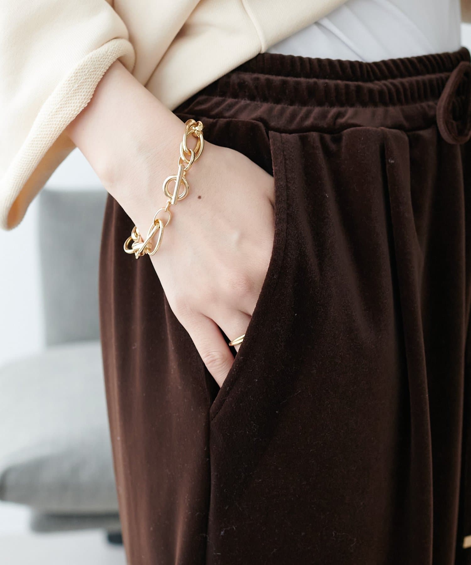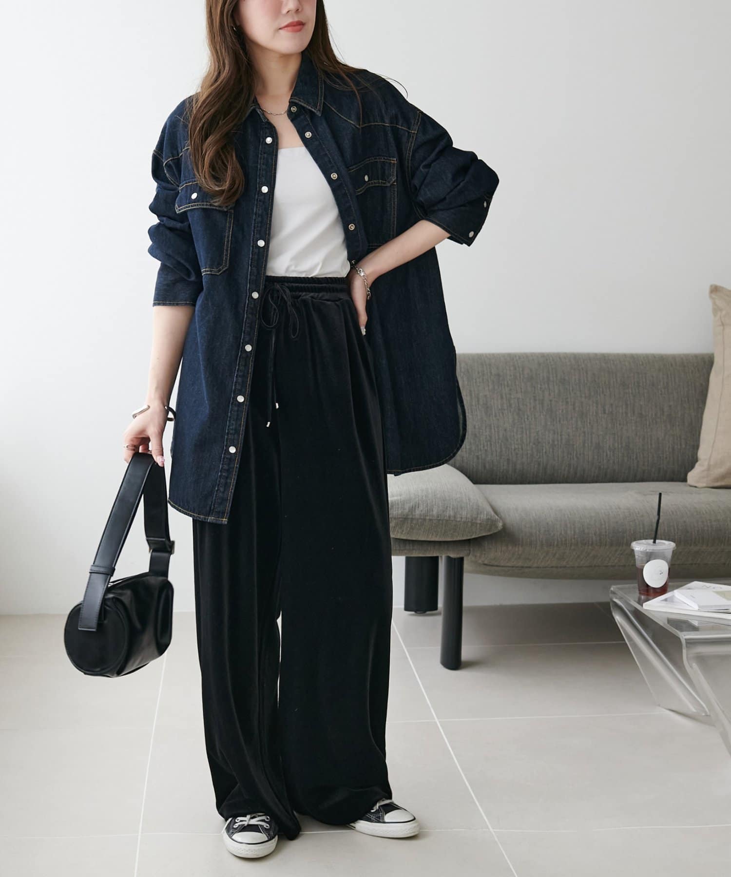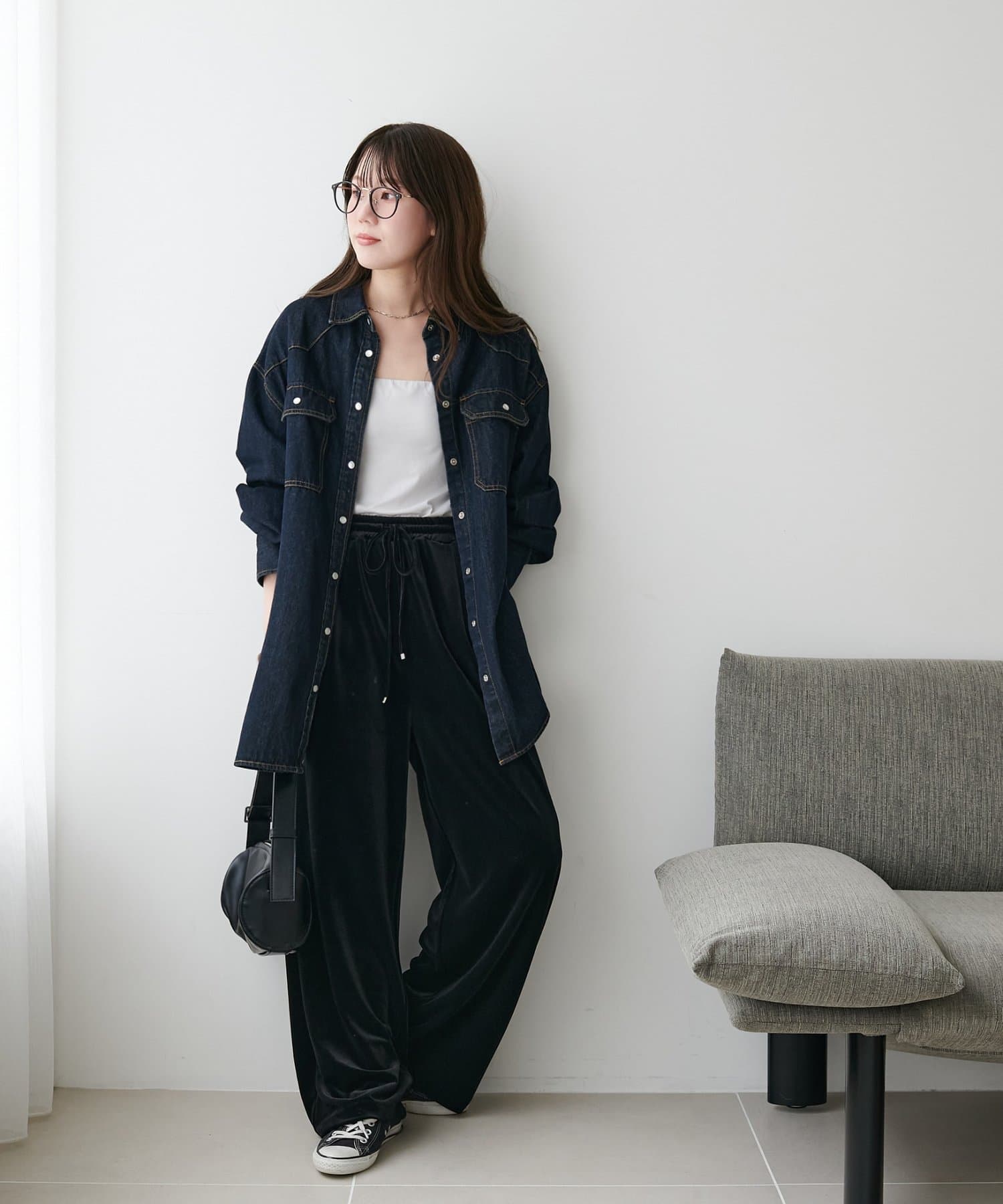 ベロアの艶感があるので、カジュアルアイテムを合わせてもラフすぎず、大人のこなれ感を演出してくれます。