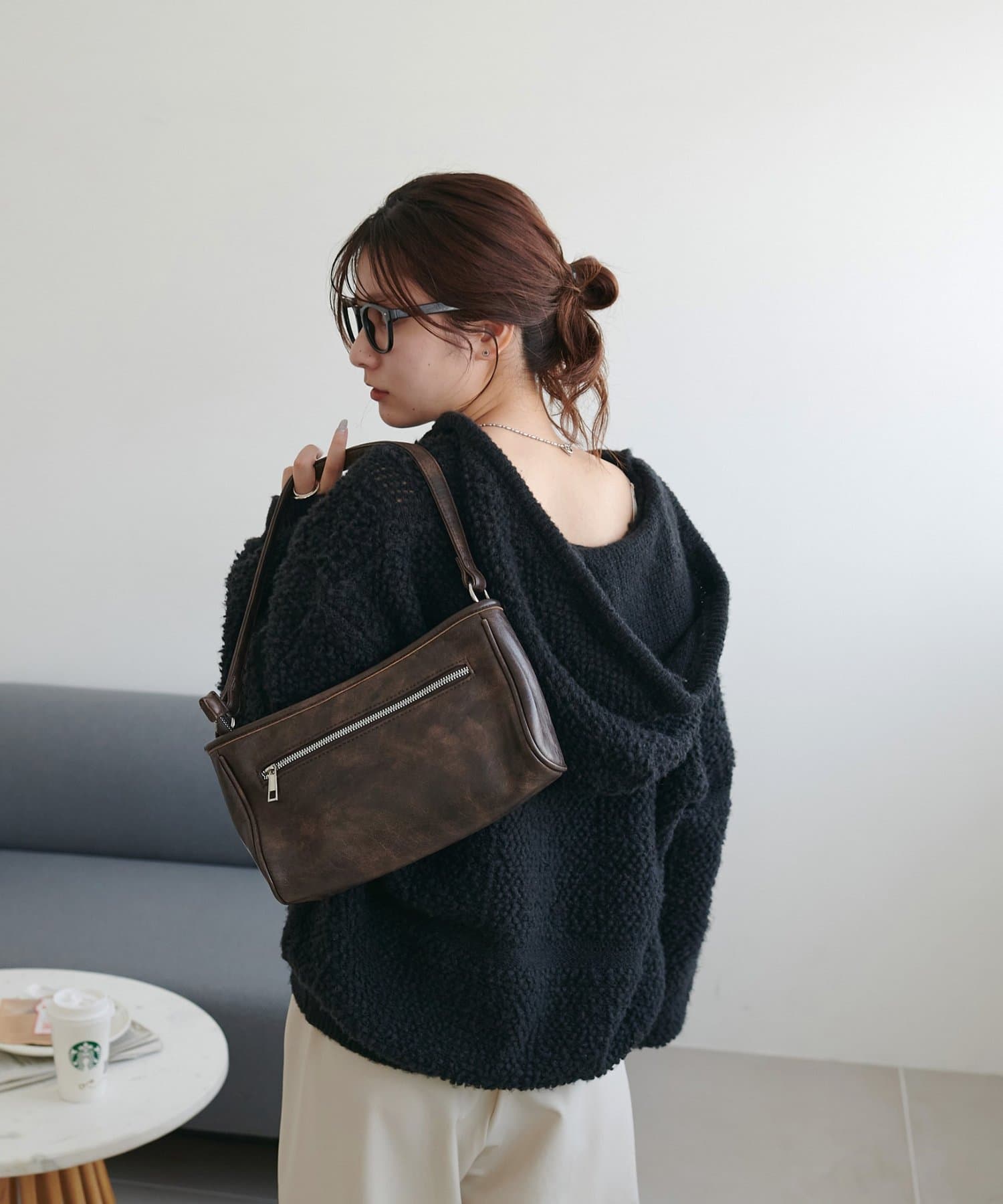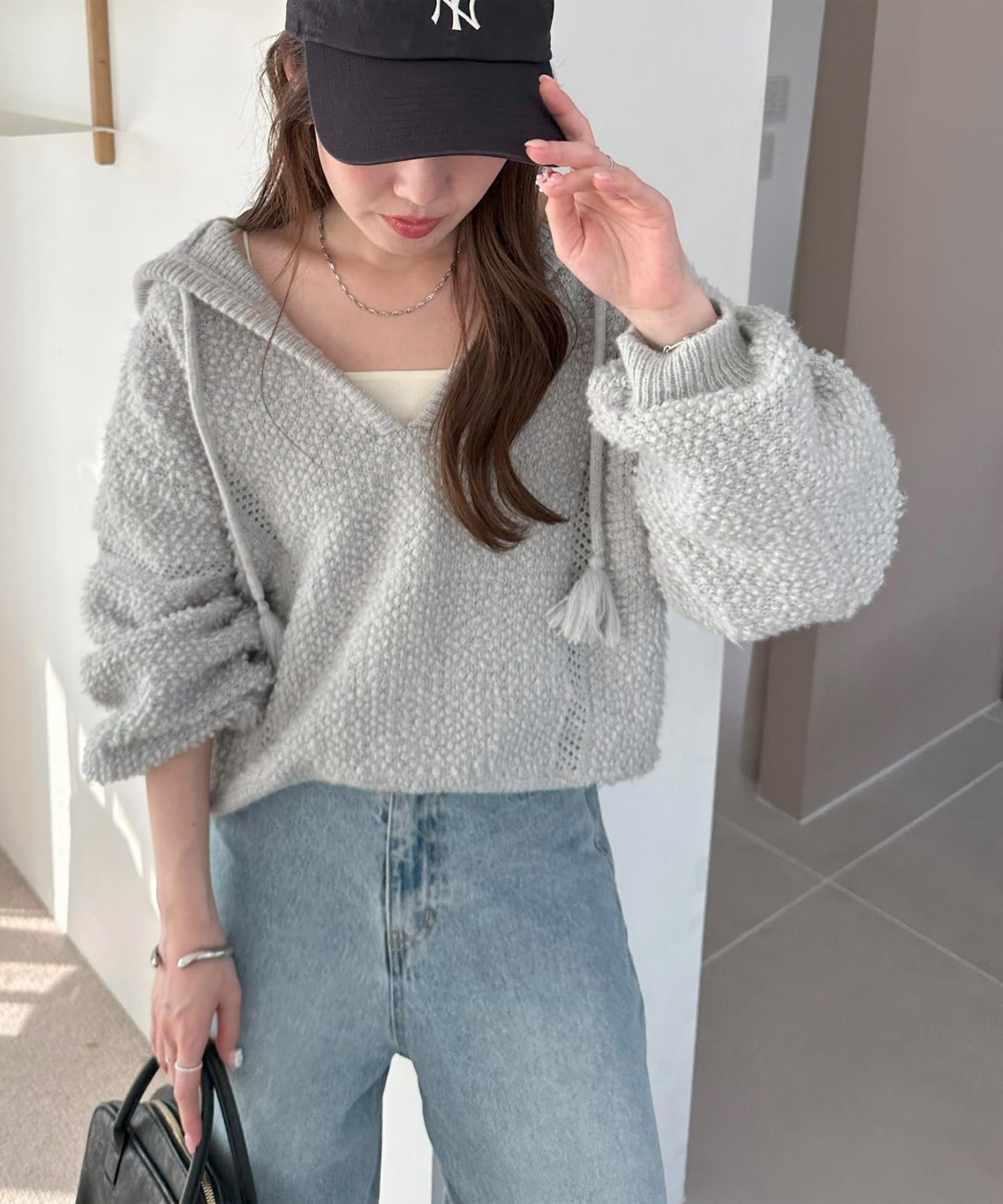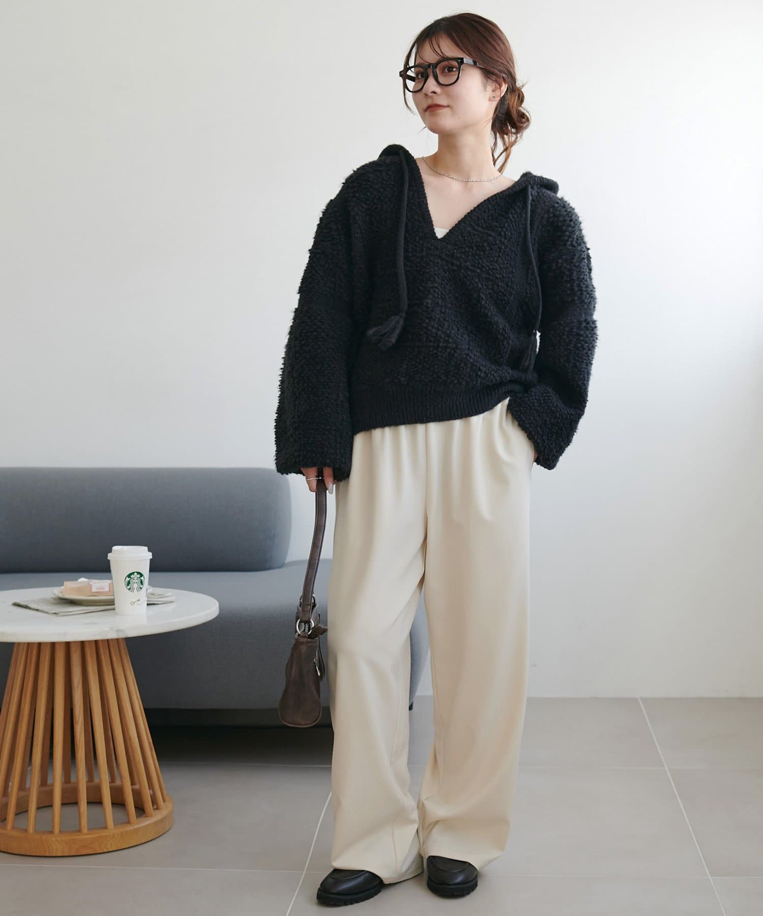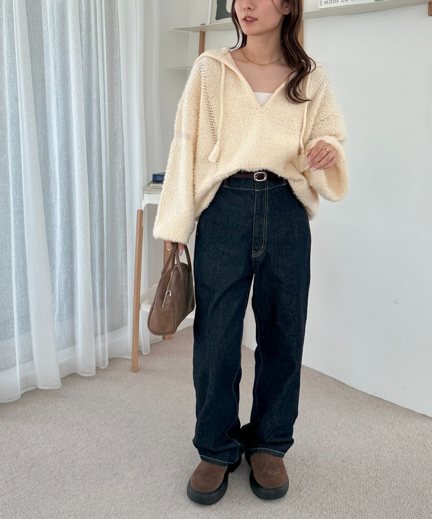 162cmスタッフ:もこもことした表情が可愛くて、着るだけで季節感が出ます♪Vネックのおかげで顔まわりがすっきり見えて、ボリュームのあるシルエットもバランスよく着こなせました。