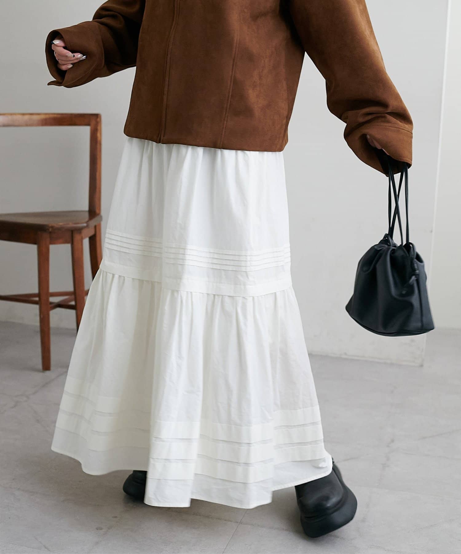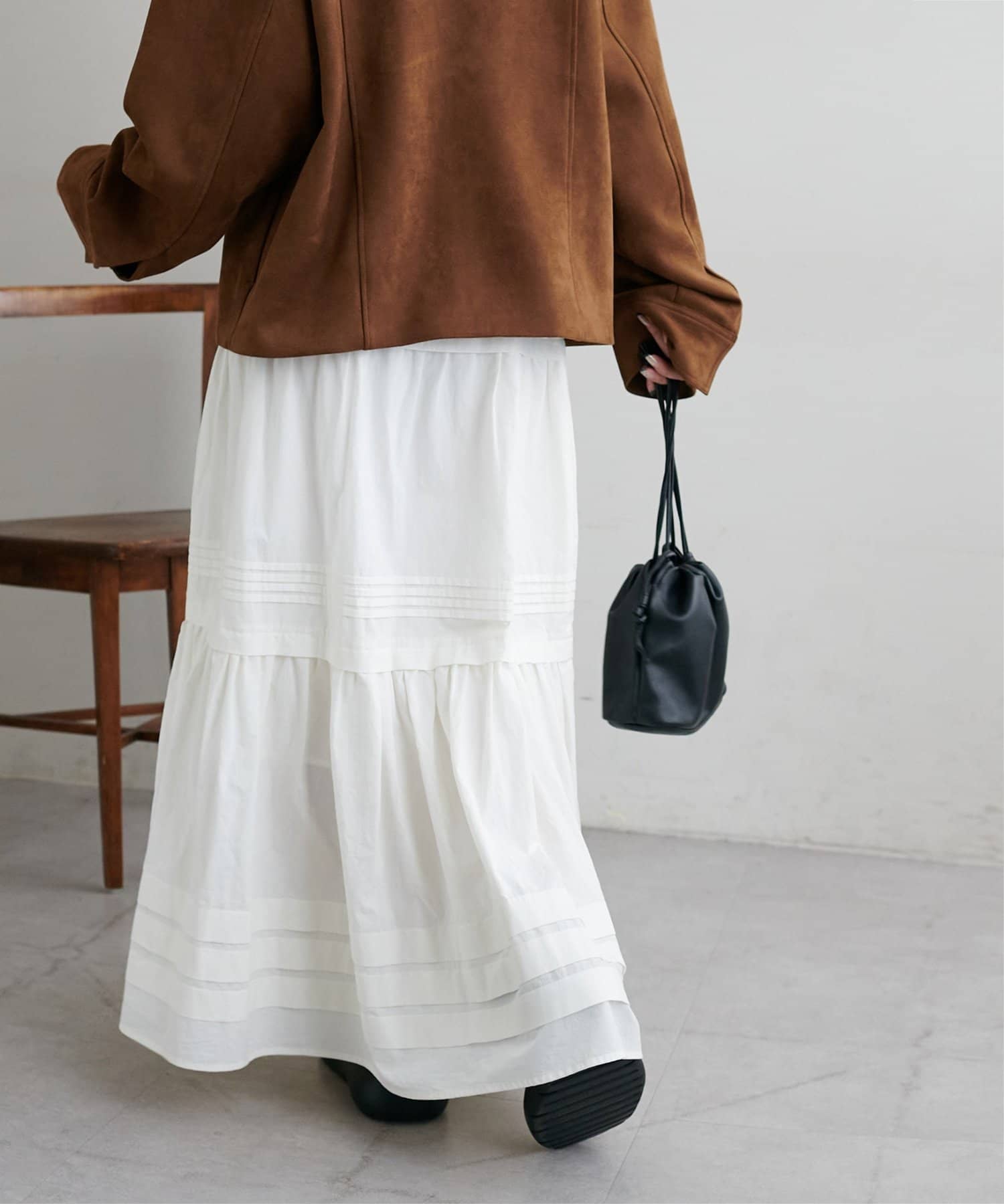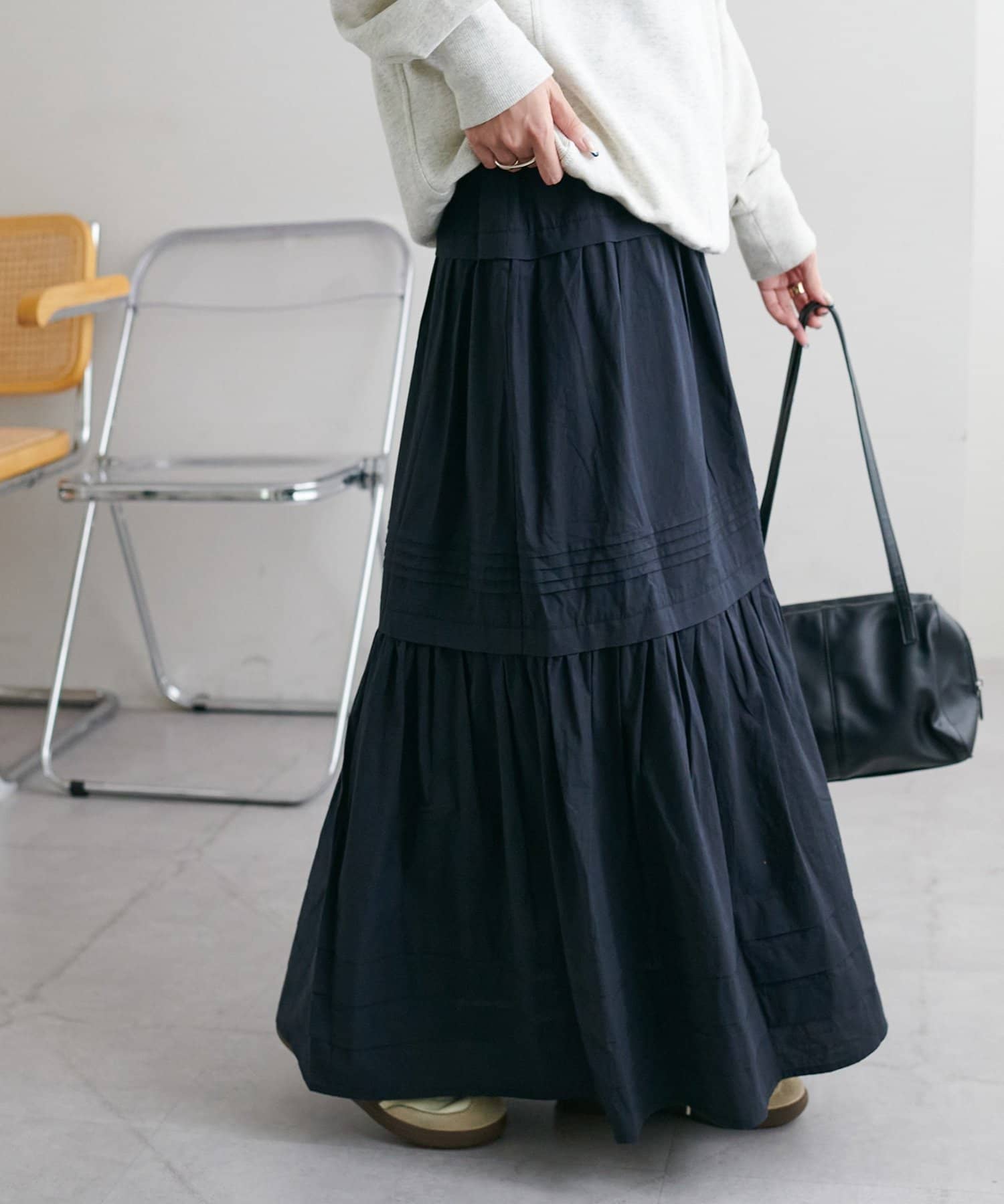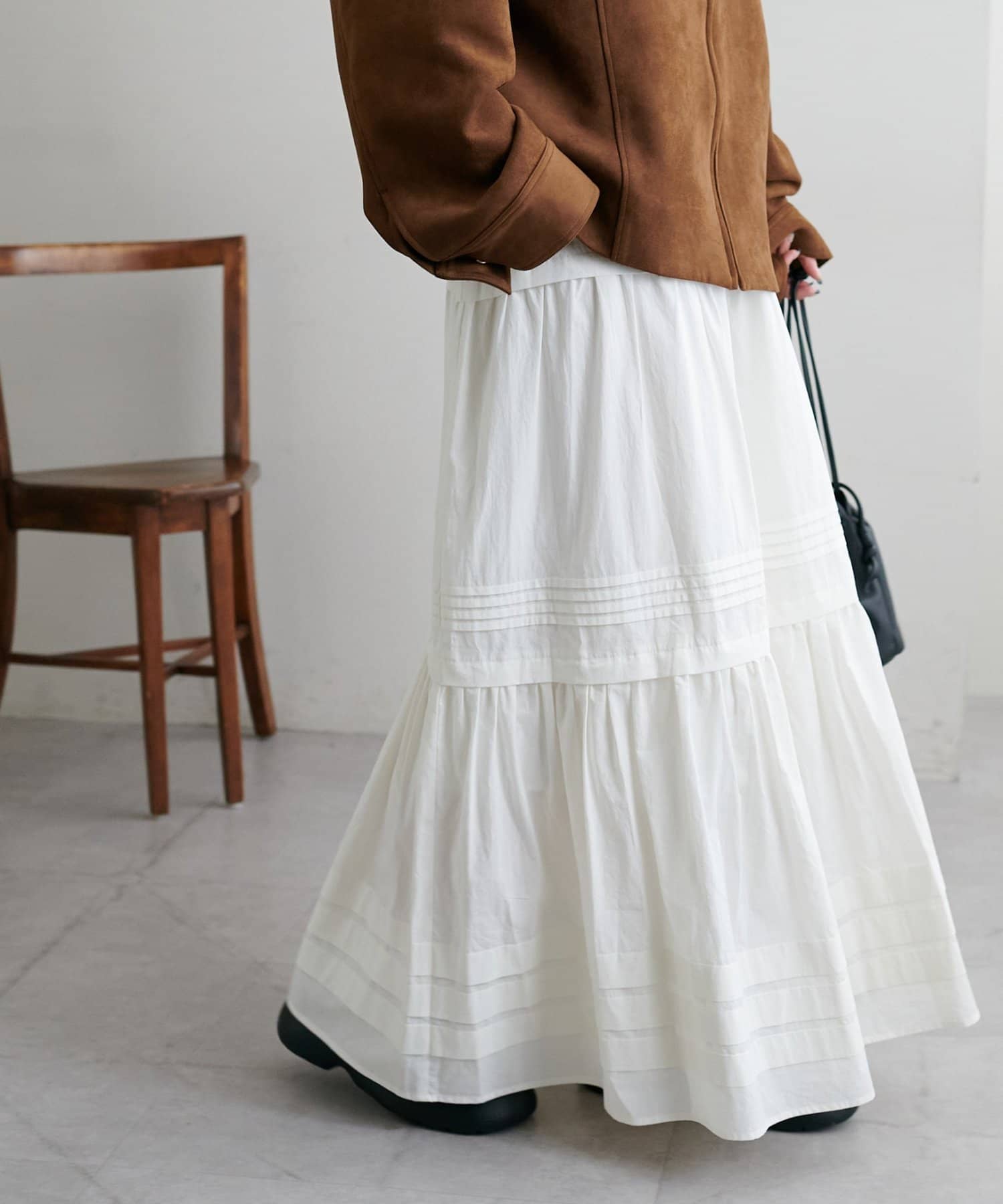 3段に分かれたデザインは、綺麗なAラインを作り、歩くたびに軽やかな印象をプラスします。