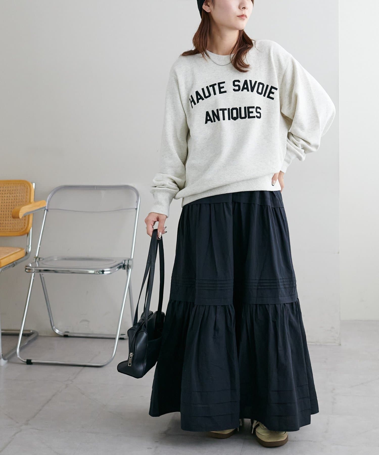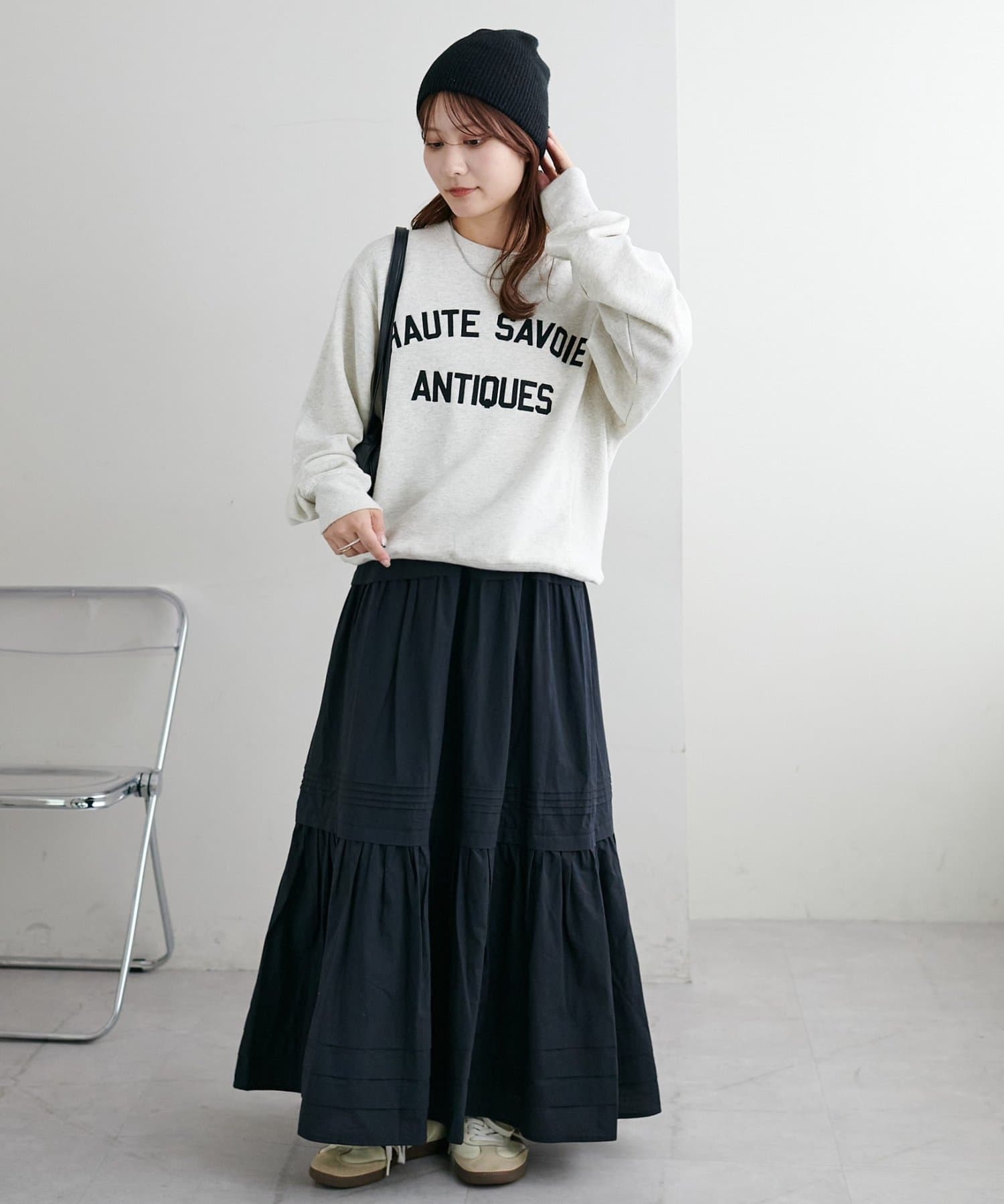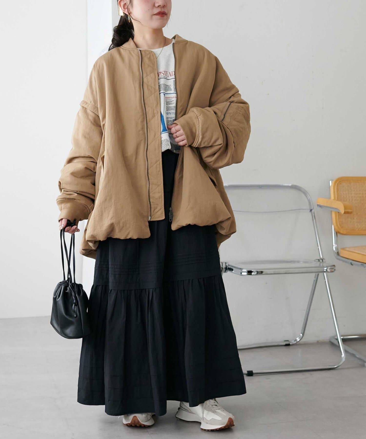 ふわっと広がるシルエットですが、3段切り替えが入っていることでメリハリが出るので、厚さのあるブーツとも合わせやすいです。