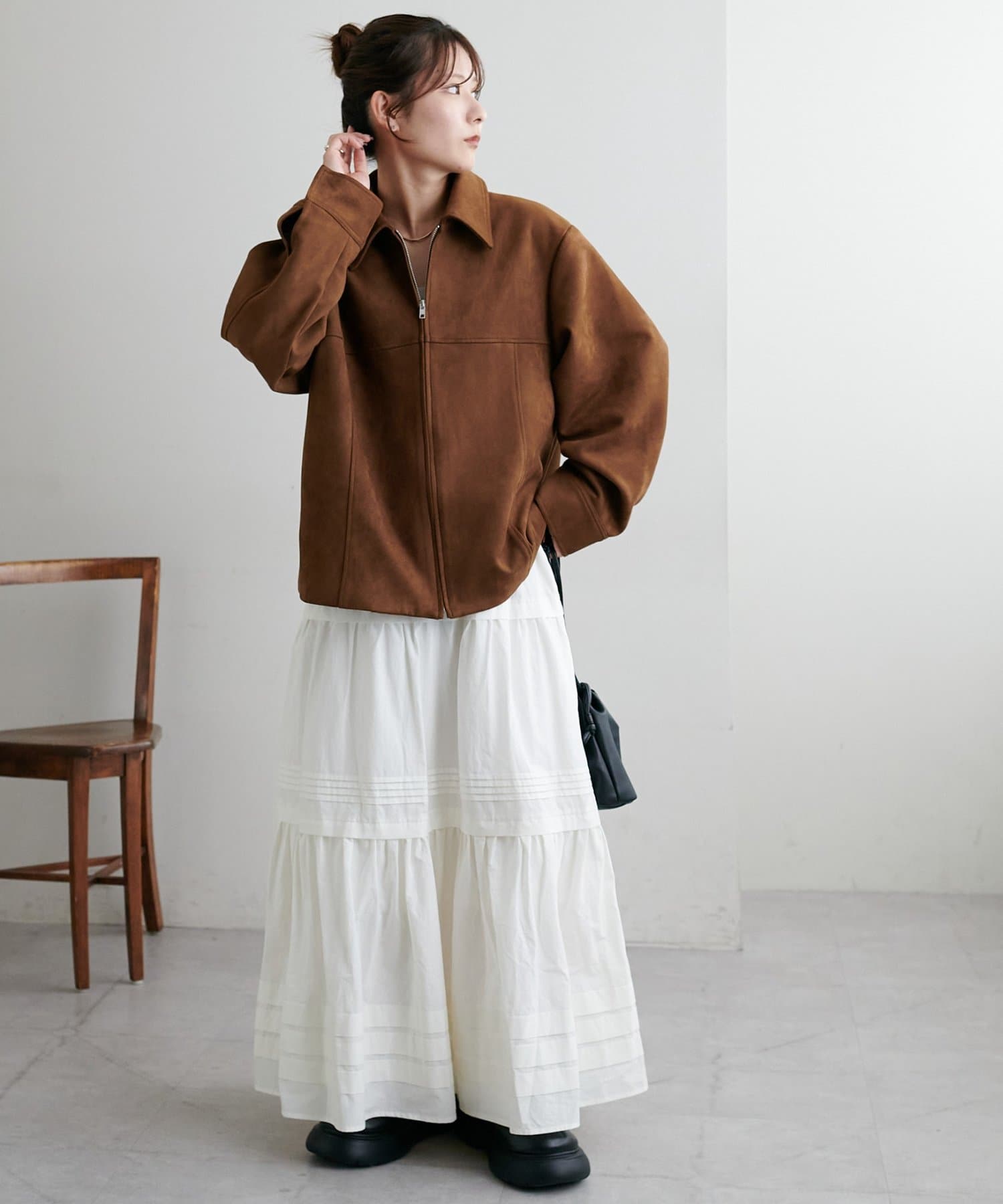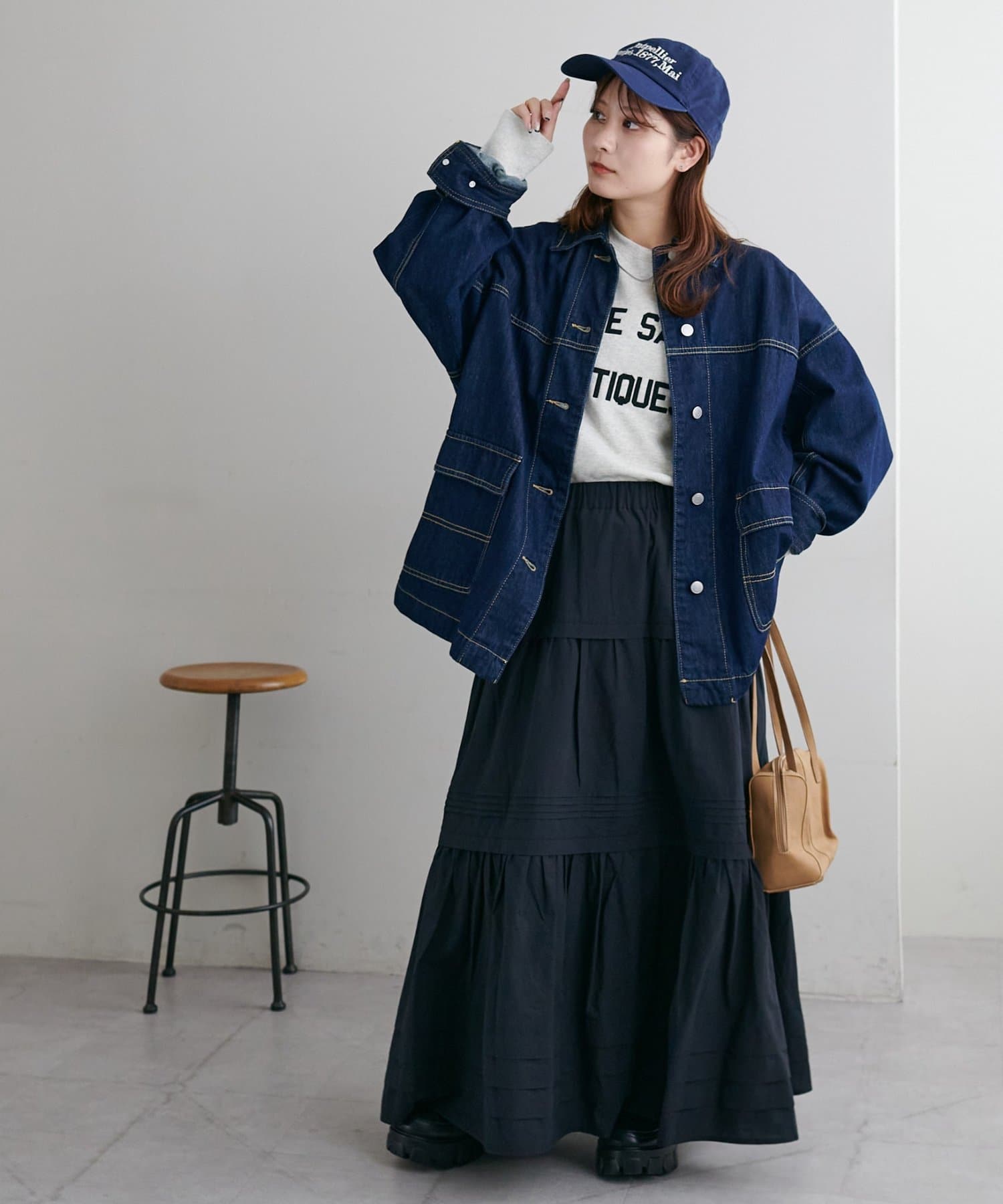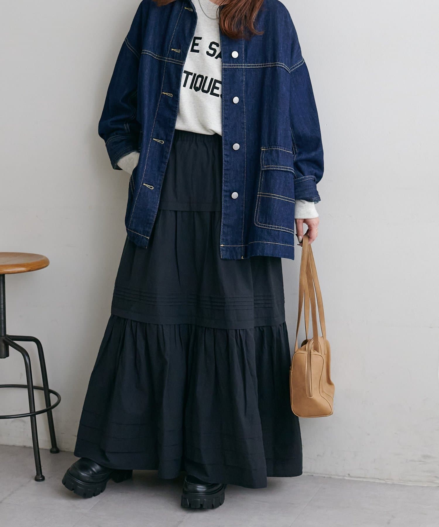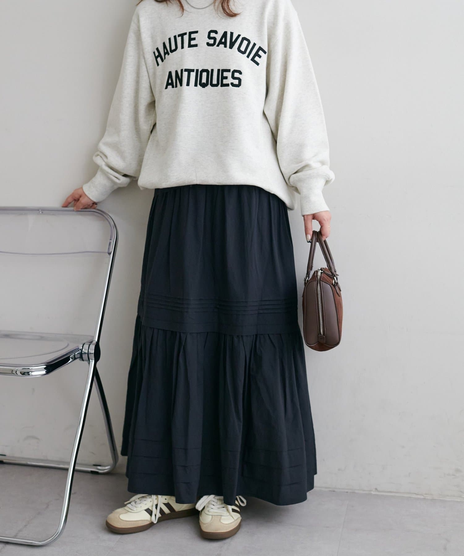 ふわっと広がるシルエットですが、3段切り替えが入っていることでメリハリが出るので、厚さのあるブーツとも合わせやすいです。