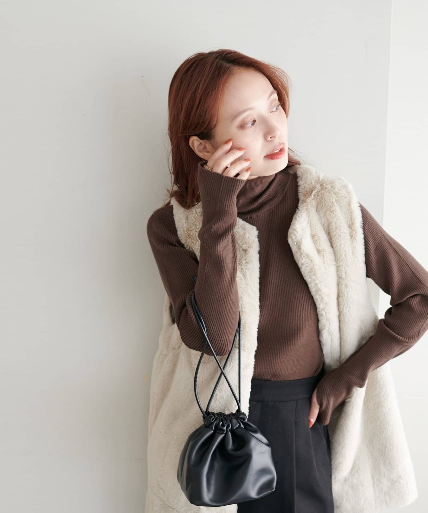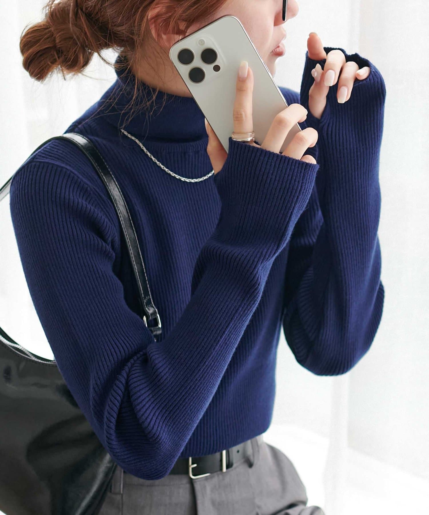 フィンガーホールデザインがアクセントになるリブタートルネック。