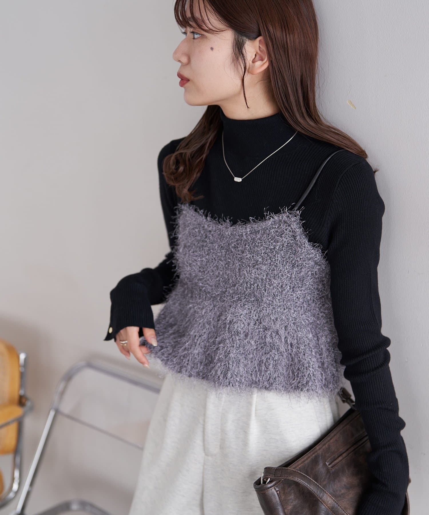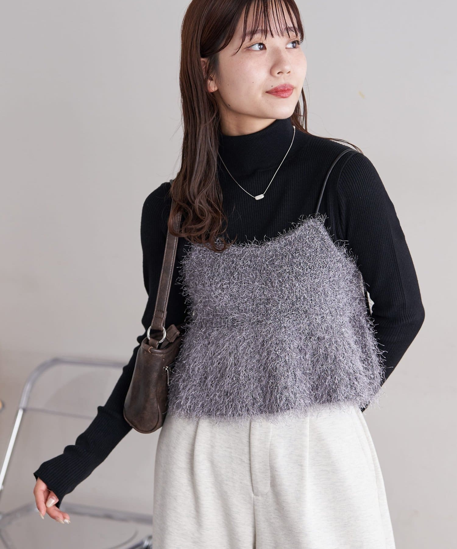 毛足のあるフェザー素材が目を惹くニットキャミ。