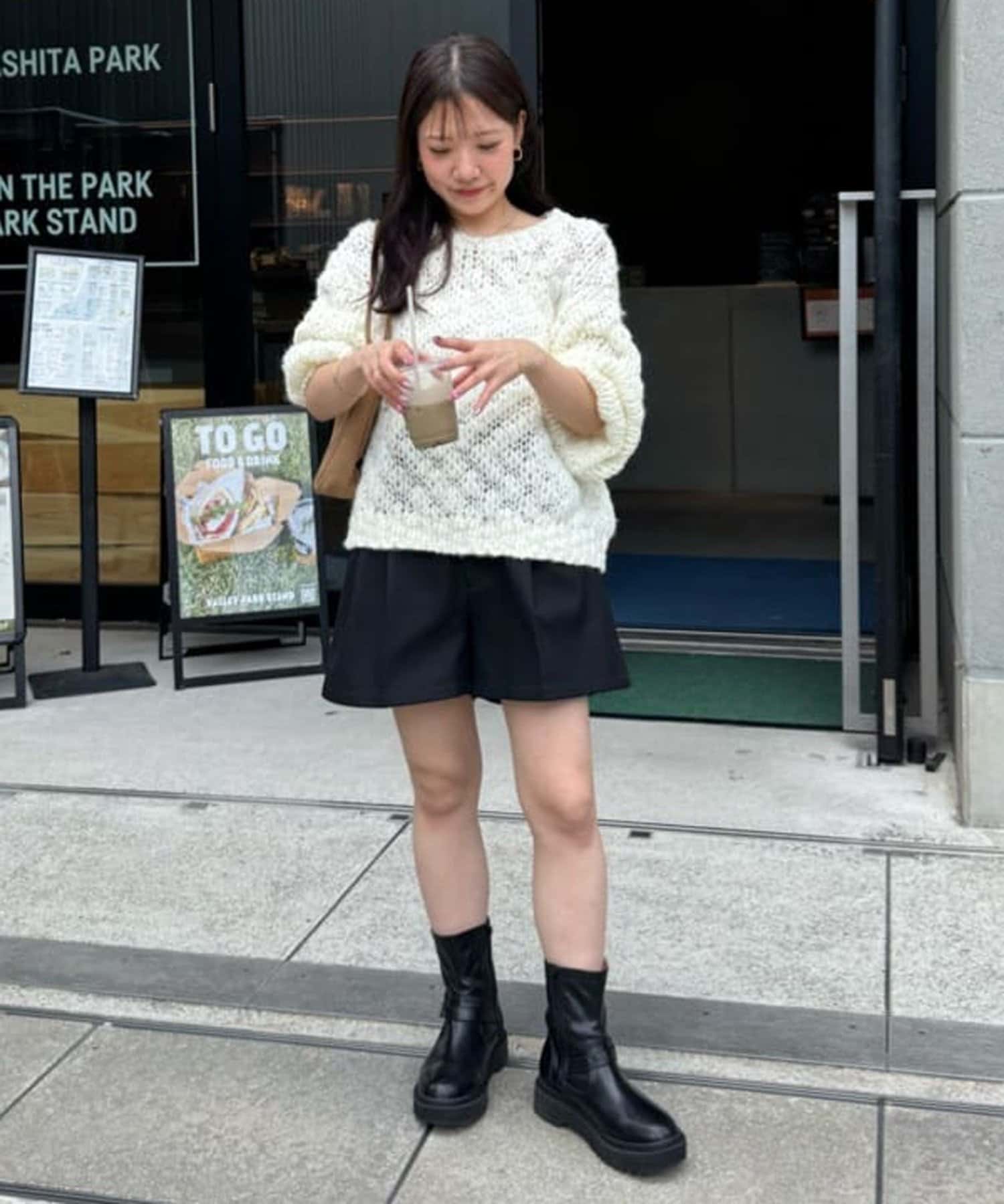 フェミニンに着こなすなら、ミニスカートやプリーツスカートと合わせて柔らかな印象に。