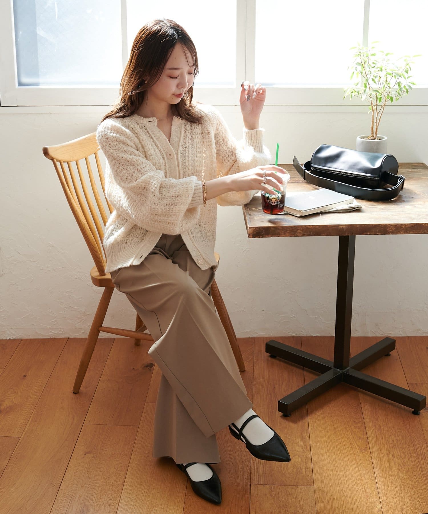 155cmスタッフ:袖を少しまくって手元に抜け感を出すと、全体のバランスがよく見えました。軽くて着心地が良いので、長時間の着用もストレスフリーです!