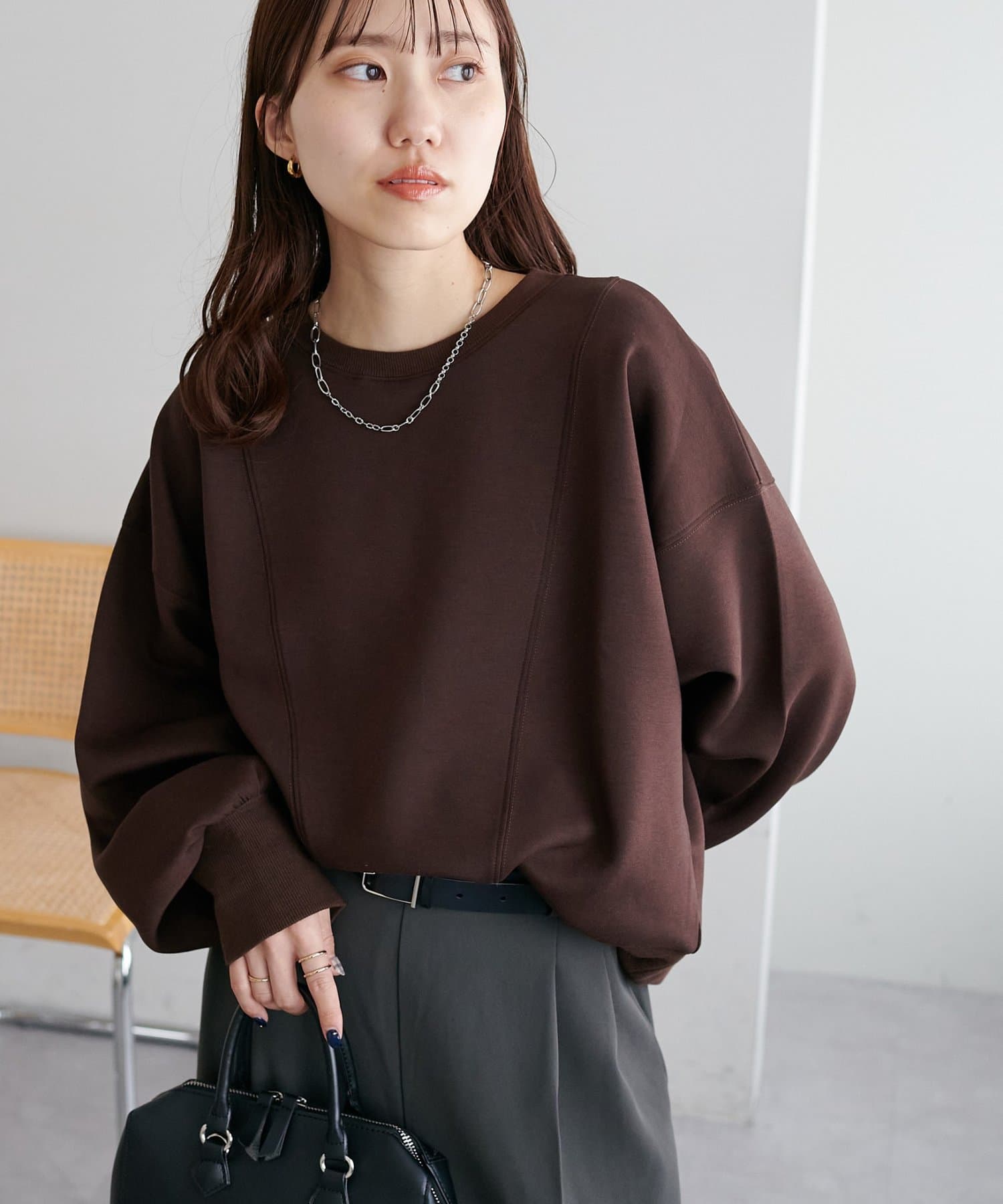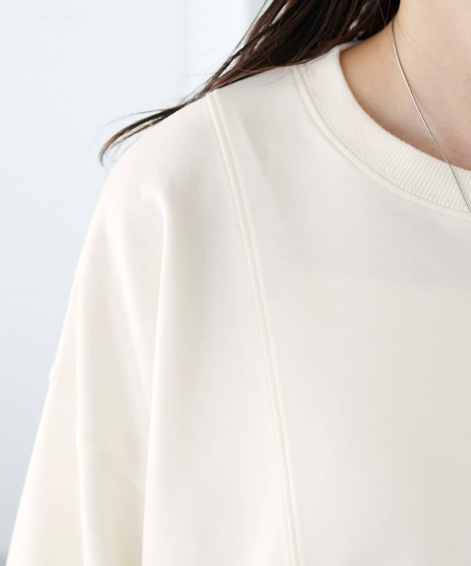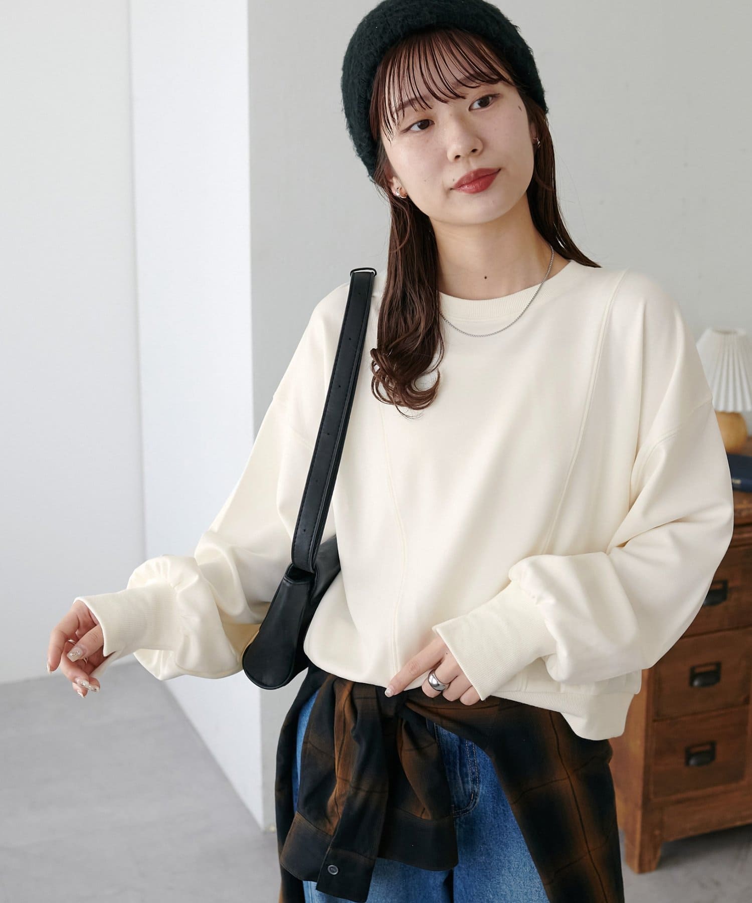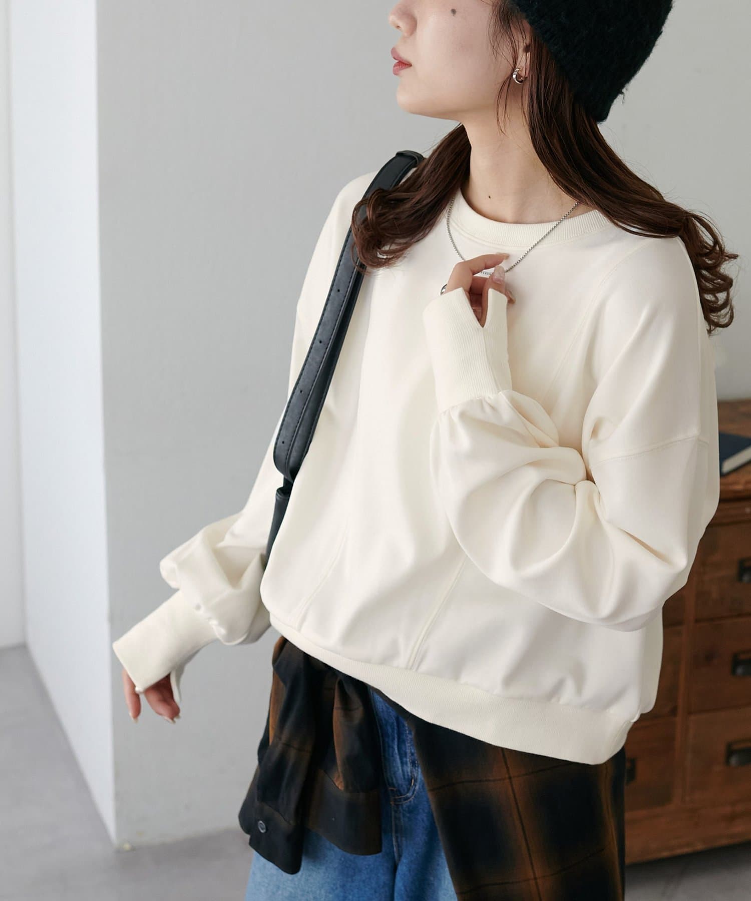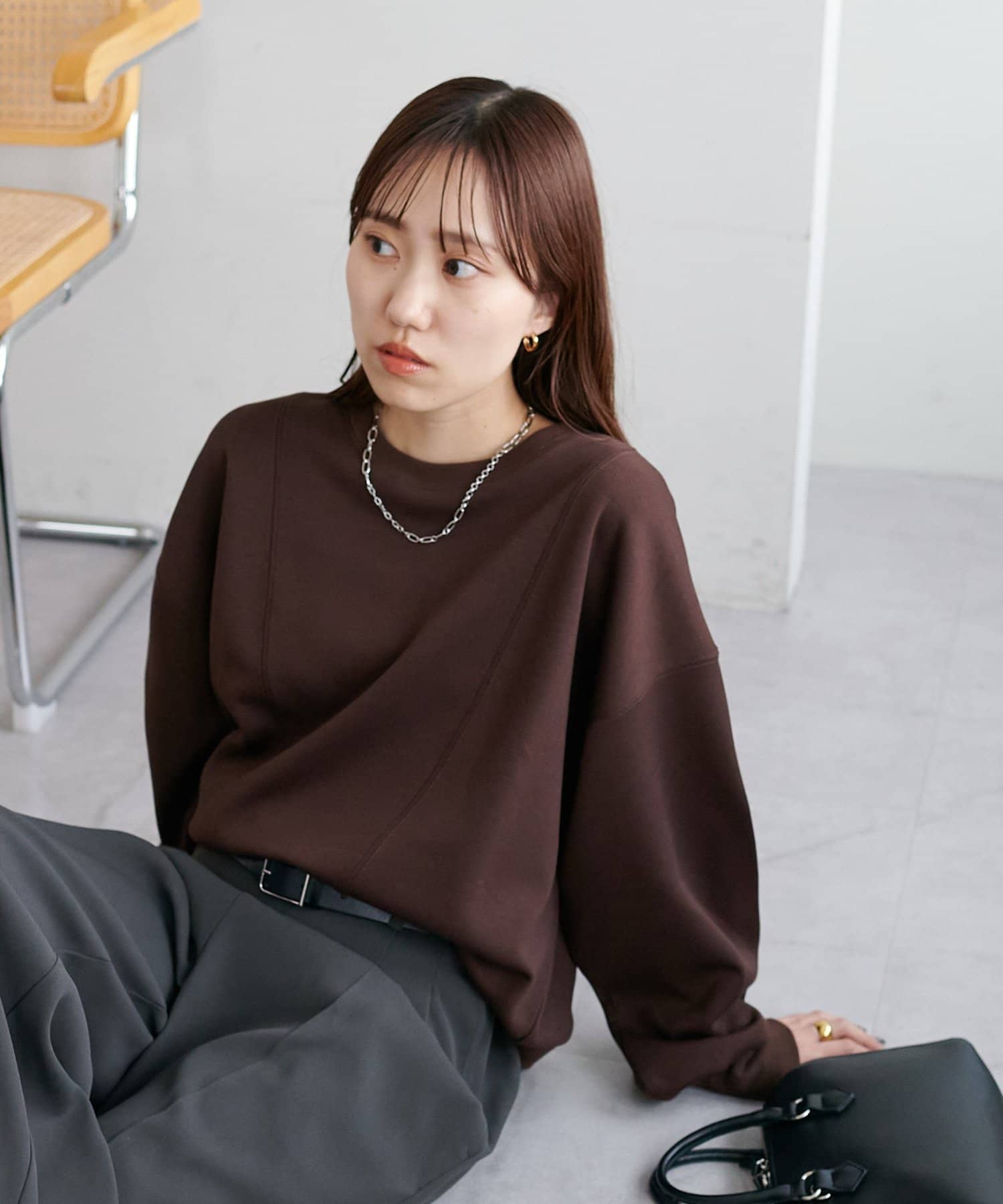 155cmスタッフ:着心地の良いトップスです。スウェットのようなデザインですが、ハリ感のある素材で高見えします!