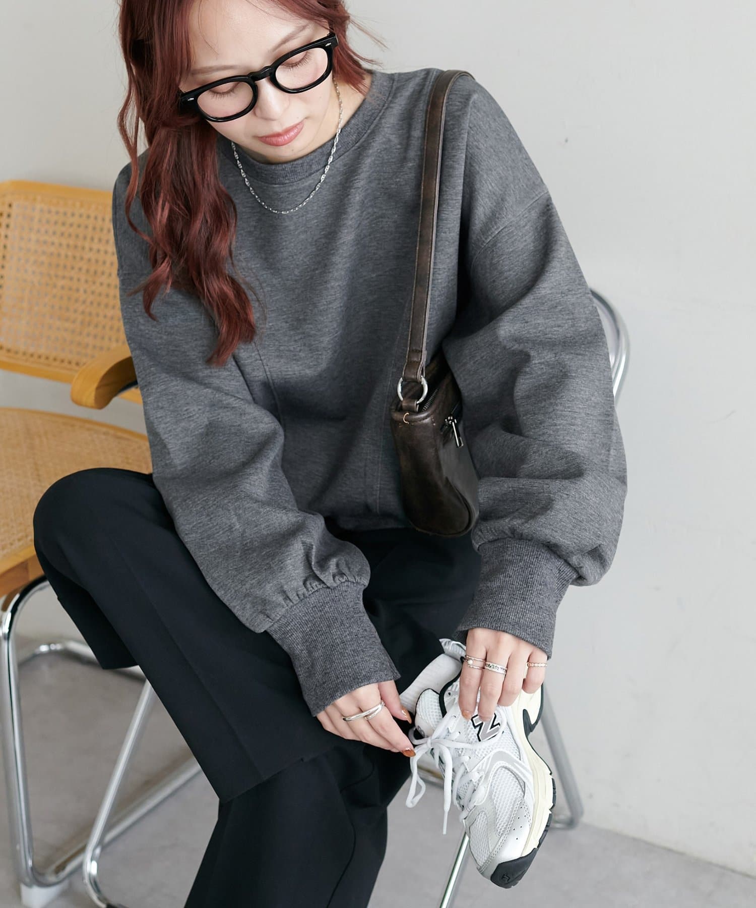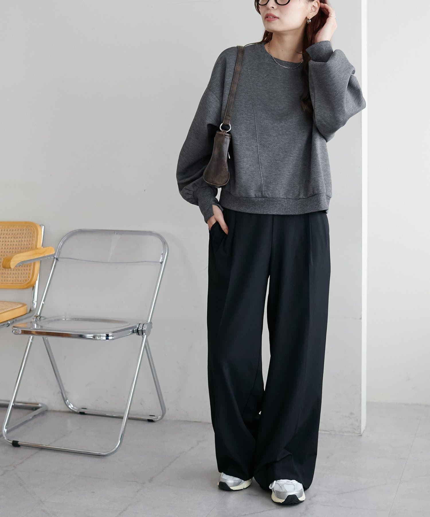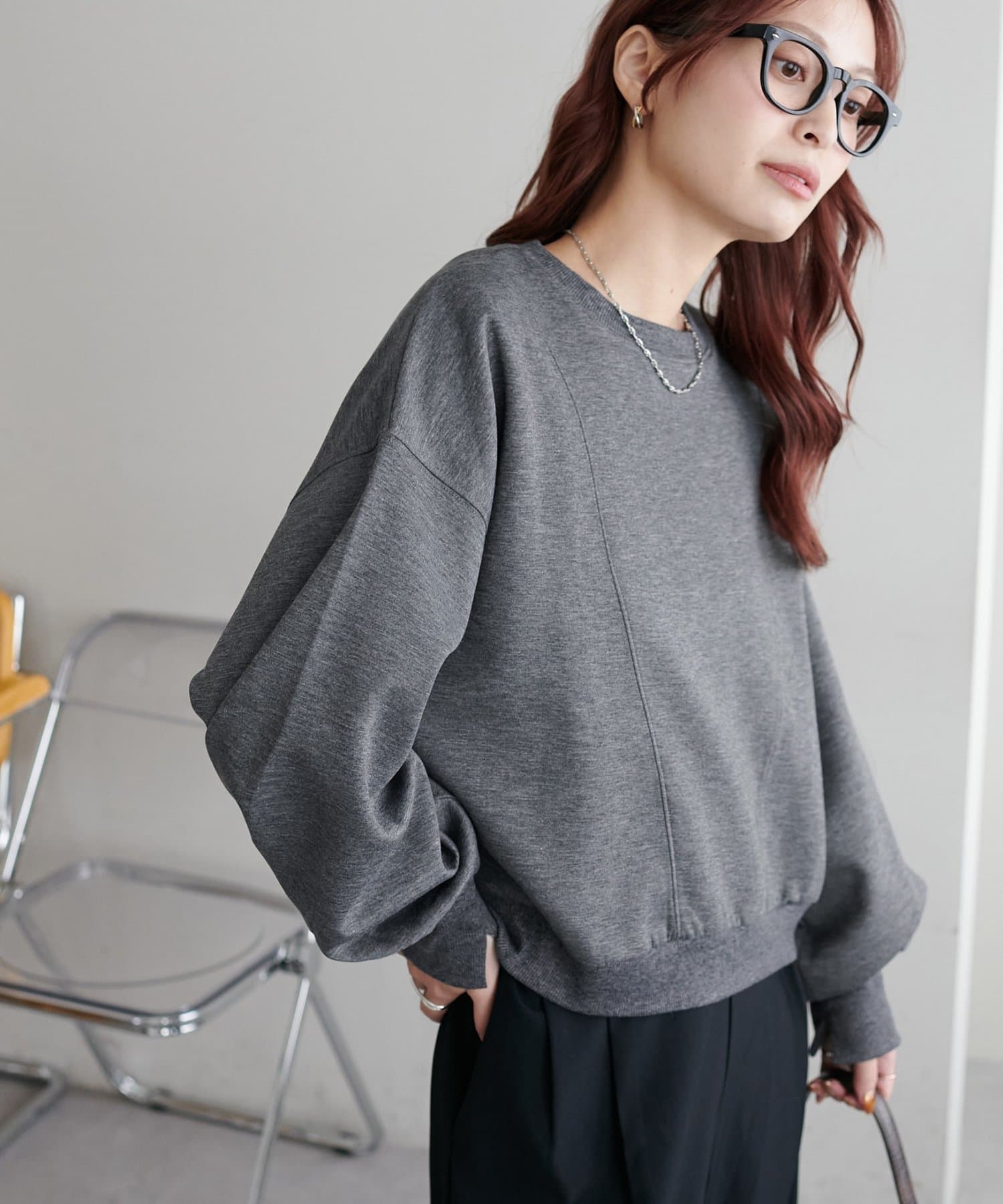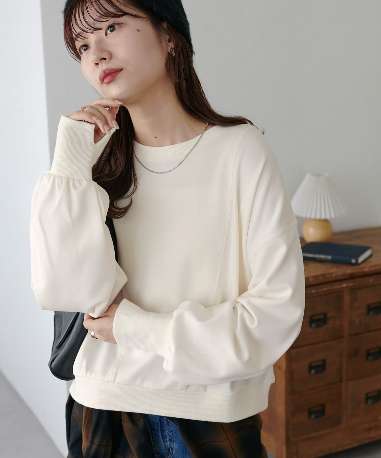 155cmスタッフ:着心地の良いトップスです。スウェットのようなデザインですが、ハリ感のある素材で高見えします!