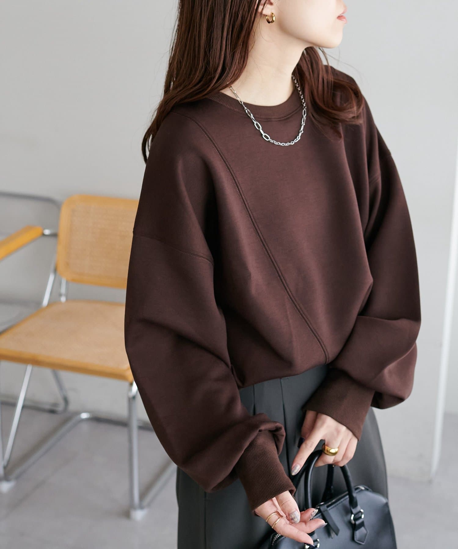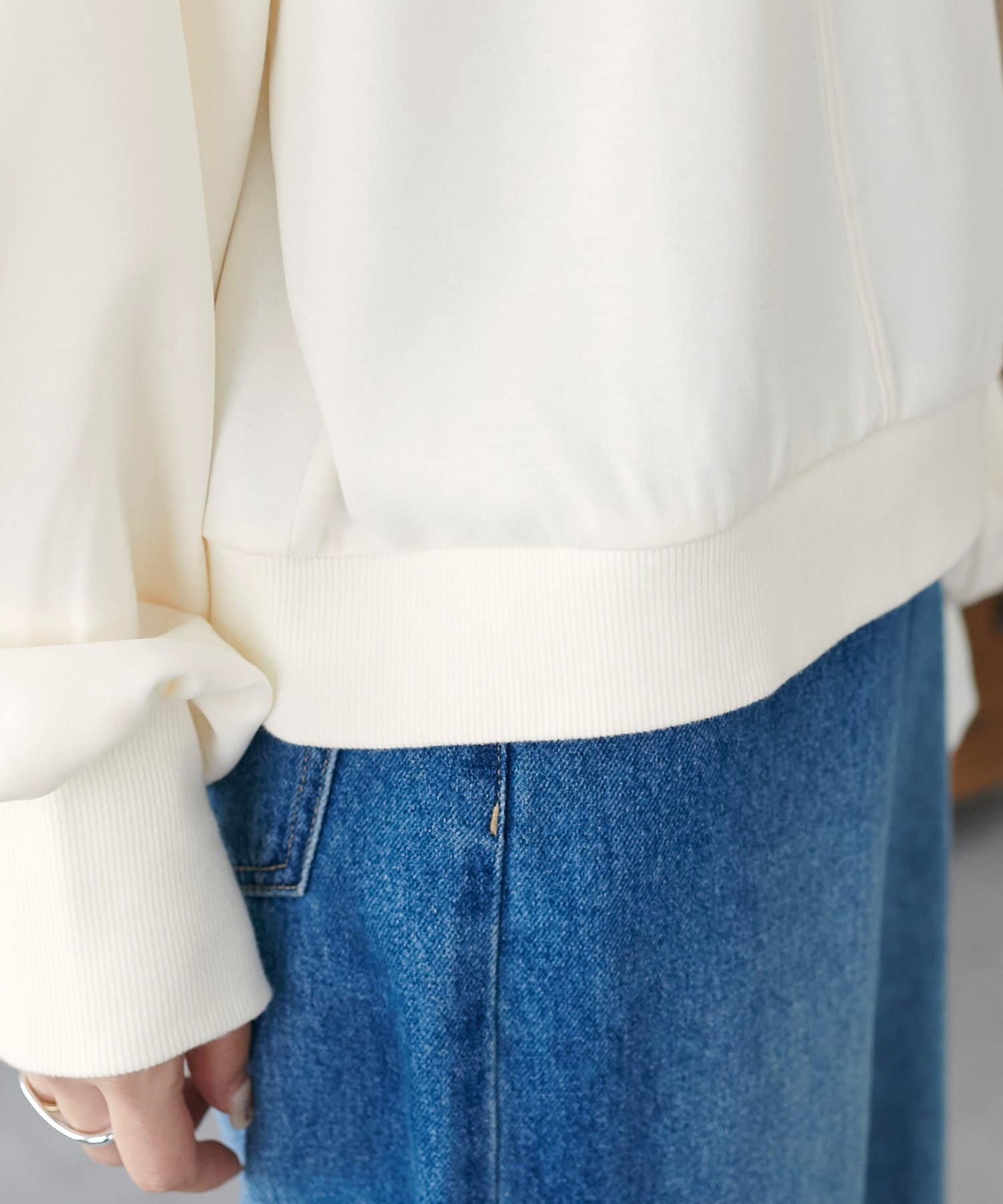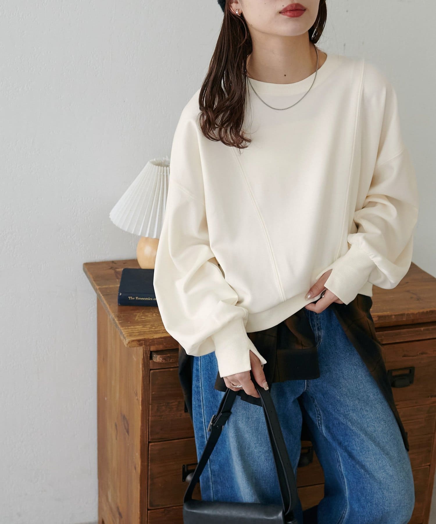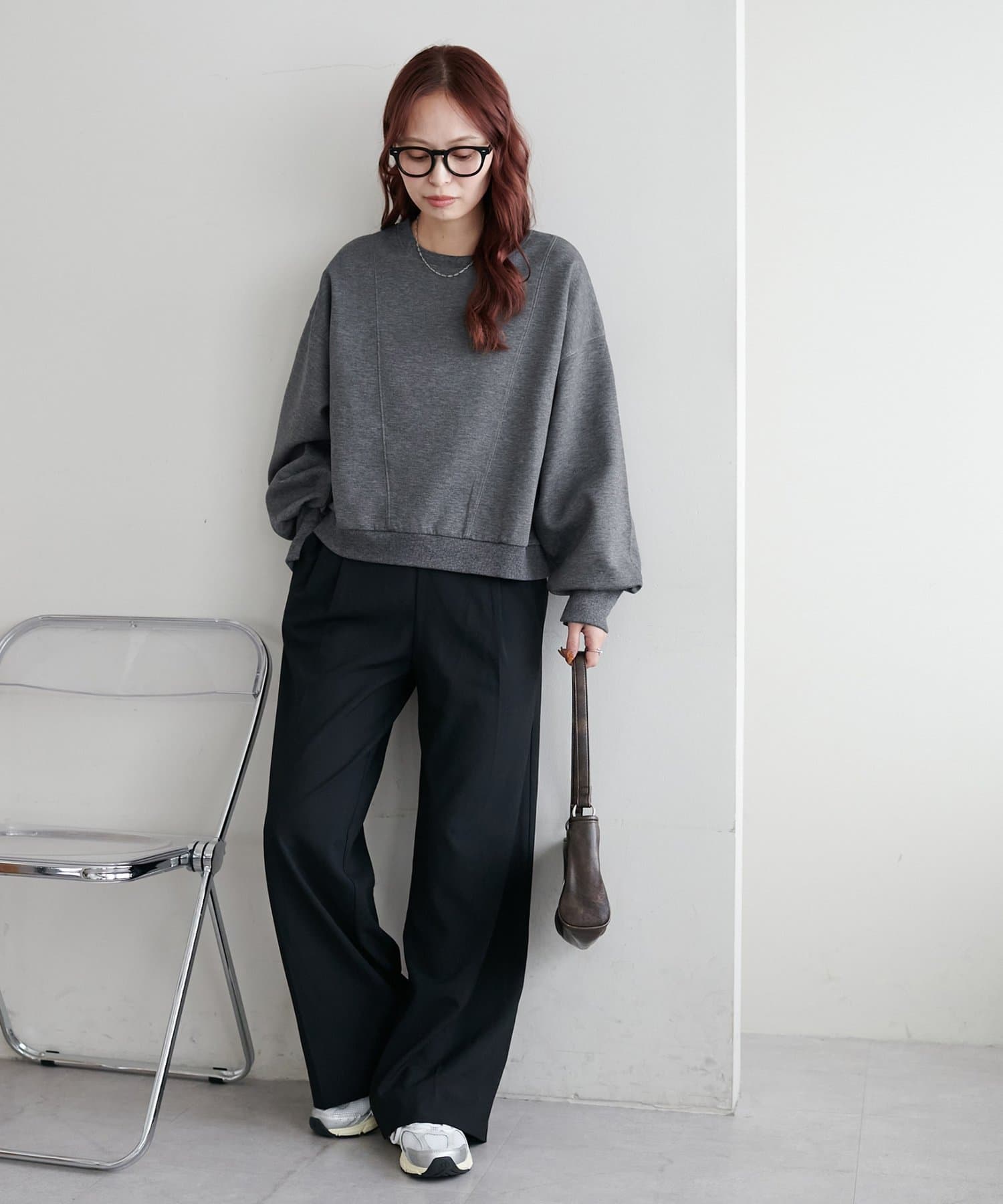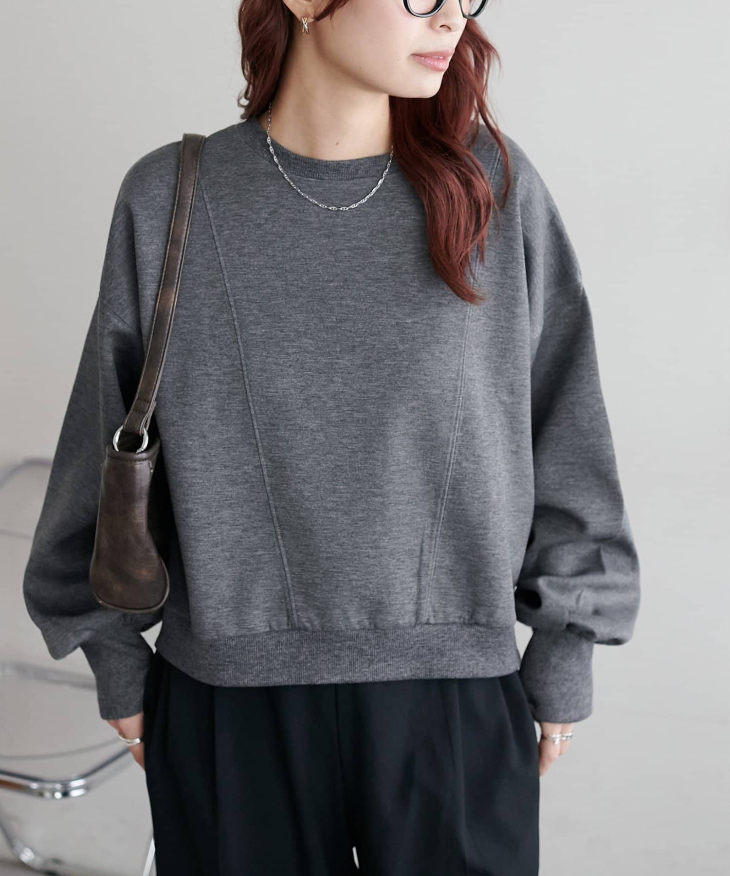 155cmスタッフ:着心地の良いトップスです。スウェットのようなデザインですが、ハリ感のある素材で高見えします!