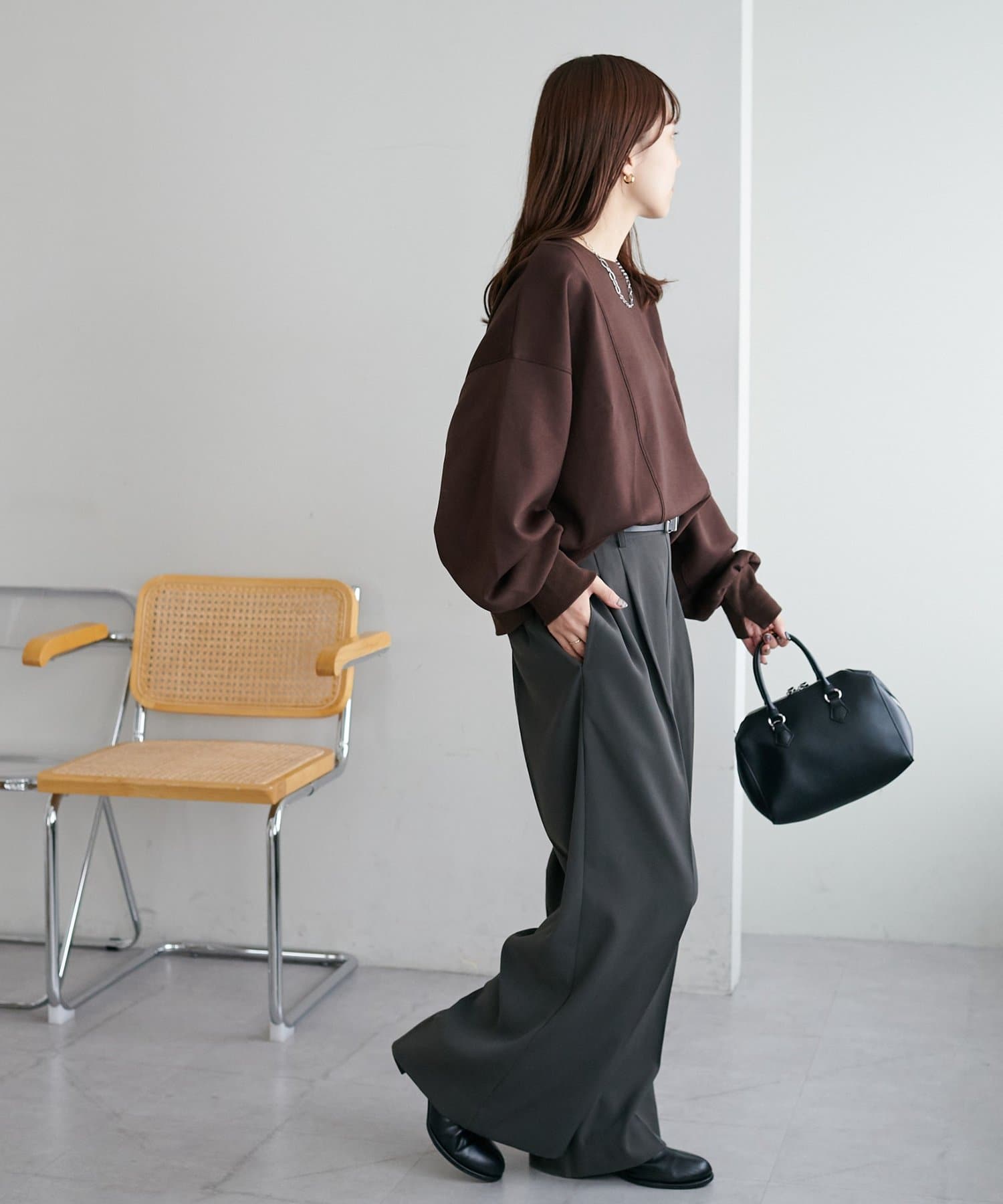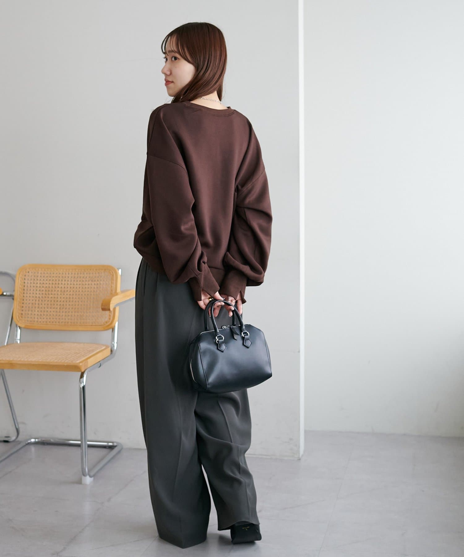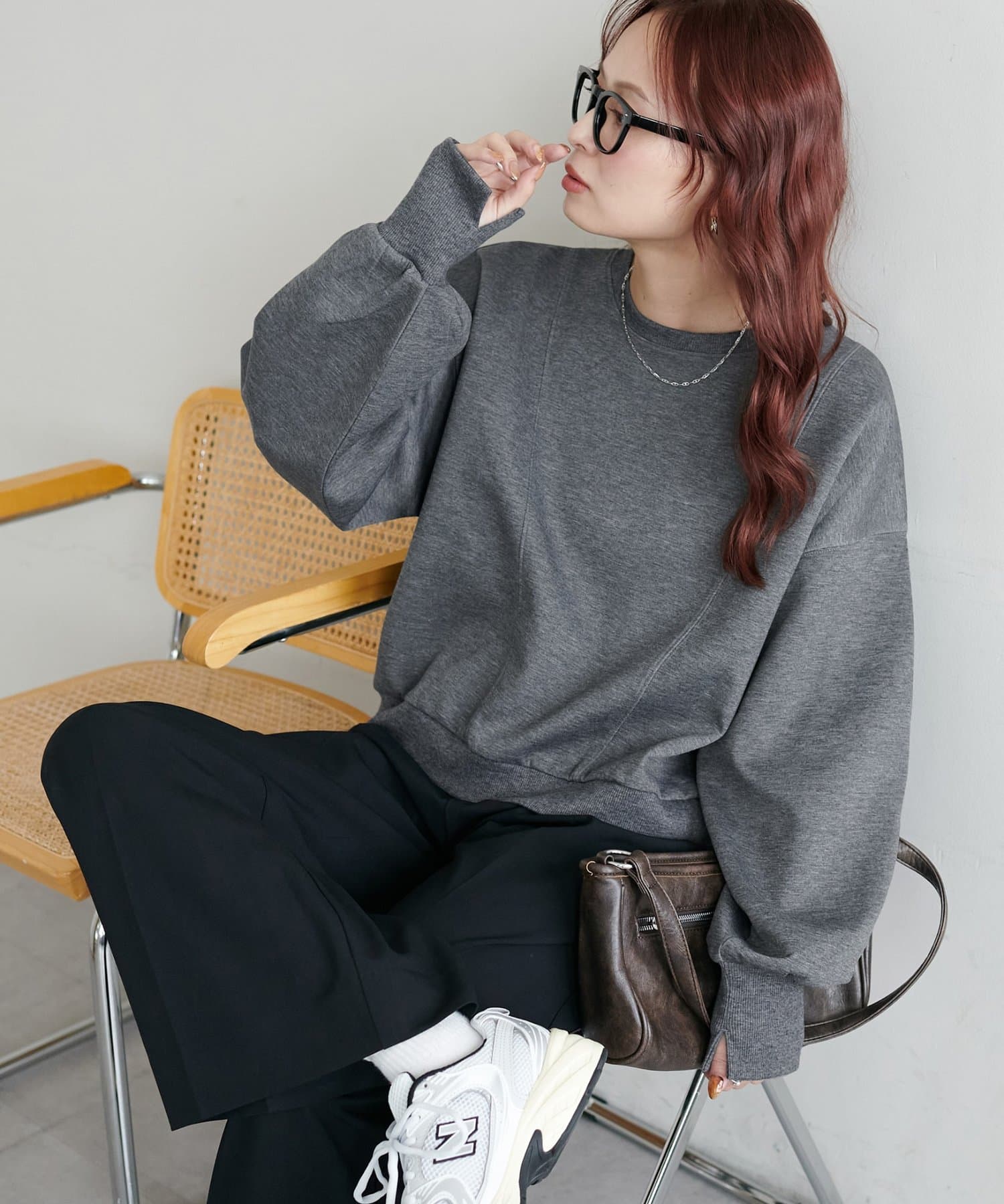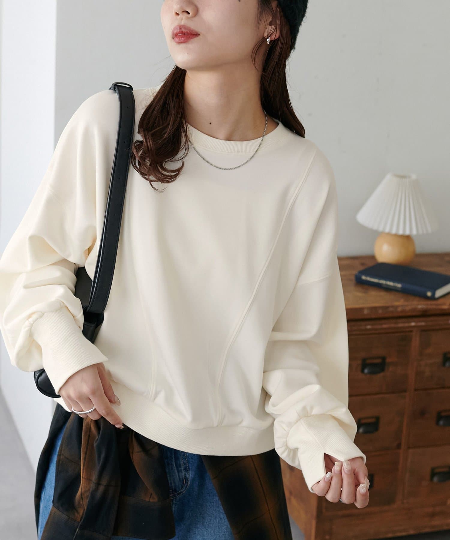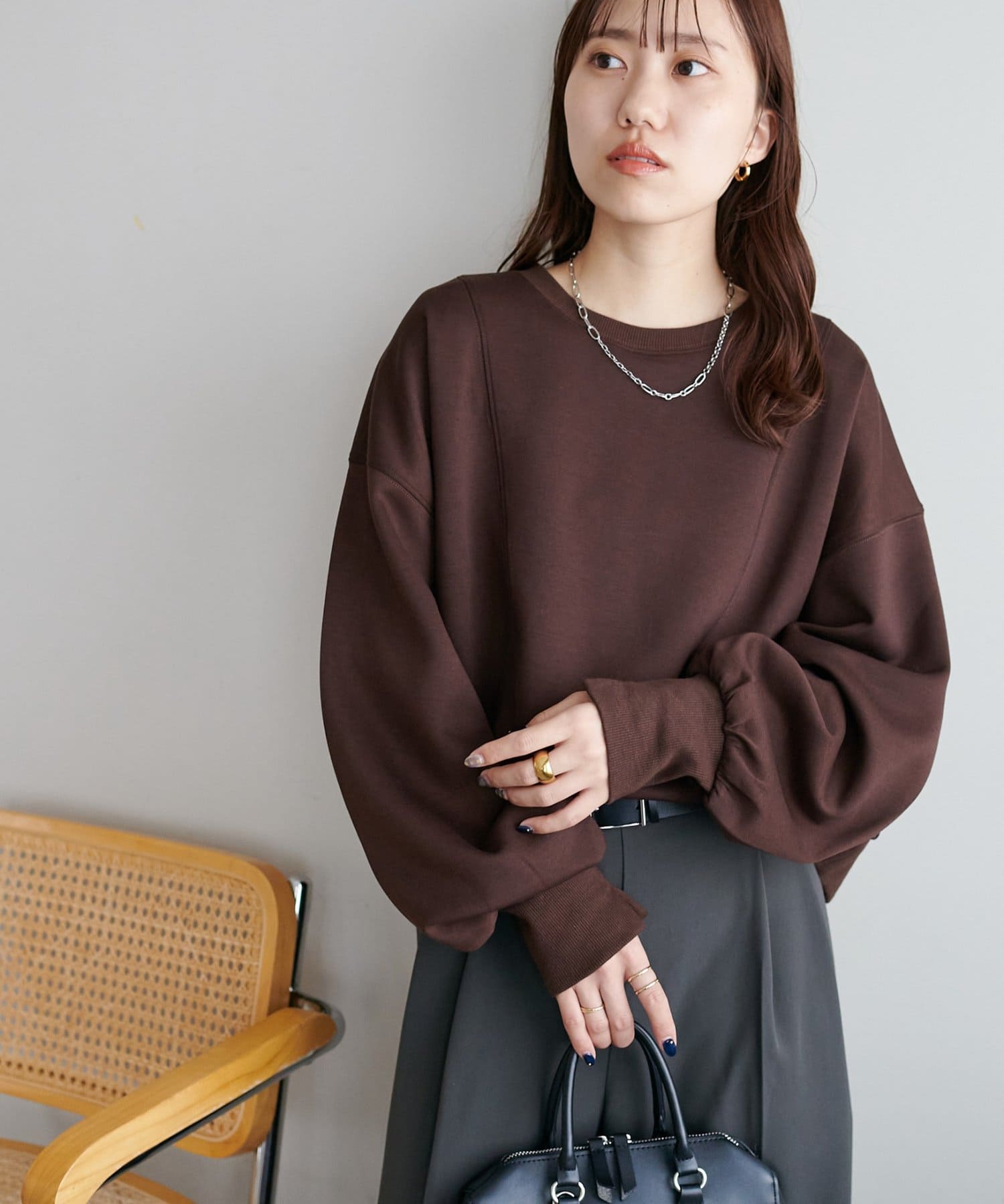 155cmスタッフ:着心地の良いトップスです。スウェットのようなデザインですが、ハリ感のある素材で高見えします!