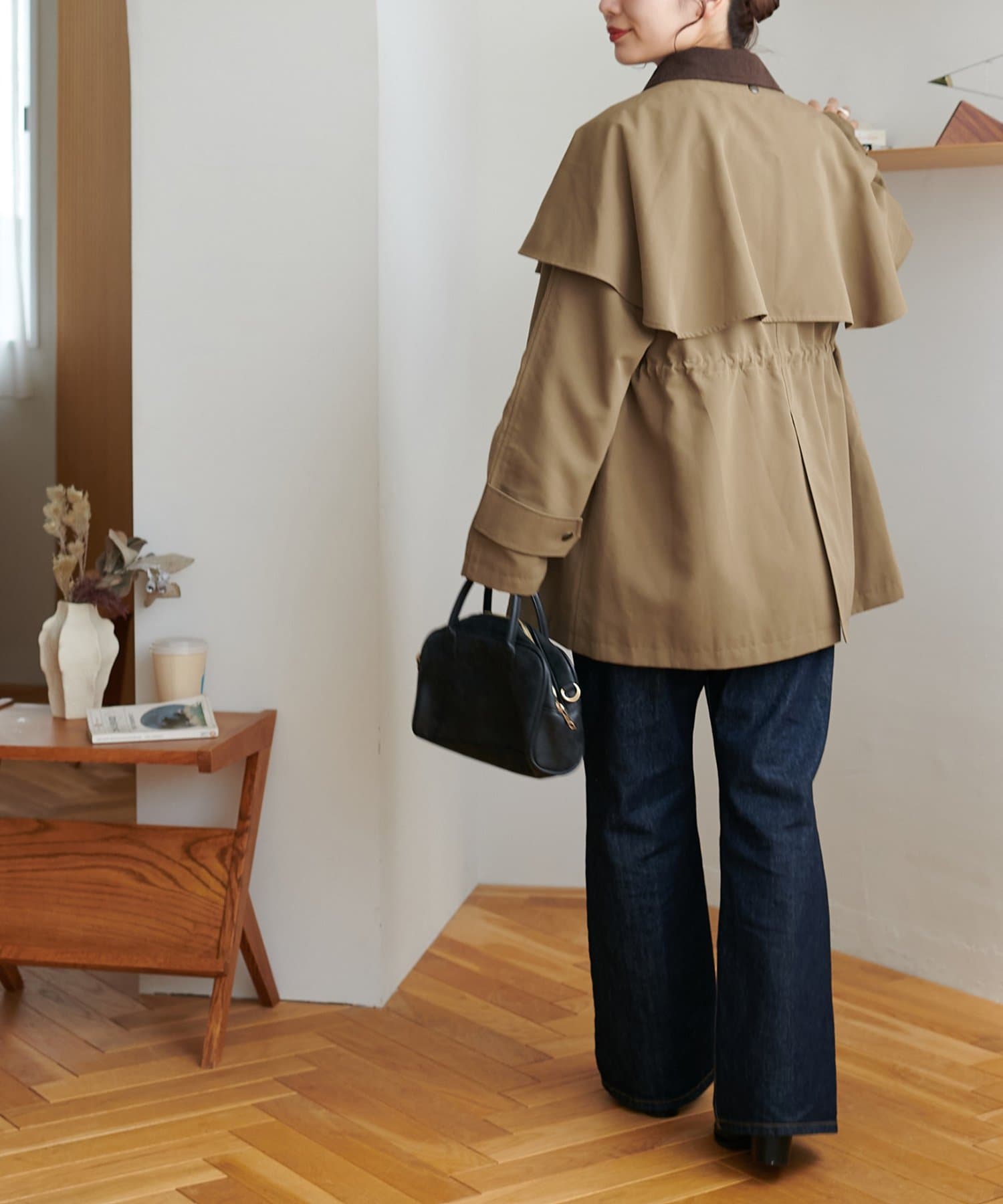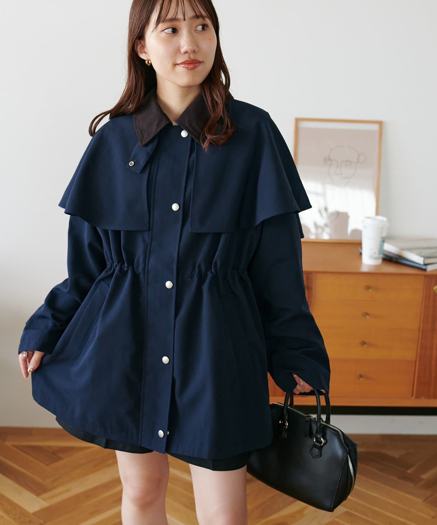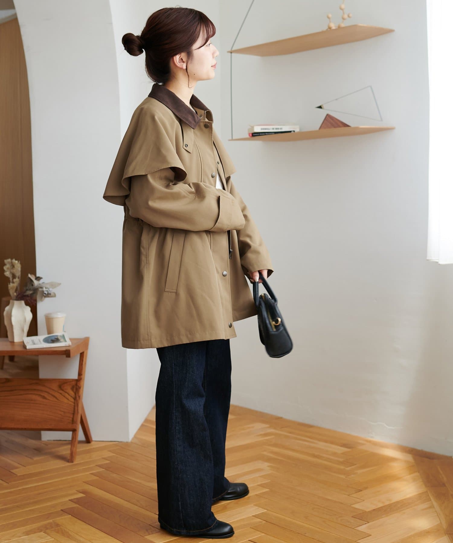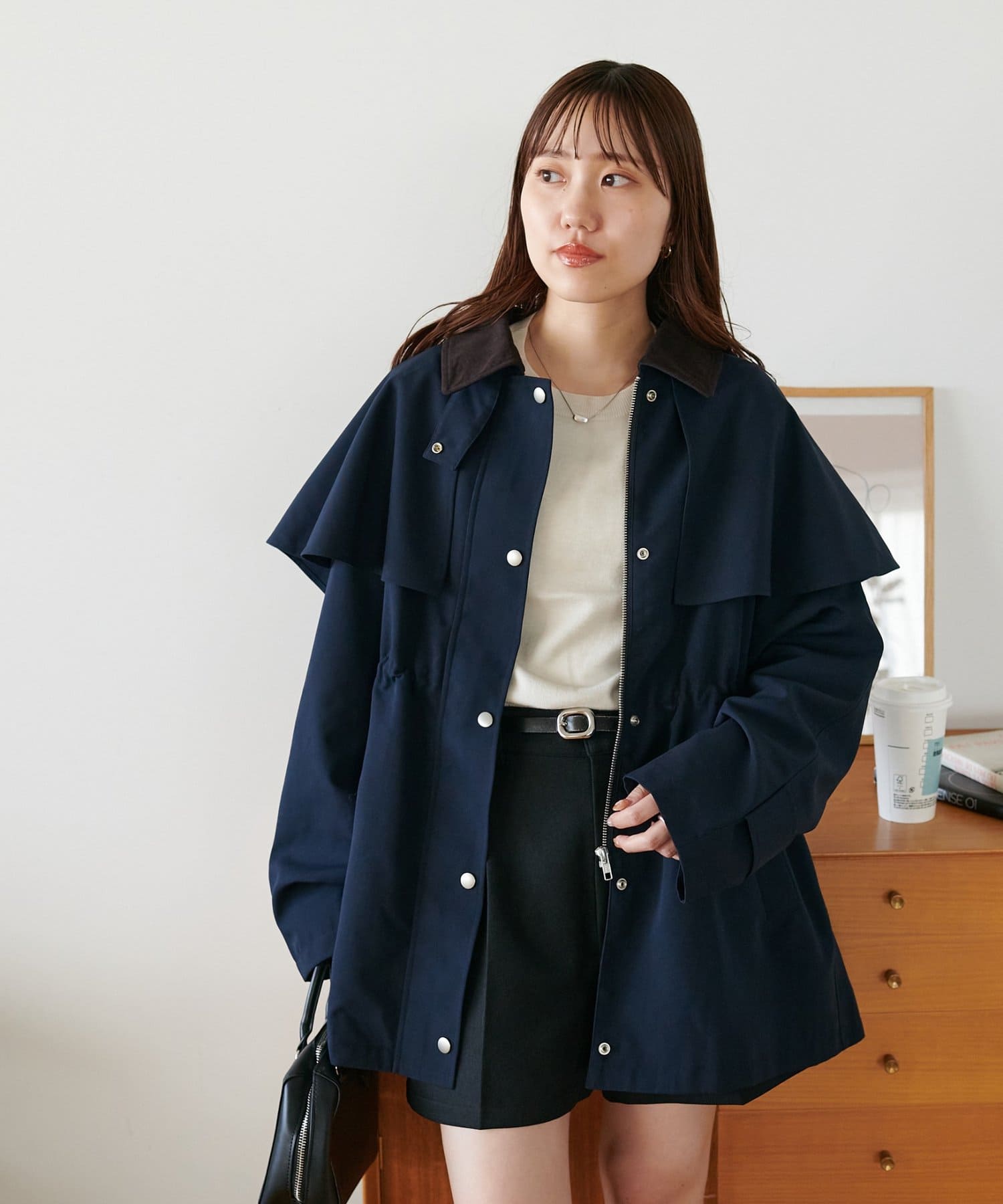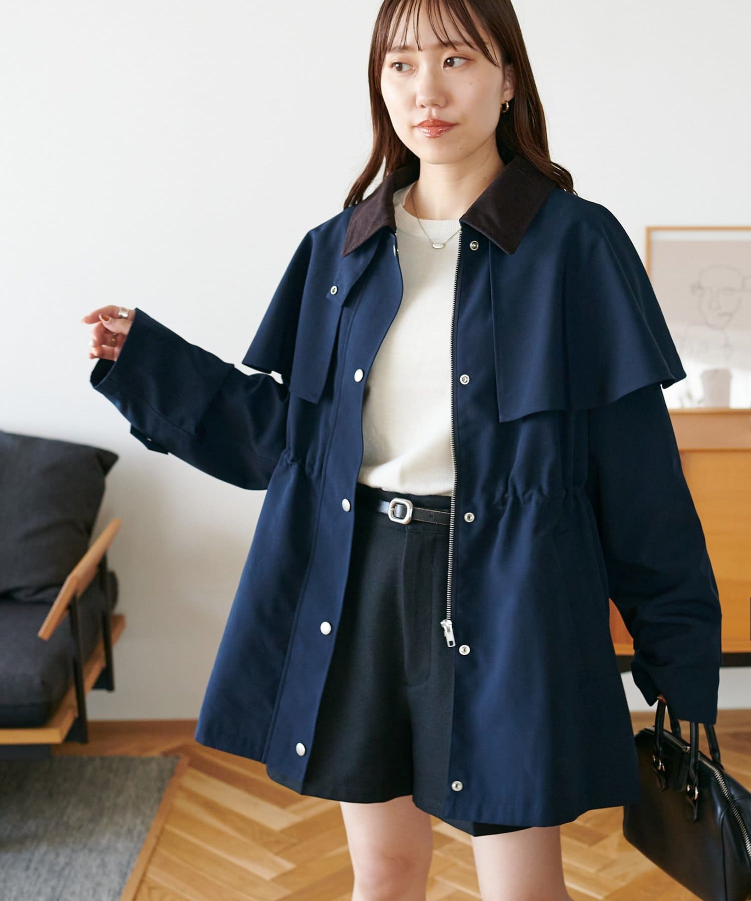 160cmスタッフ:ミドル丈で長すぎないので、バランスが取りやすいです〇ケープ部分はボタンを外すだけで取れるので、手間がいらずストレスフリーです!