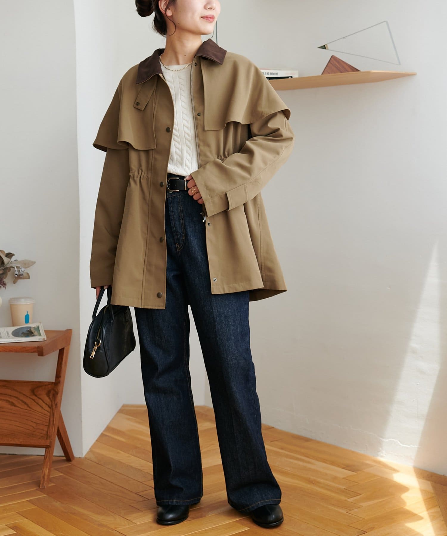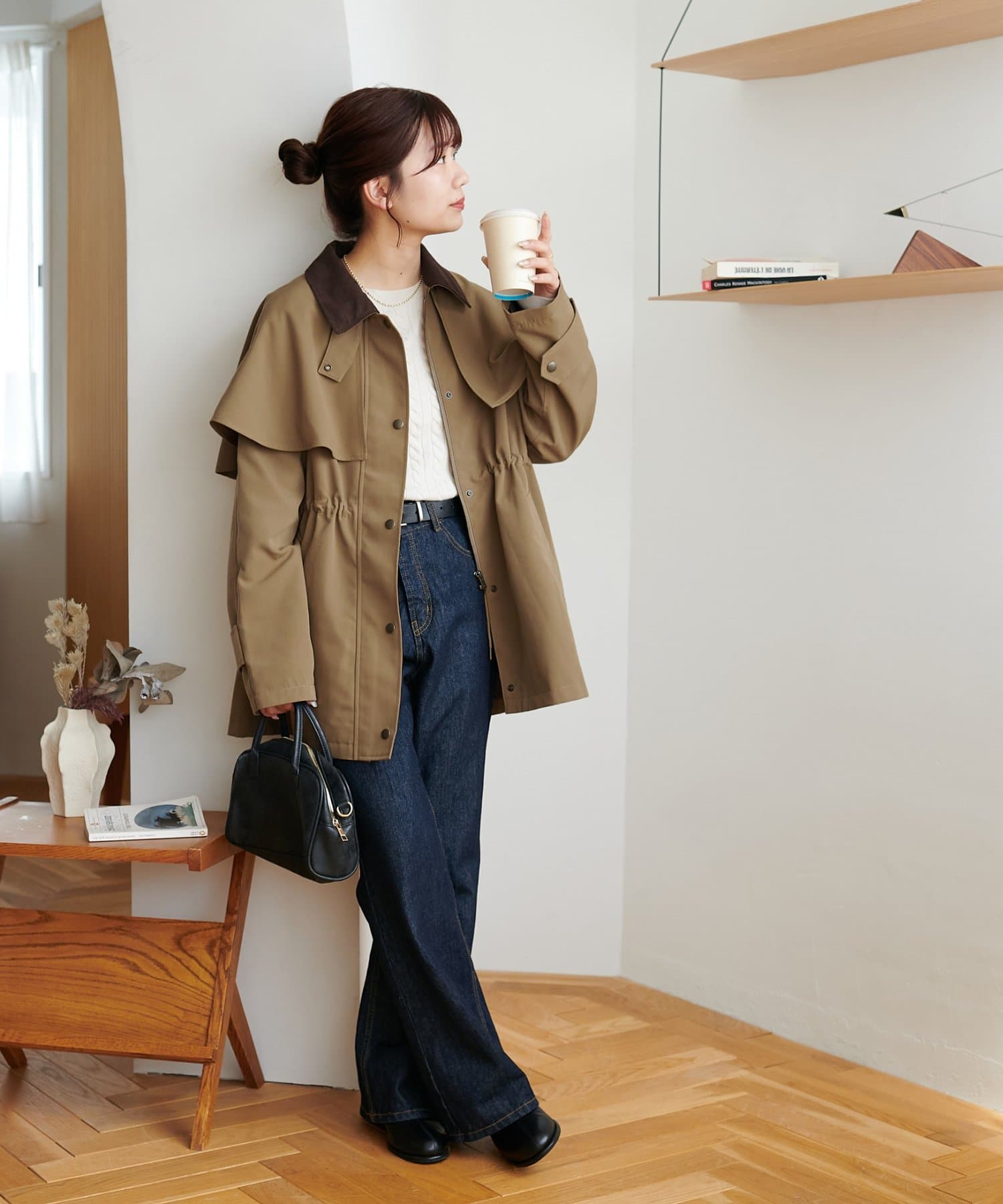 ケープを外すとシンプルなコートになるので、デニムやTシャツと合わせたカジュアルなコーデにもぴったり〇
