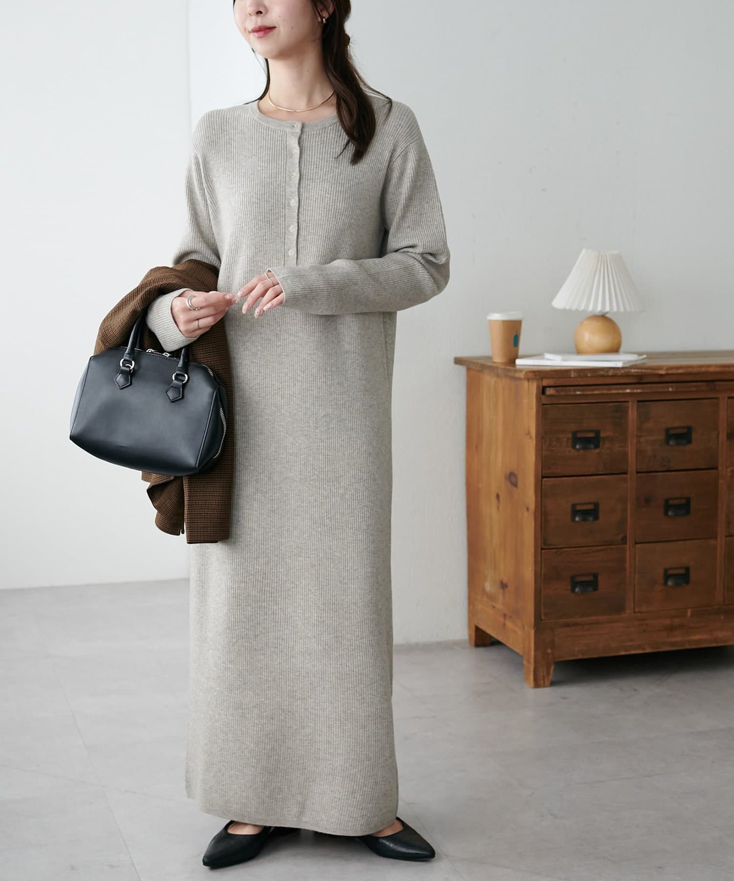シンプルながらも女性らしさを引き立てるヘンリーネックデザインのリブニットワンピース。