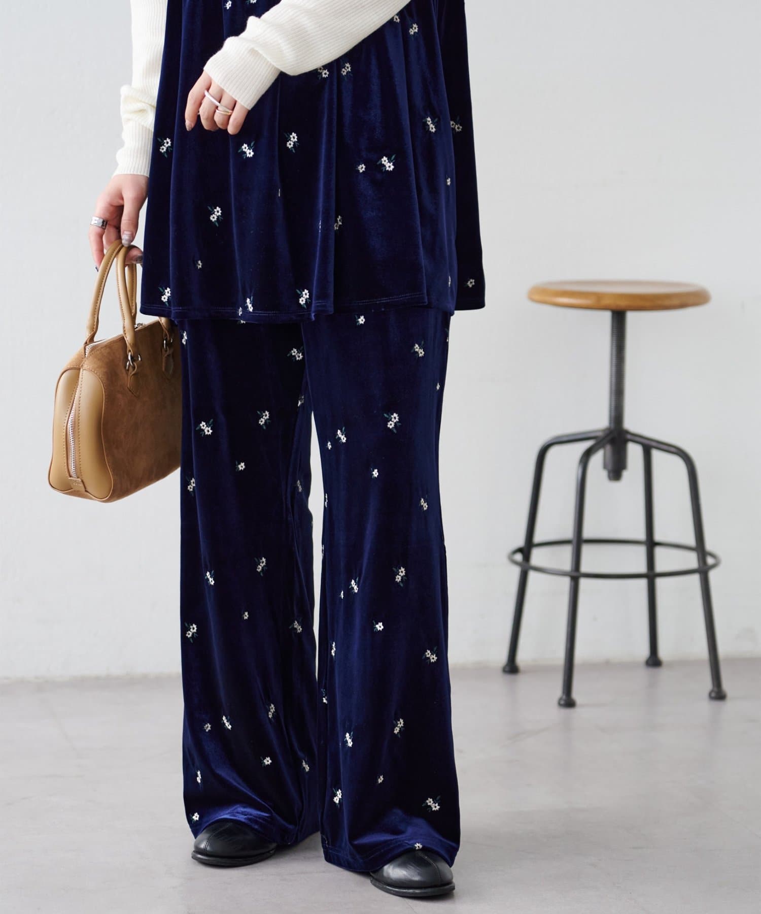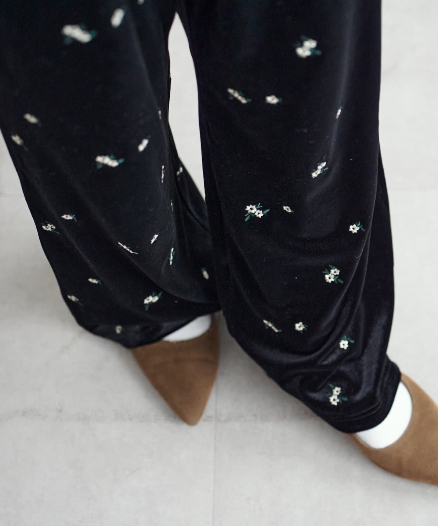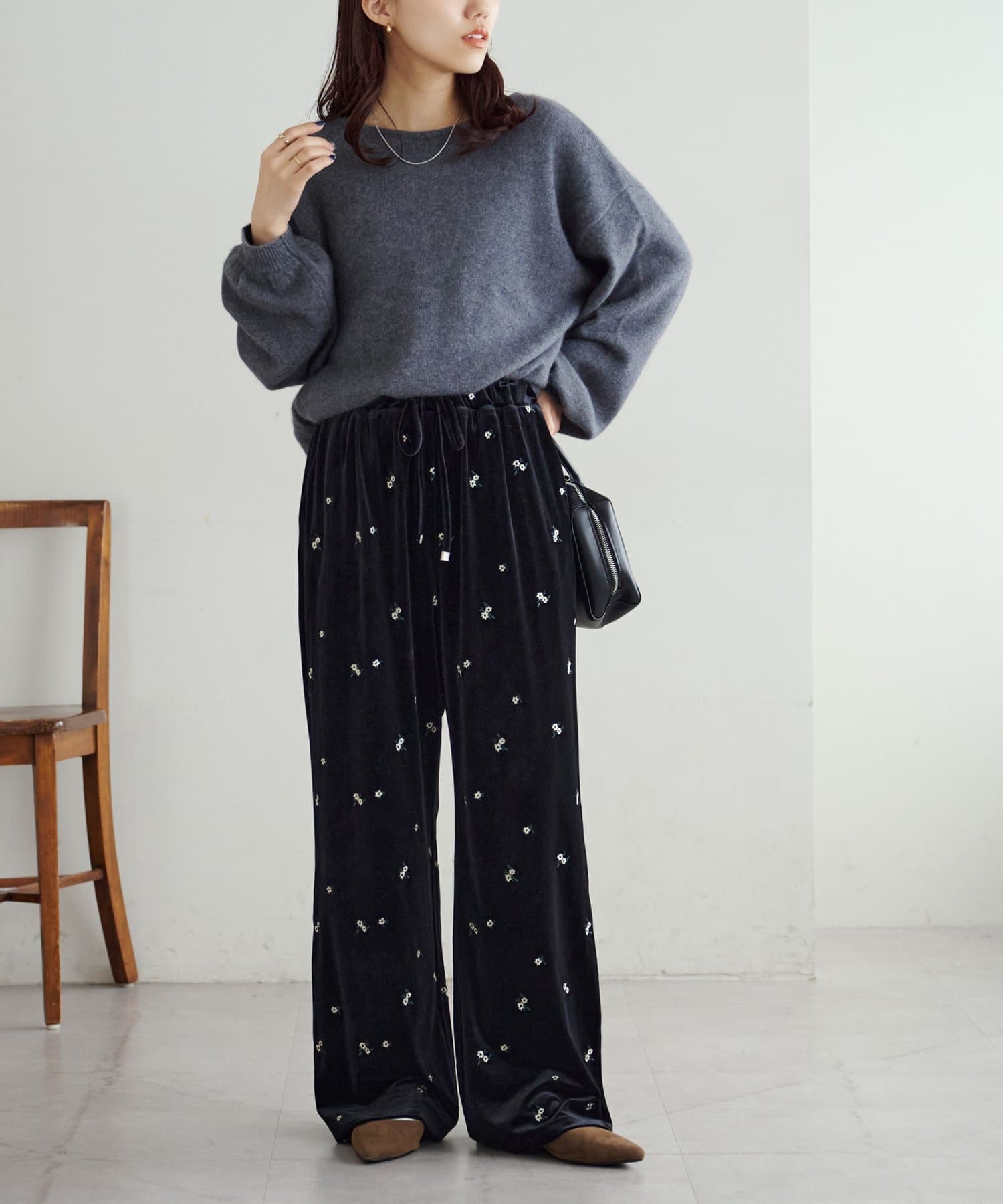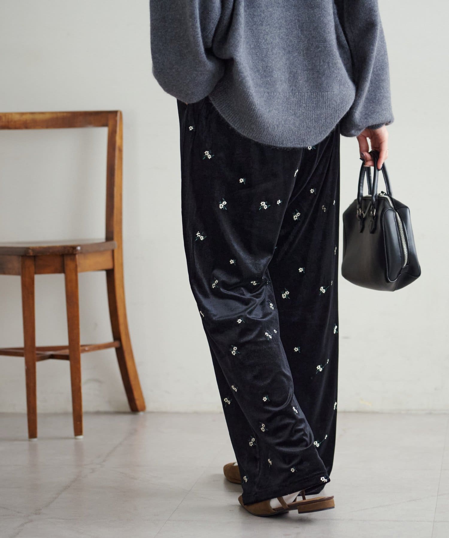 ベロア素材のパンツは程よい光沢感があり、高見えを叶えます。