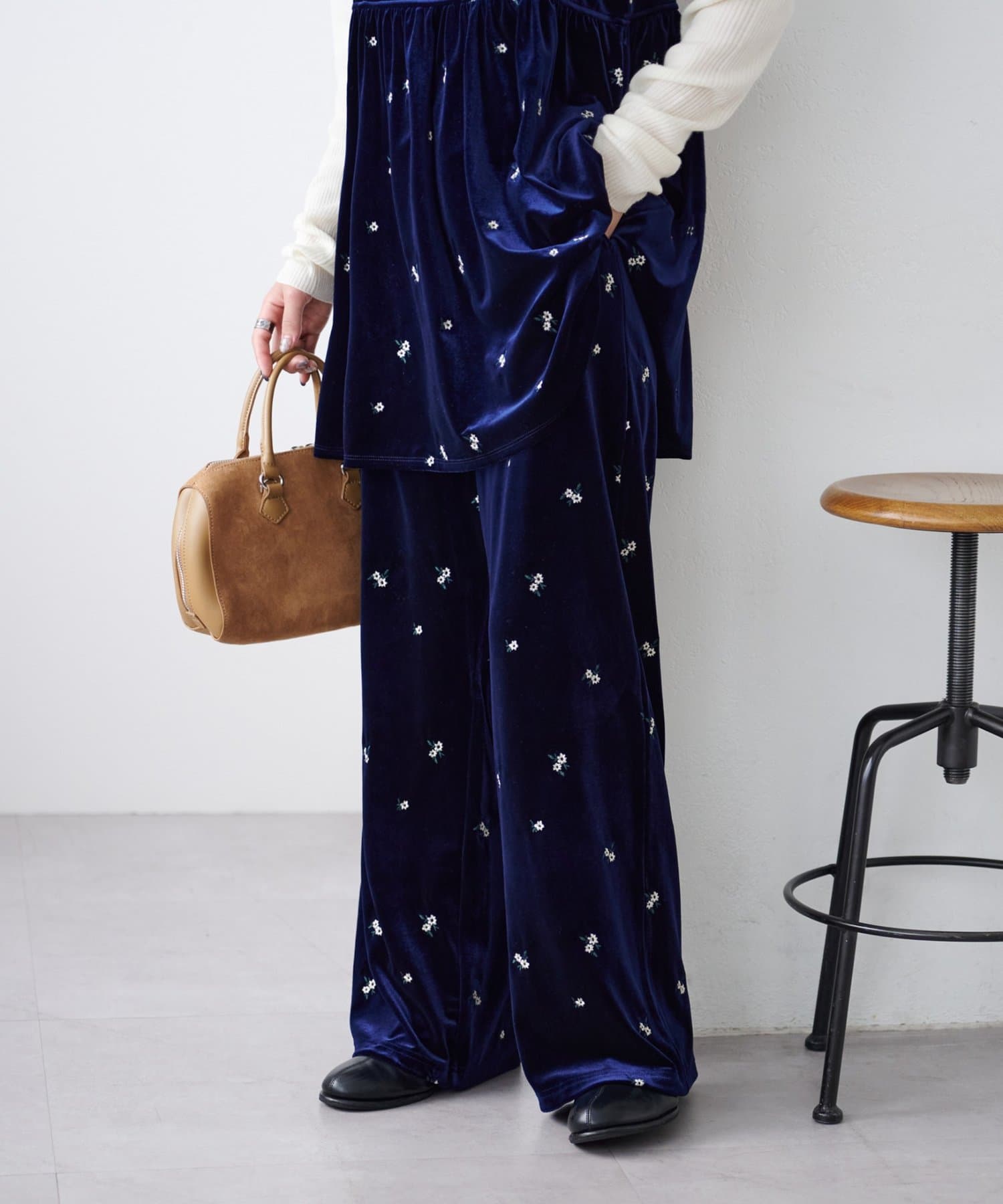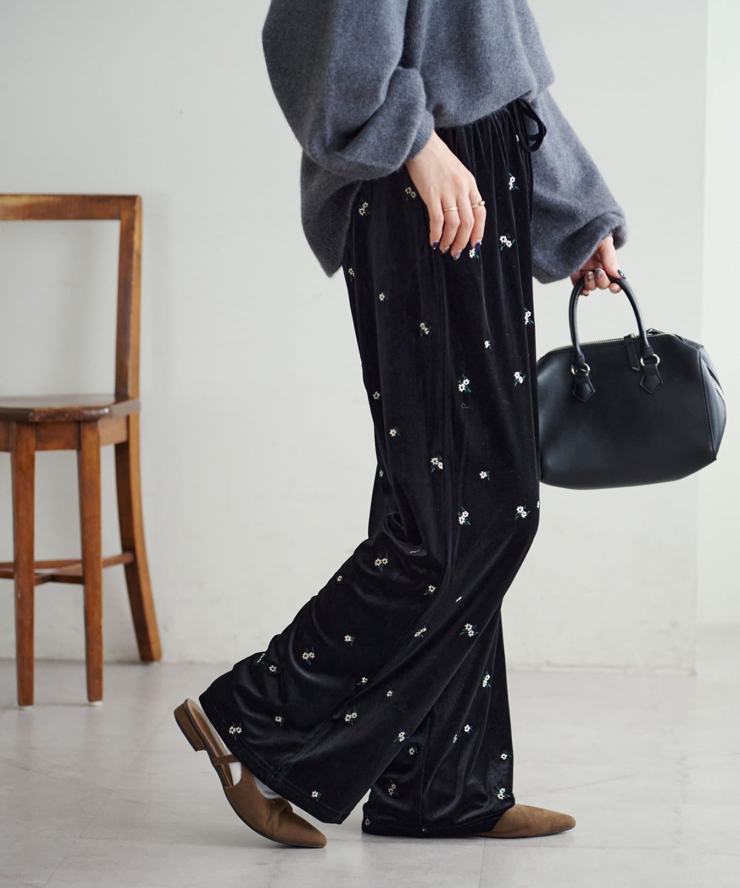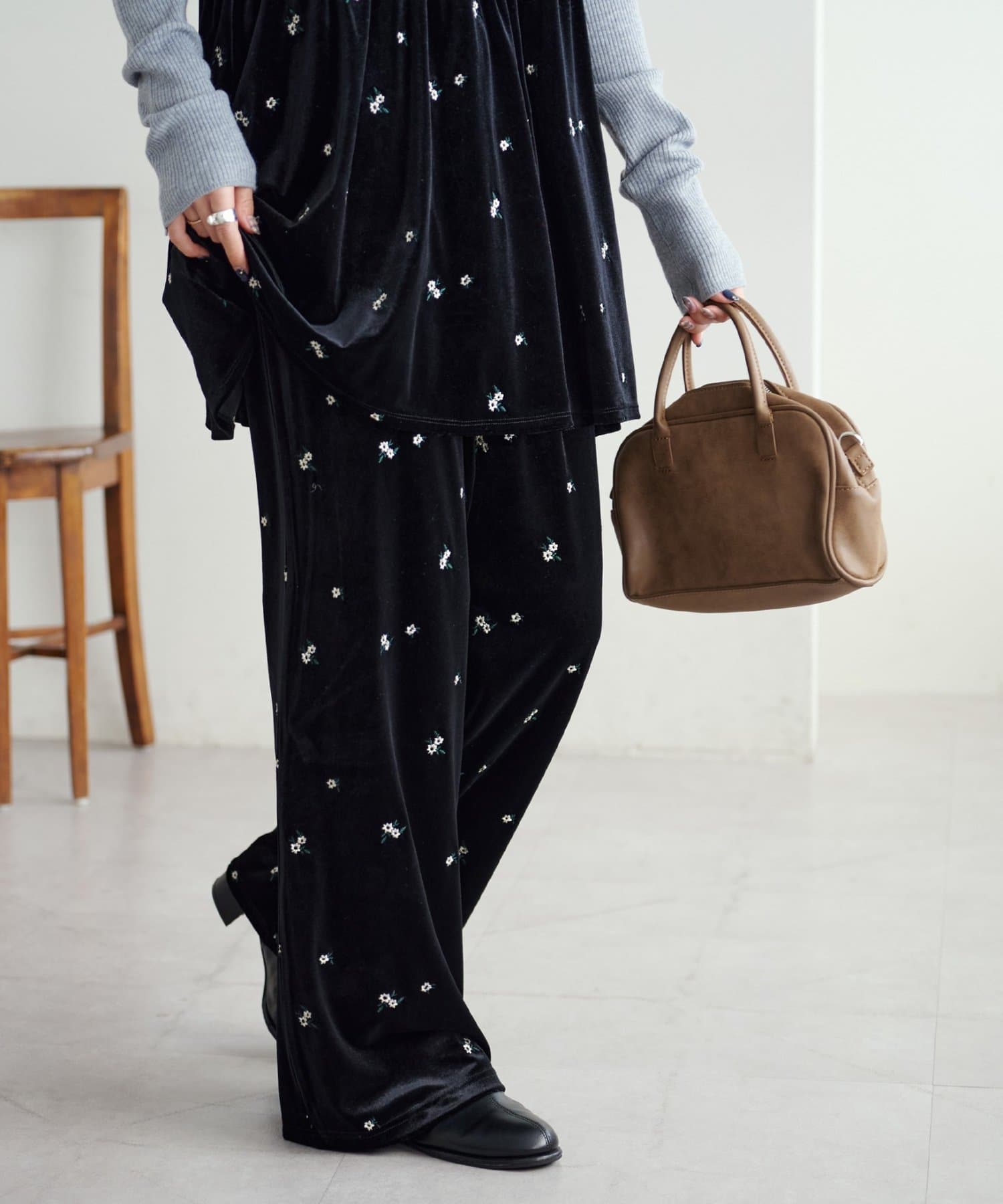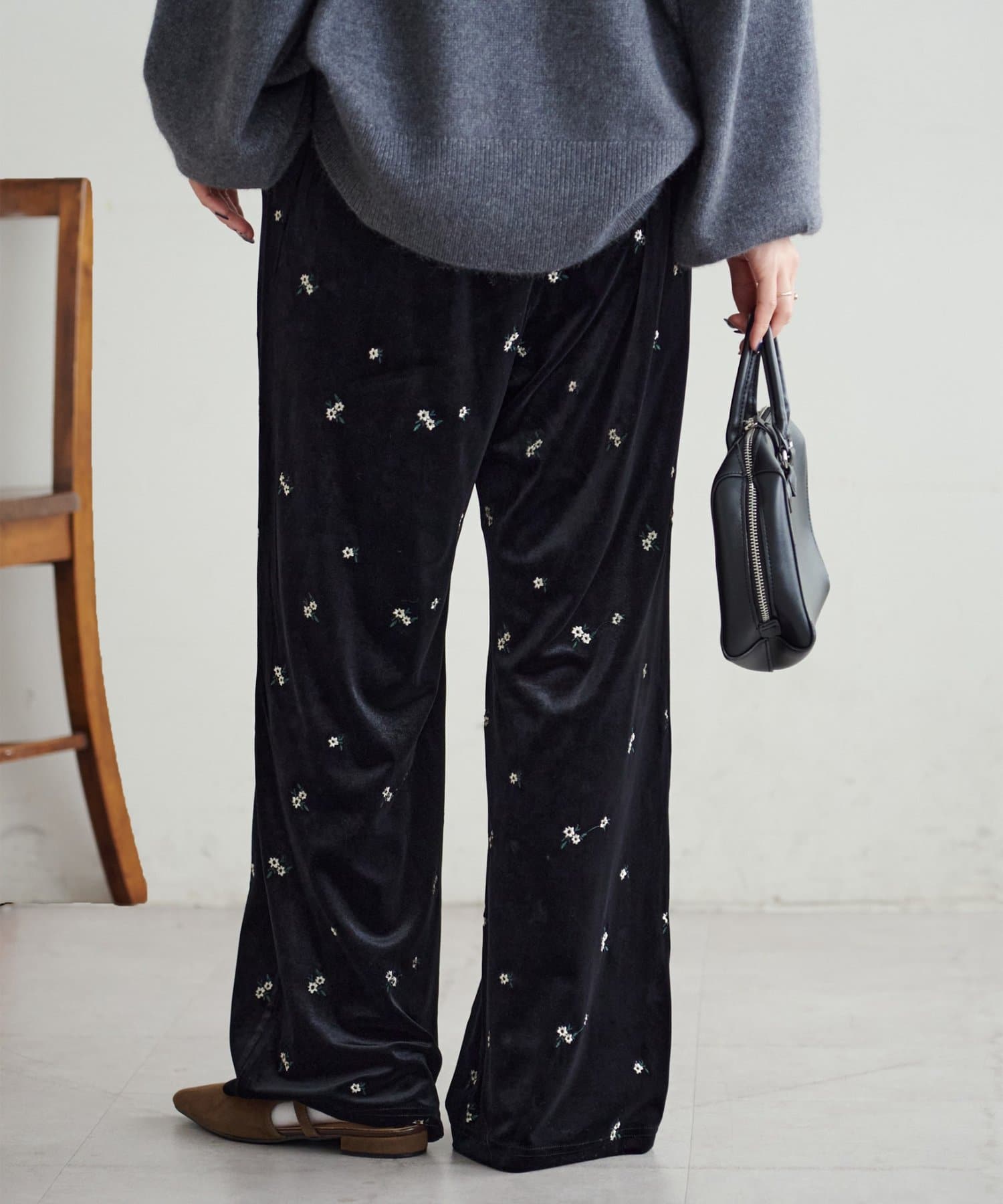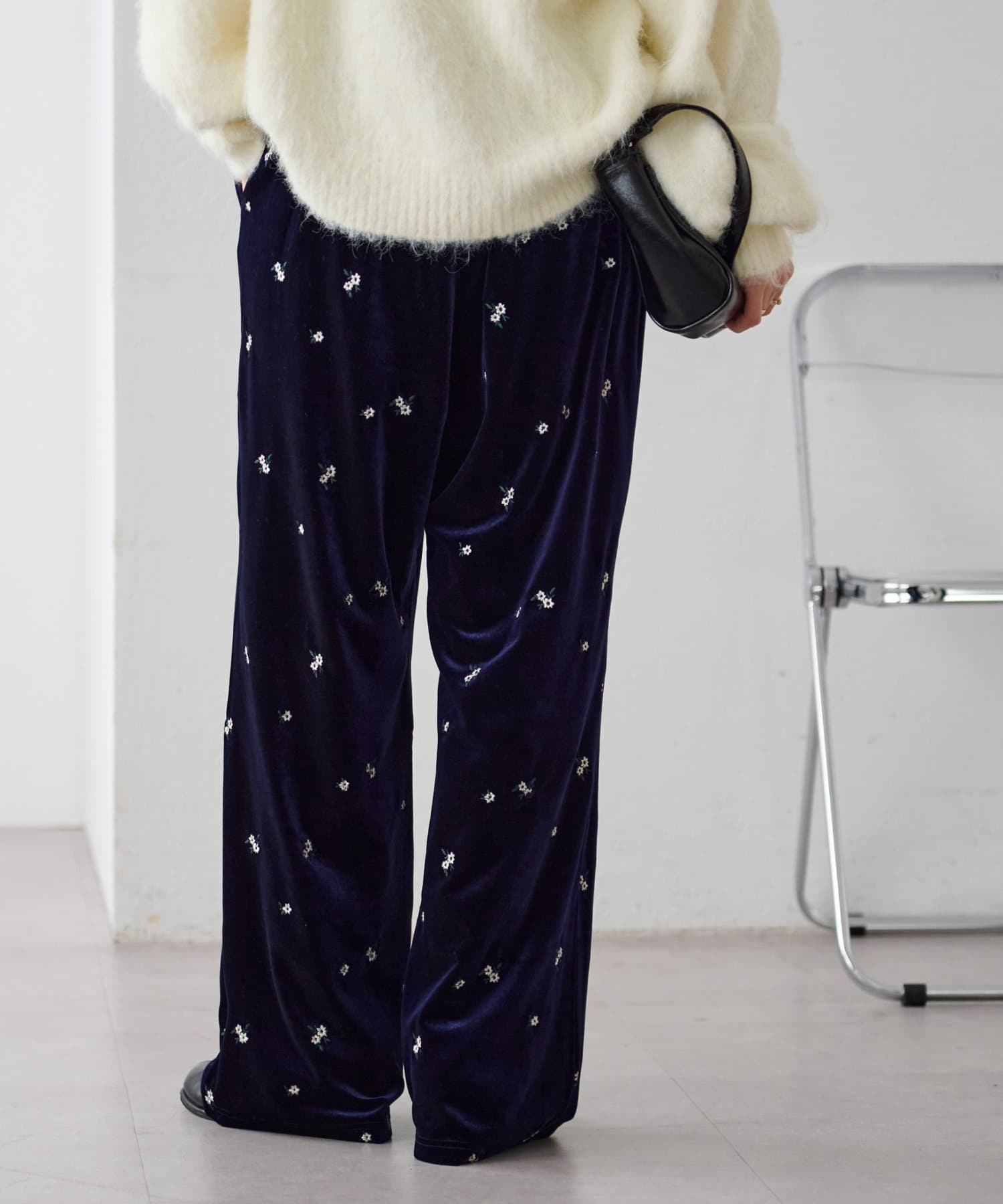 ベロア素材のパンツは程よい光沢感があり、高見えを叶えます。