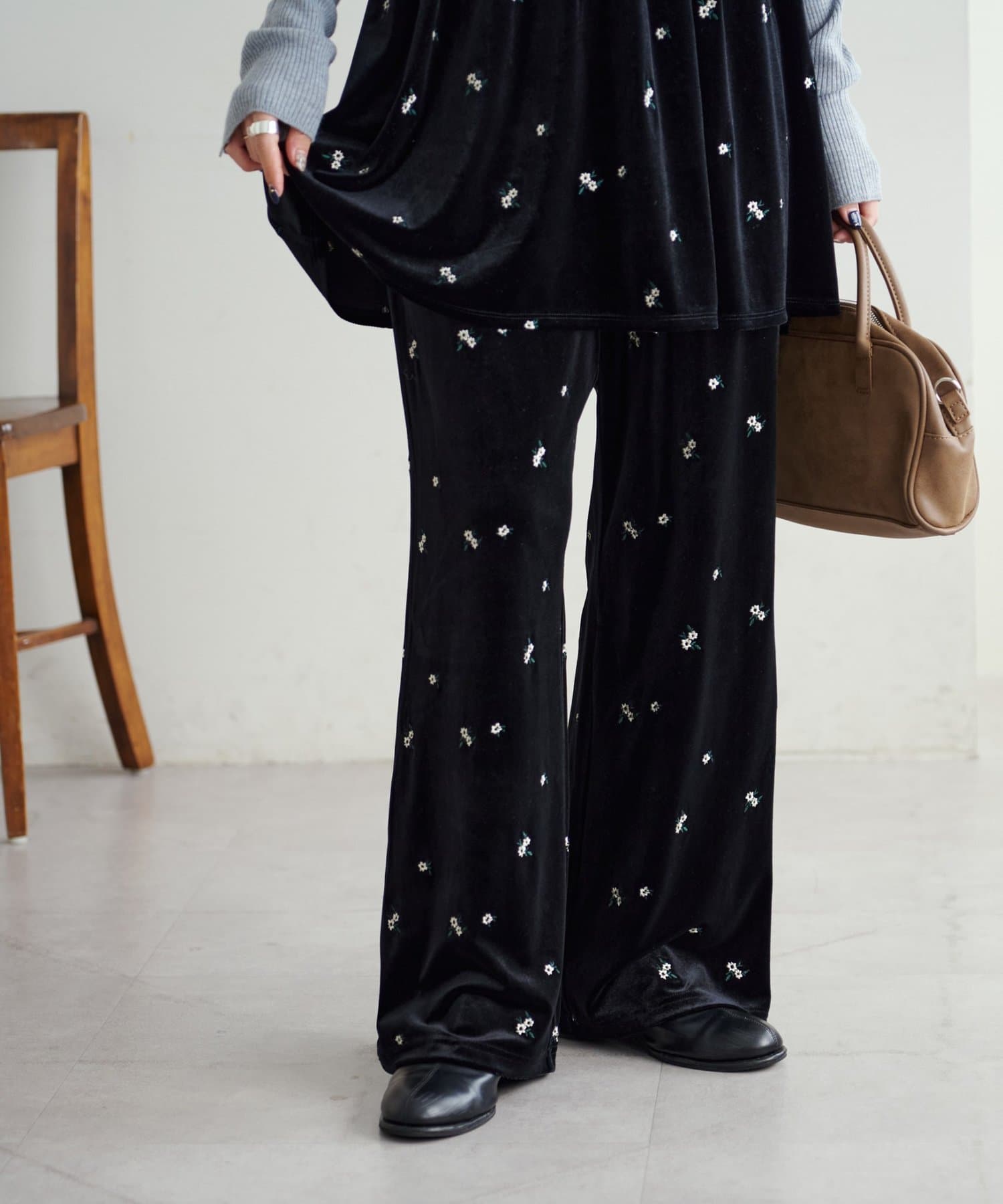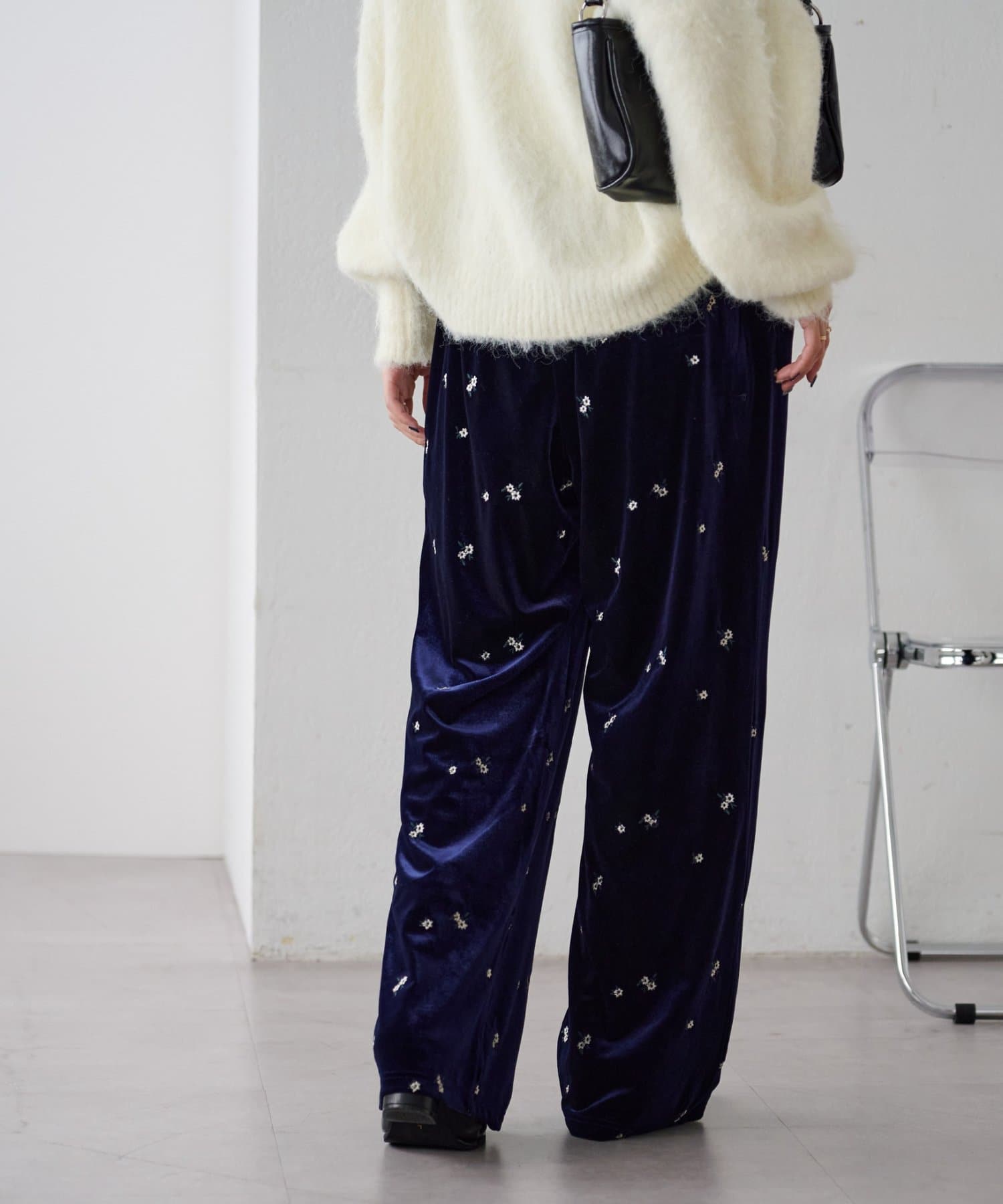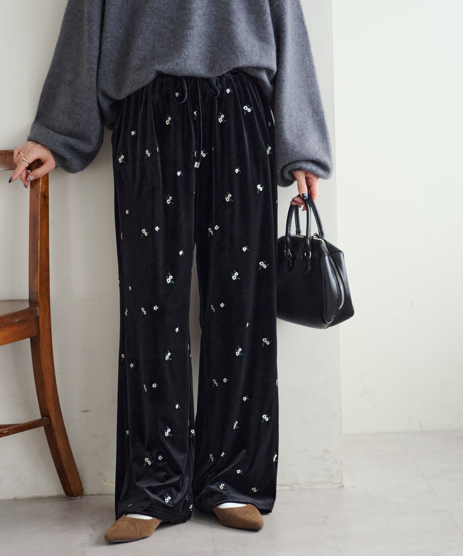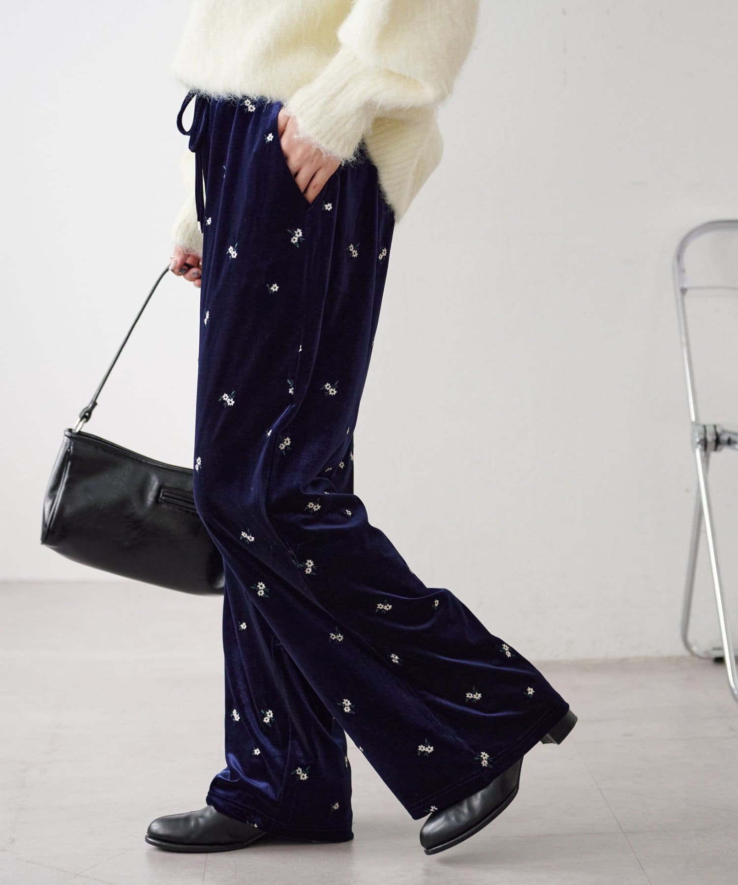 ベロア素材のパンツは程よい光沢感があり、高見えを叶えます。