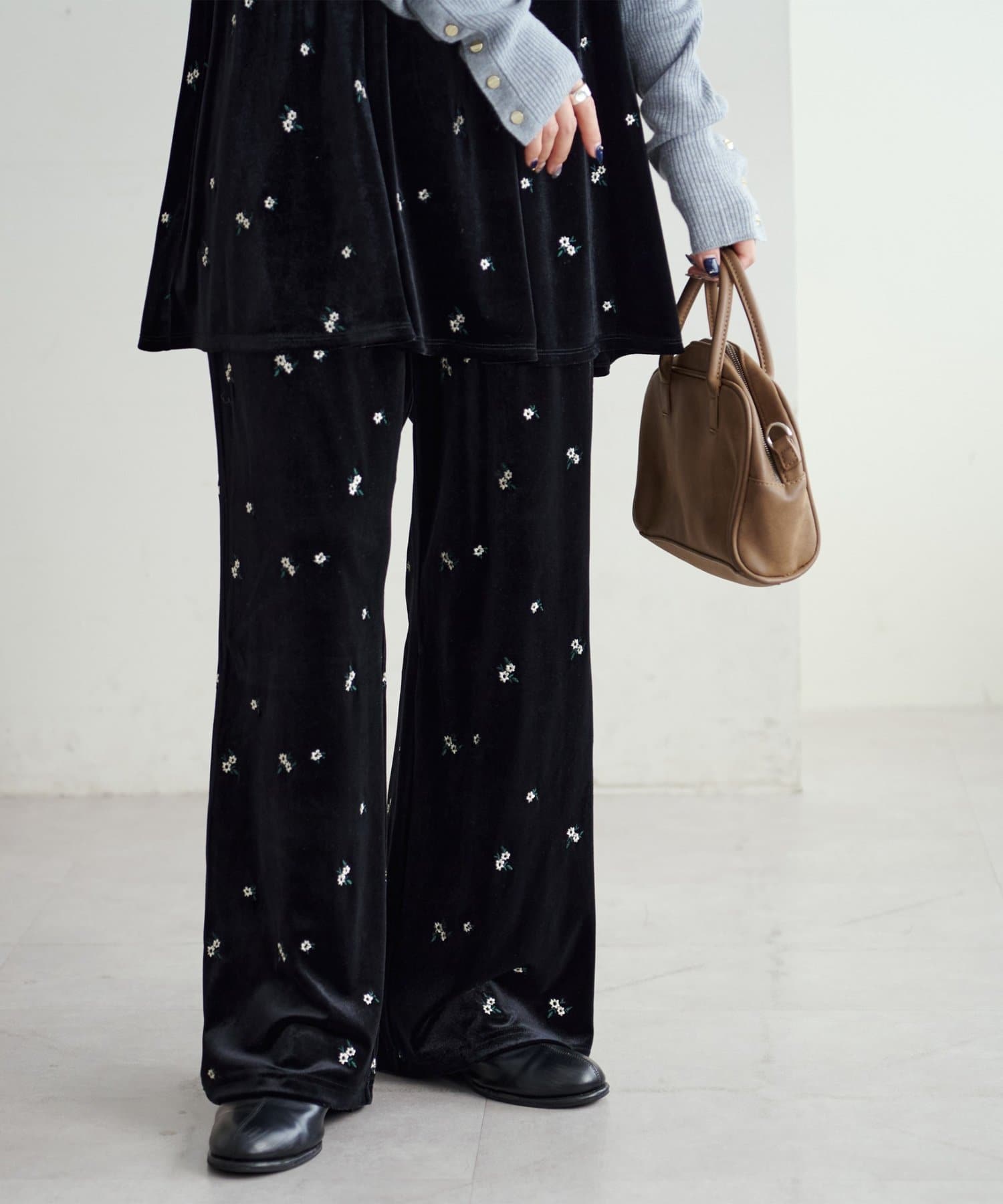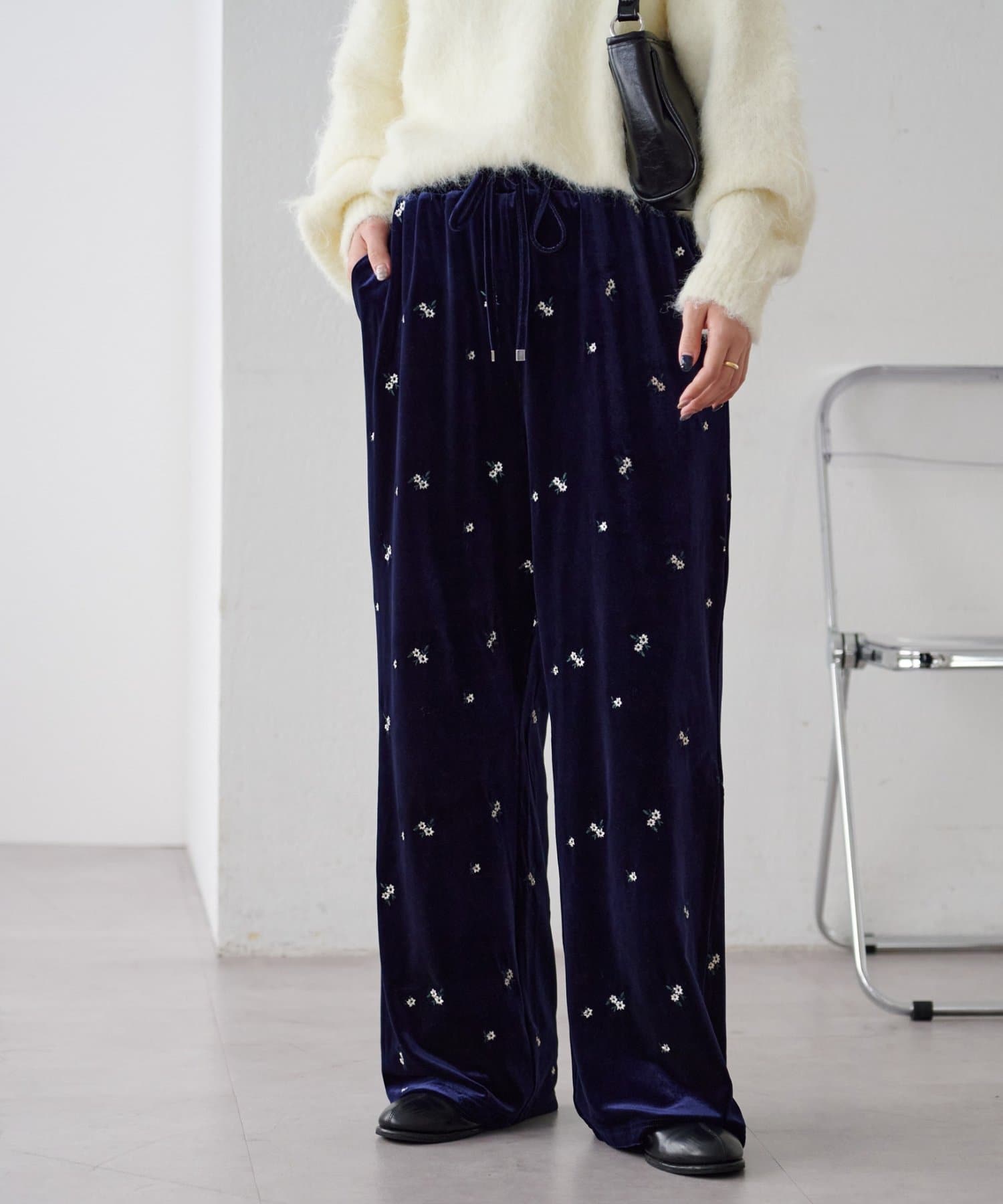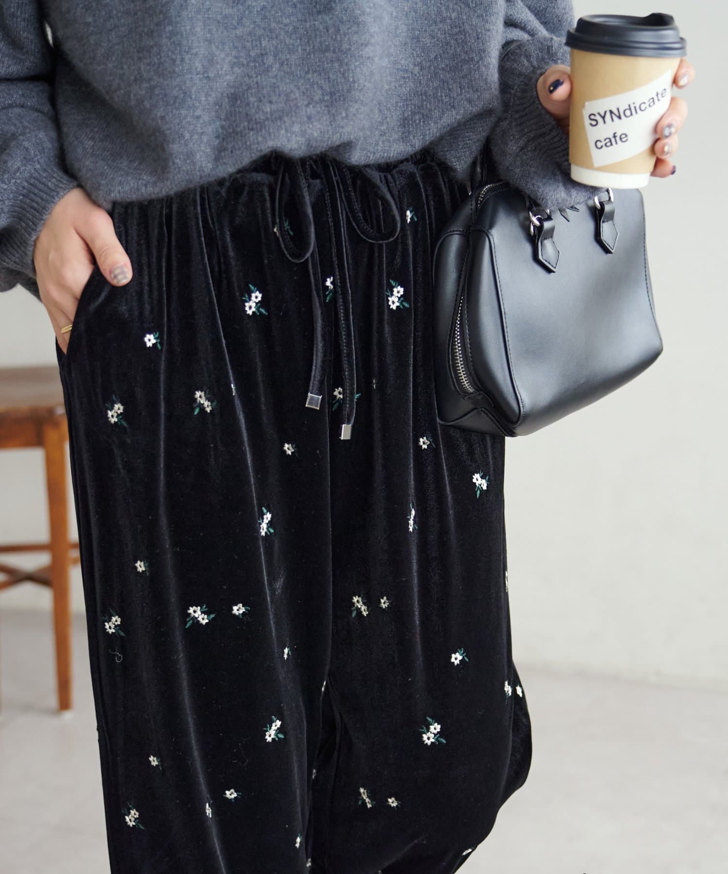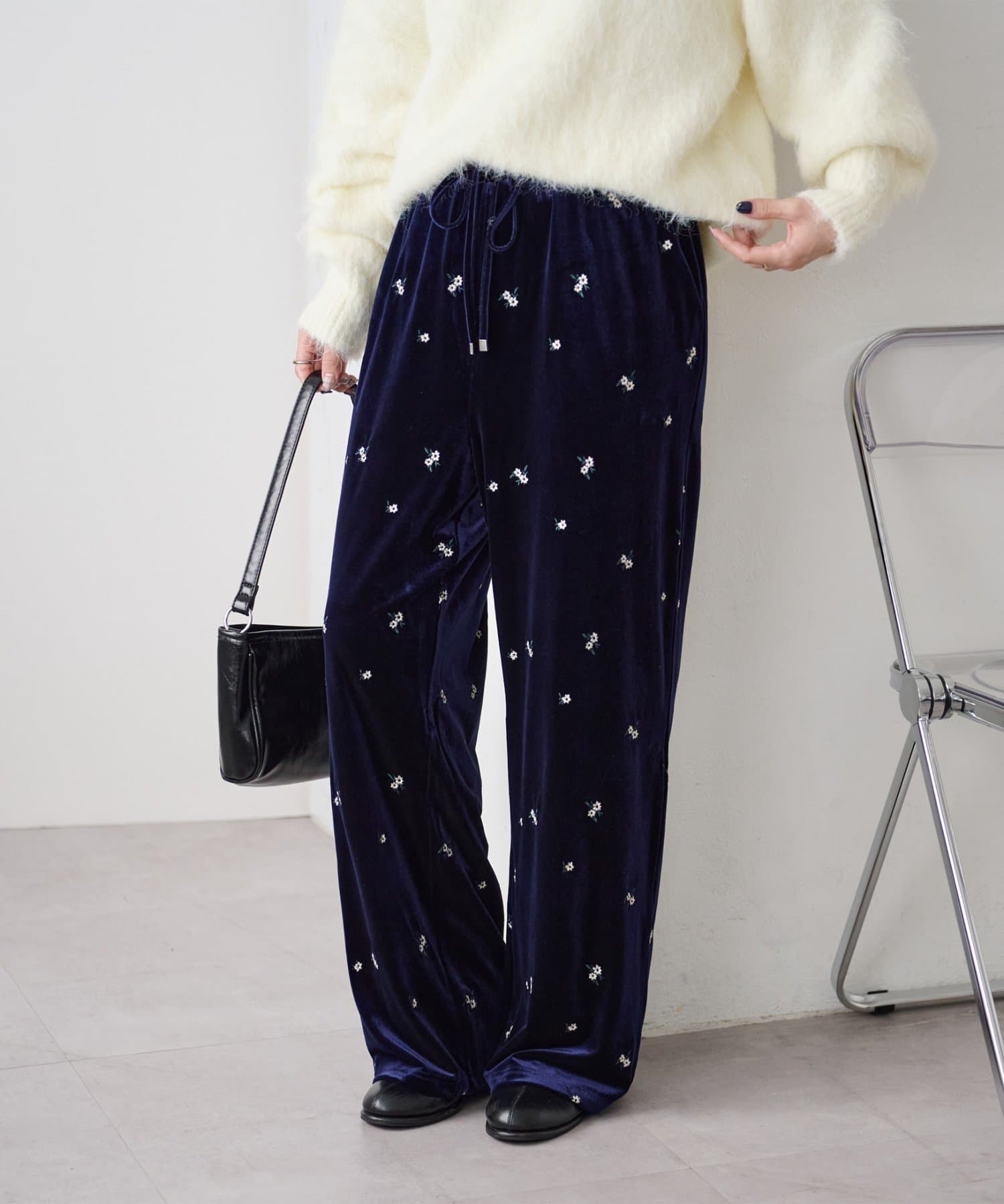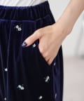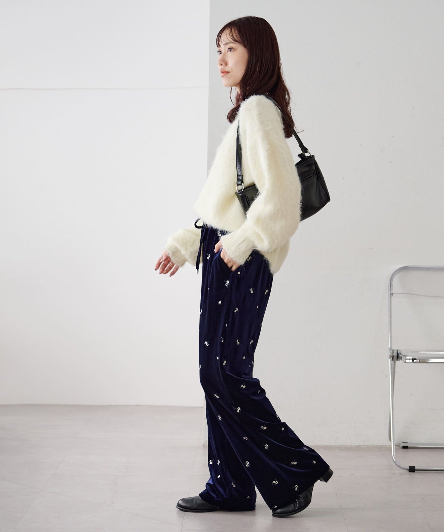 ベロア素材のパンツは程よい光沢感があり、高見えを叶えます。