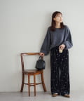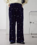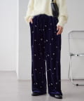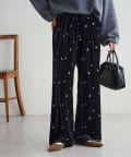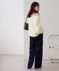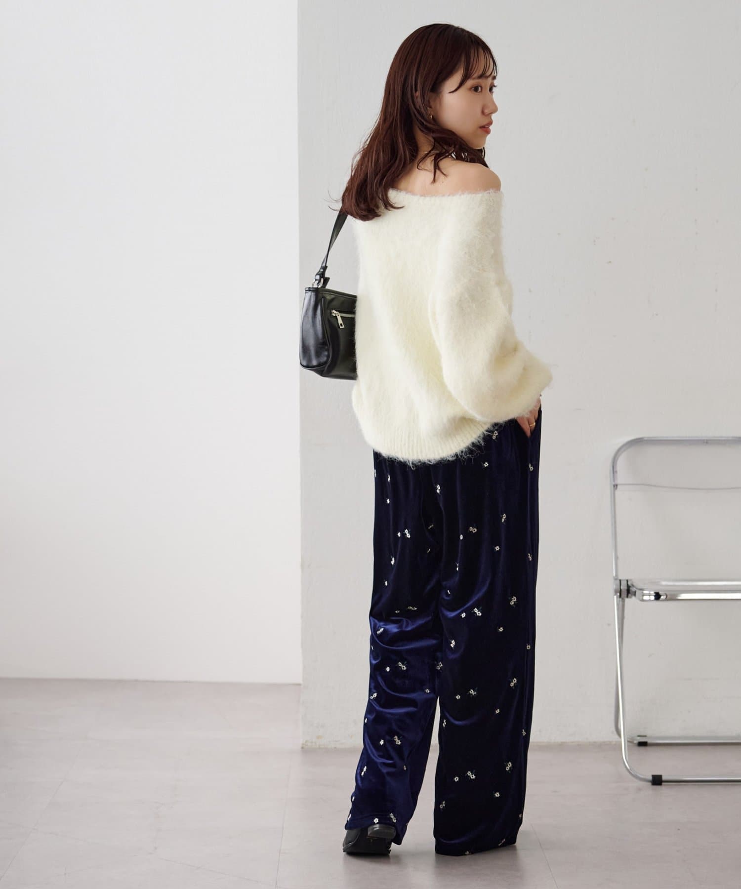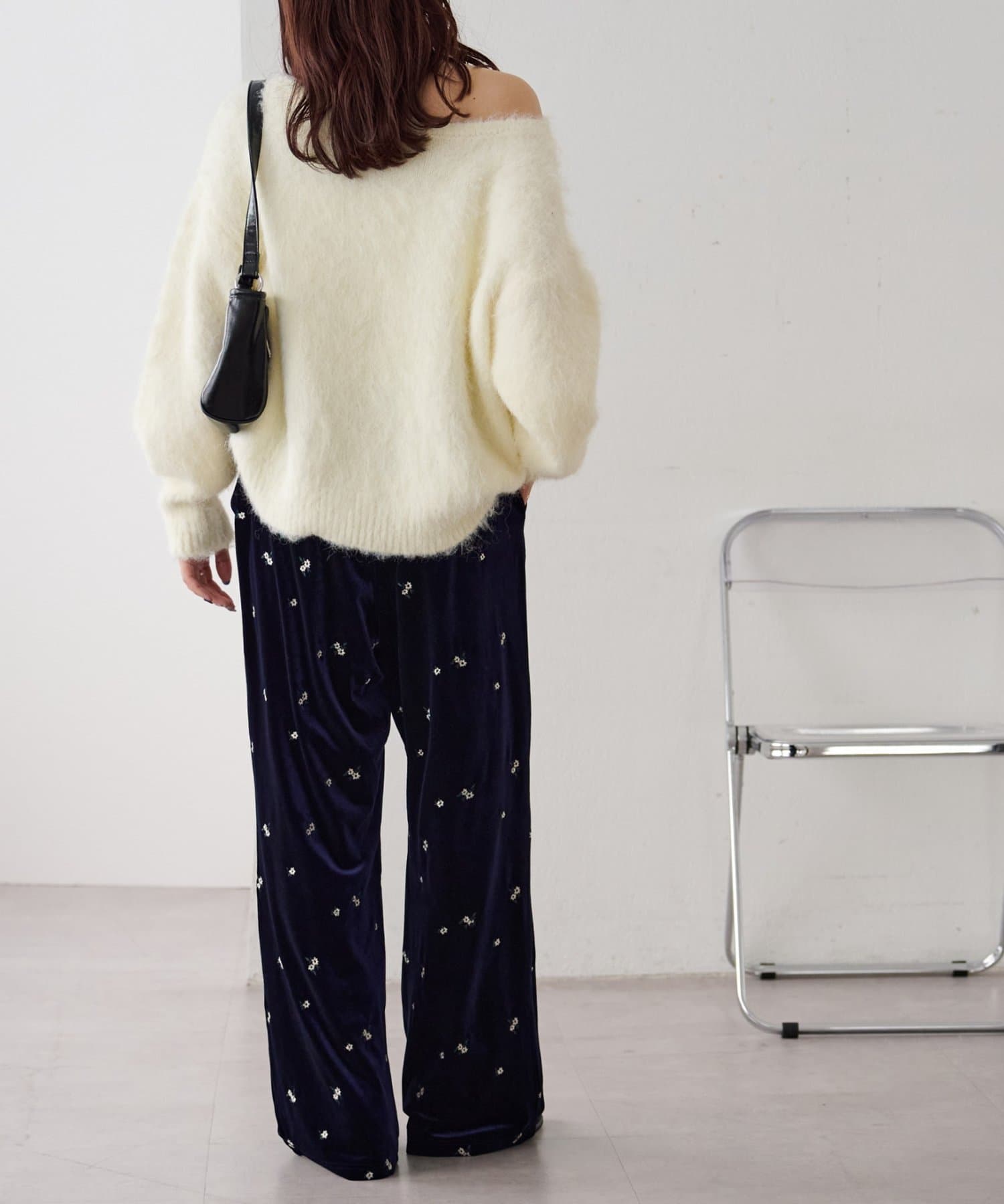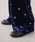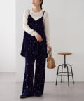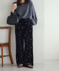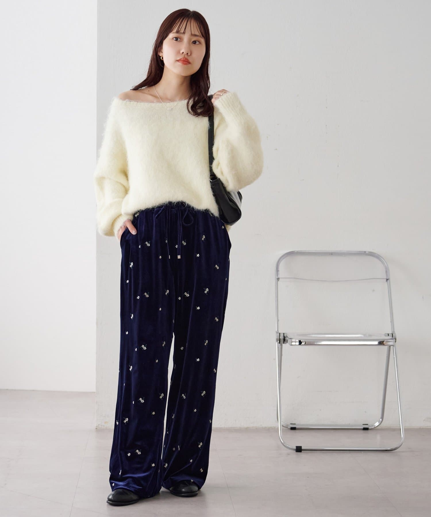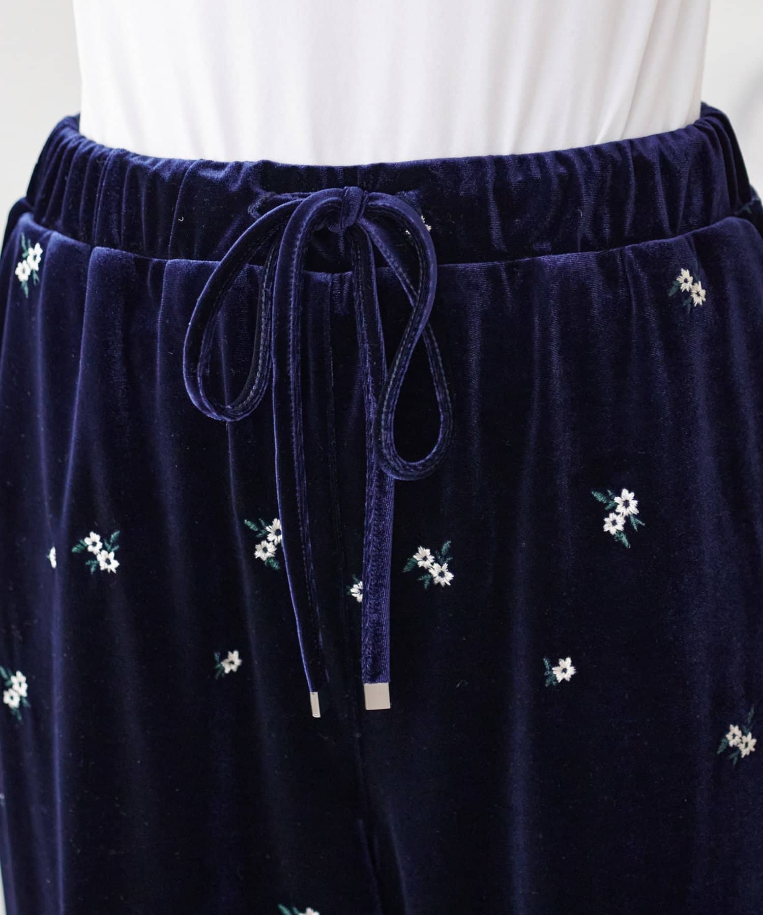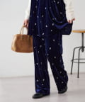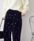 ベロア素材のパンツは程よい光沢感があり、高見えを叶えます。