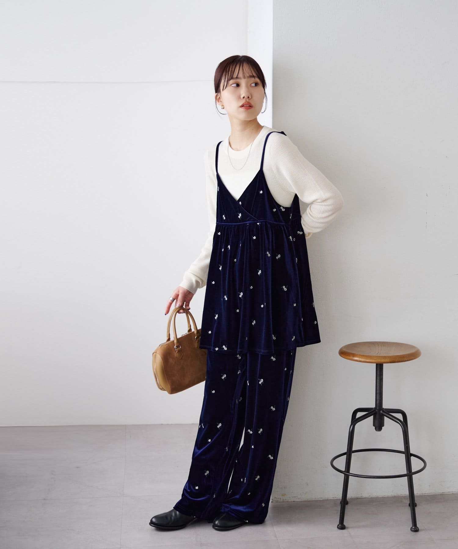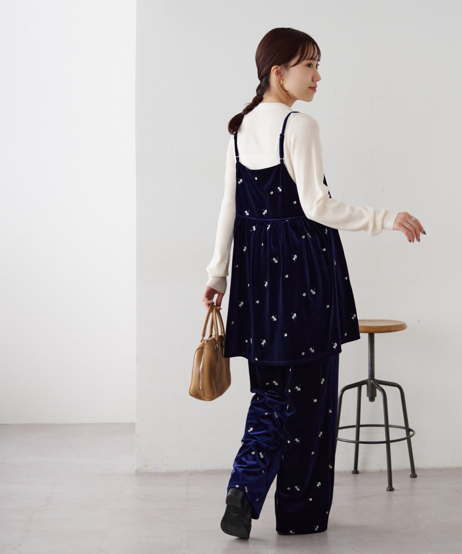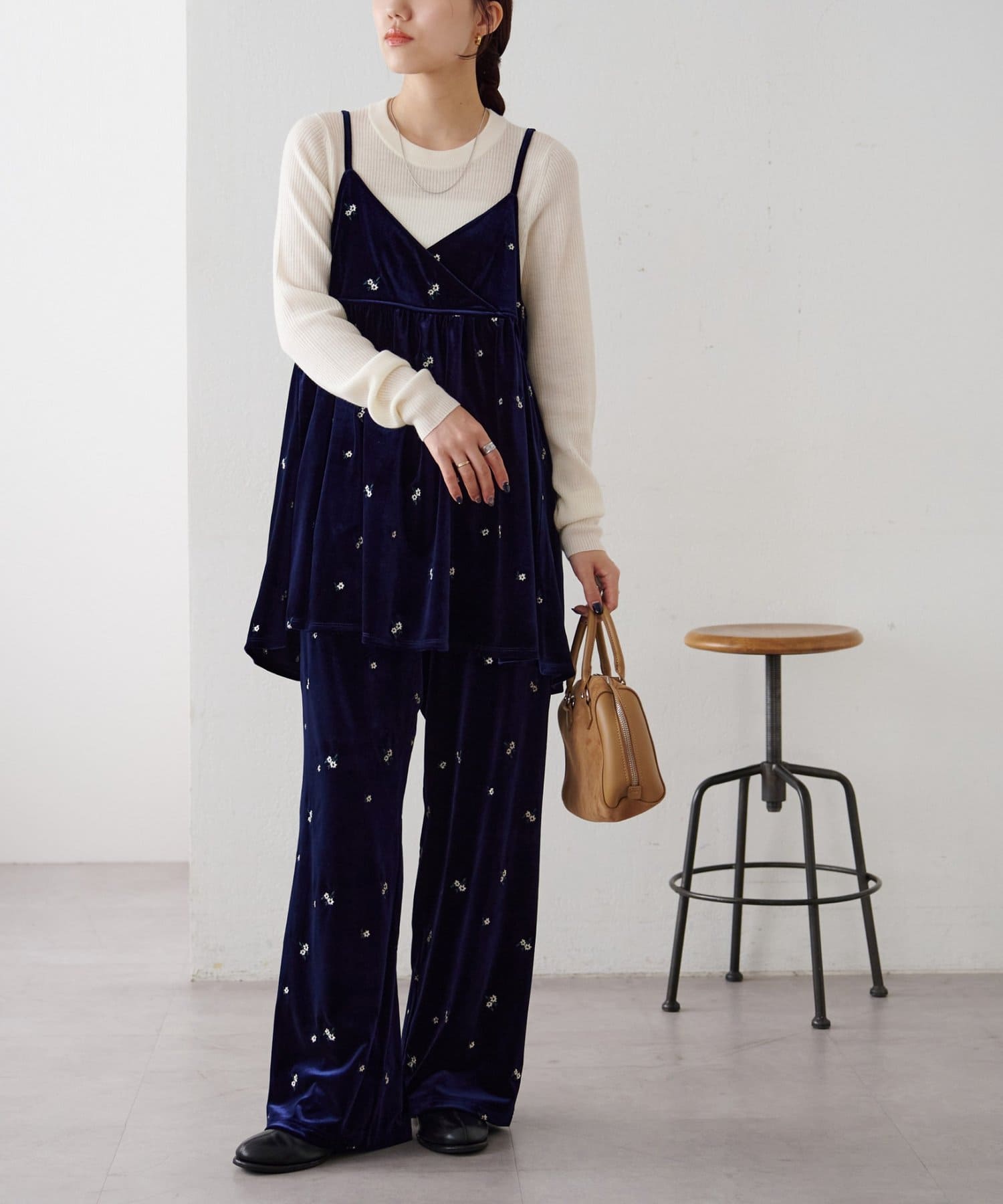 同素材のチュニック【ベロア刺繍カシュクールキャミチュニック】を合わせるとセットアップ風にも着ていただけます。