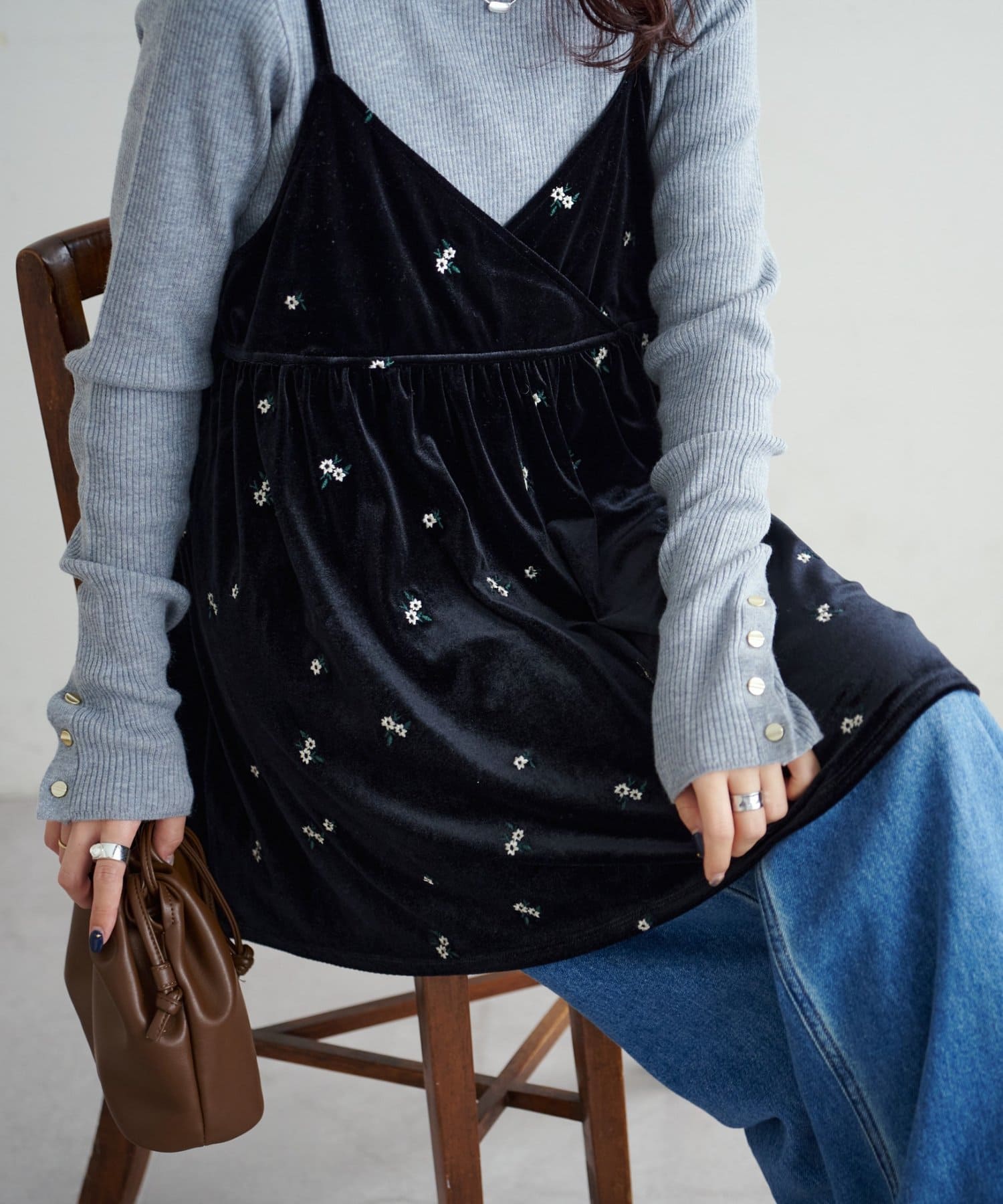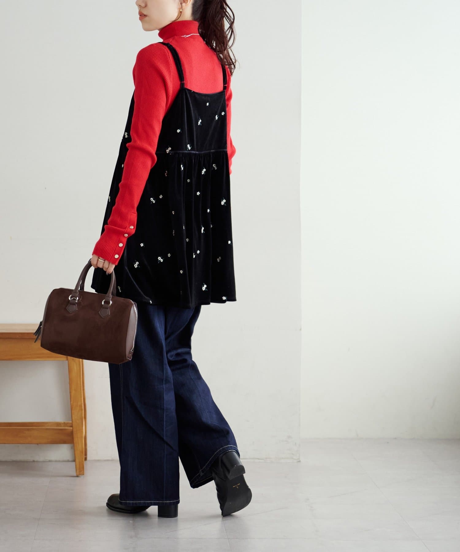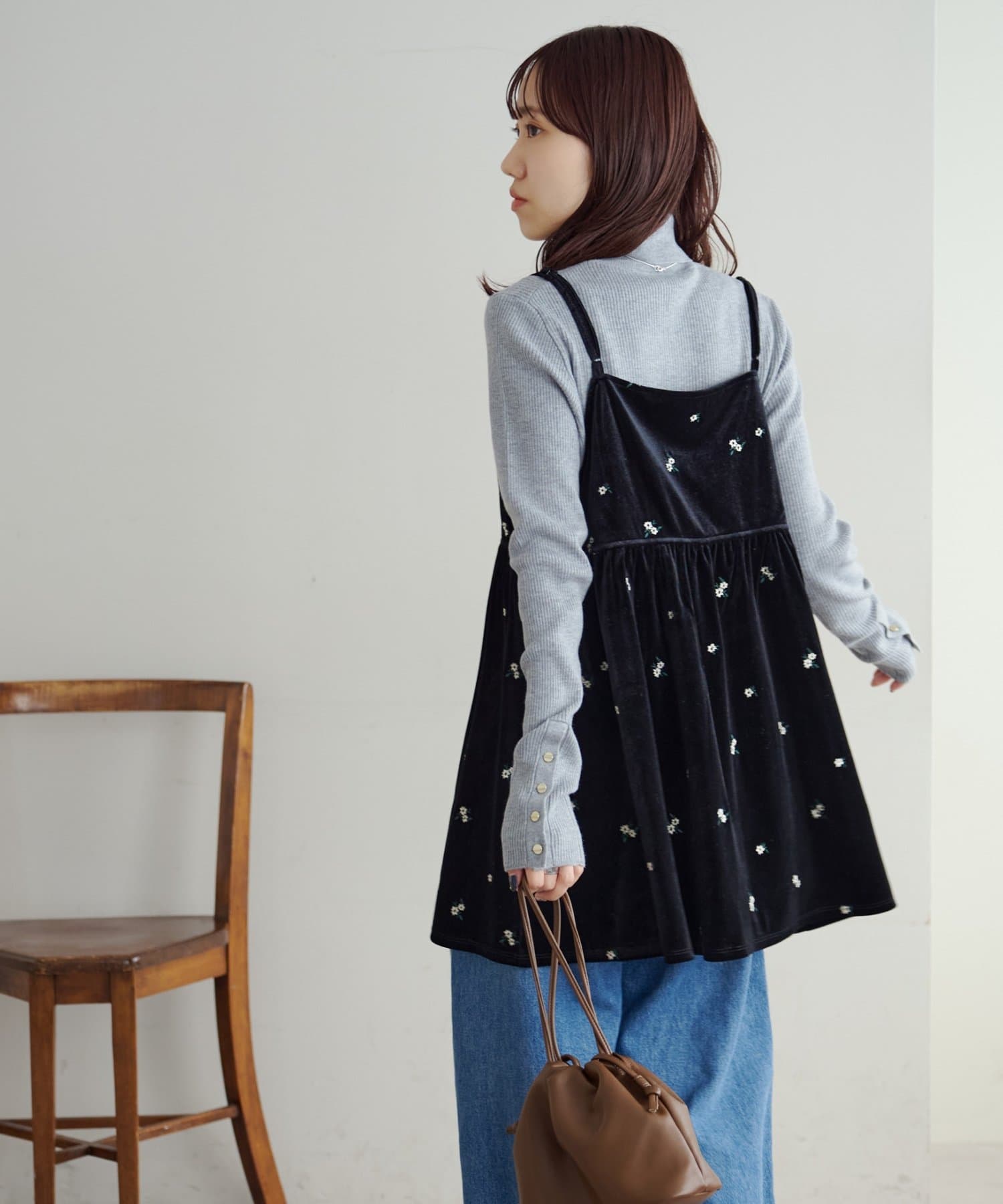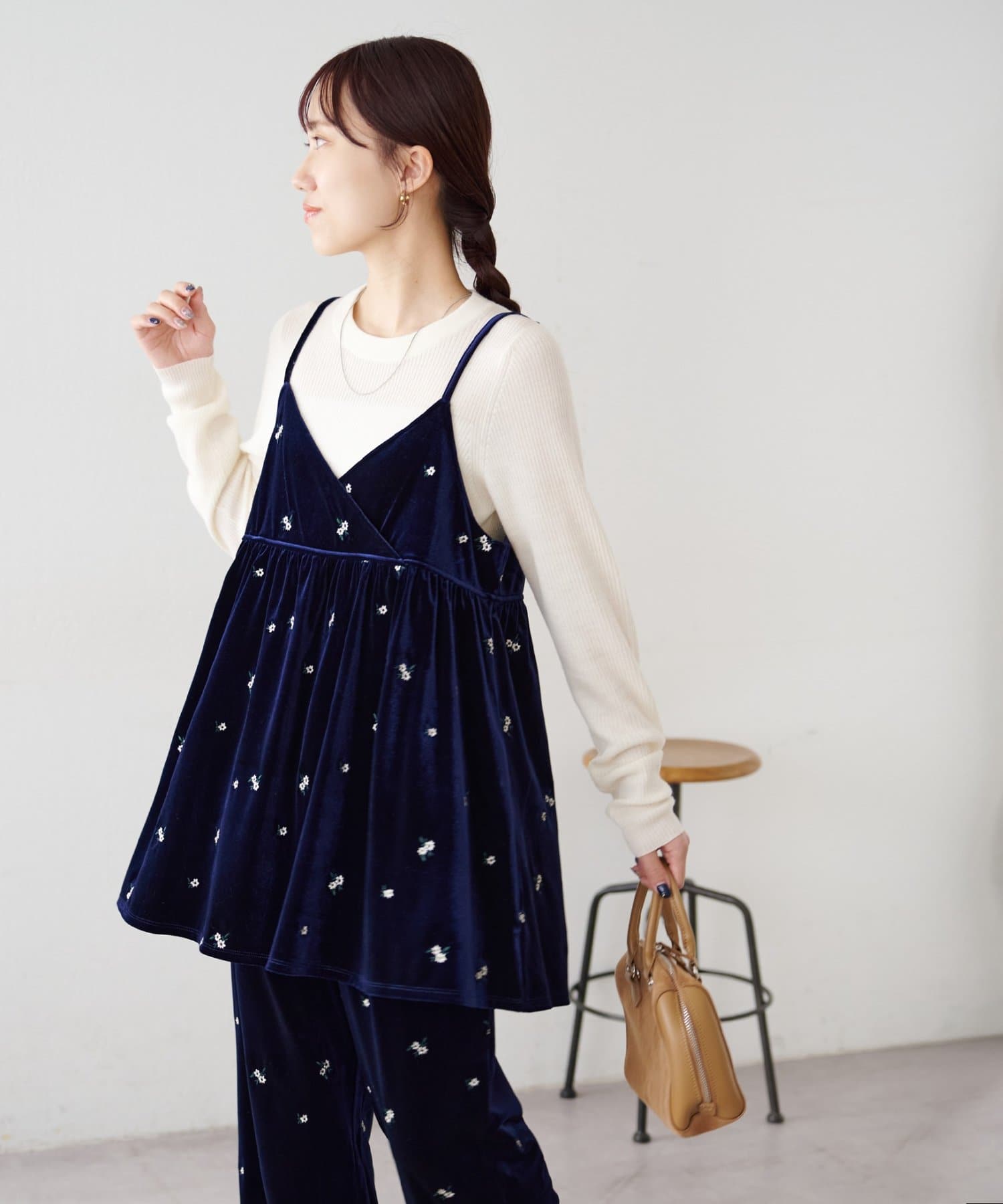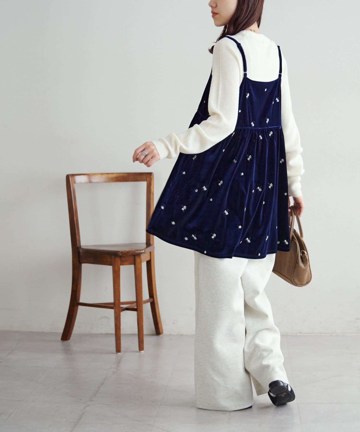 花柄とベロアの素材がポイントになるチュニックなので、インナーはシンプルなTシャツやリブニット合わせがおすすめ◎