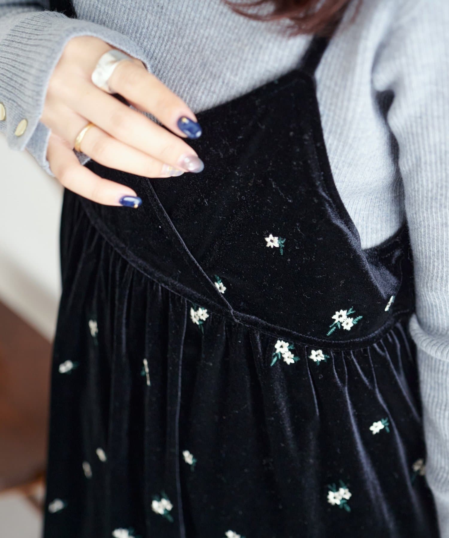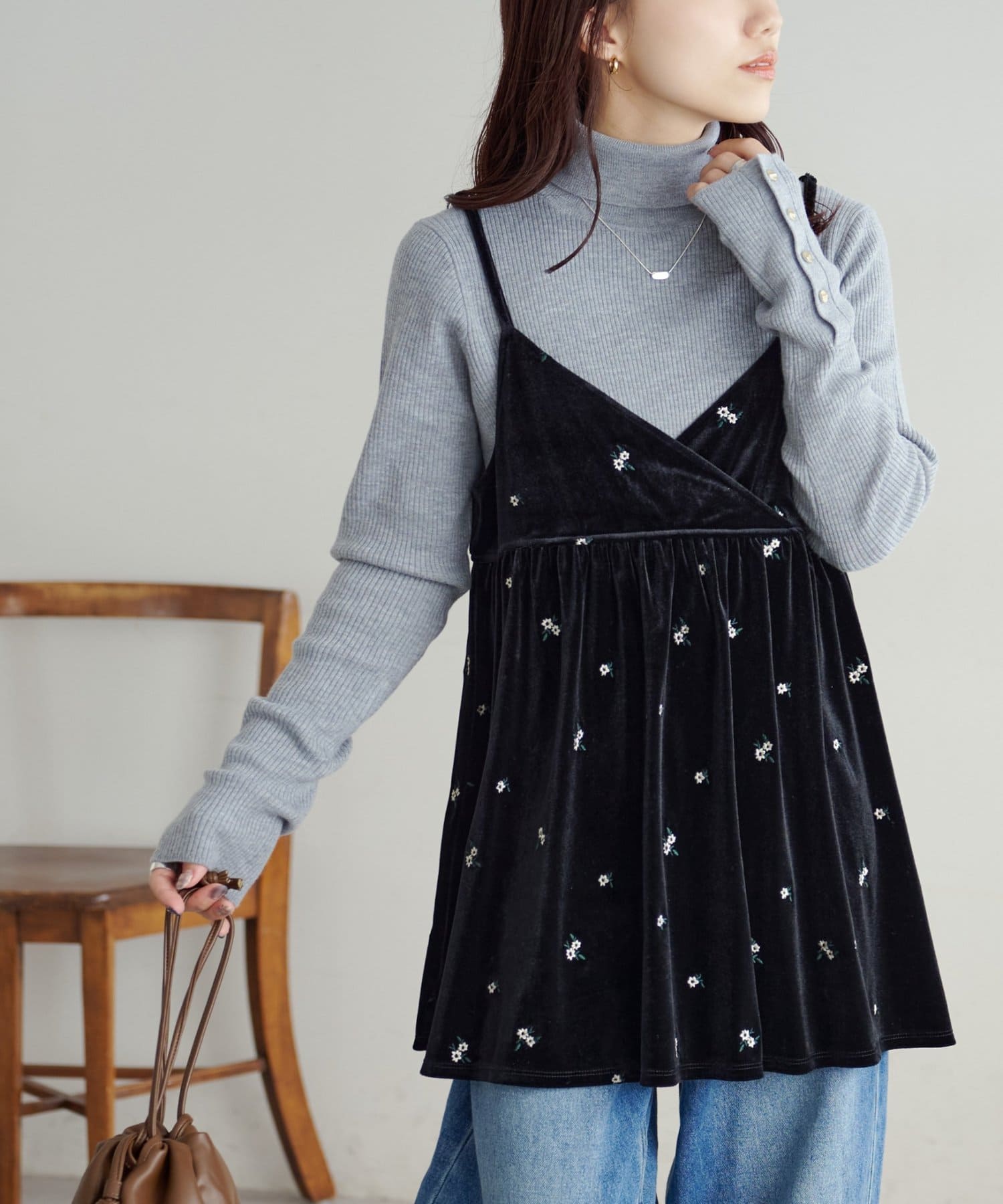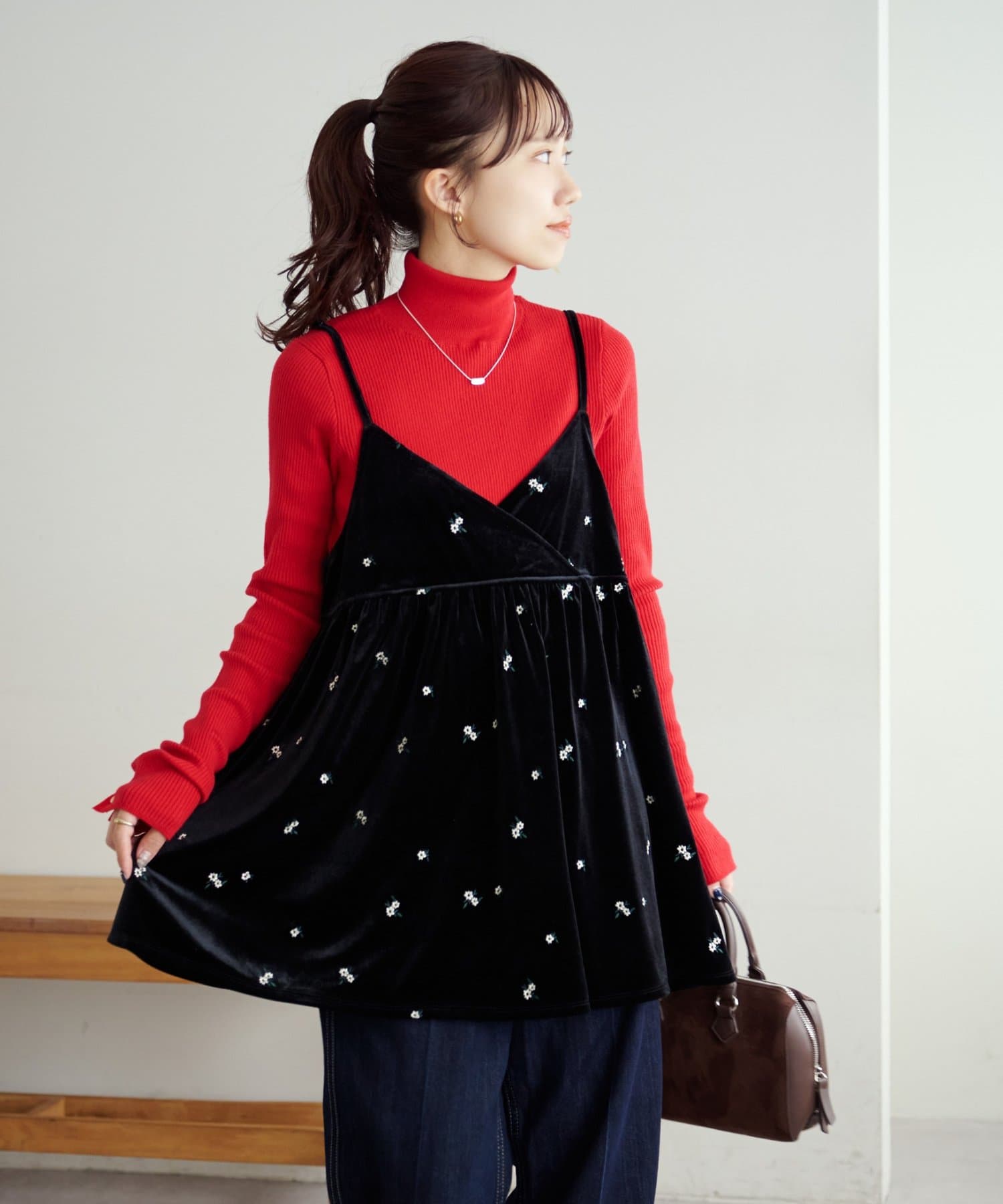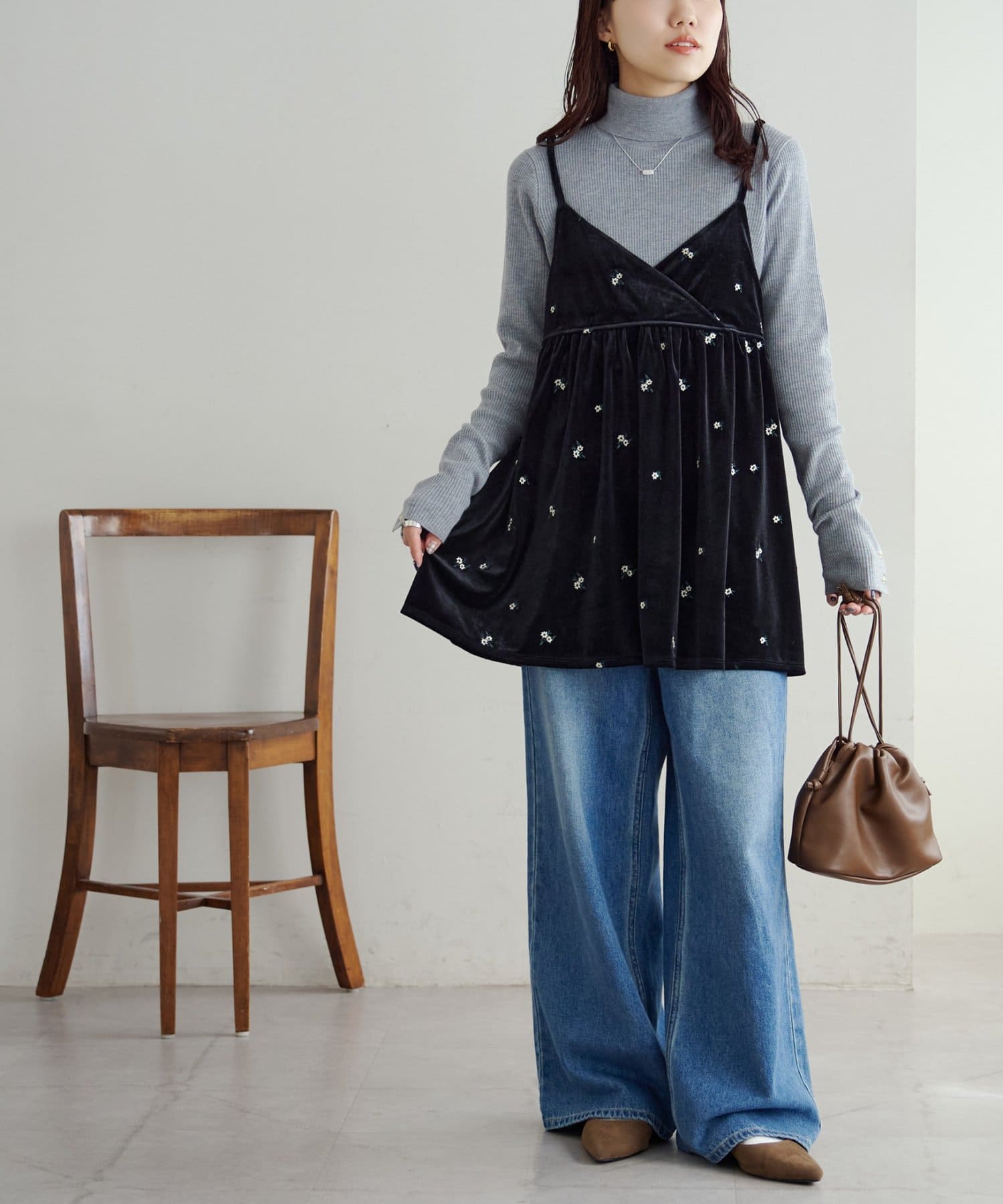 花柄とベロアの素材がポイントになるチュニックなので、インナーはシンプルなTシャツやリブニット合わせがおすすめ◎
