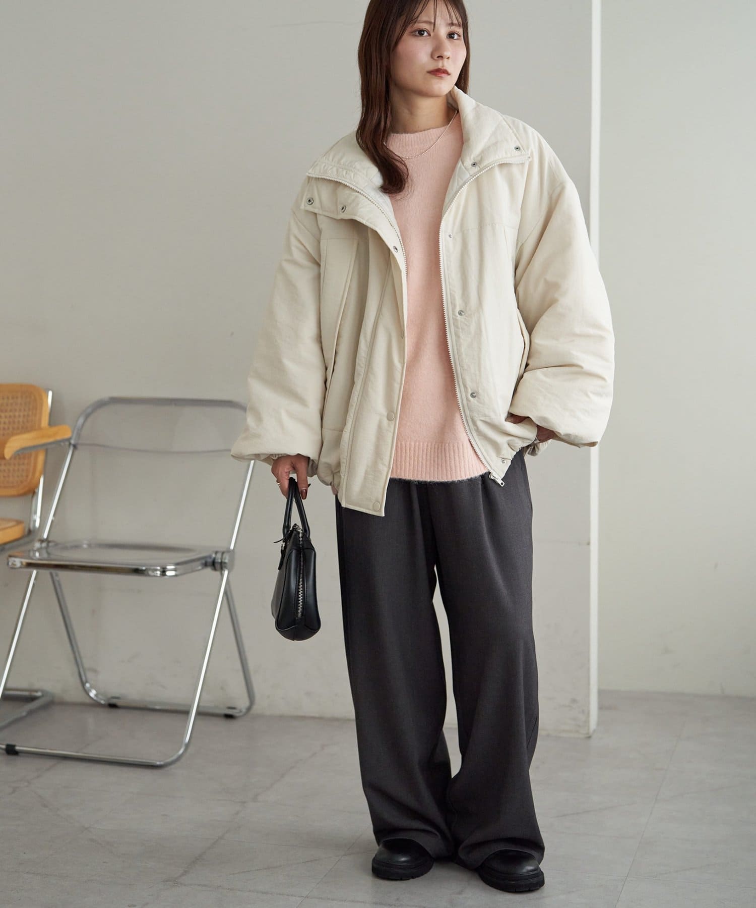 ボリューム感の出るアウターなので、その分ボトムスはすっきりとしたストレートシルエットのアイテム合わせがおすすめです。