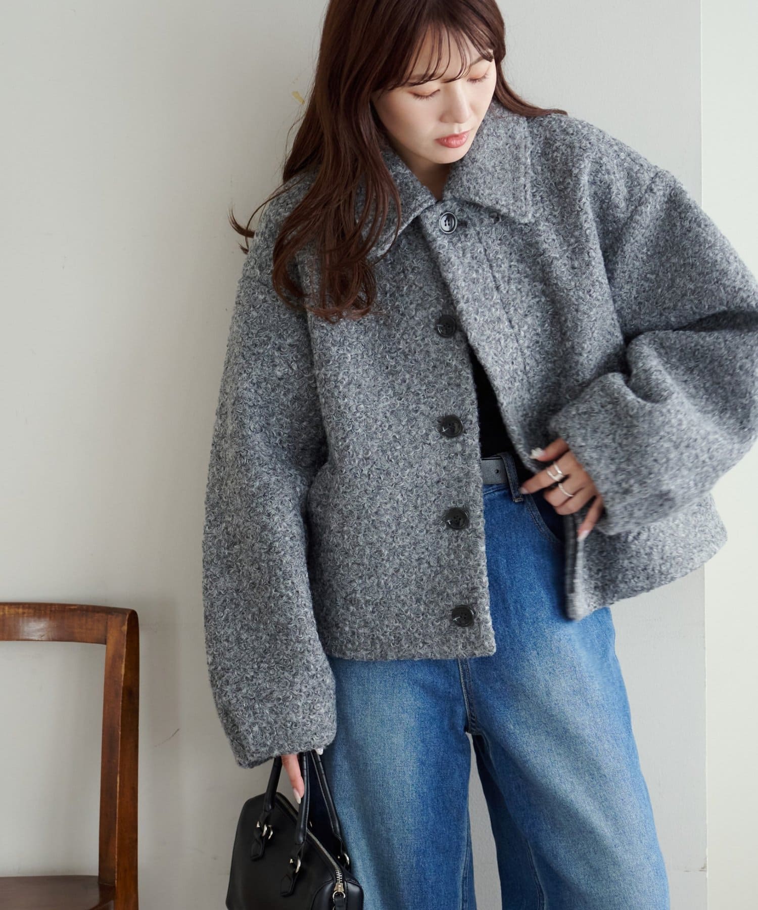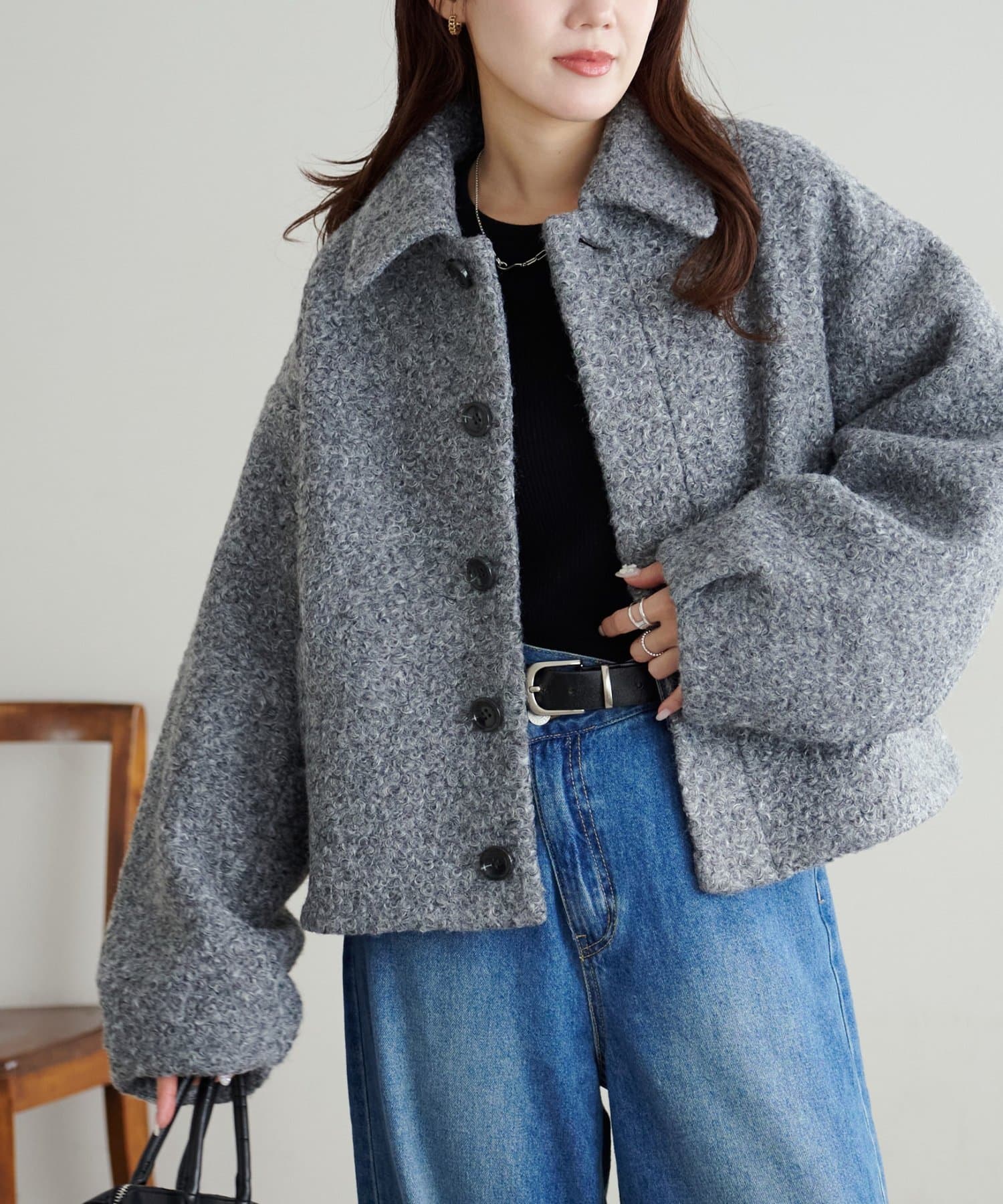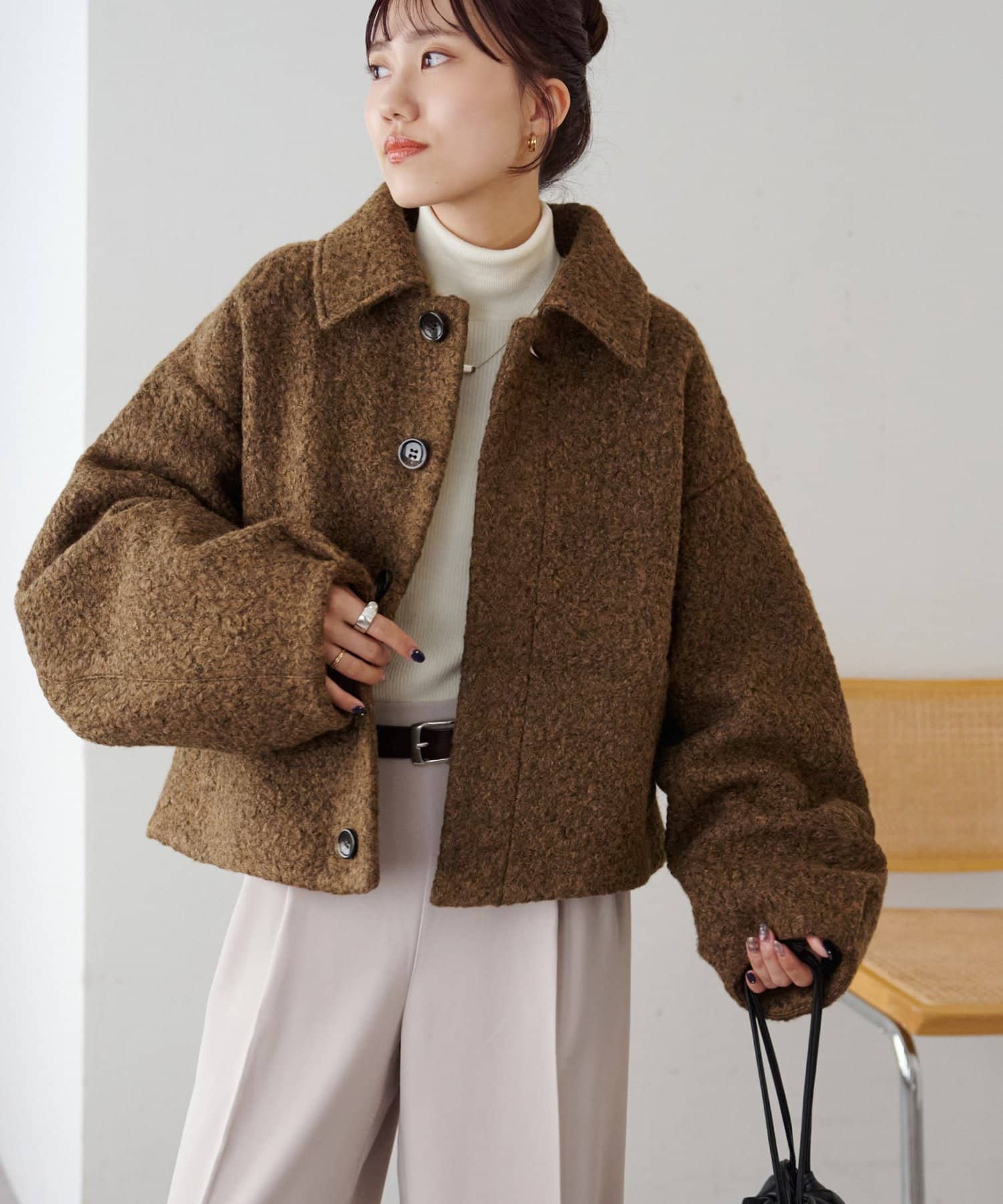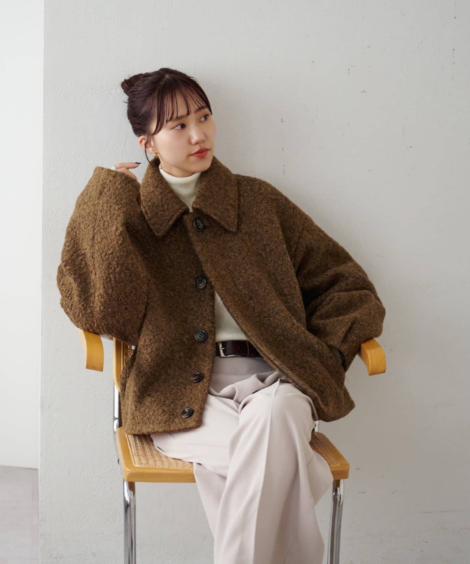 一色だけのブークレではなく、何色かが混ざっていることで、より表面感がありコーデの主役にもなるアウターです。