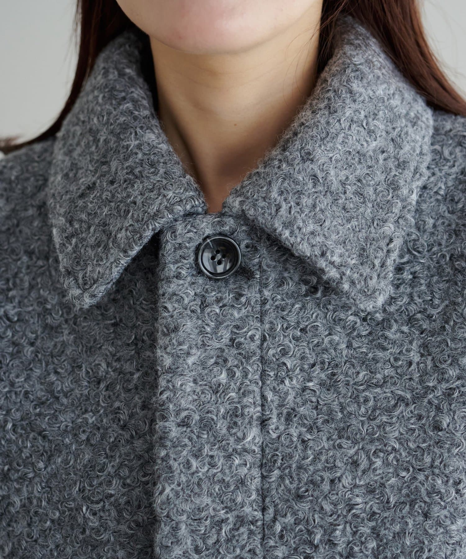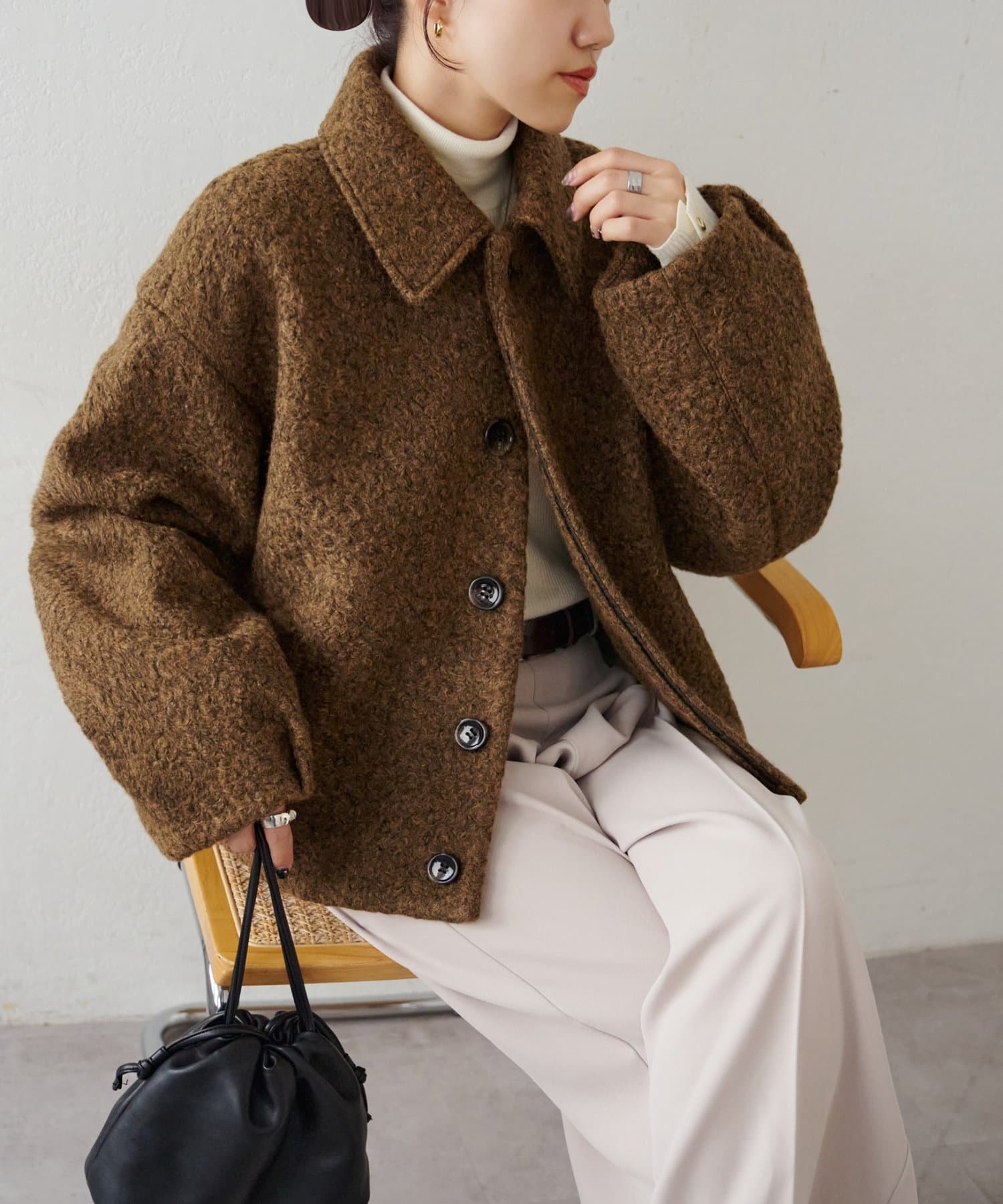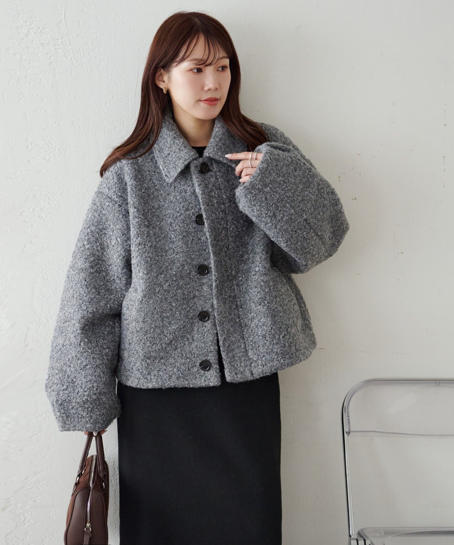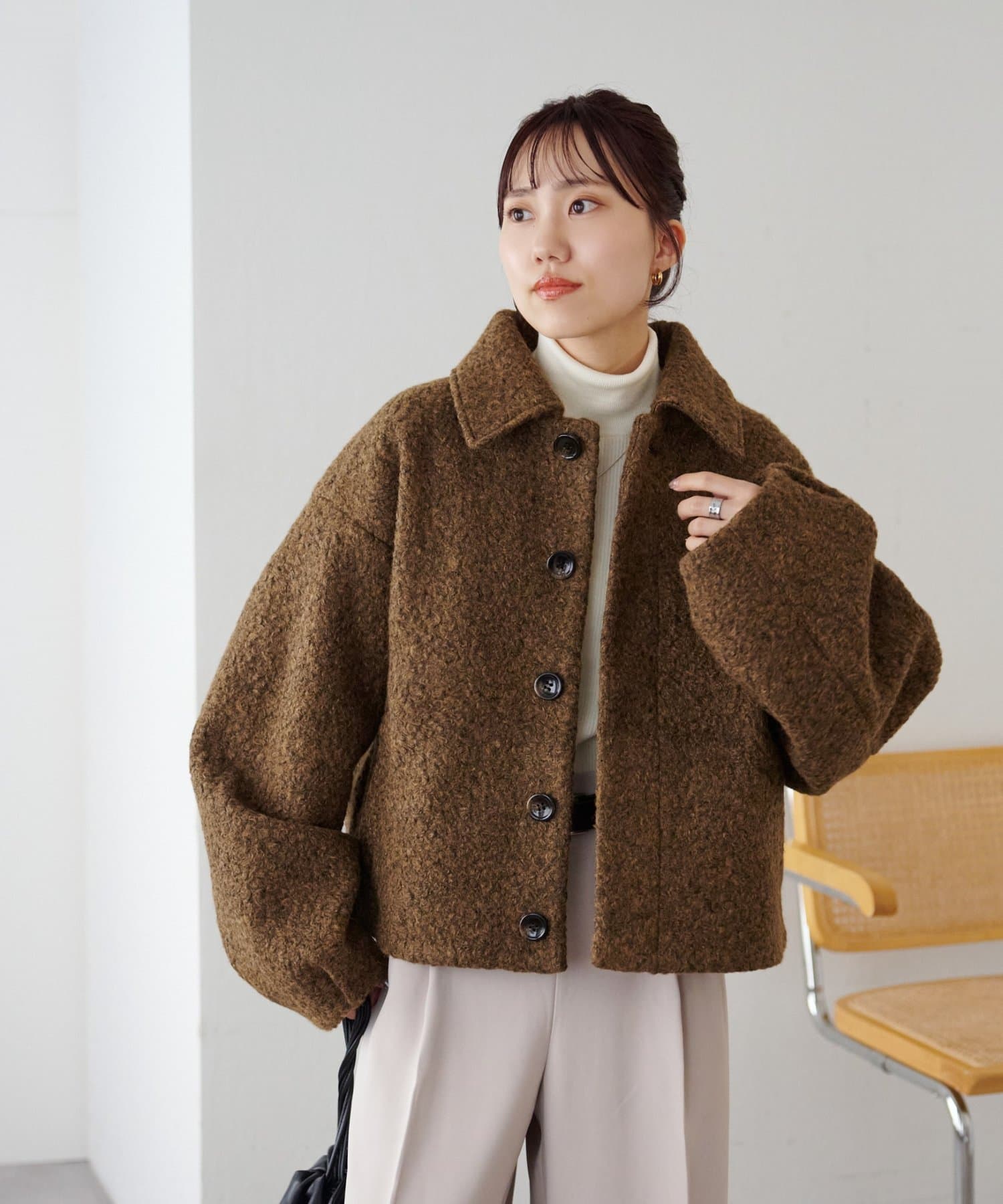 一色だけのブークレではなく、何色かが混ざっていることで、より表面感がありコーデの主役にもなるアウターです。