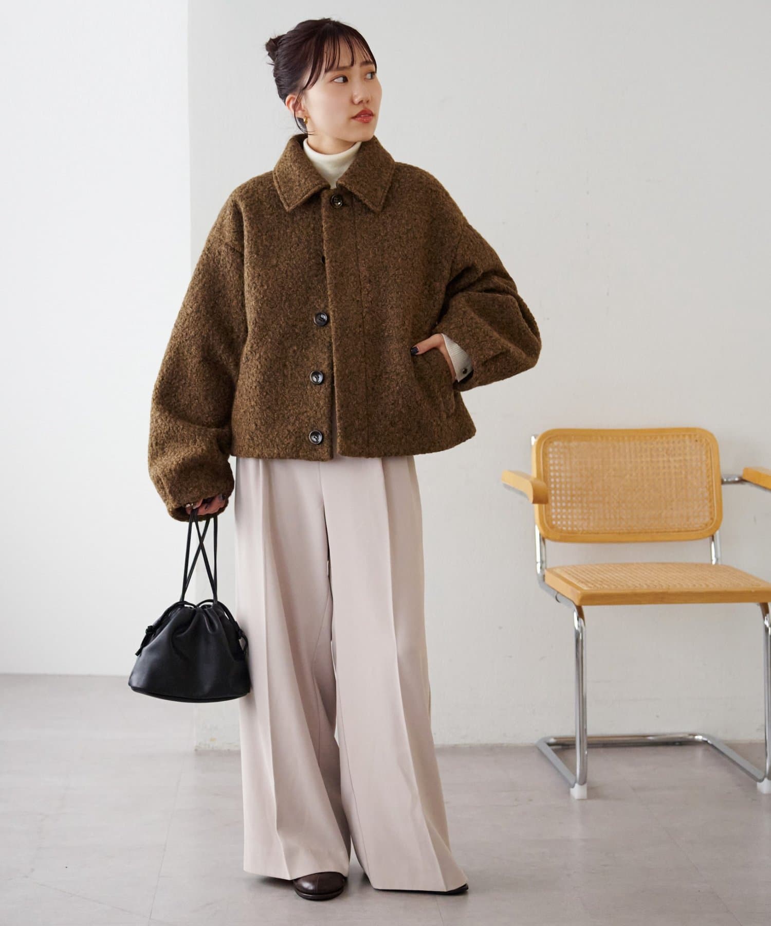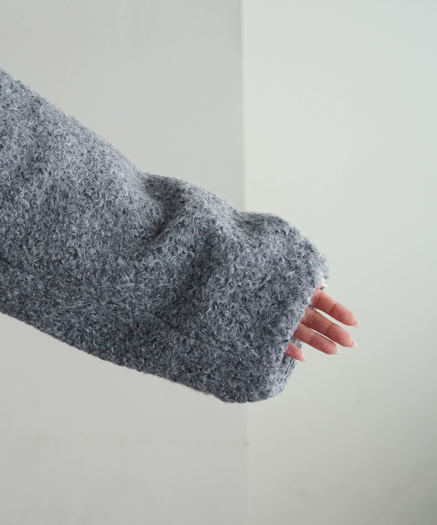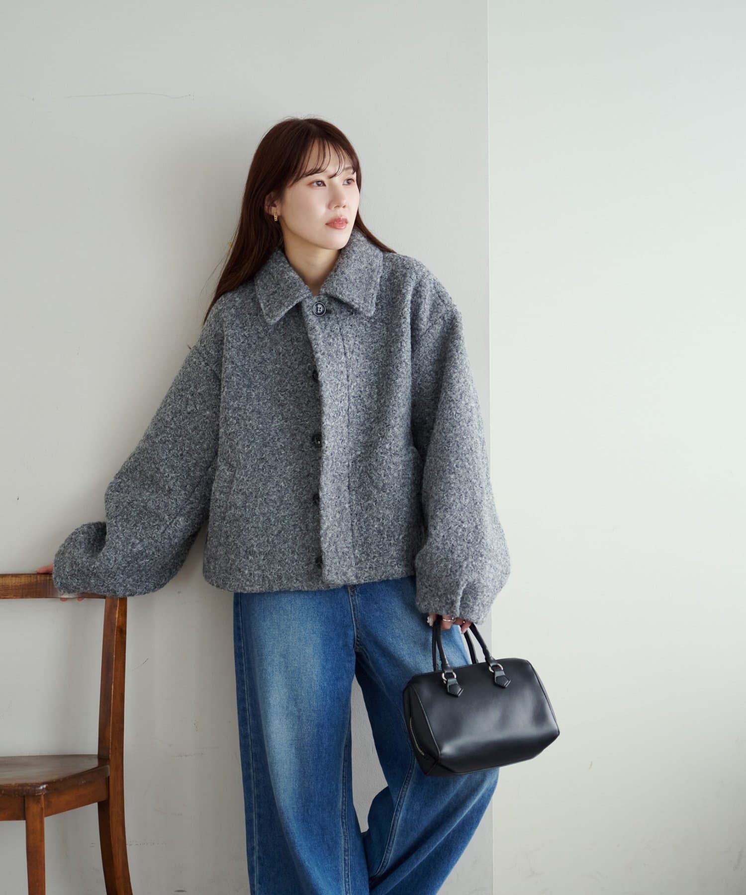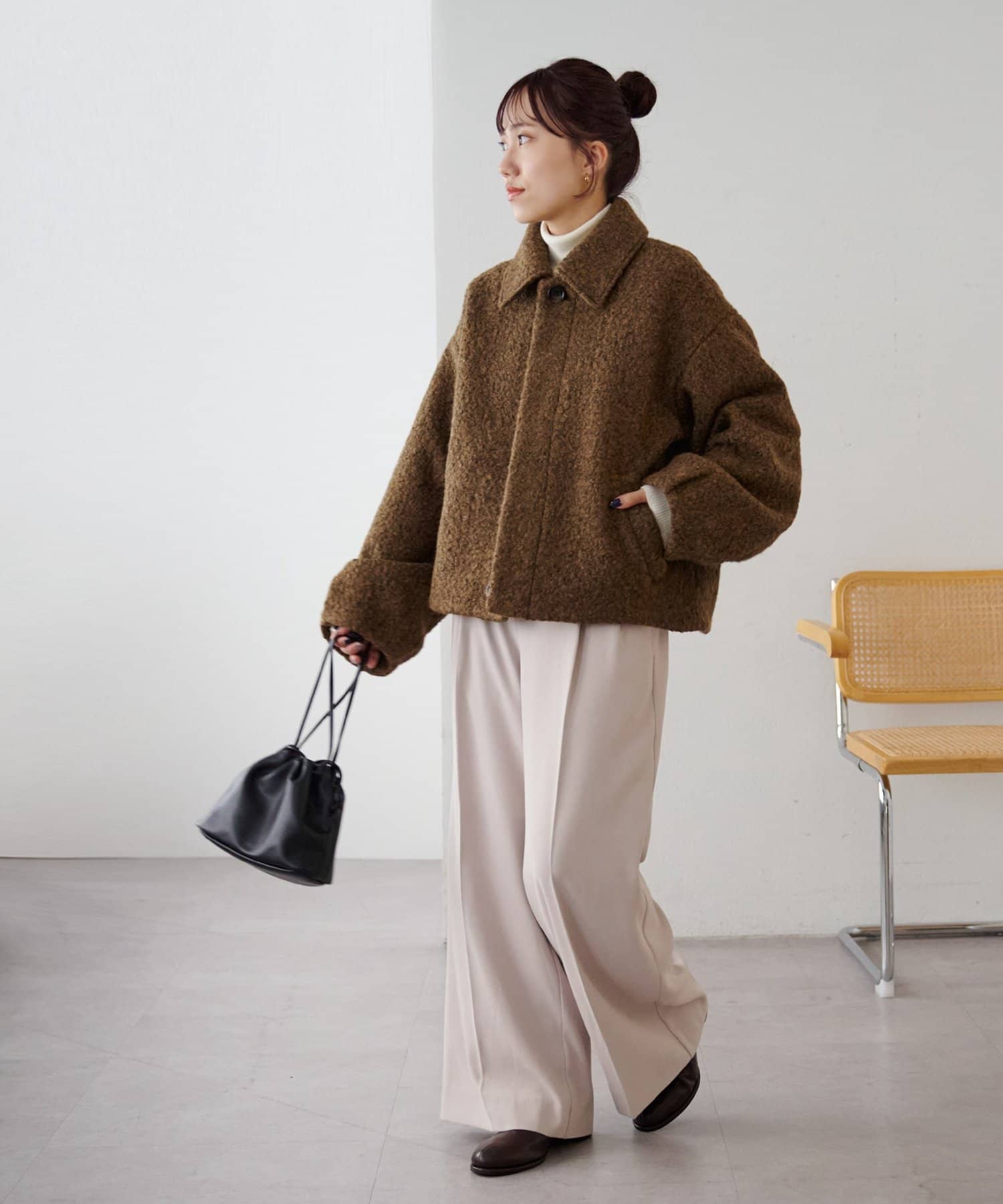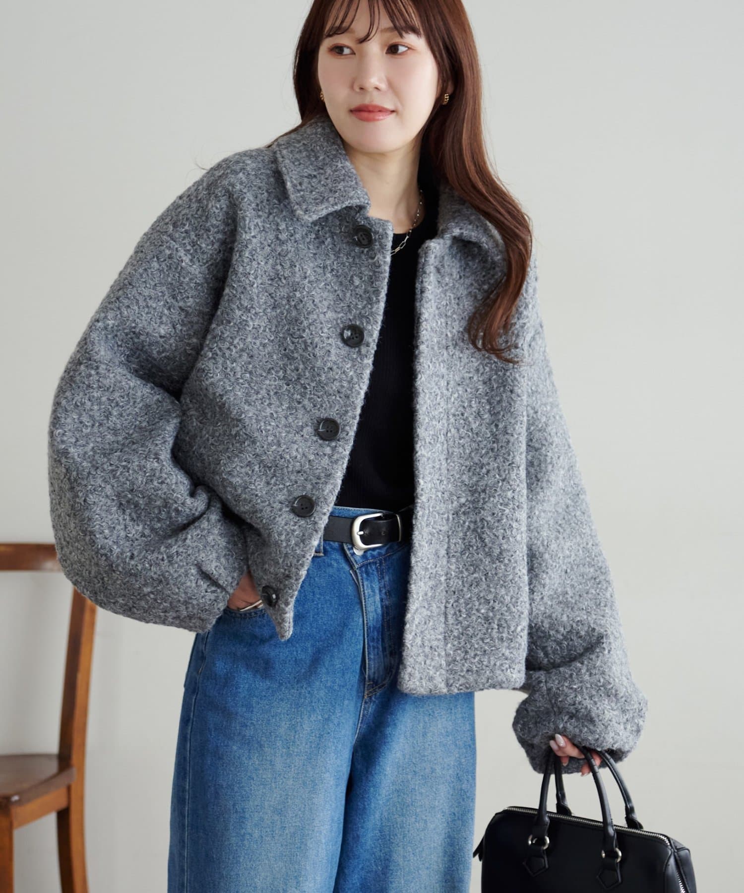 一色だけのブークレではなく、何色かが混ざっていることで、より表面感がありコーデの主役にもなるアウターです。