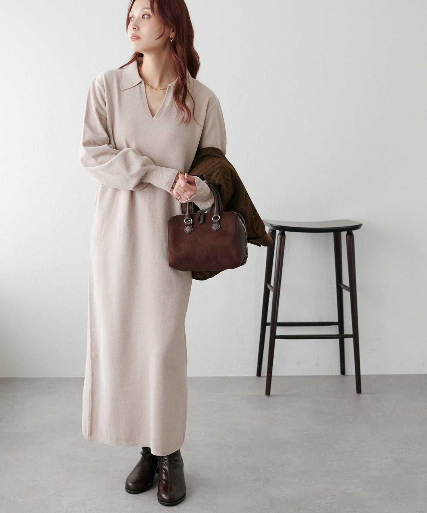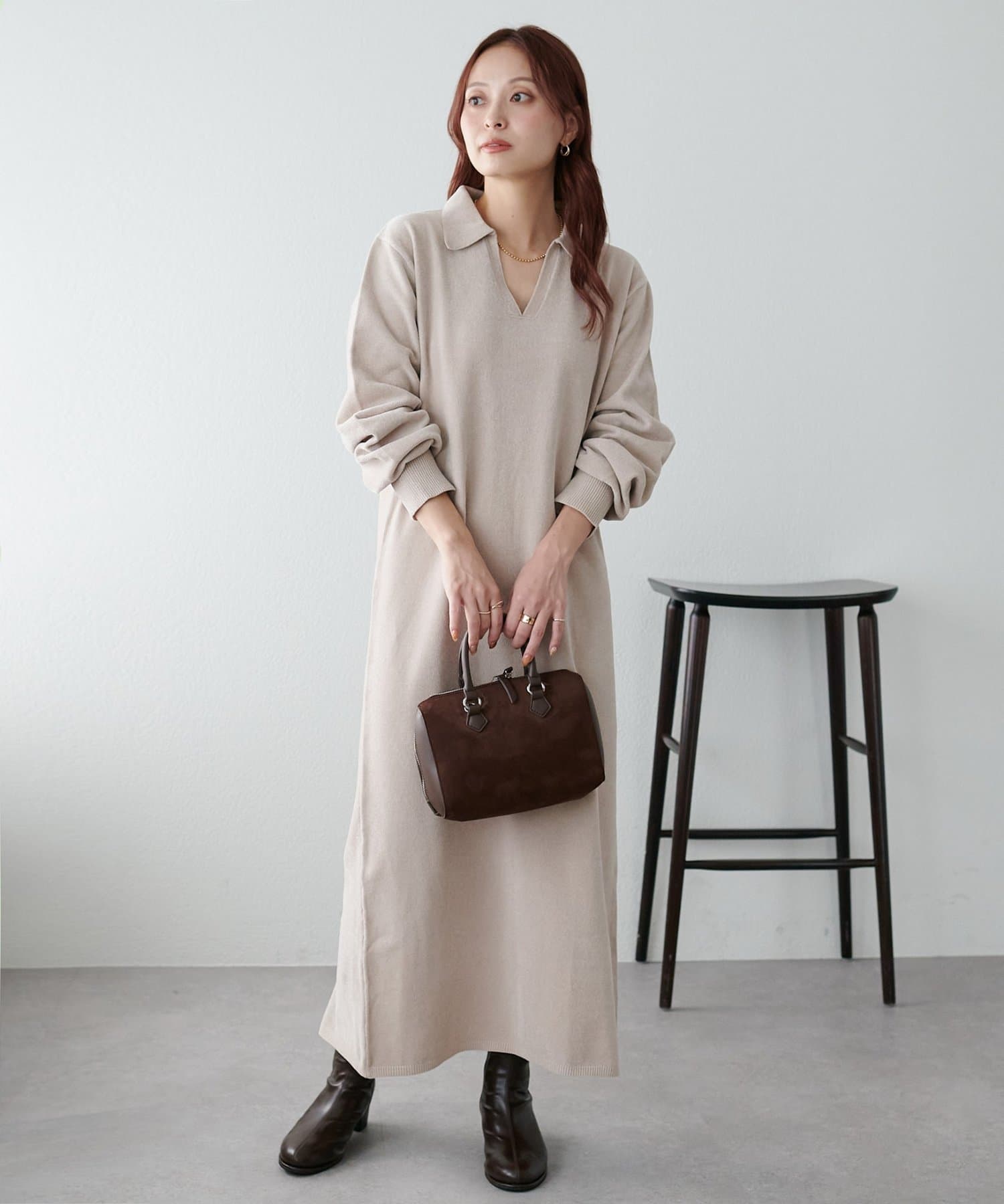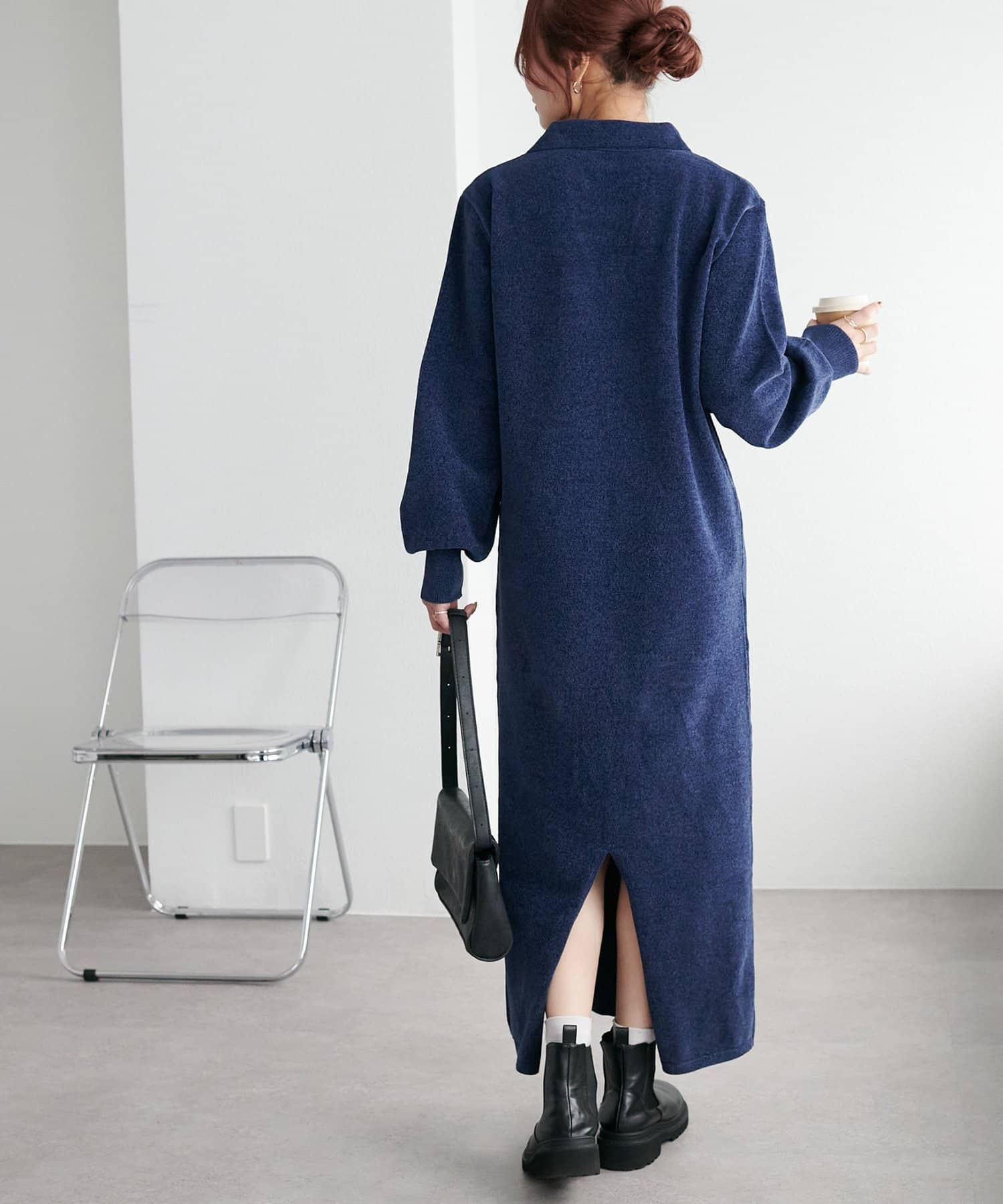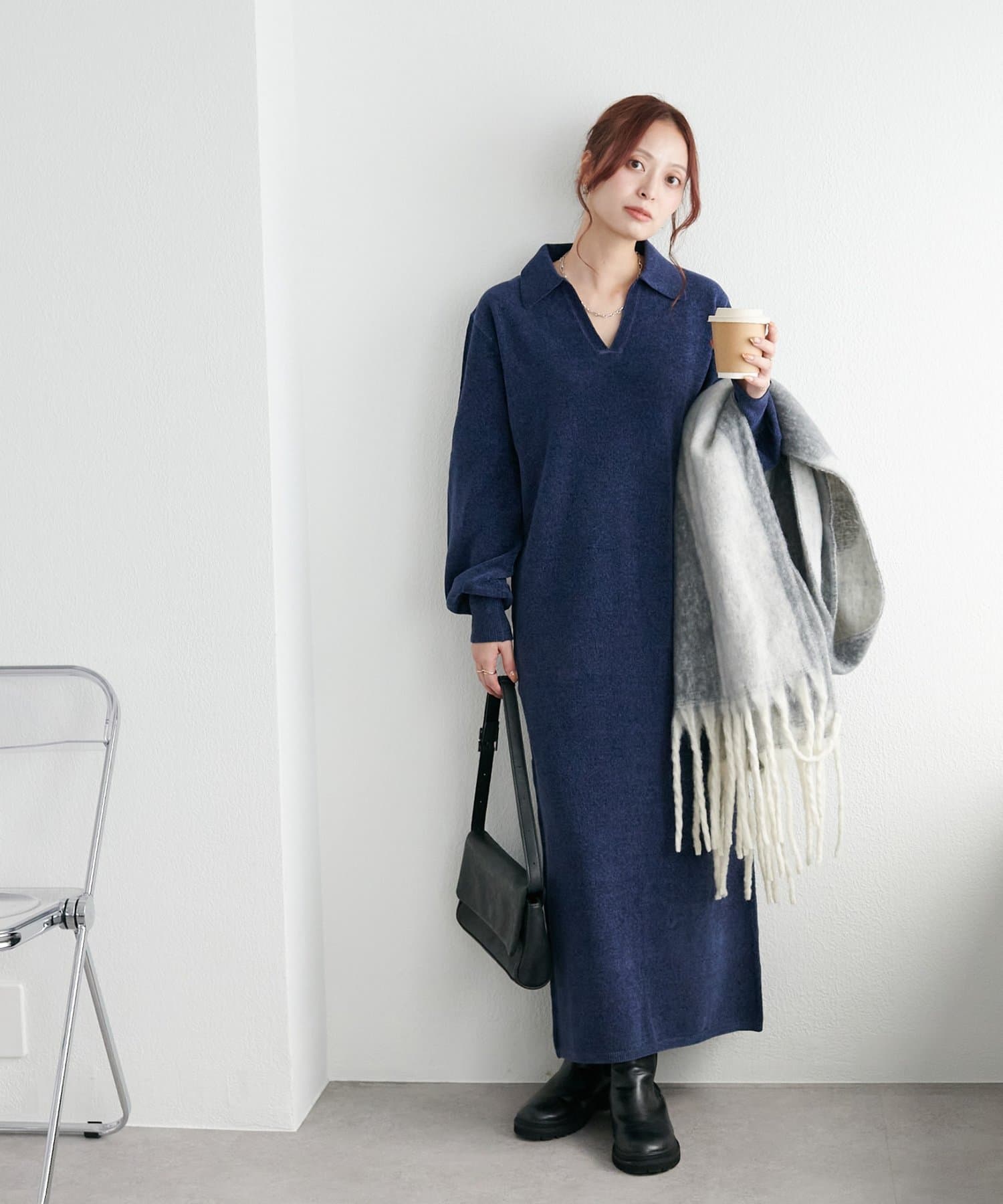 すとんと落ち感のあるシルエットにスキッパーのデザインがメリハリのある雰囲気を引き立ててくれるワンピース。