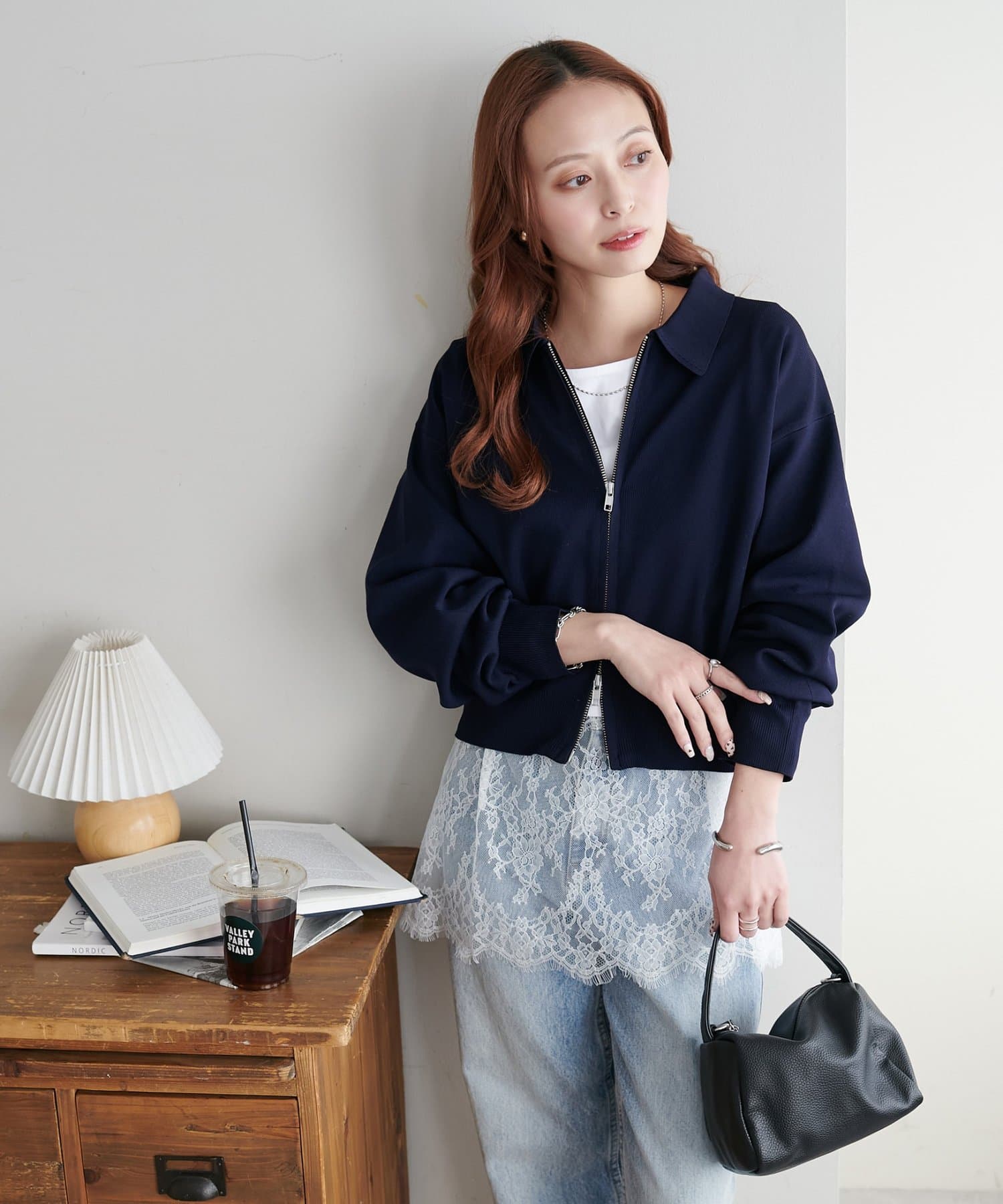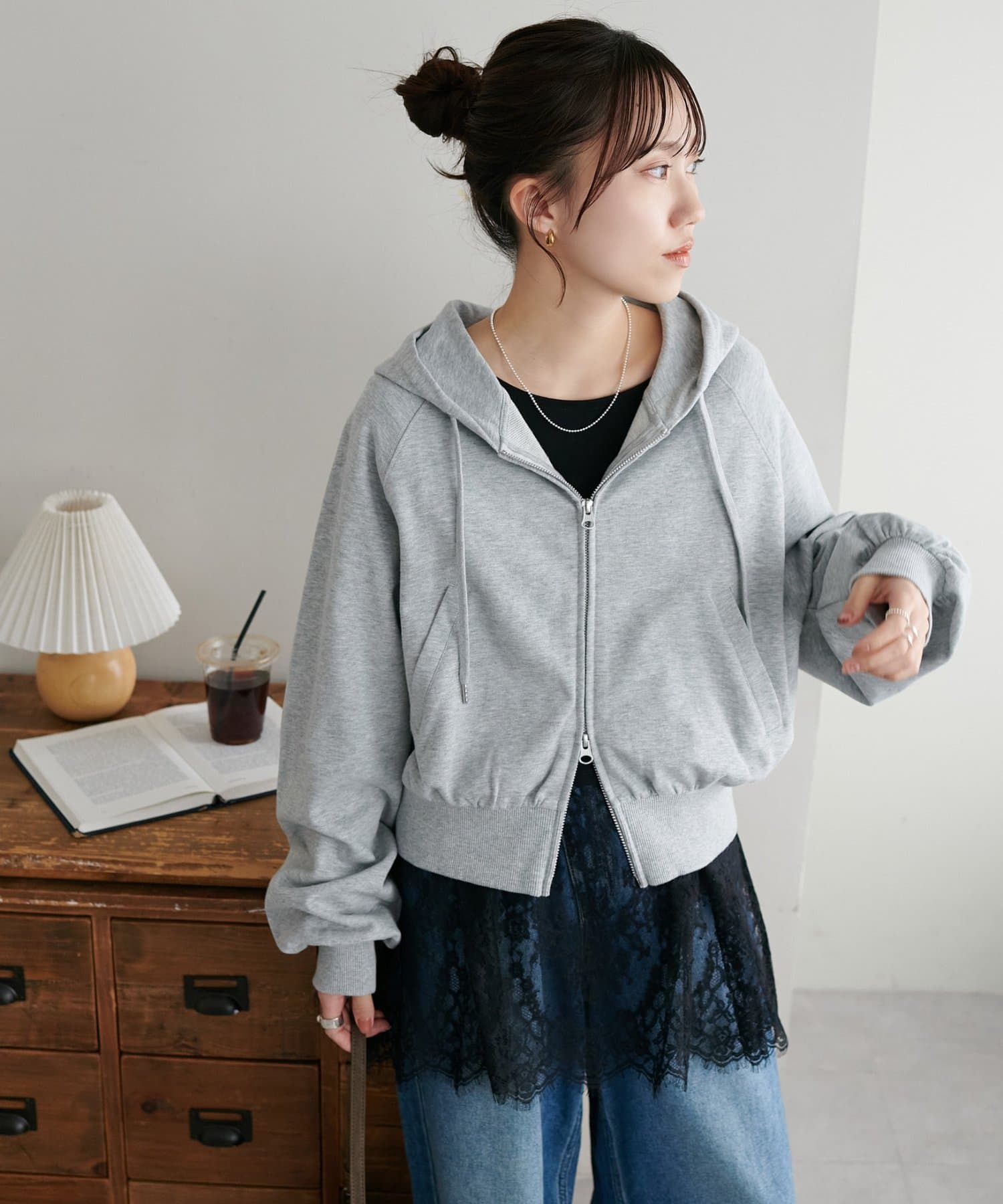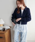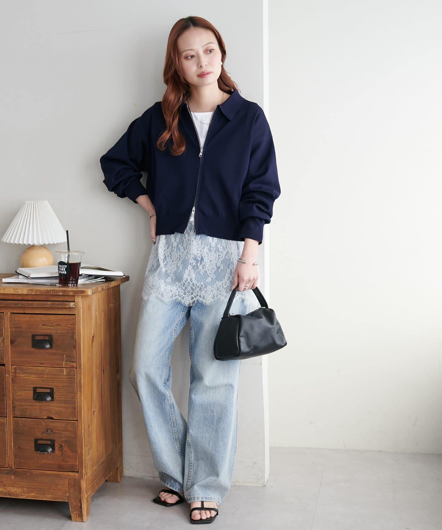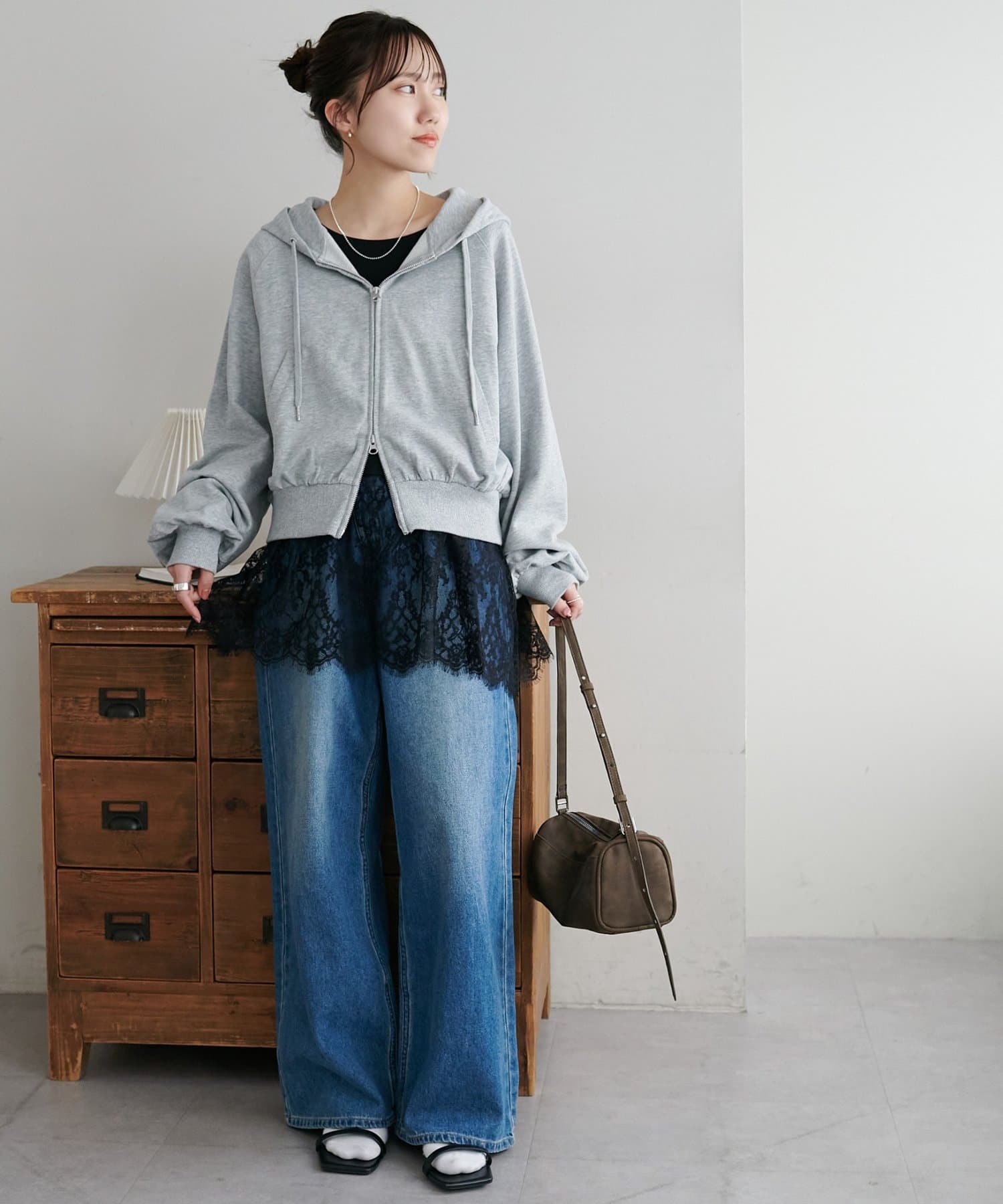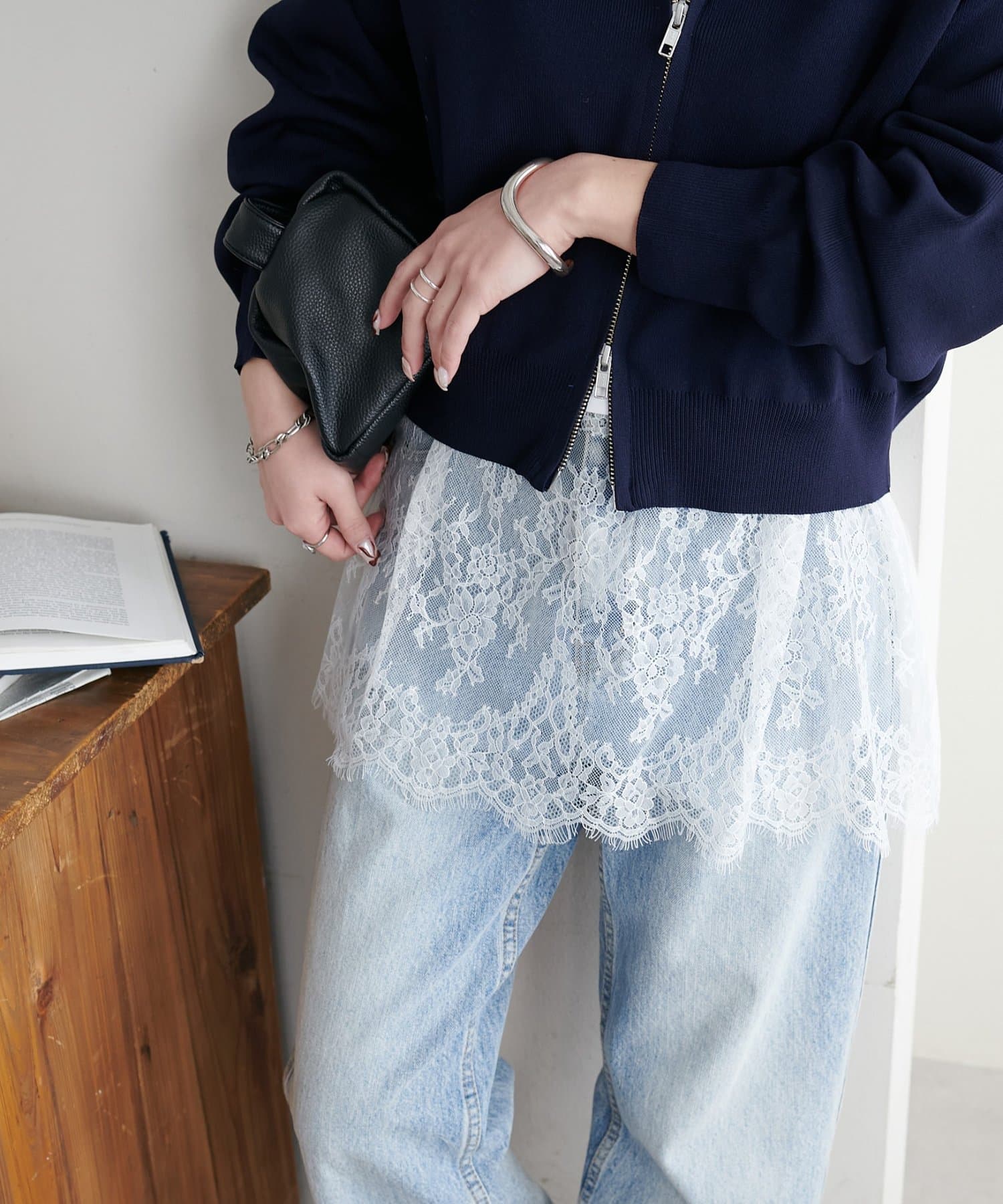・コンパクトなカーディガンやパーカーのインナーとして、裾からレースをアクセント使いしたコーデ