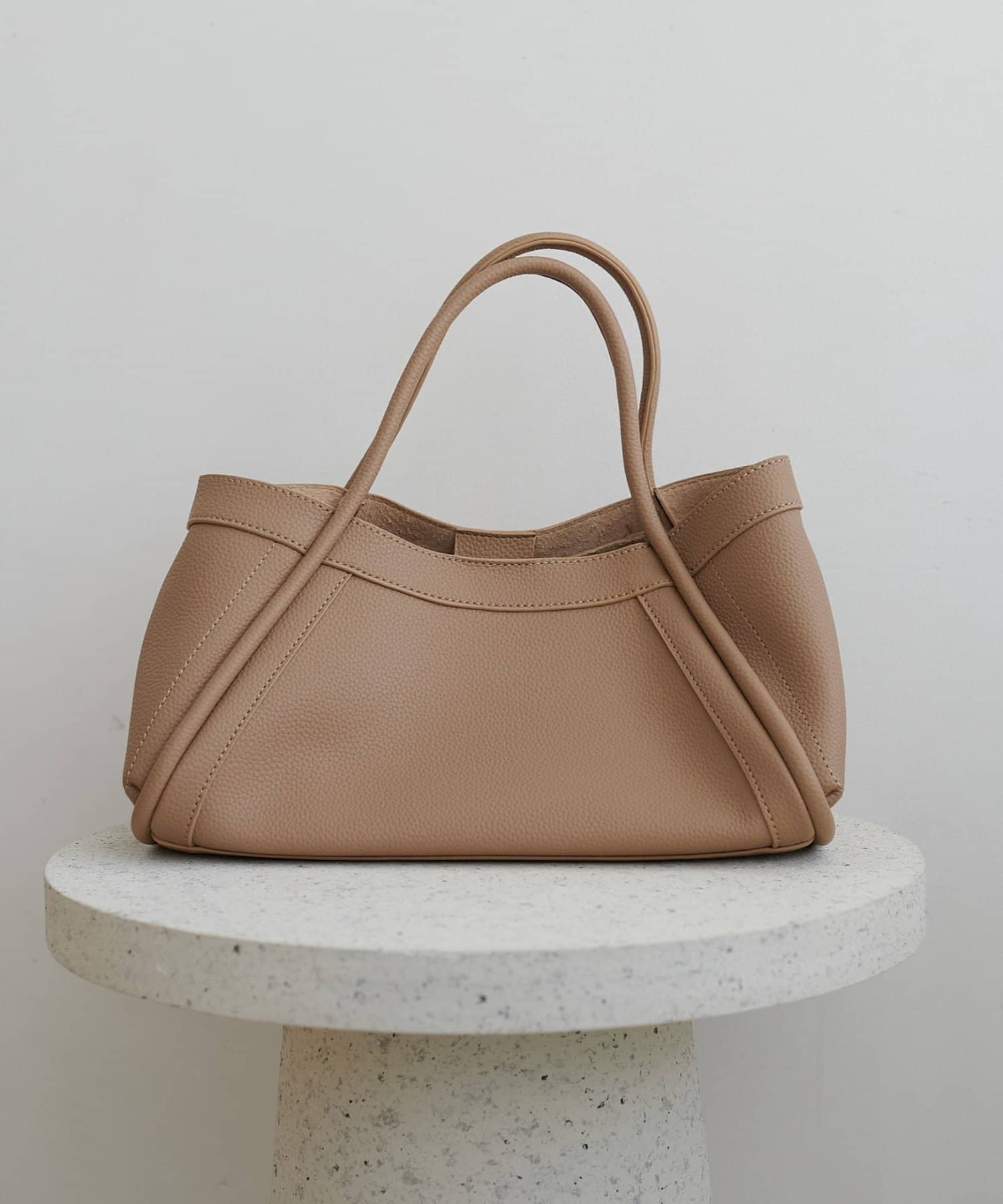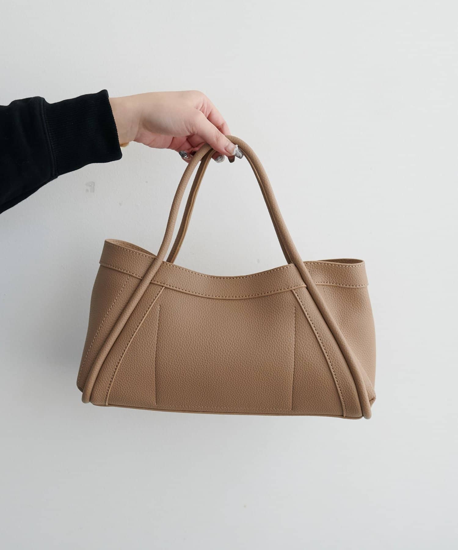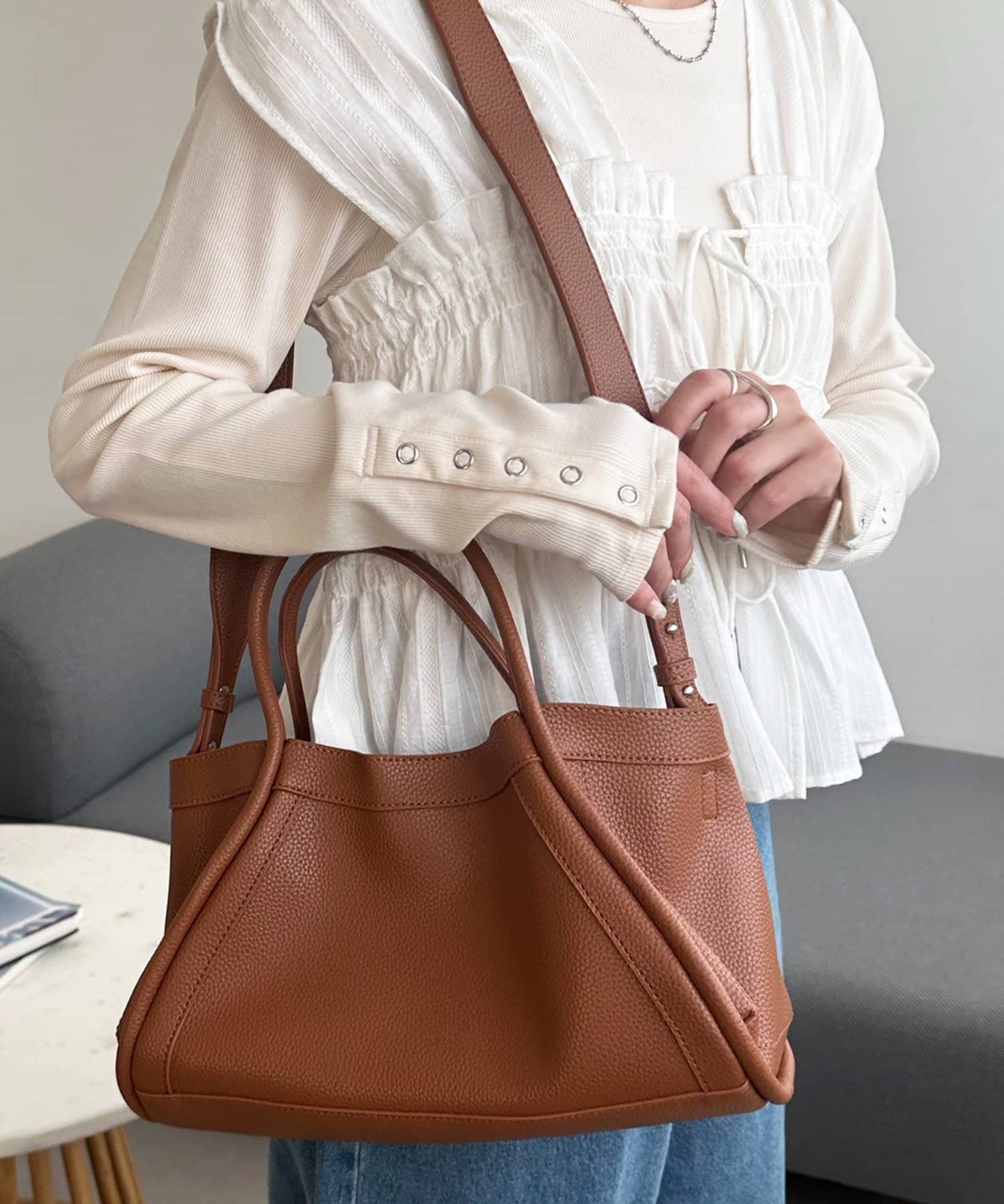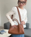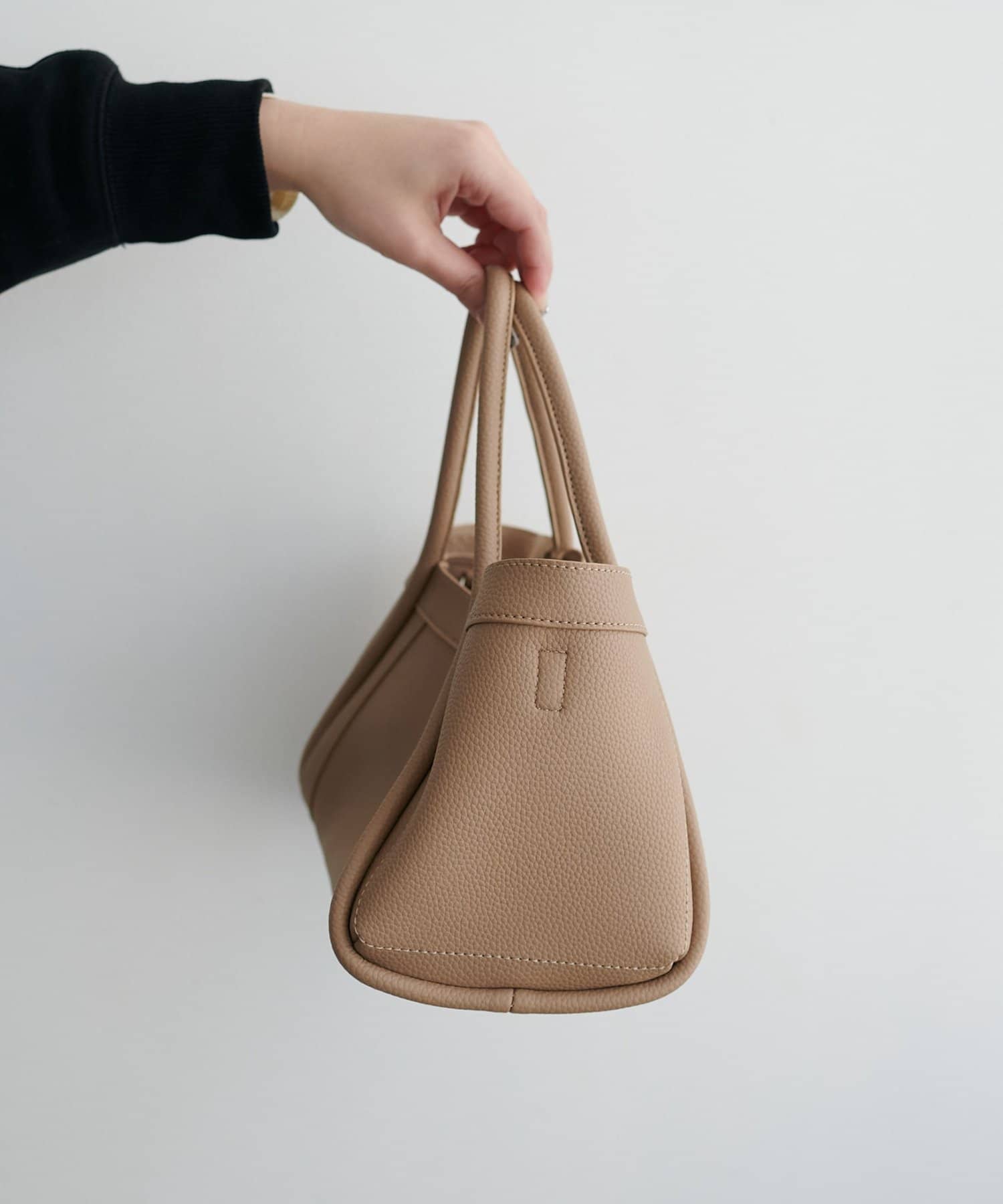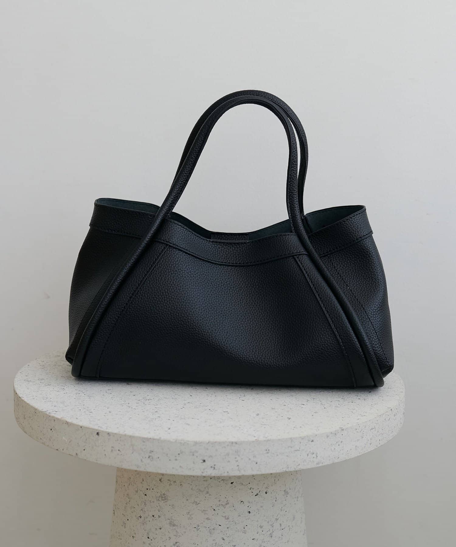 高級感のあるシュリンクレザー調の合成皮革を使用し、本革のようなリッチな風合いを楽しめます。傷や汚れに強く、お手入れが簡単なのも嬉しいポイント◎幅30cm、マチ17cmと収納力も抜群で、長財布や600mlのペットボトル、ポーチなど、お出かけの必需品がしっかりと収まります。ハンドバッグとしてはもちろん、付属のショルダーストラップを取り付ければショルダーバッグとしても使える便利な2WAY仕様。きれいめなオフィススタイルから、休日のカジュアルなデニムスタイルまで、どんな服装にも合わせやすいミニマルなデザインが魅力です◎