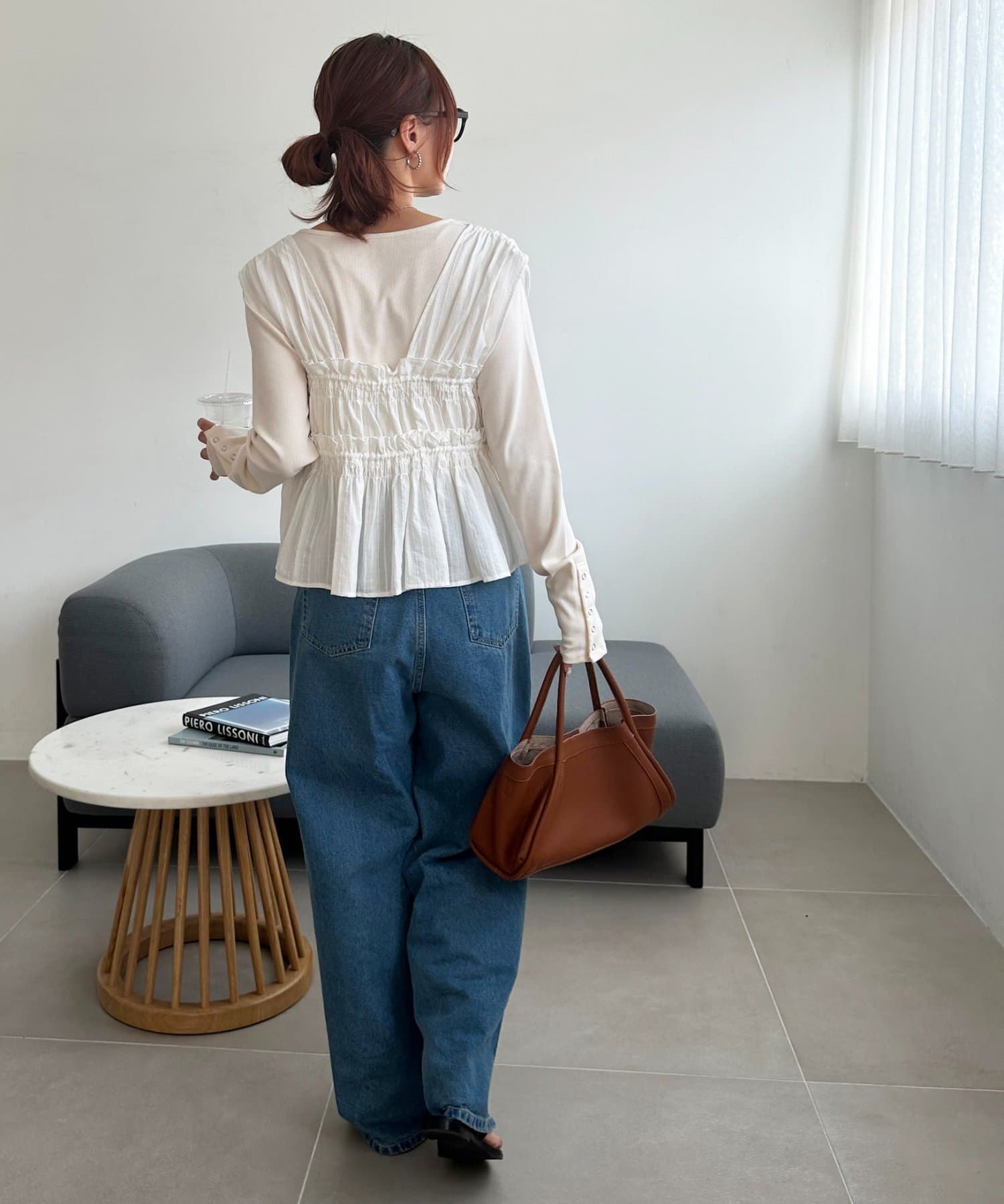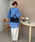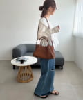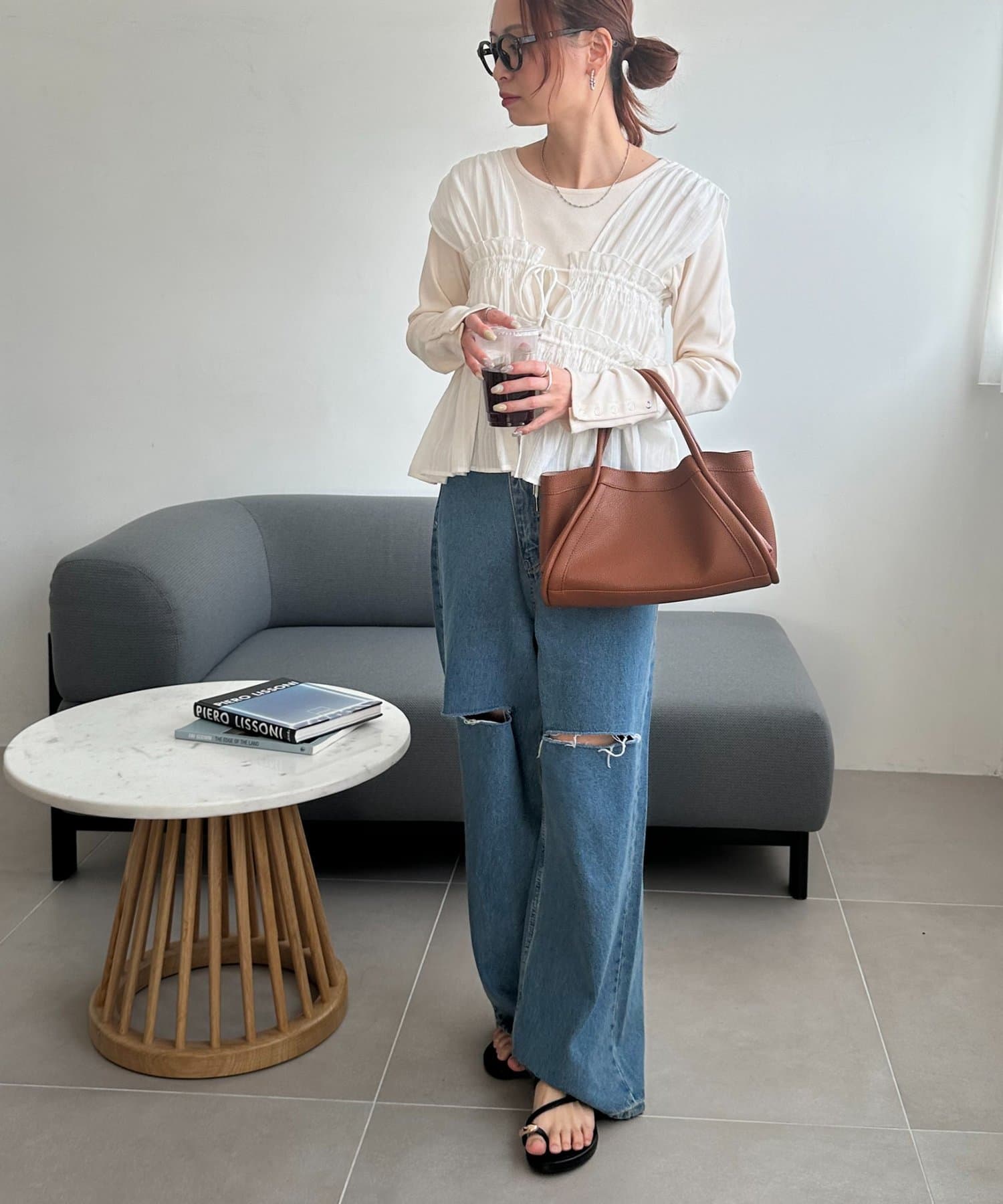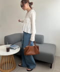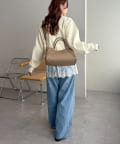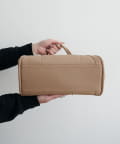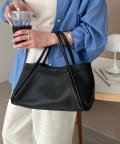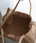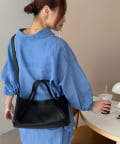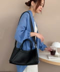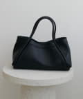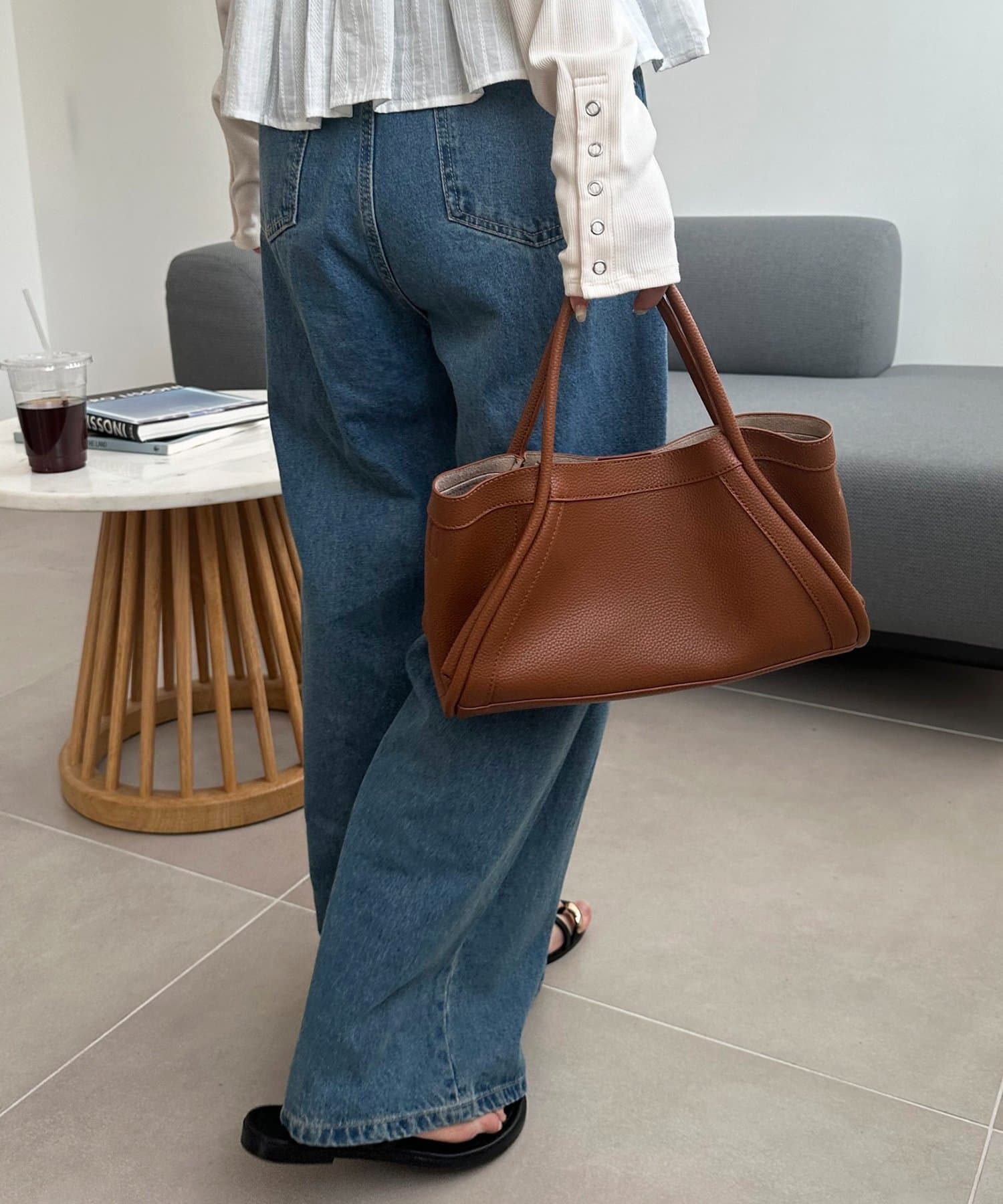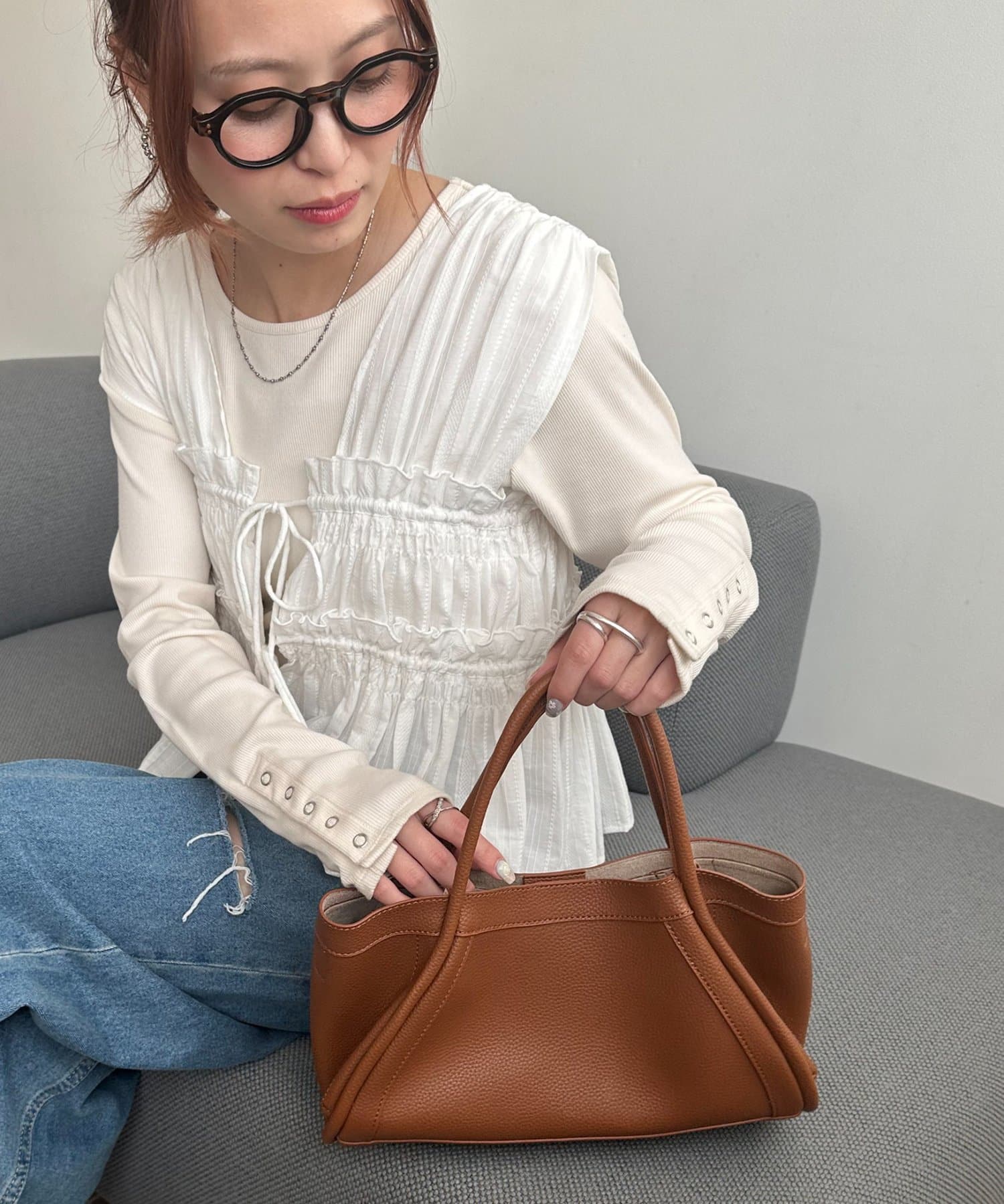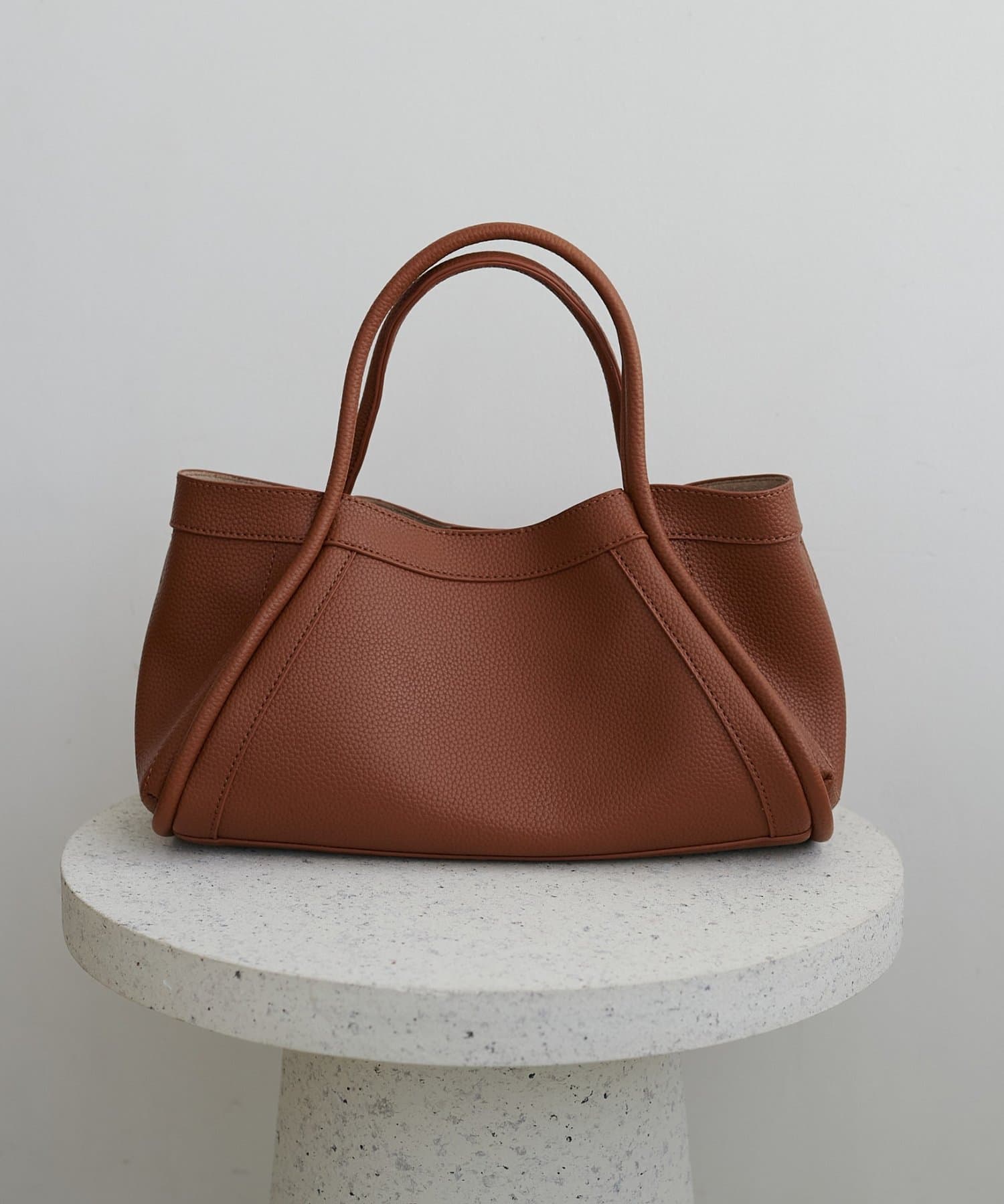高級感のあるシュリンクレザー調の合成皮革を使用し、本革のようなリッチな風合いを楽しめます。傷や汚れに強く、お手入れが簡単なのも嬉しいポイント◎幅30cm、マチ17cmと収納力も抜群で、長財布や600mlのペットボトル、ポーチなど、お出かけの必需品がしっかりと収まります。ハンドバッグとしてはもちろん、付属のショルダーストラップを取り付ければショルダーバッグとしても使える便利な2WAY仕様。きれいめなオフィススタイルから、休日のカジュアルなデニムスタイルまで、どんな服装にも合わせやすいミニマルなデザインが魅力です◎