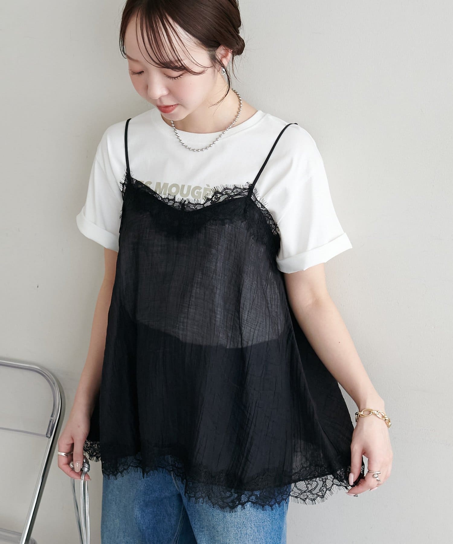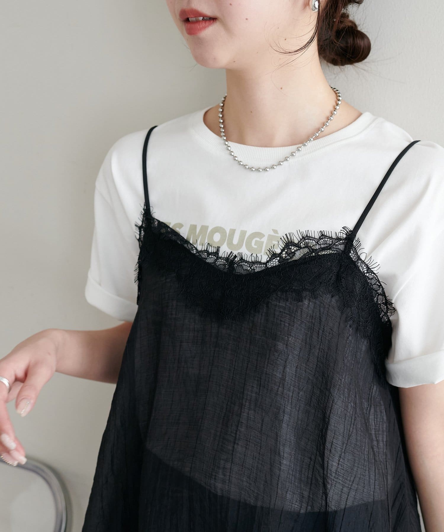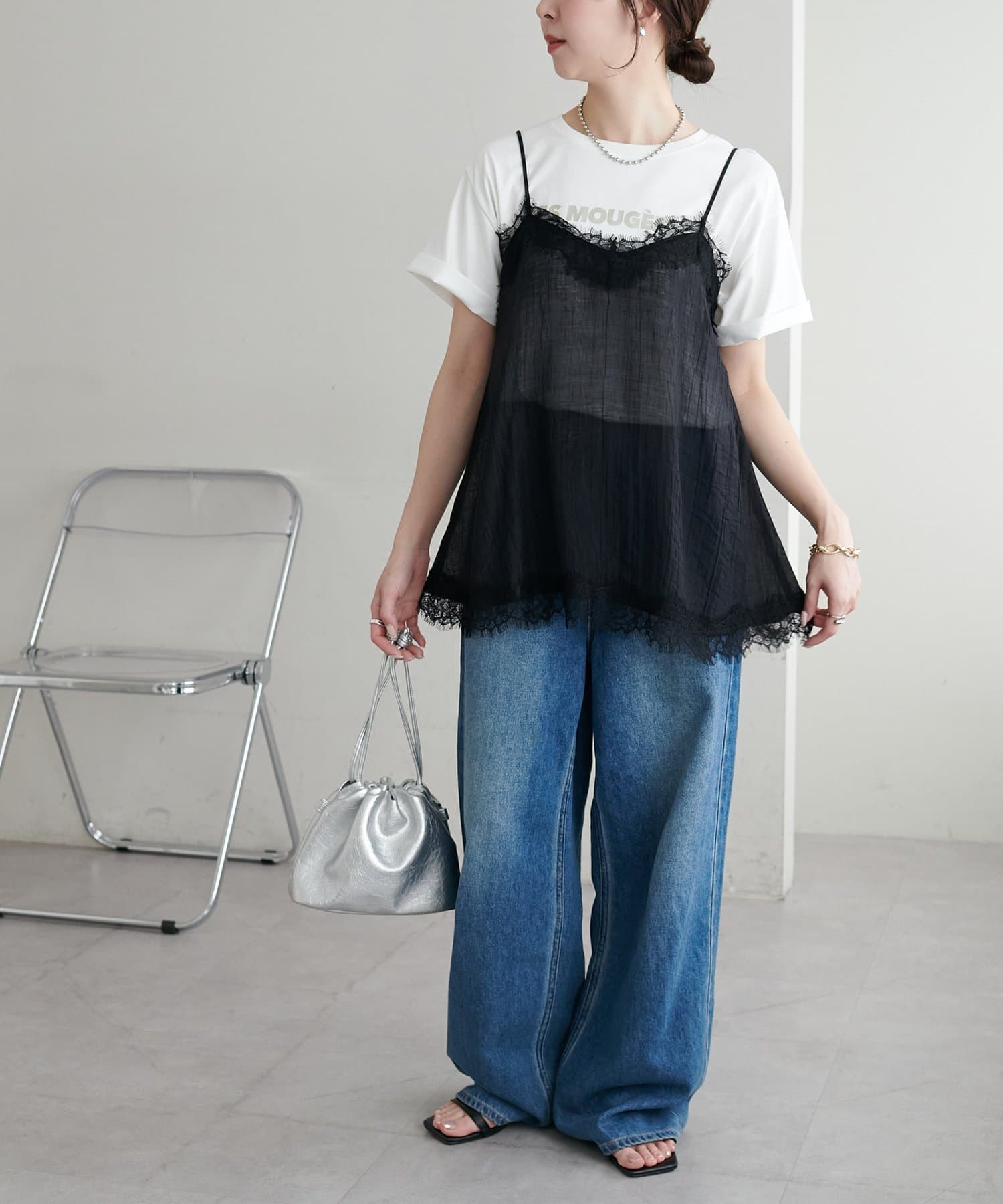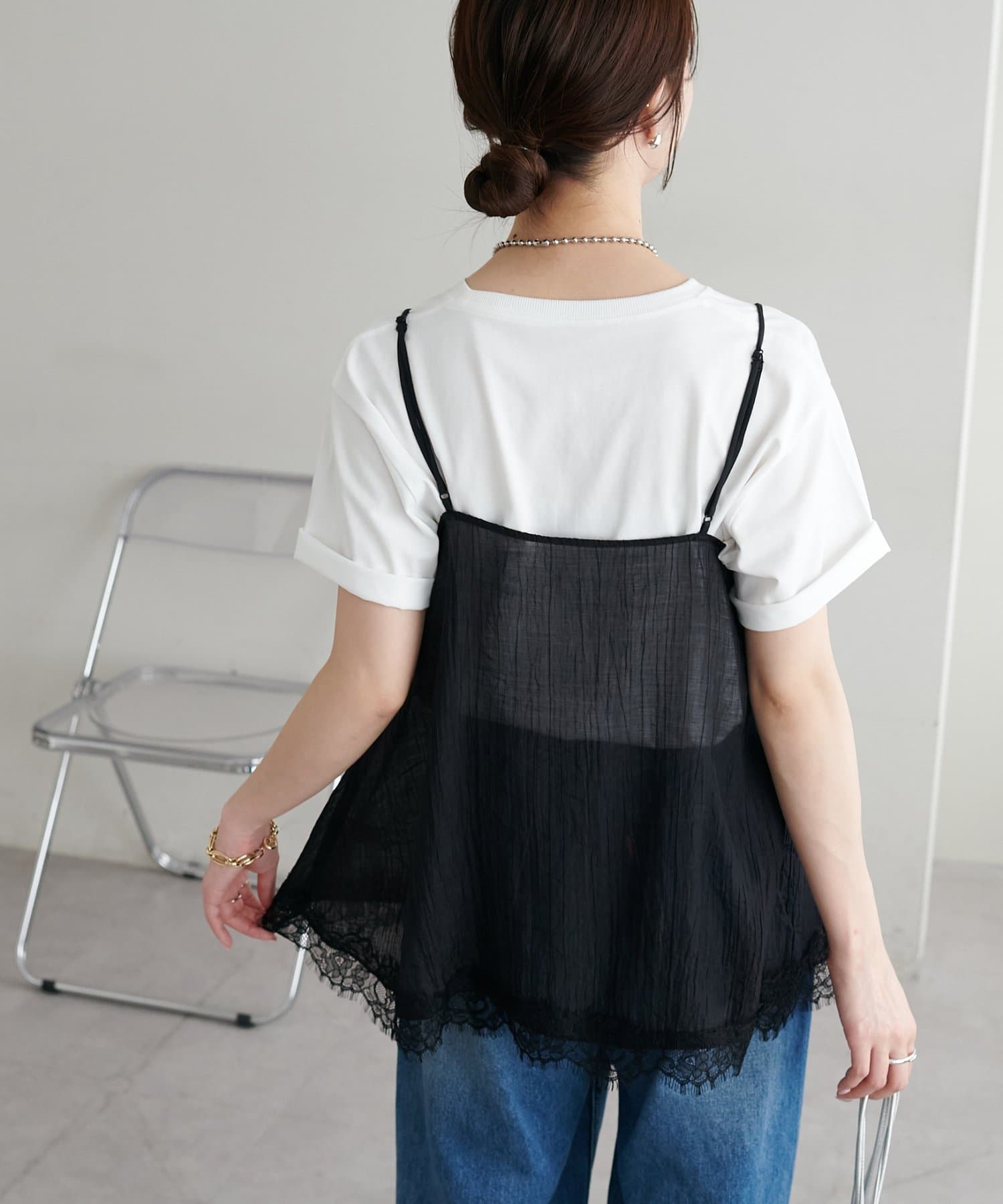 160cmスタッフ:胸元と裾にあしらわれたレースが華やかで、シンプルなコーディネートも一気におしゃれ見えします◎シアーシャツやカーディガンのインナーとしてレースをちら見せするのが定番ですが、Tシャツの上に重ねるトレンドのレイヤードスタイルも♪