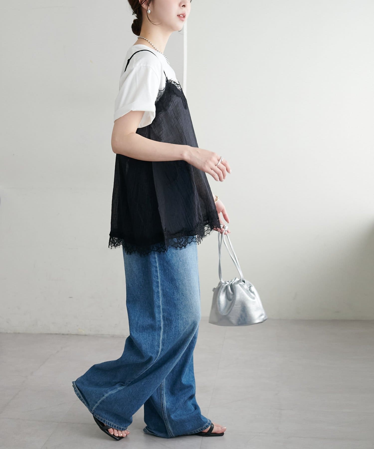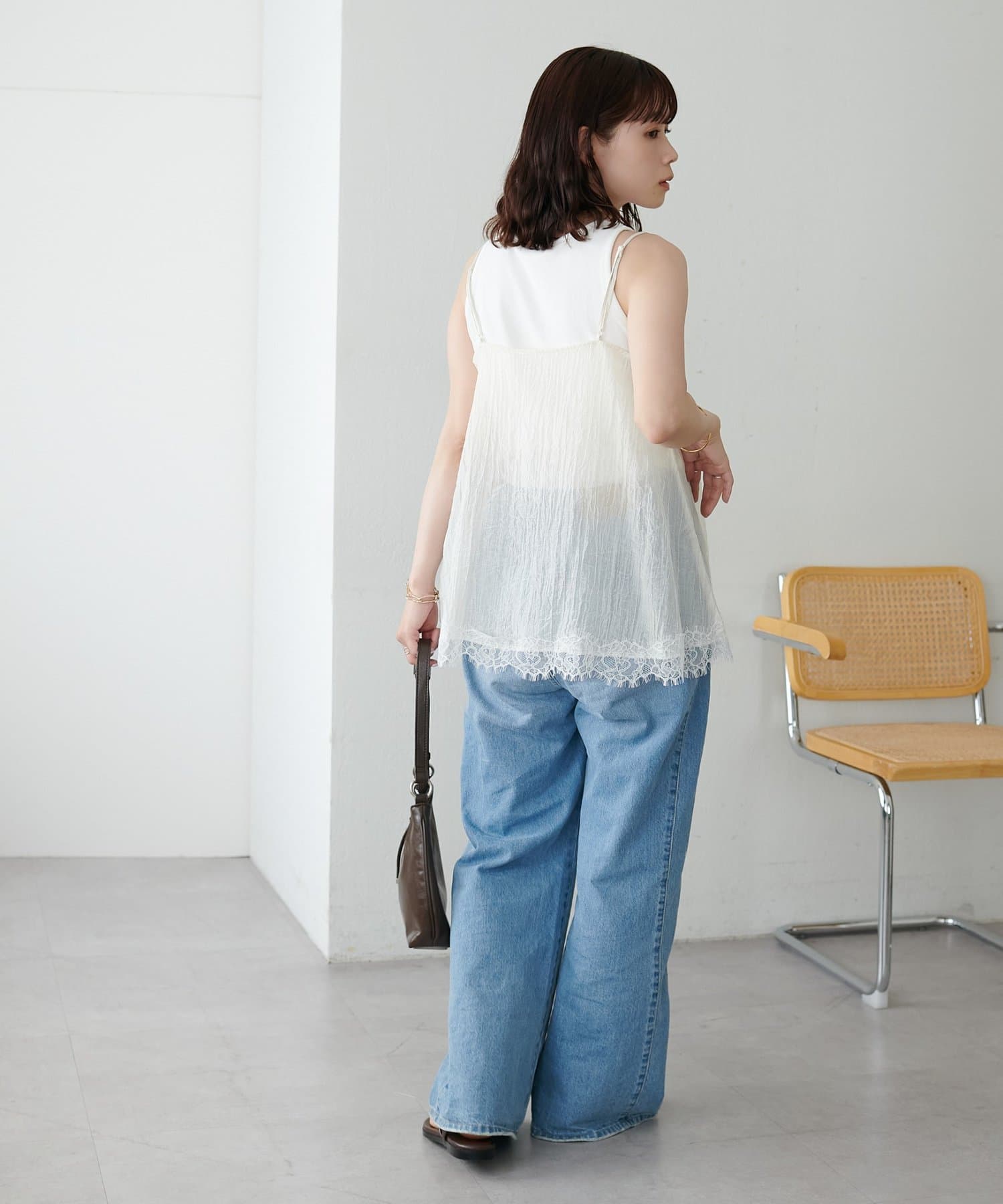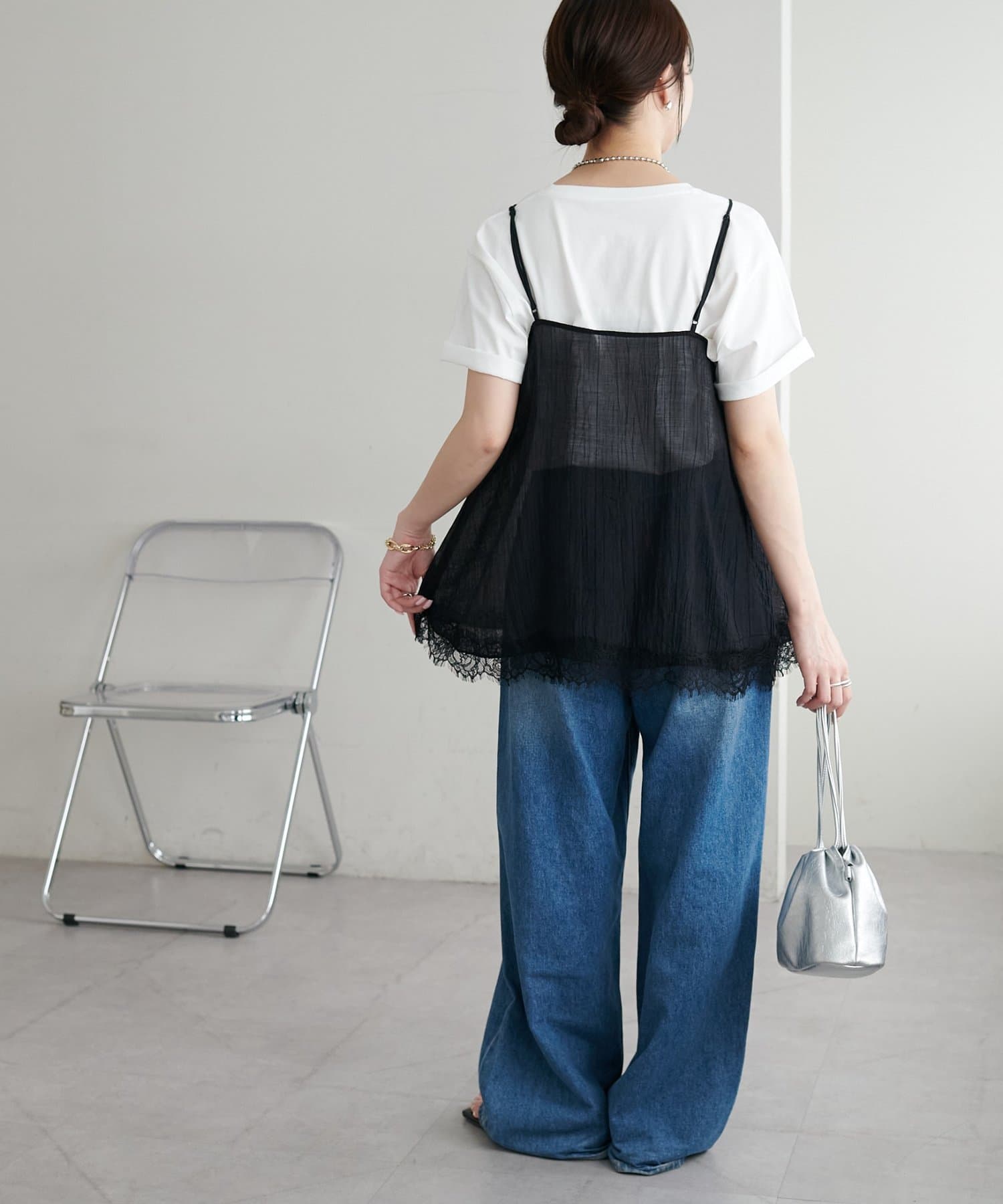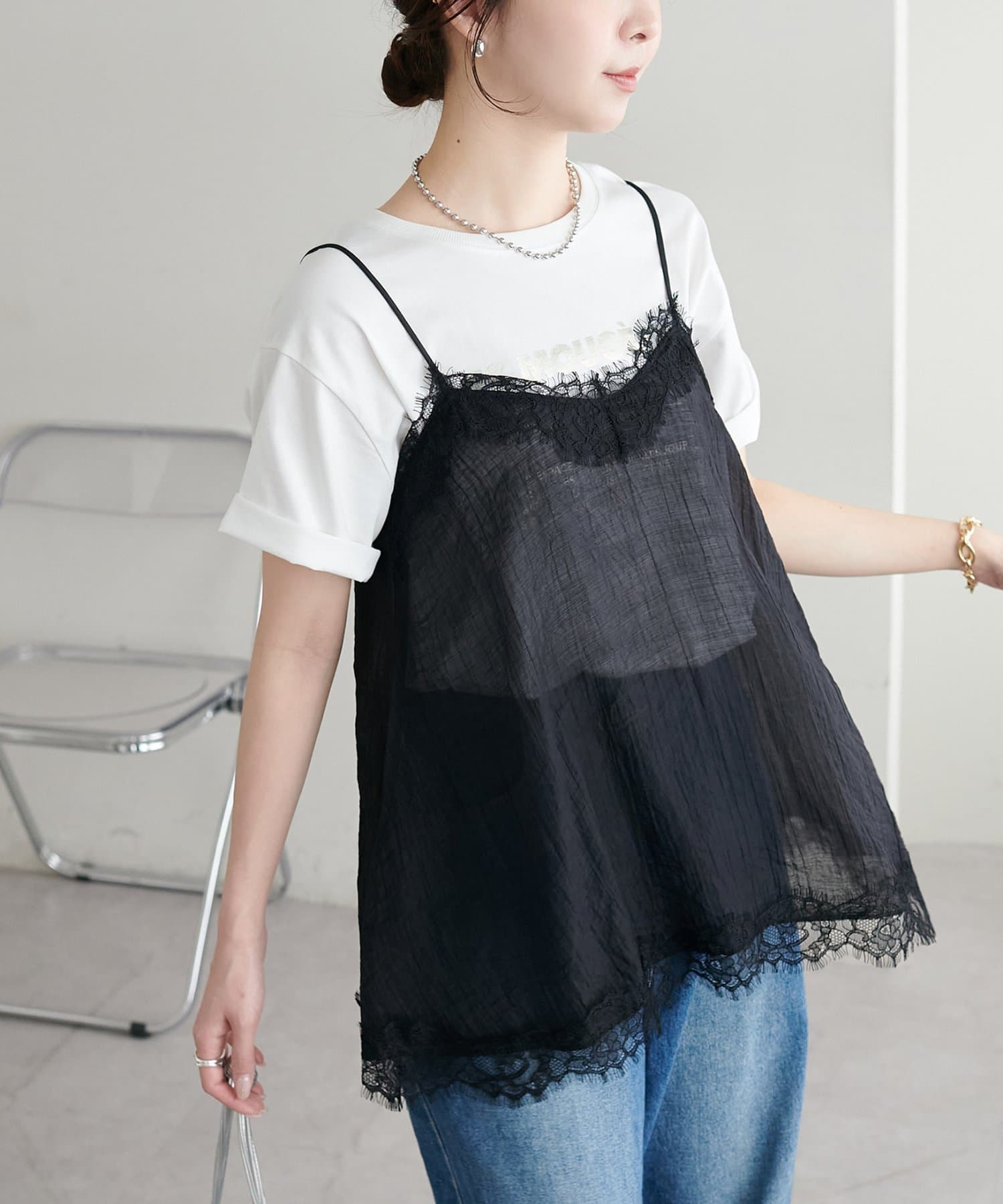 160cmスタッフ:胸元と裾にあしらわれたレースが華やかで、シンプルなコーディネートも一気におしゃれ見えします◎シアーシャツやカーディガンのインナーとしてレースをちら見せするのが定番ですが、Tシャツの上に重ねるトレンドのレイヤードスタイルも♪