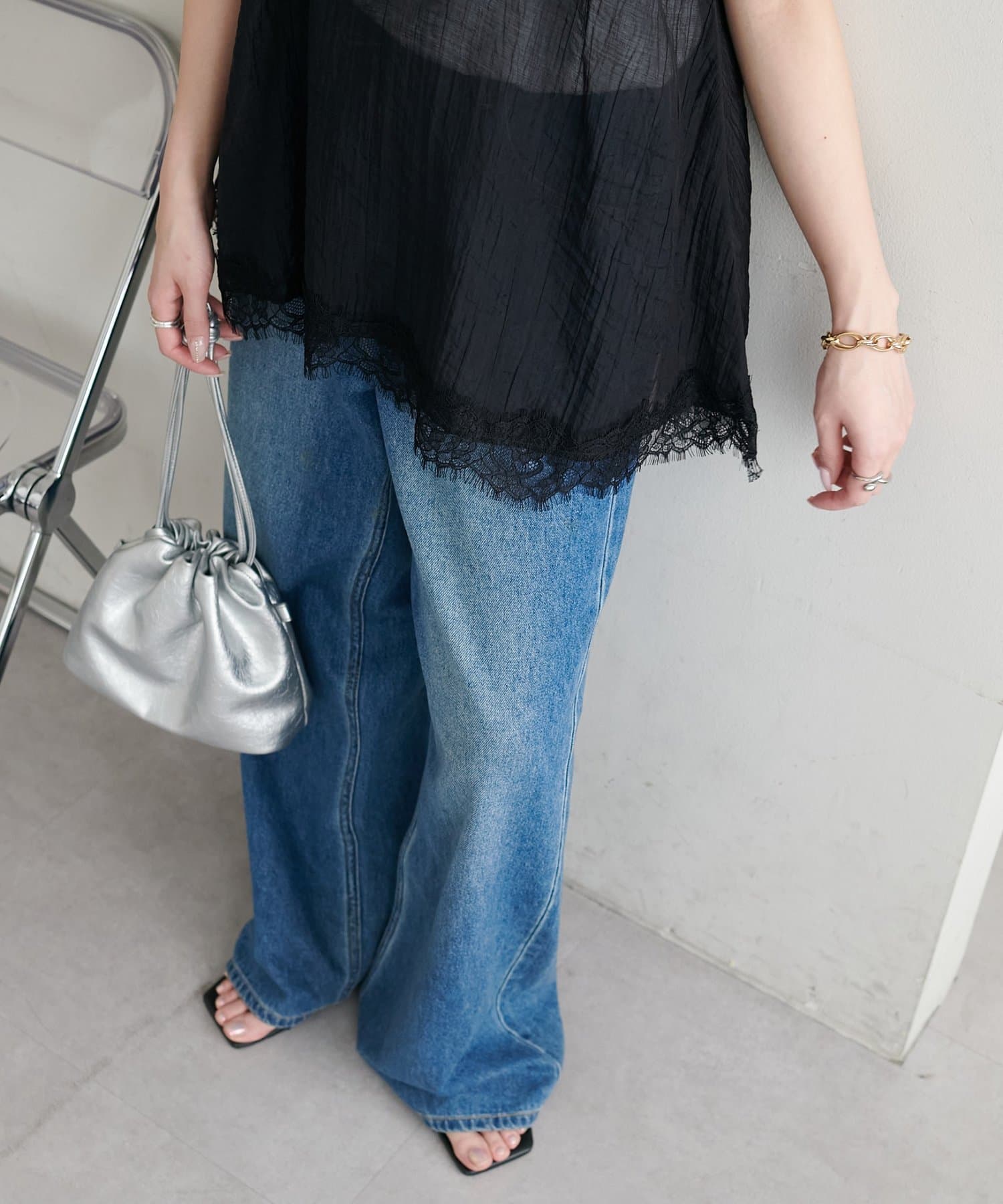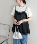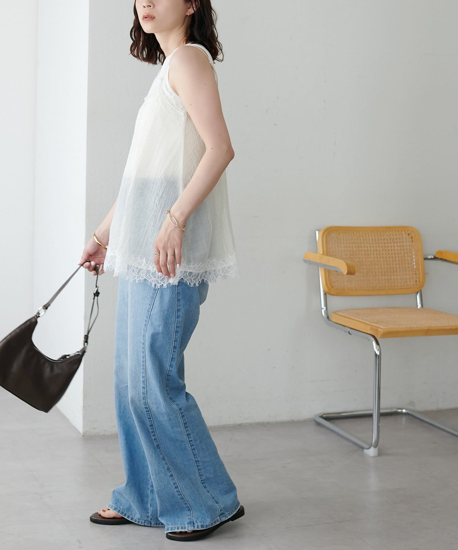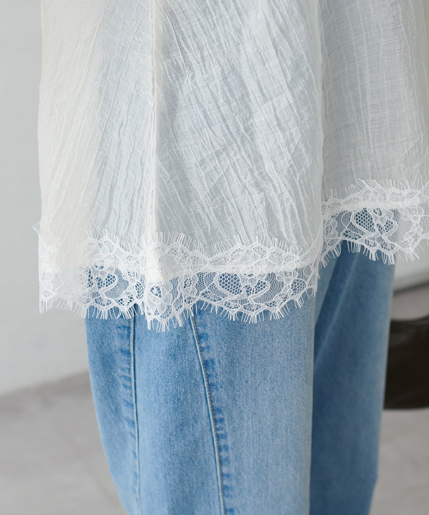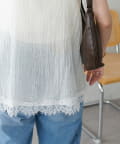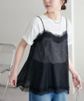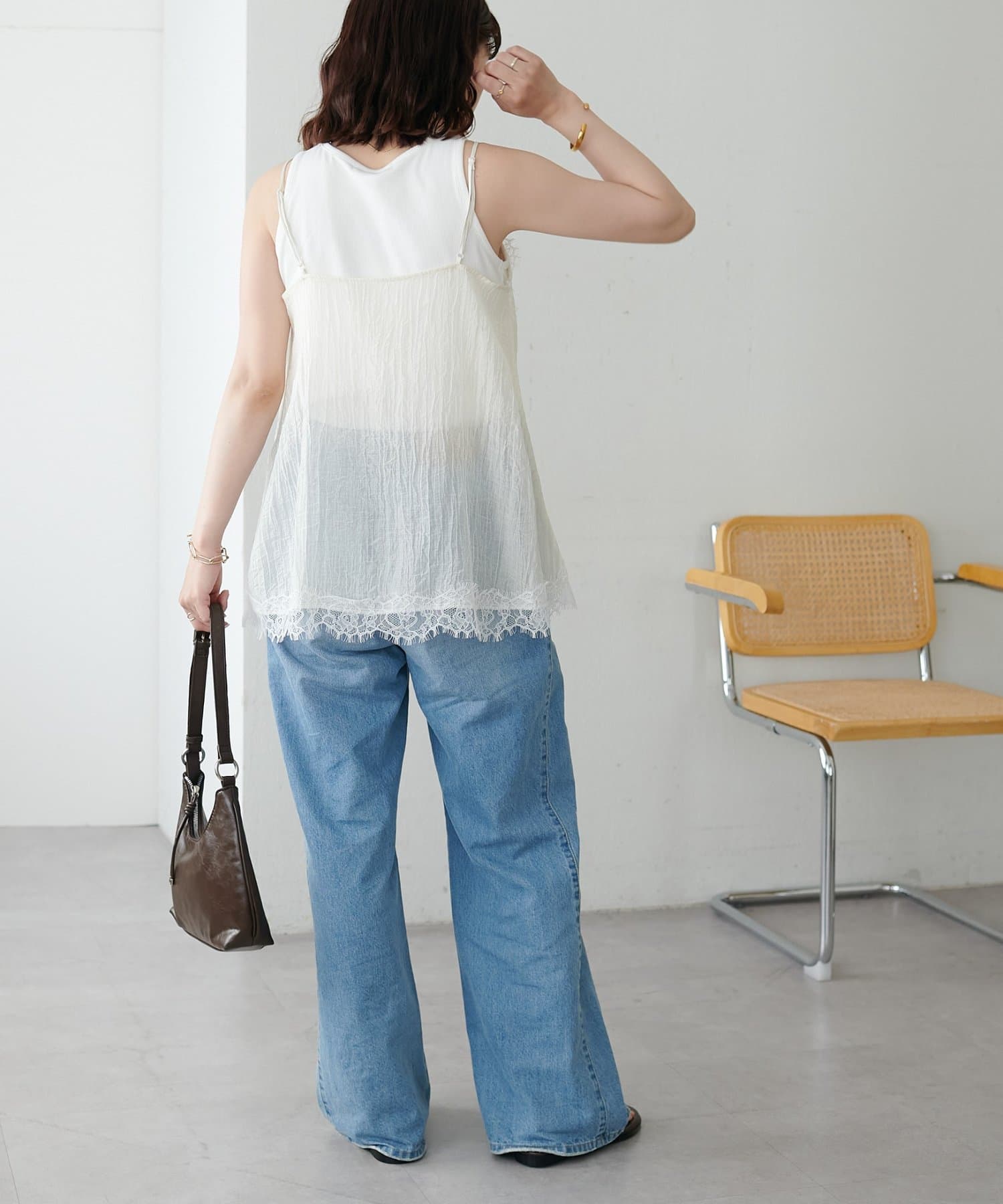 160cmスタッフ:胸元と裾にあしらわれたレースが華やかで、シンプルなコーディネートも一気におしゃれ見えします◎シアーシャツやカーディガンのインナーとしてレースをちら見せするのが定番ですが、Tシャツの上に重ねるトレンドのレイヤードスタイルも♪