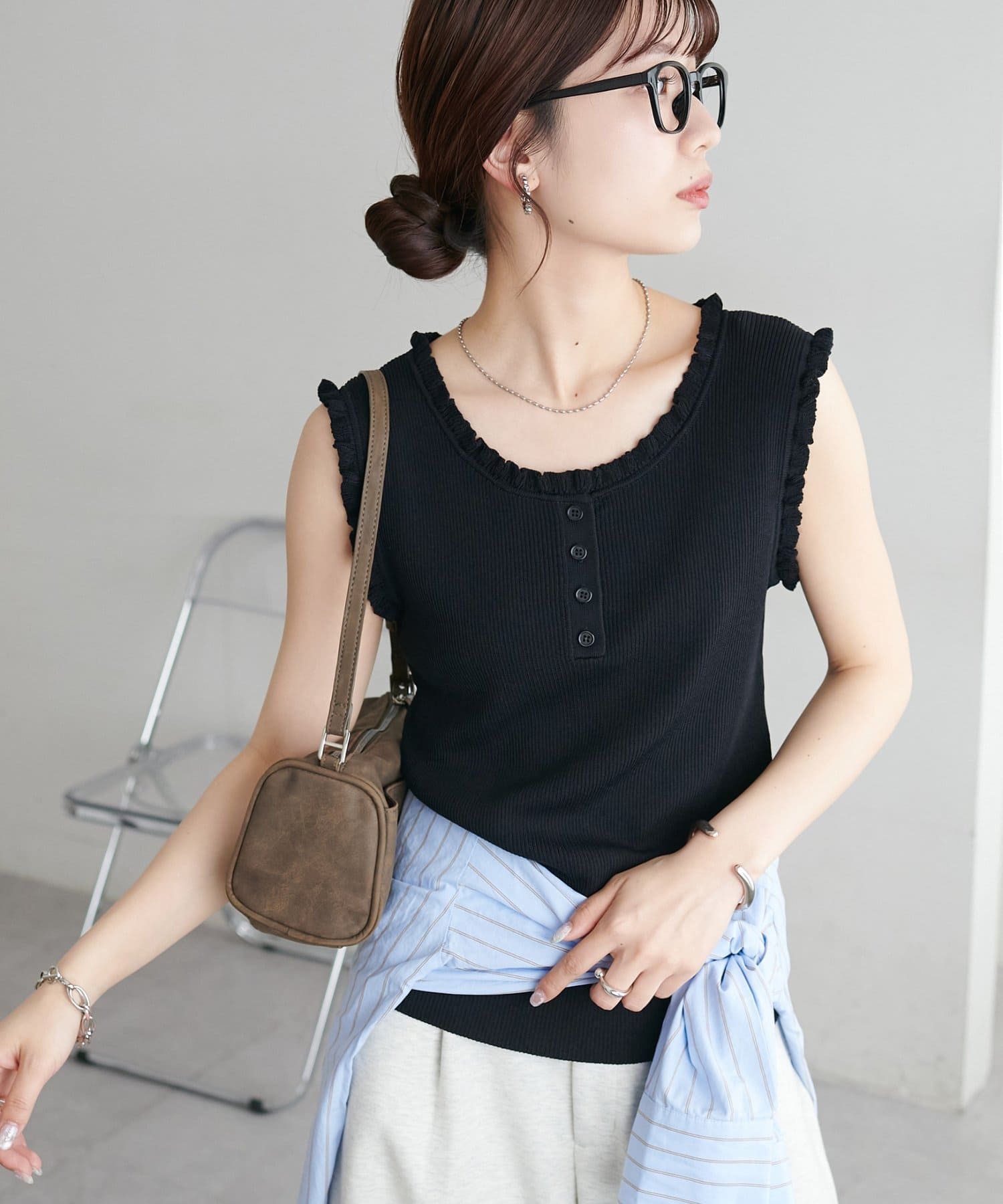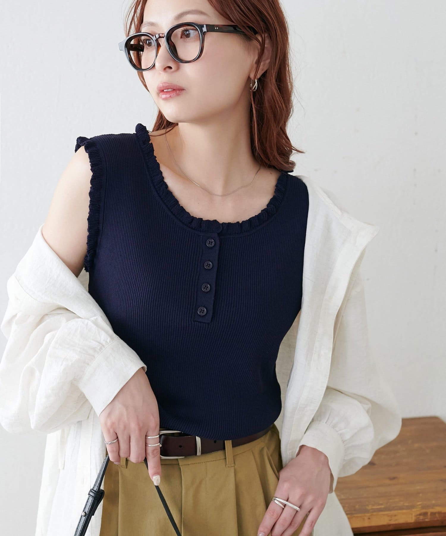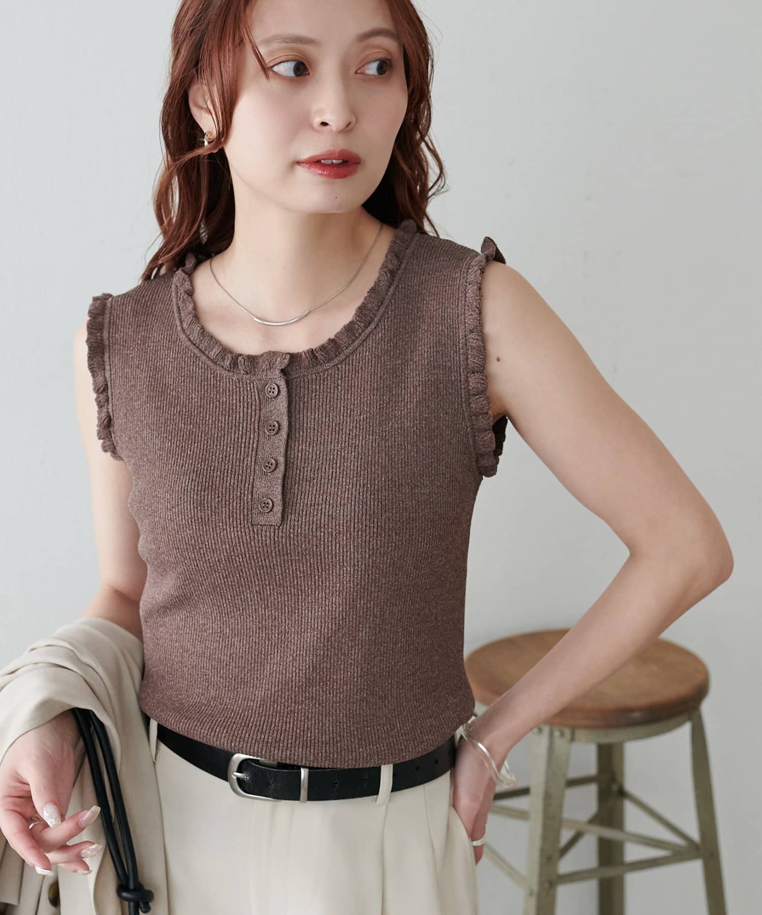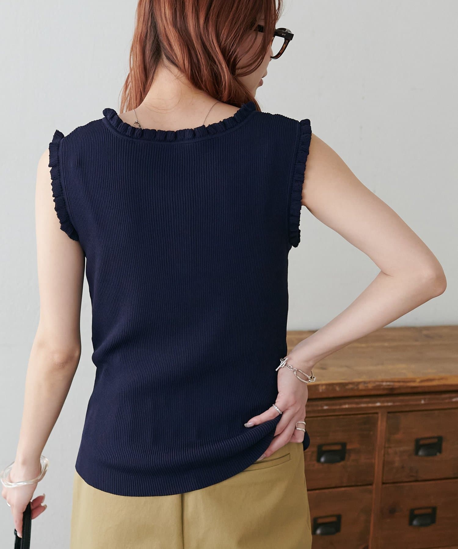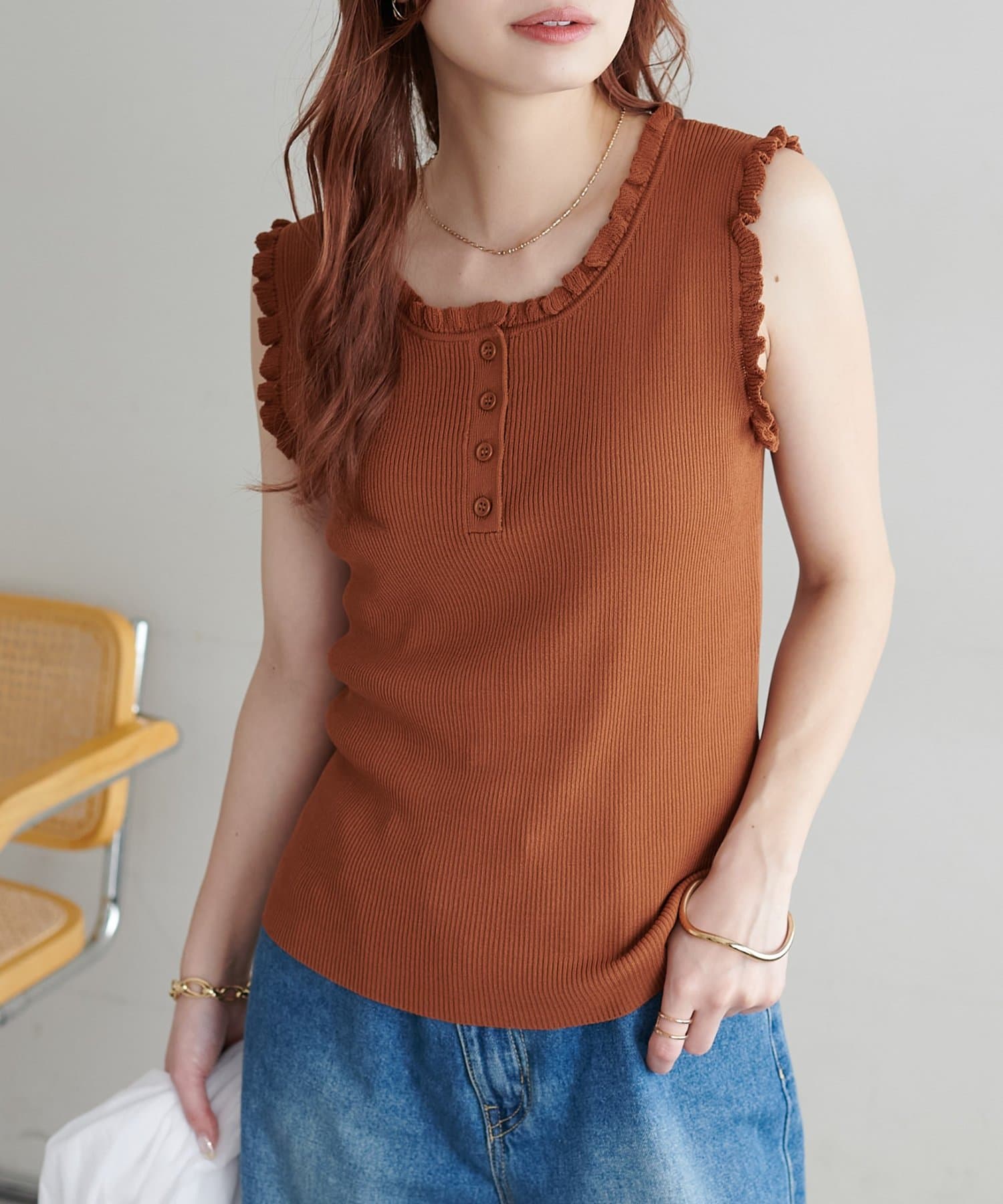 さりげないフリルが大人可愛い、着回し力抜群のタンクトップ