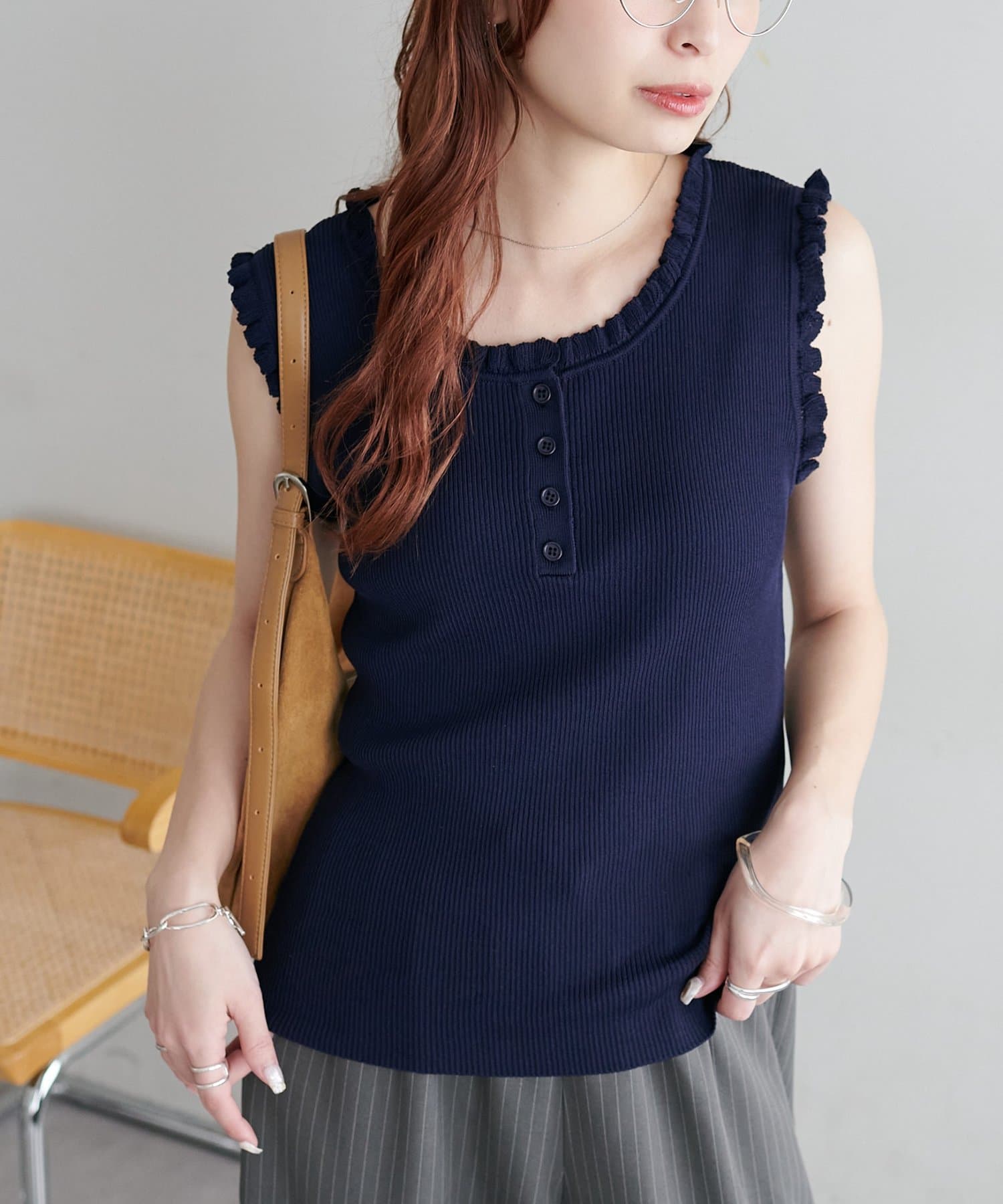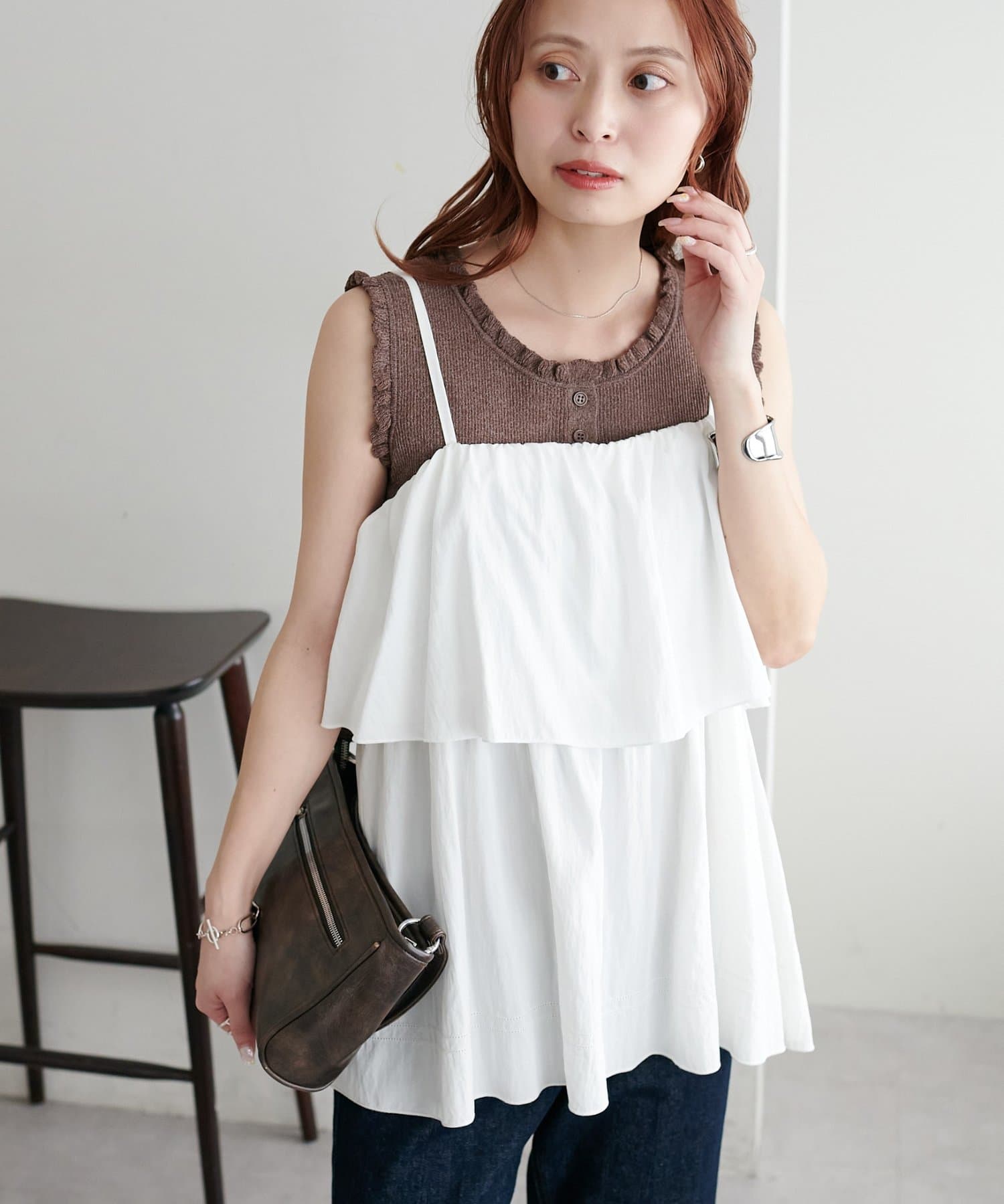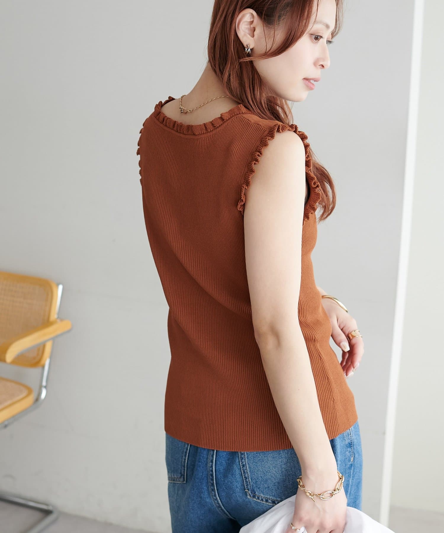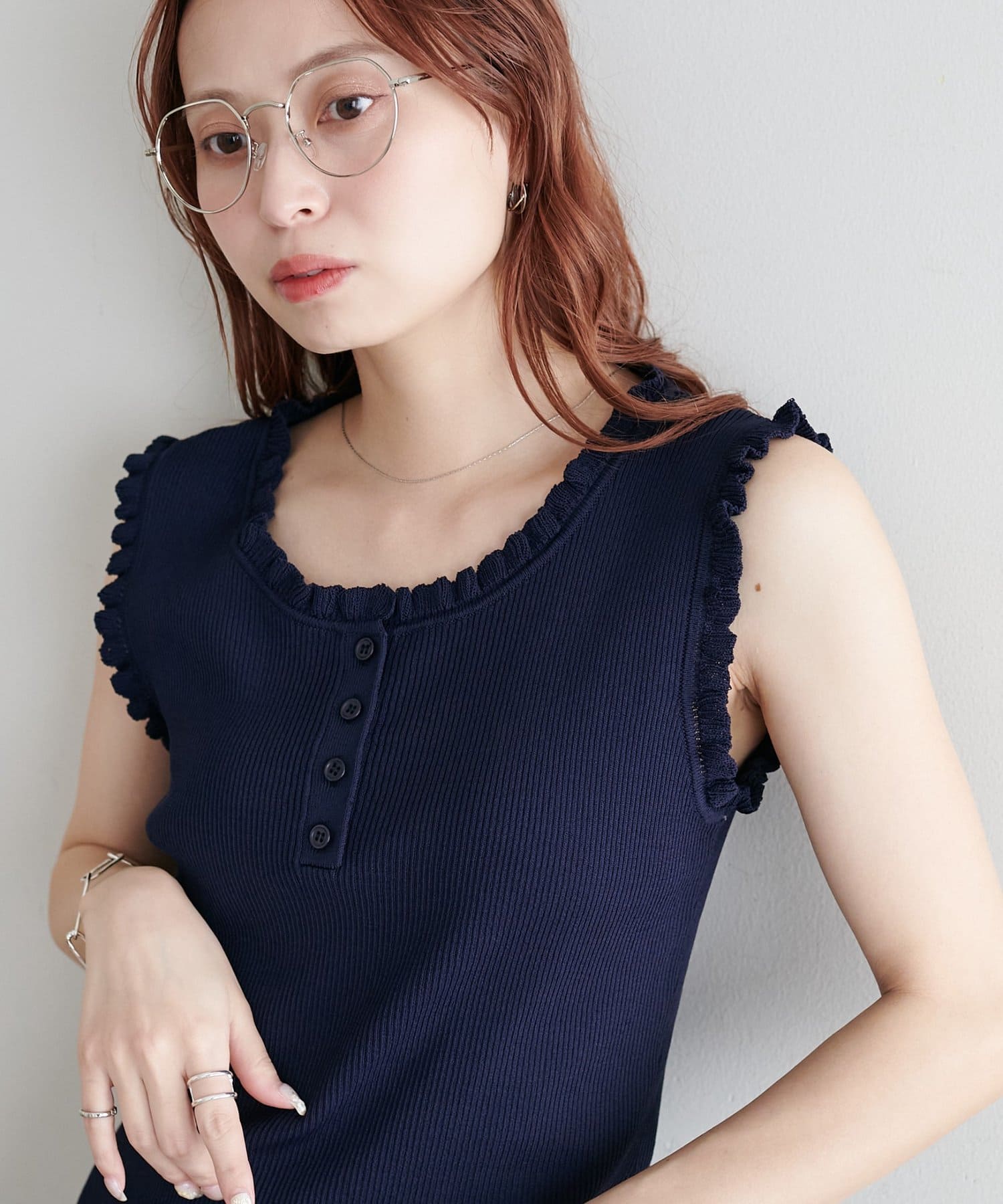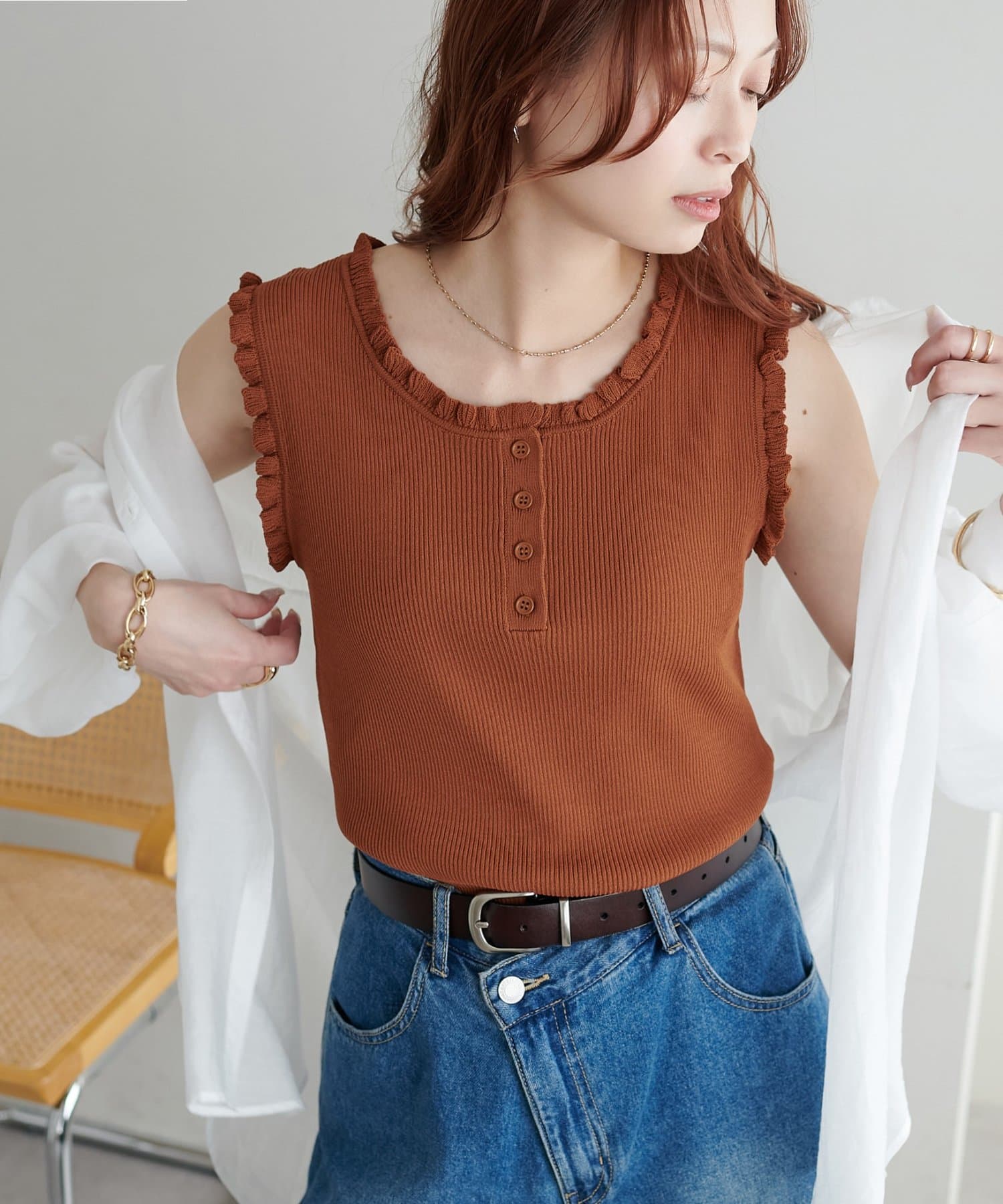 さりげないフリルが大人可愛い、着回し力抜群のタンクトップ