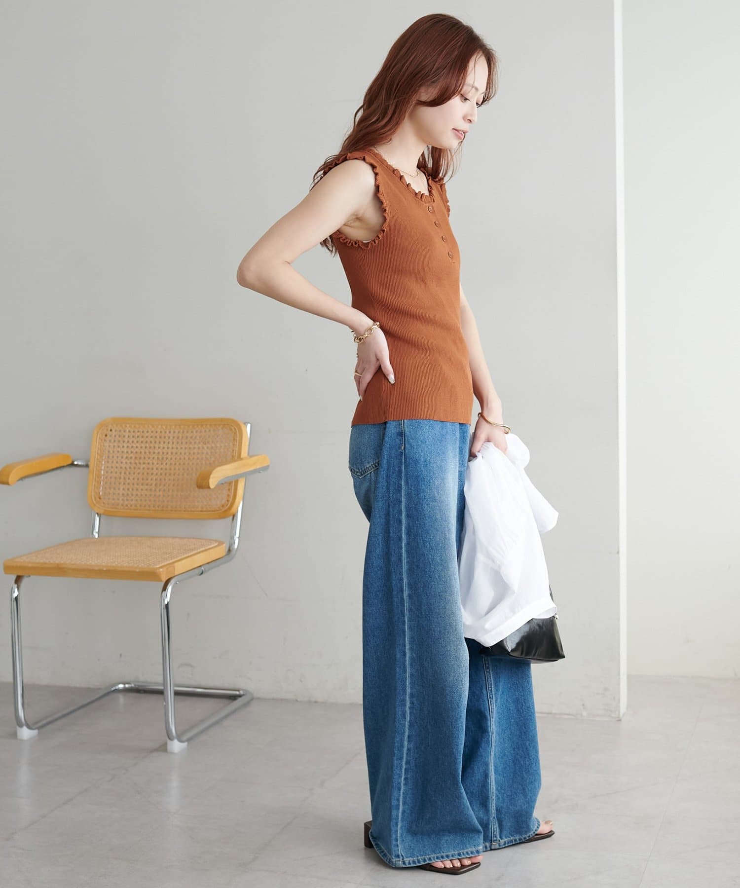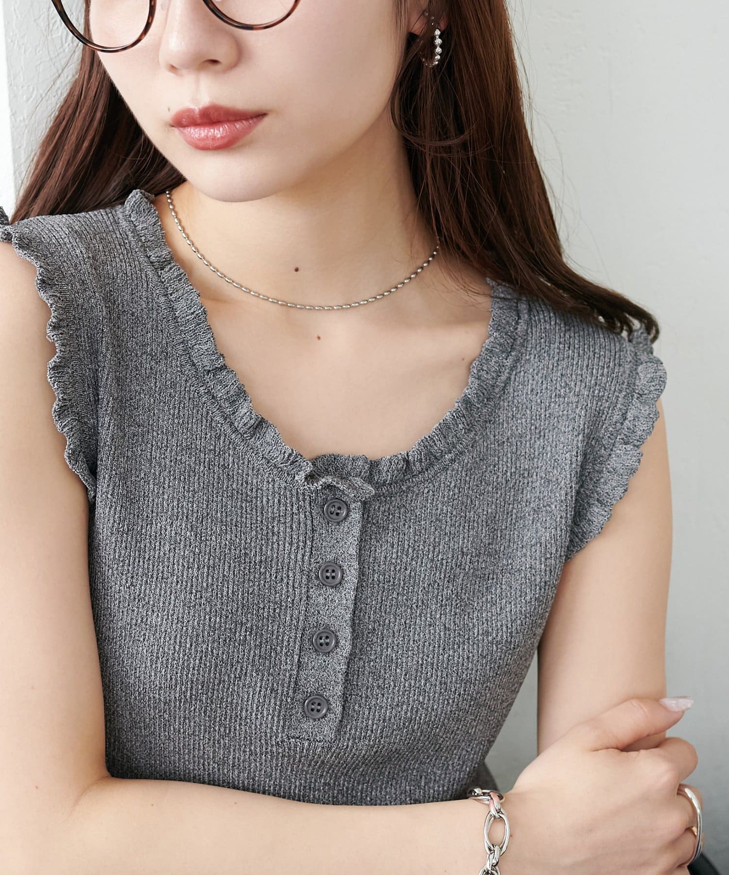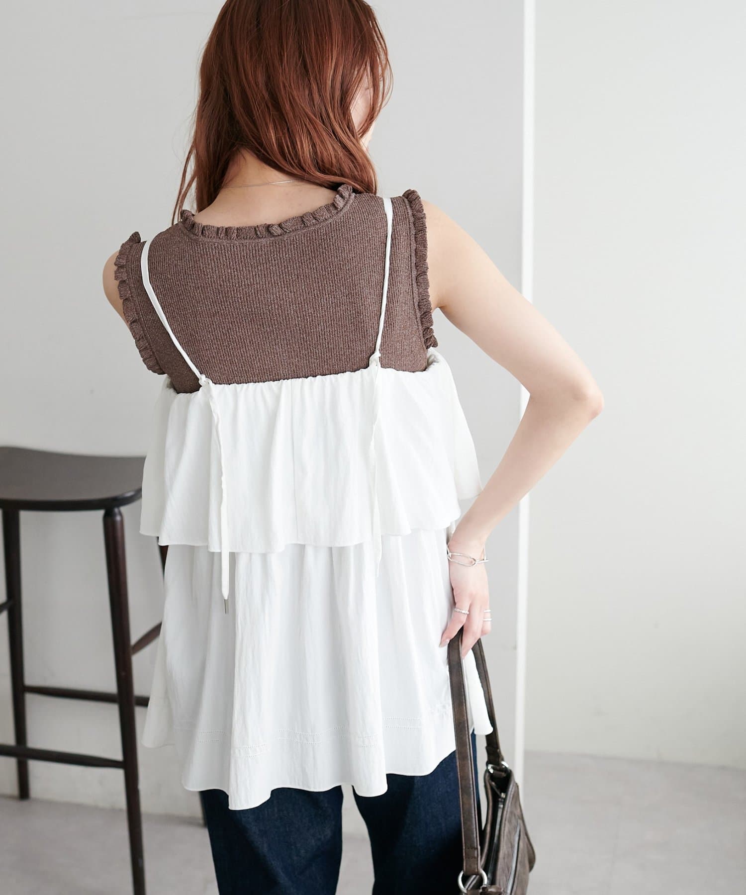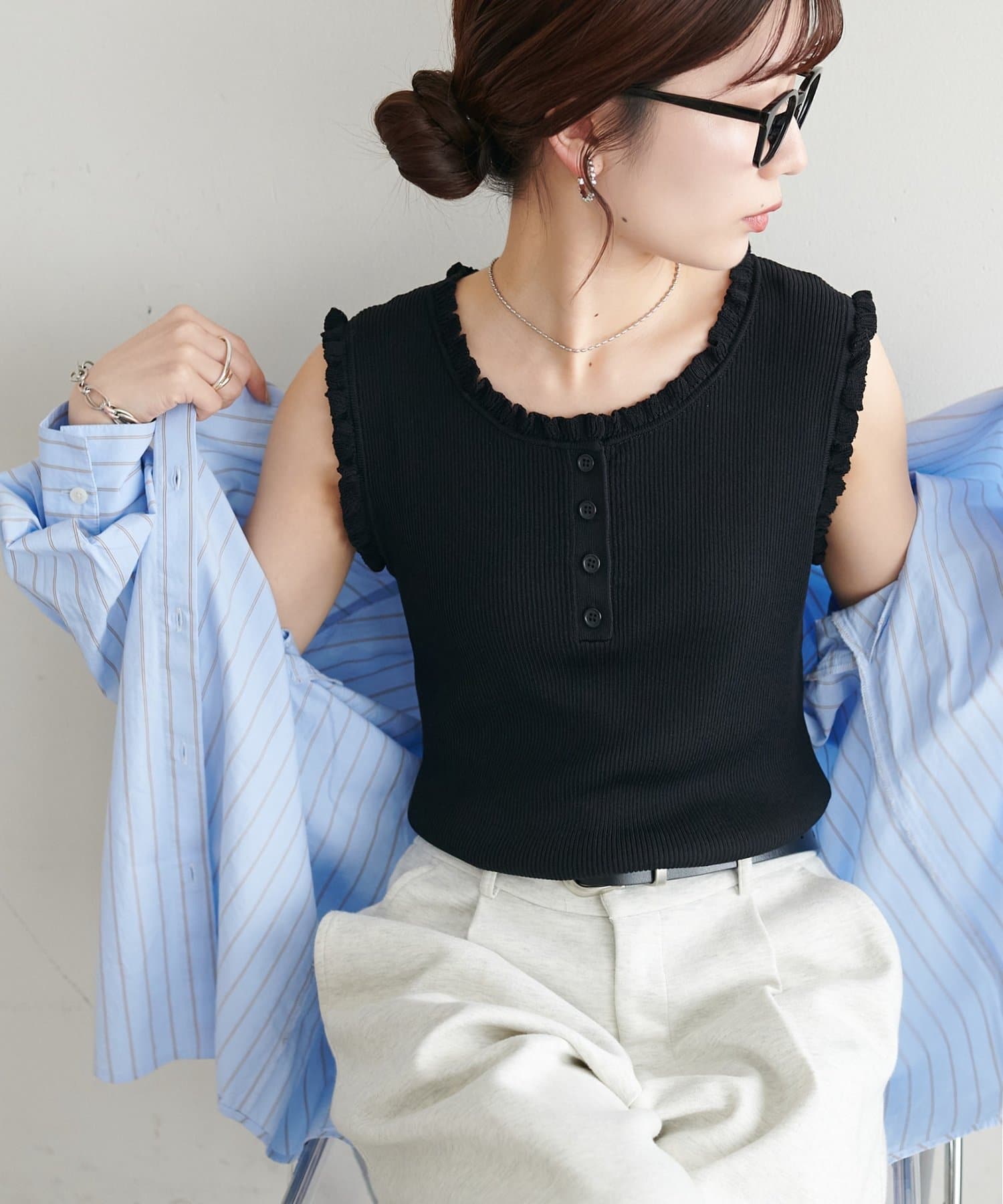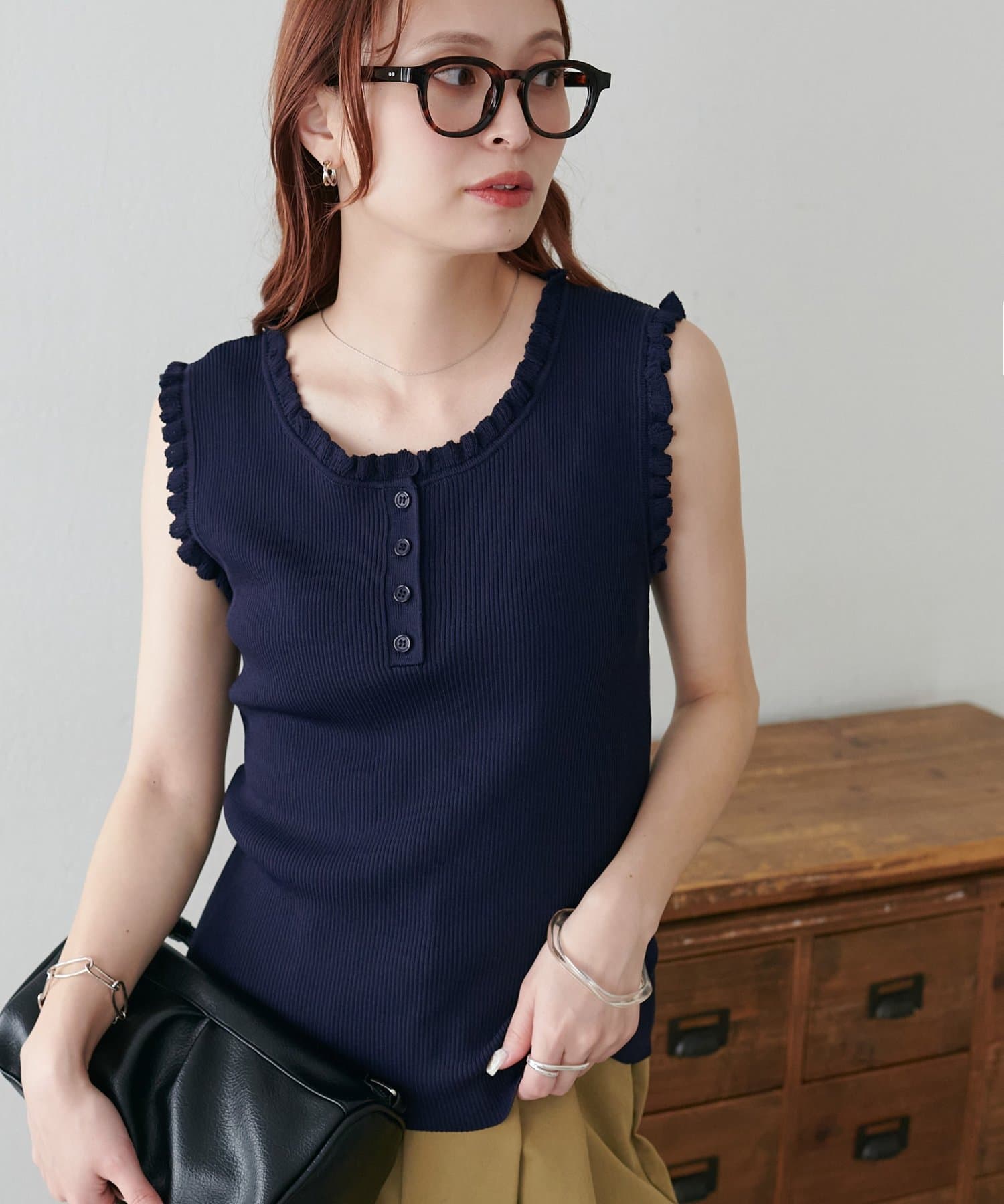 さりげないフリルが大人可愛い、着回し力抜群のタンクトップ