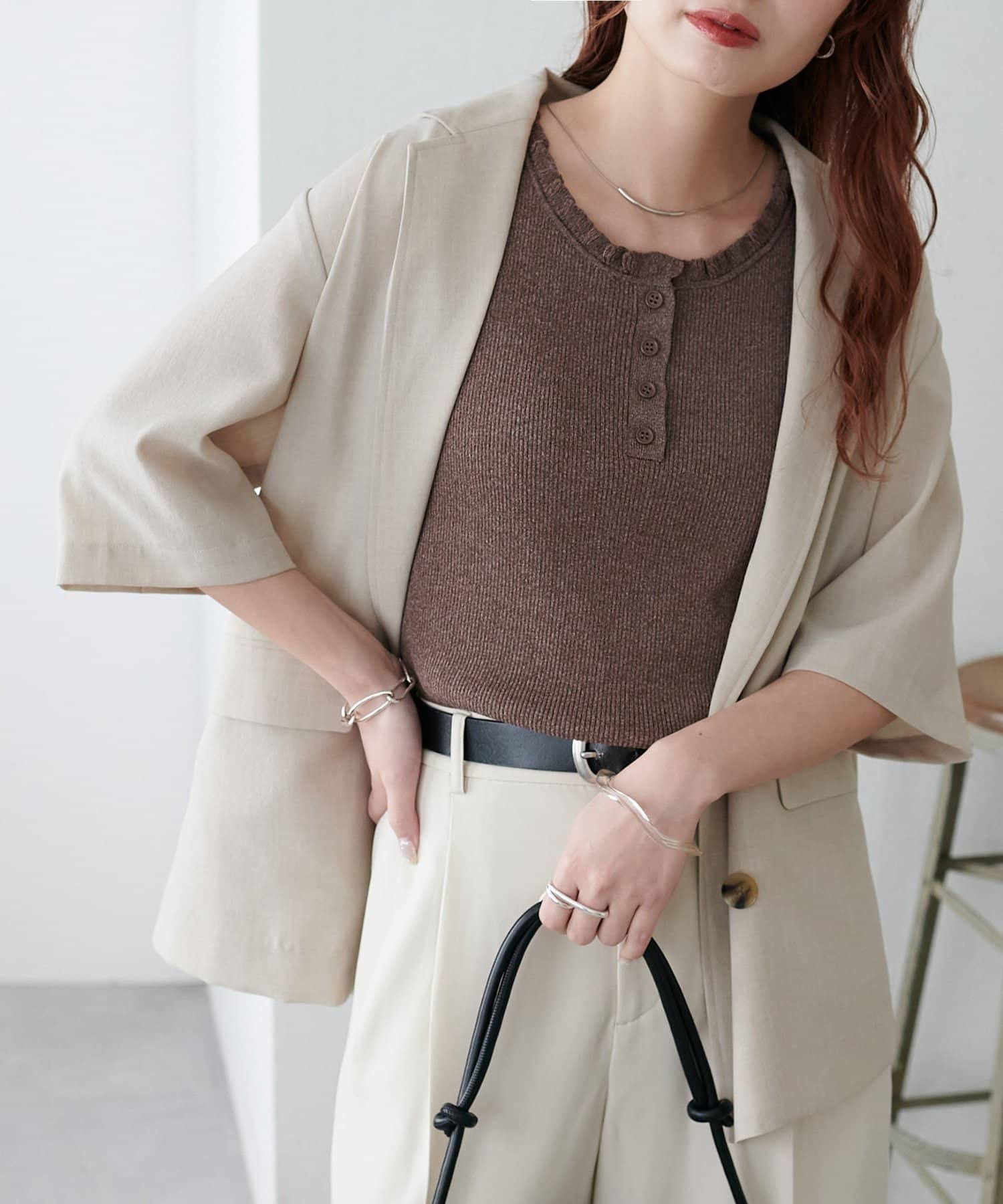 ・顔周りをすっきりと見せてくれるヘンリーネックデザイン