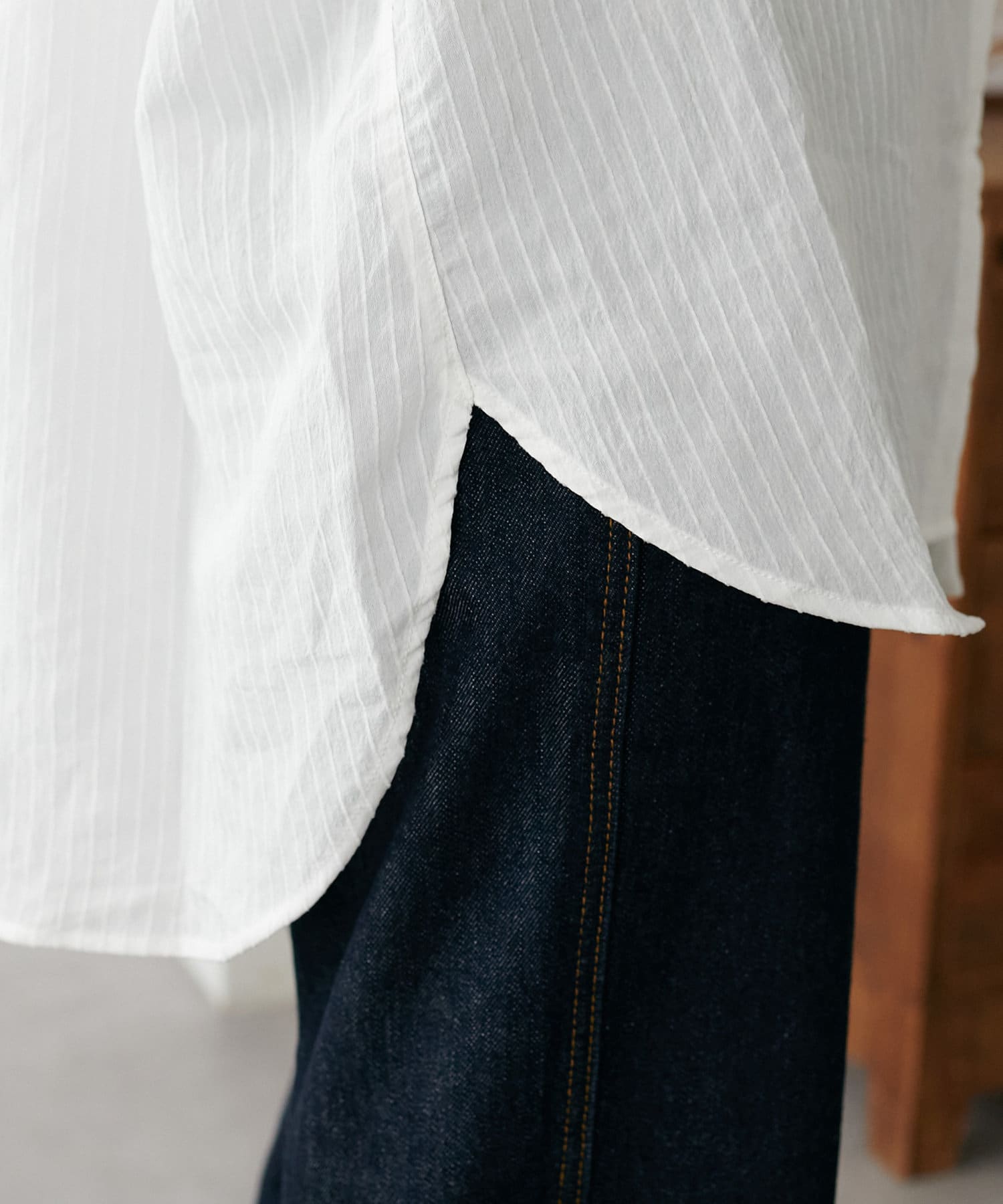 ・落ち感のある柔らかな生地、さらりとした肌触りで、シーズンを問わず快適に着られる軽やかな素材感