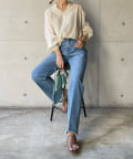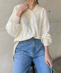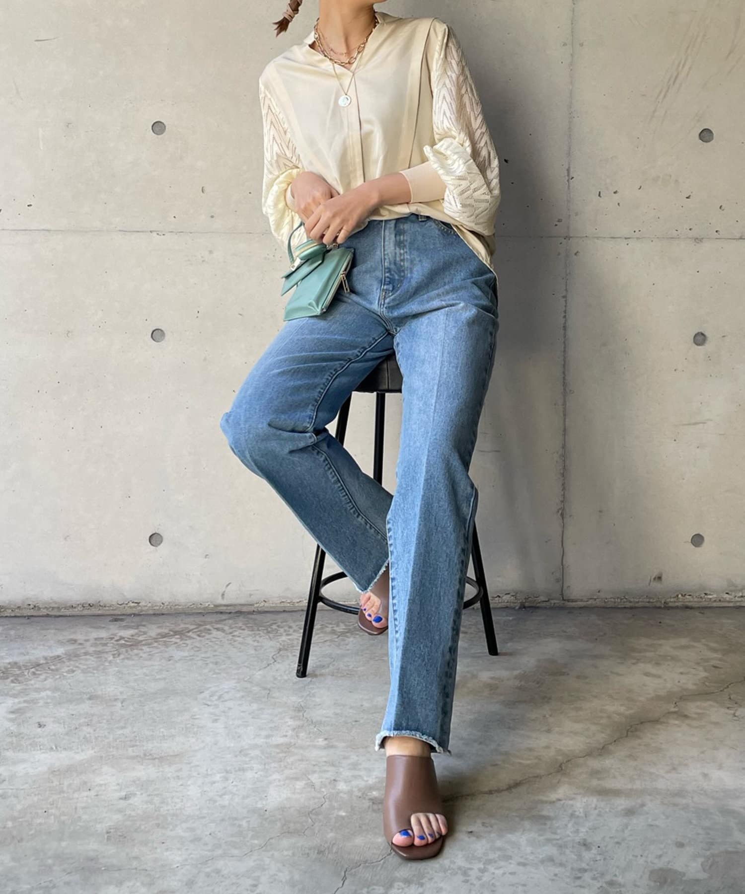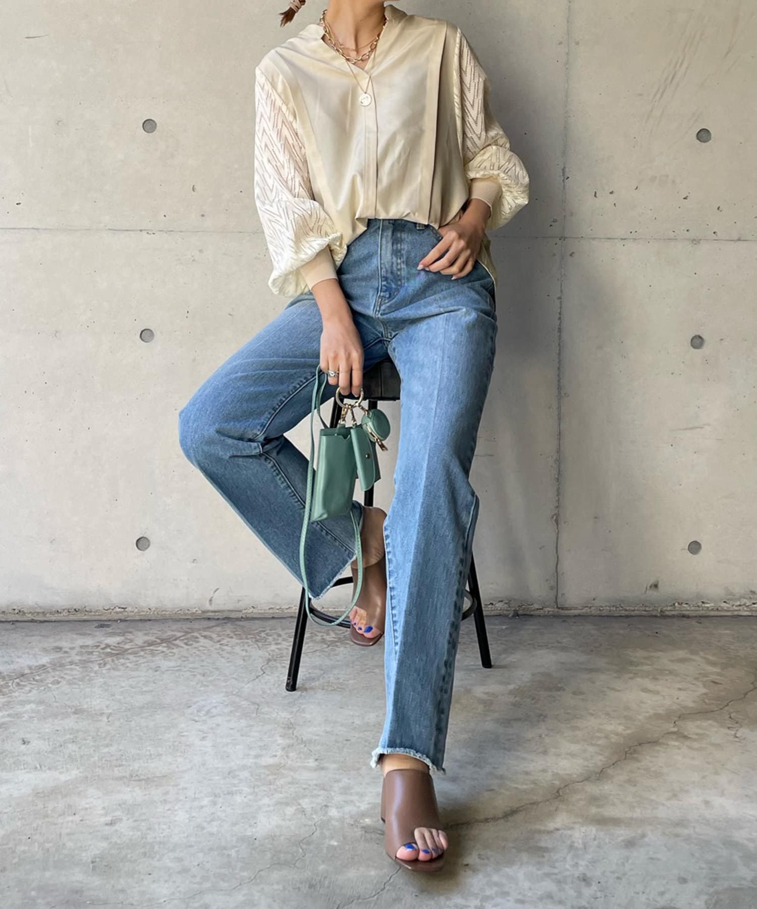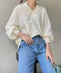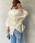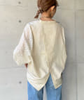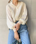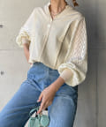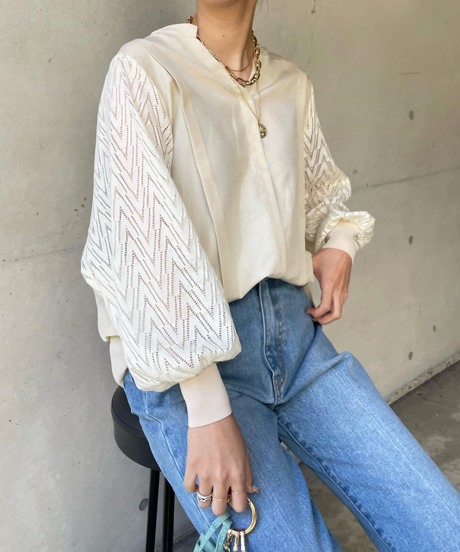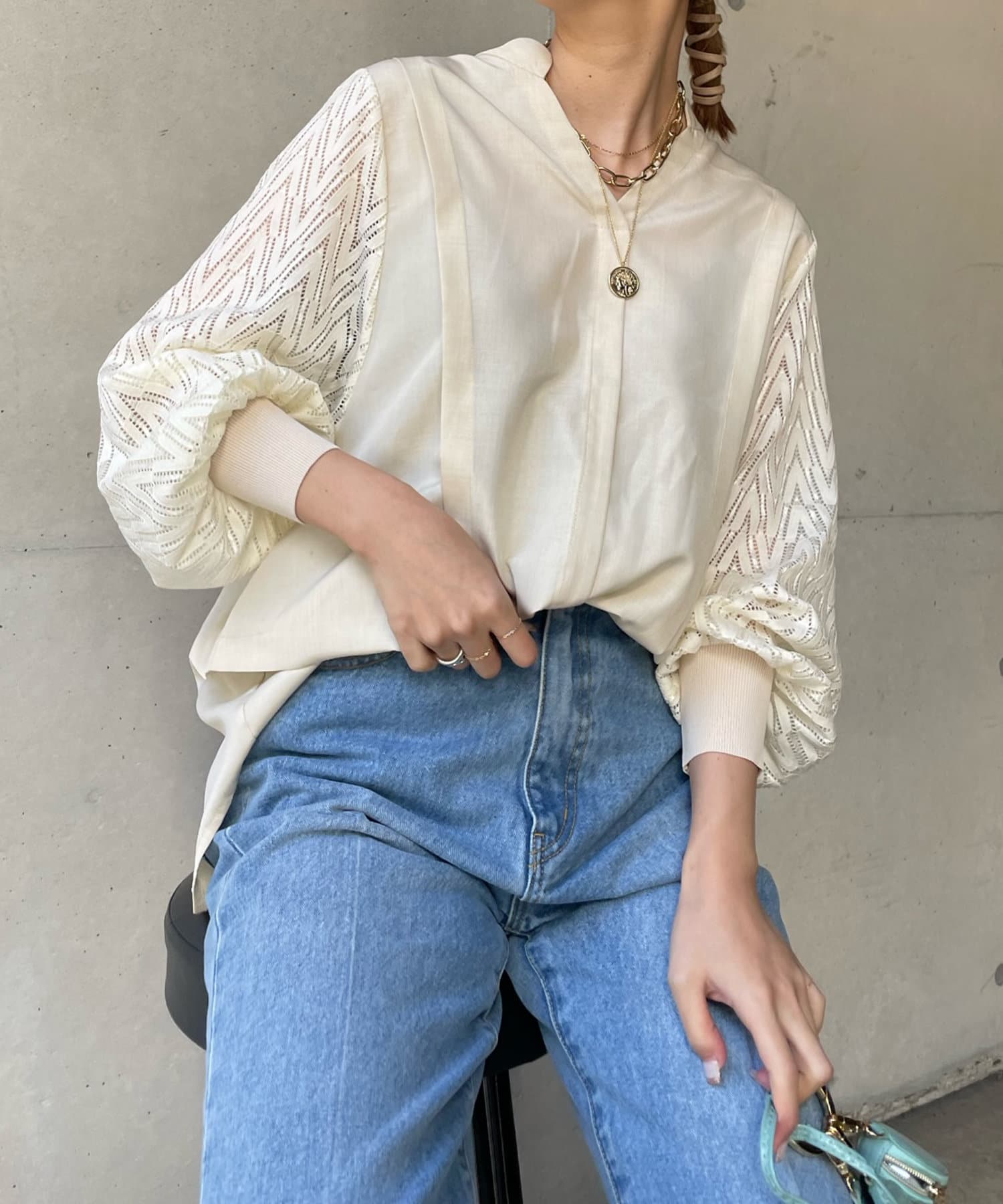 また、お袖のみレース素材に切り替えることで抜け感のある印象に。甘くなり過ぎないレースの編地なので、大人らしく着て頂けますよ◎
