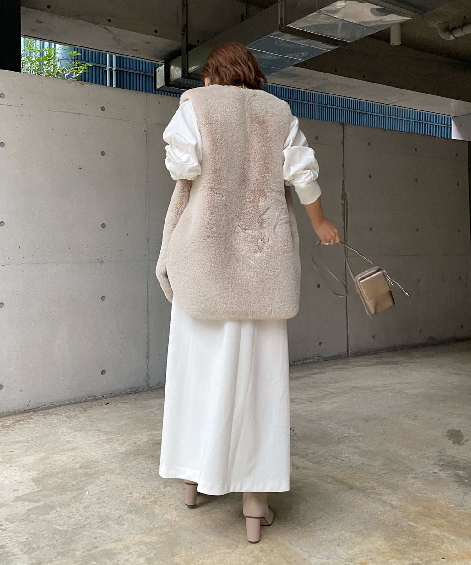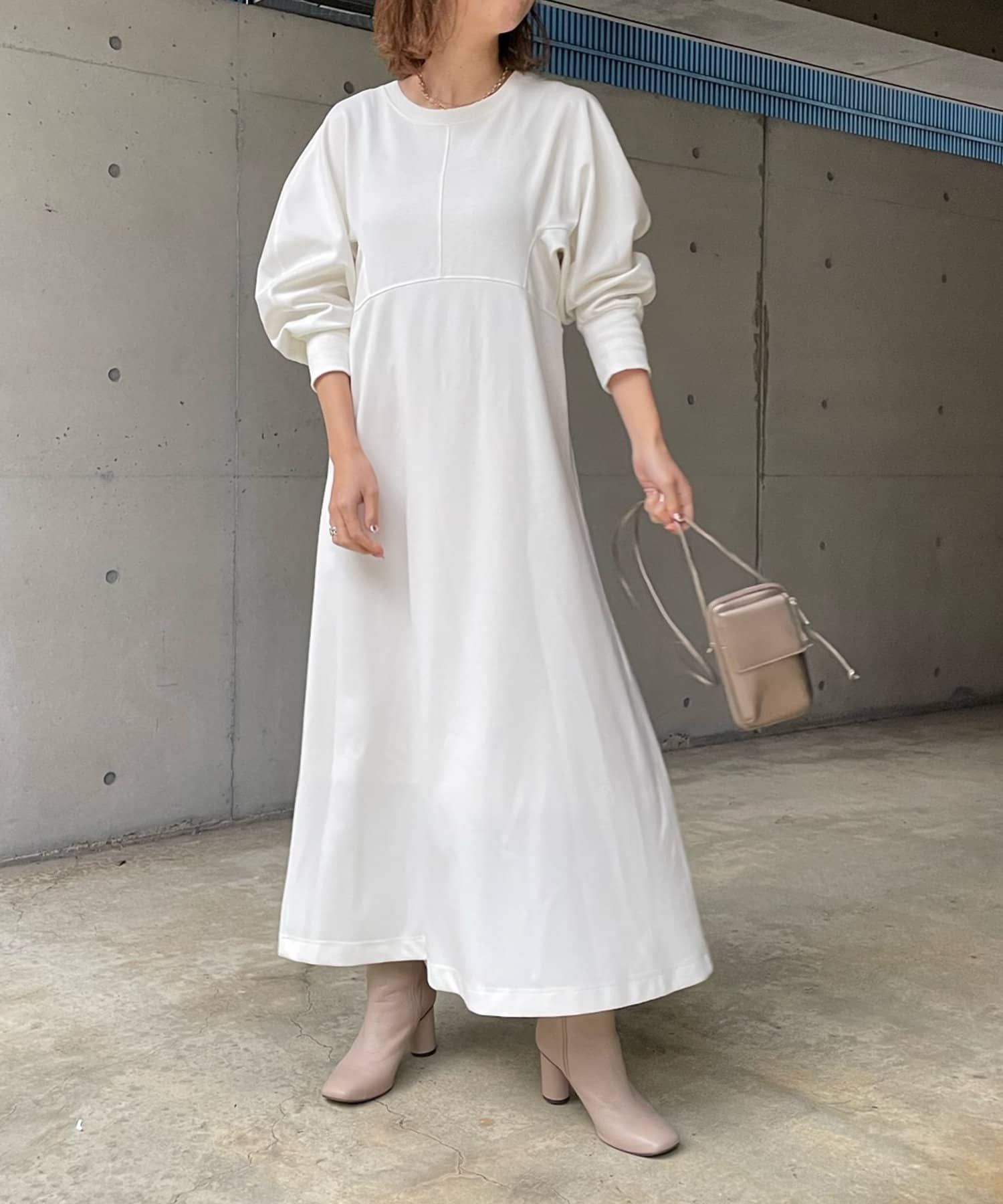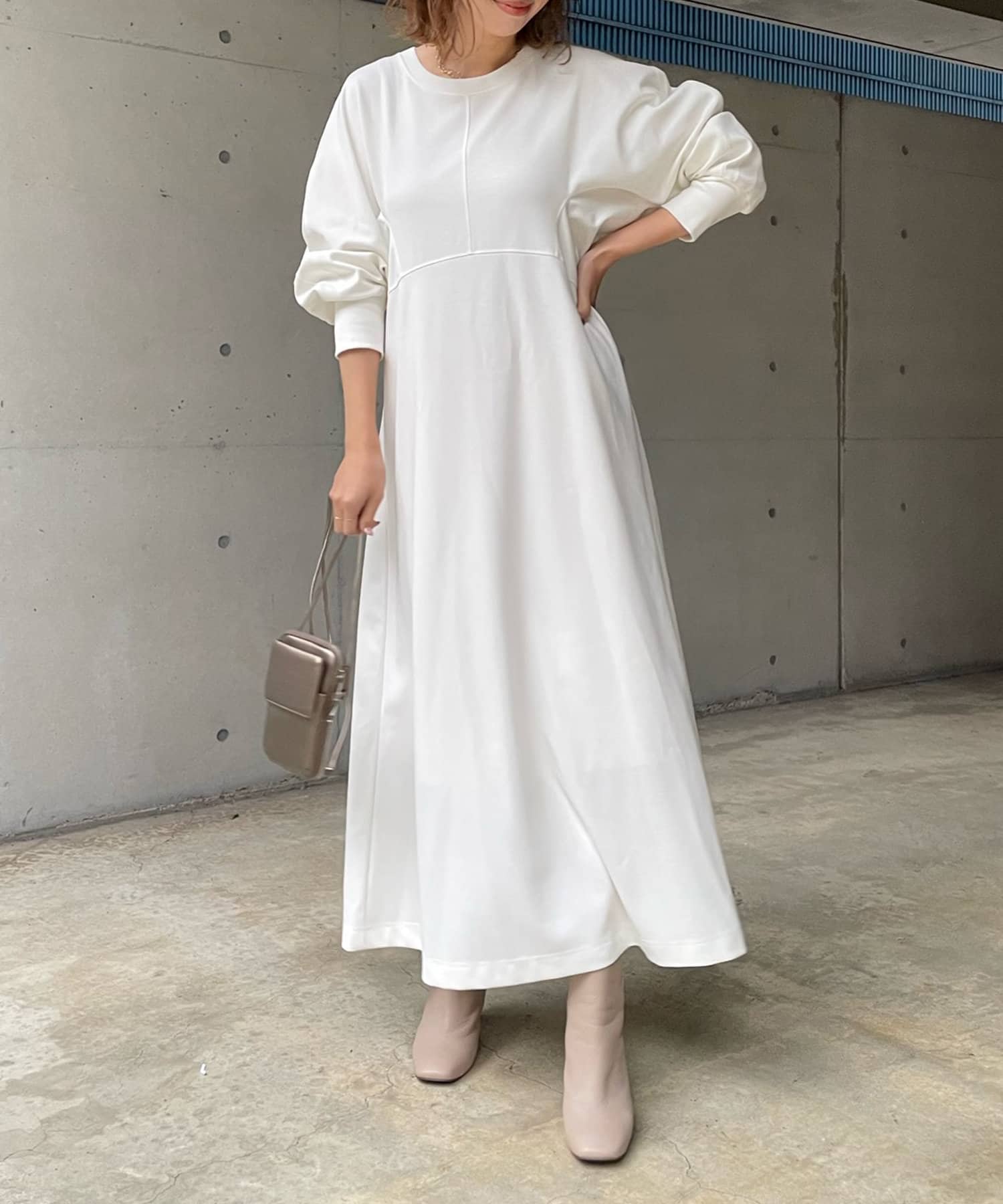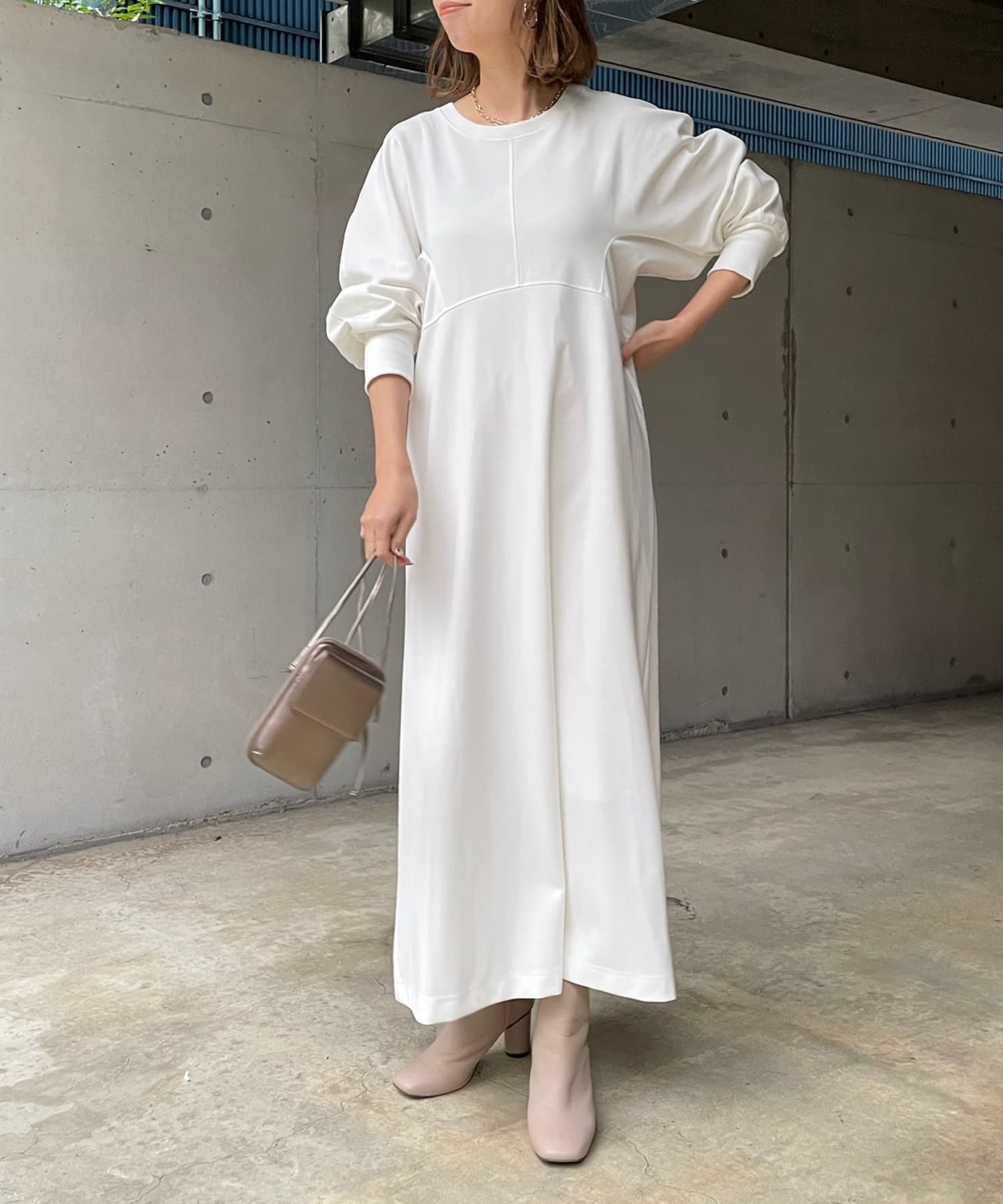 また、ウエスト高めの位置で切り替えラインを入れることで、ロング丈ながらもスタイルアップできるのが嬉しいポイントです◎