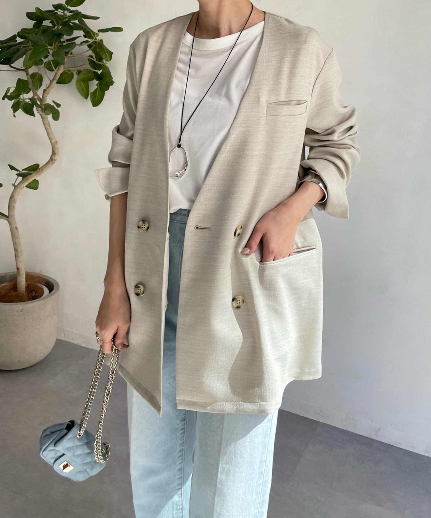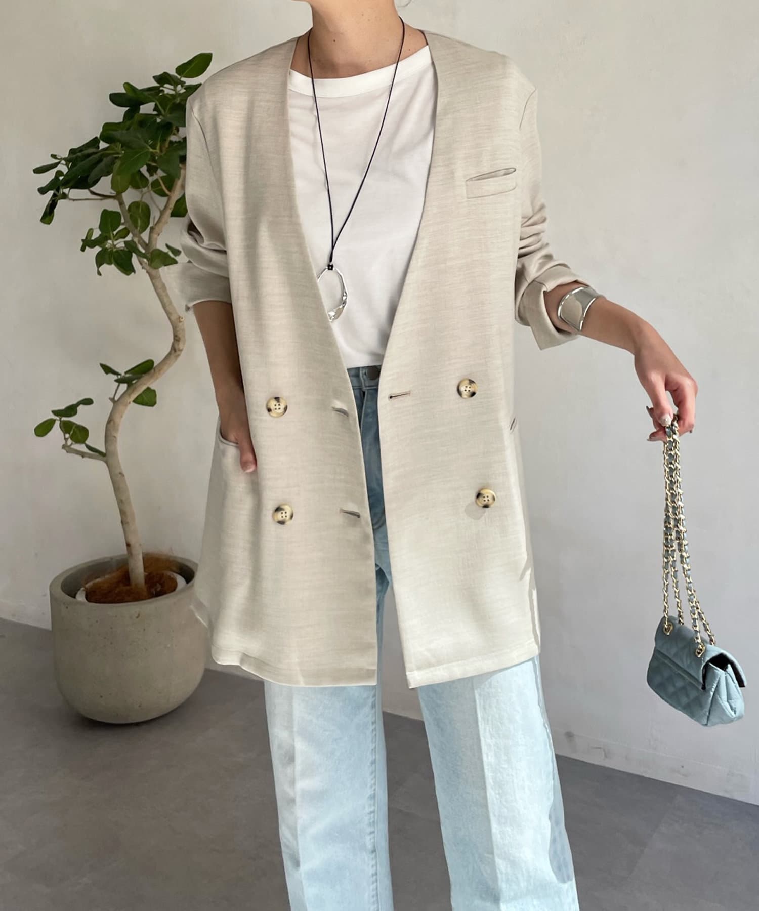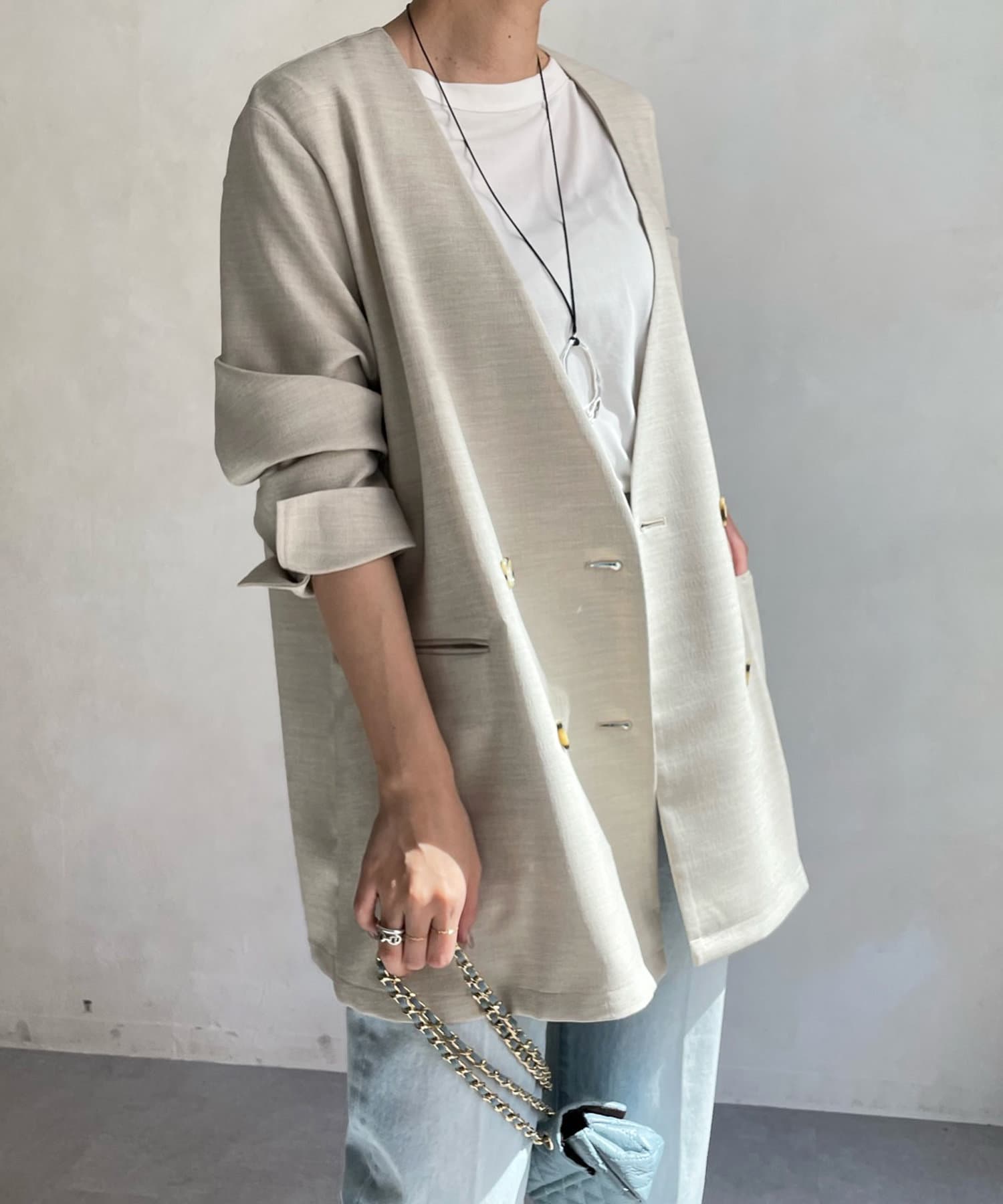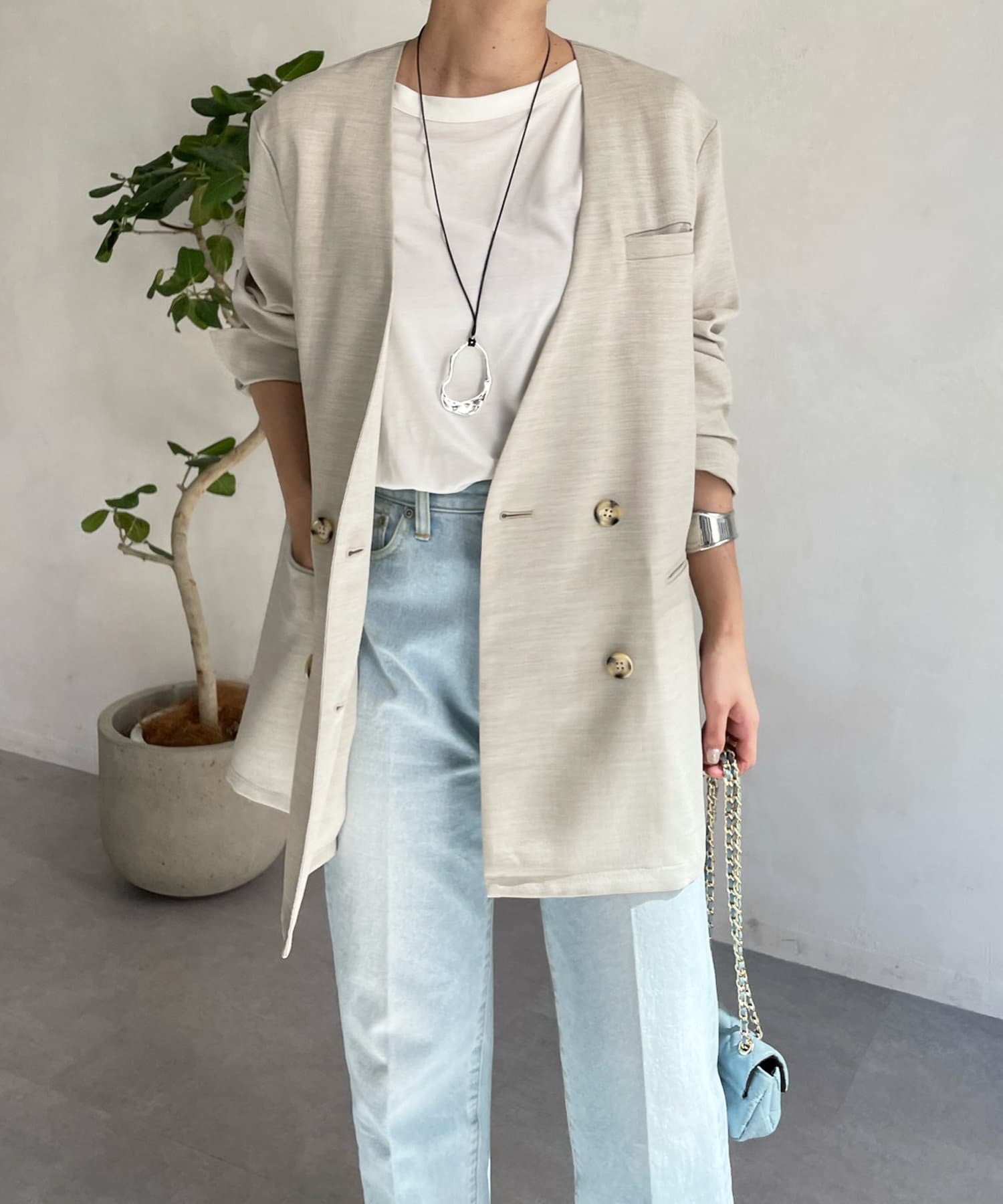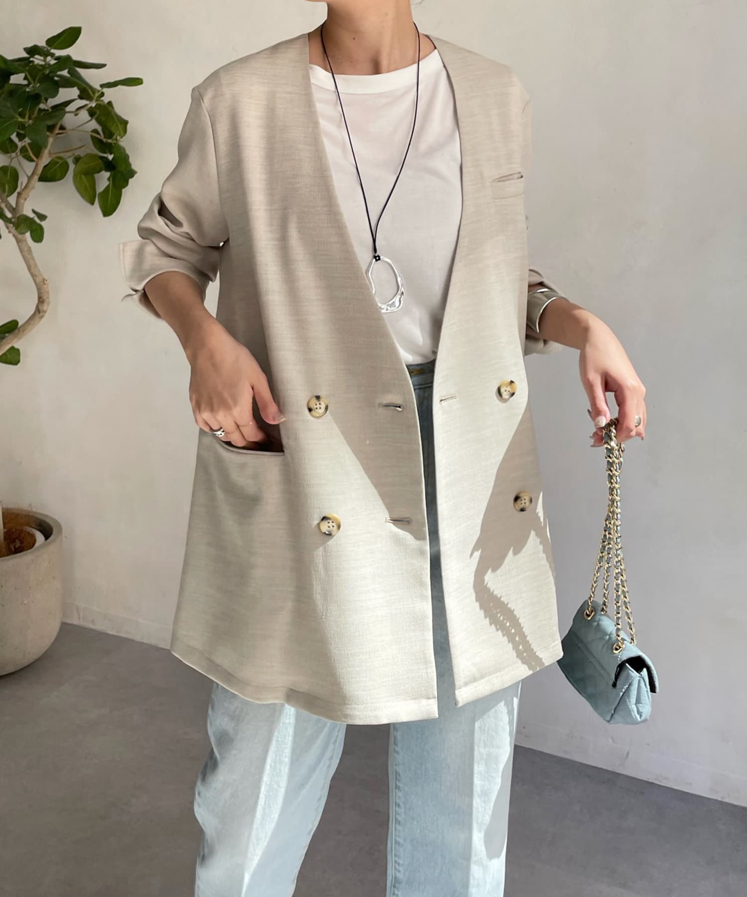 顔周りをすっきりと、そして春らしさをぐっと上げてくれるノーカラージャケット。
