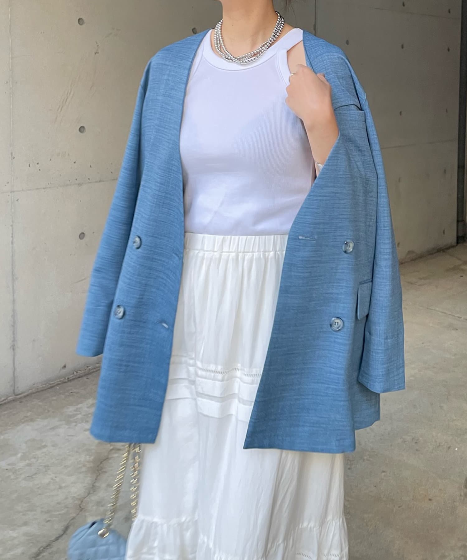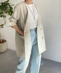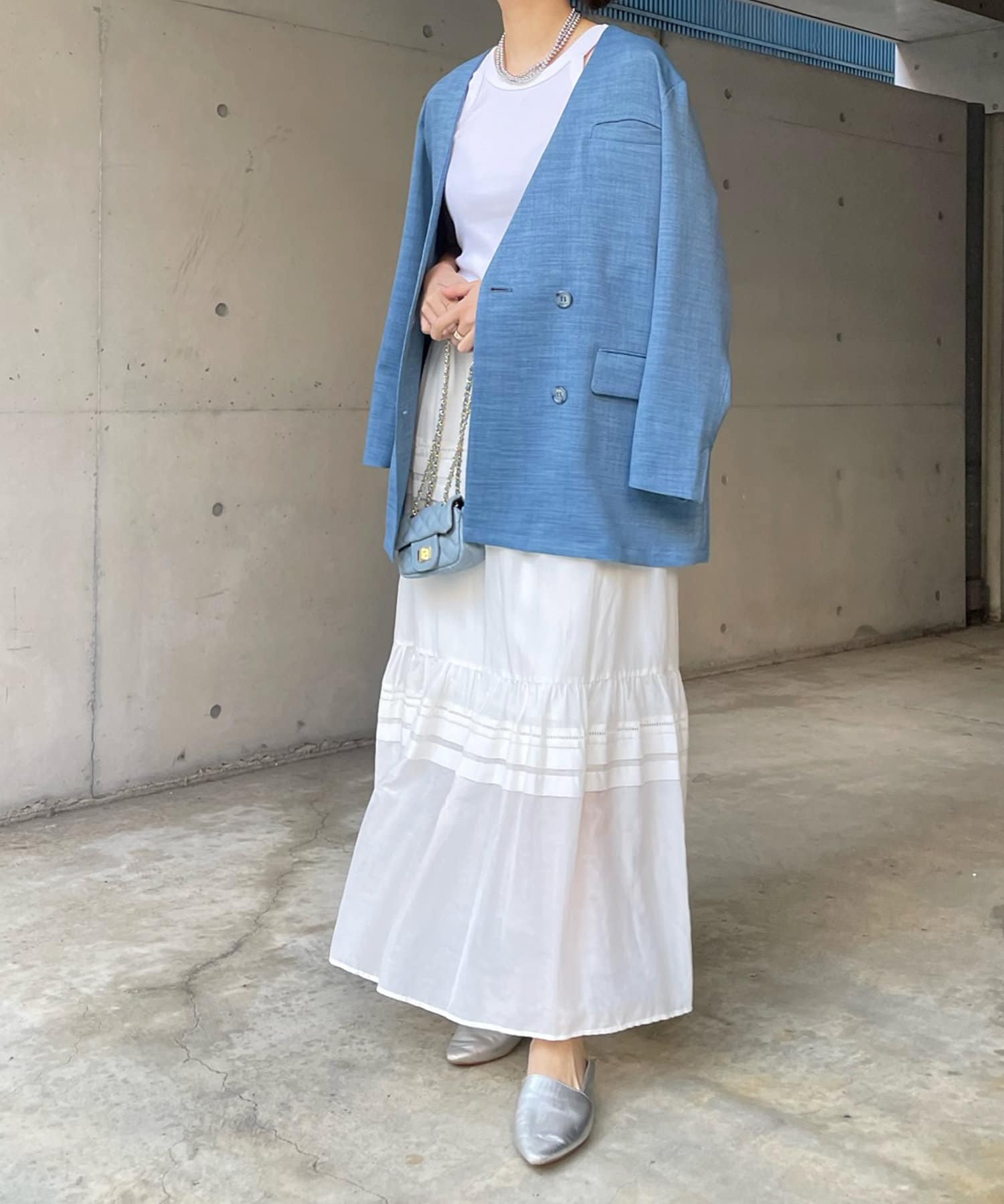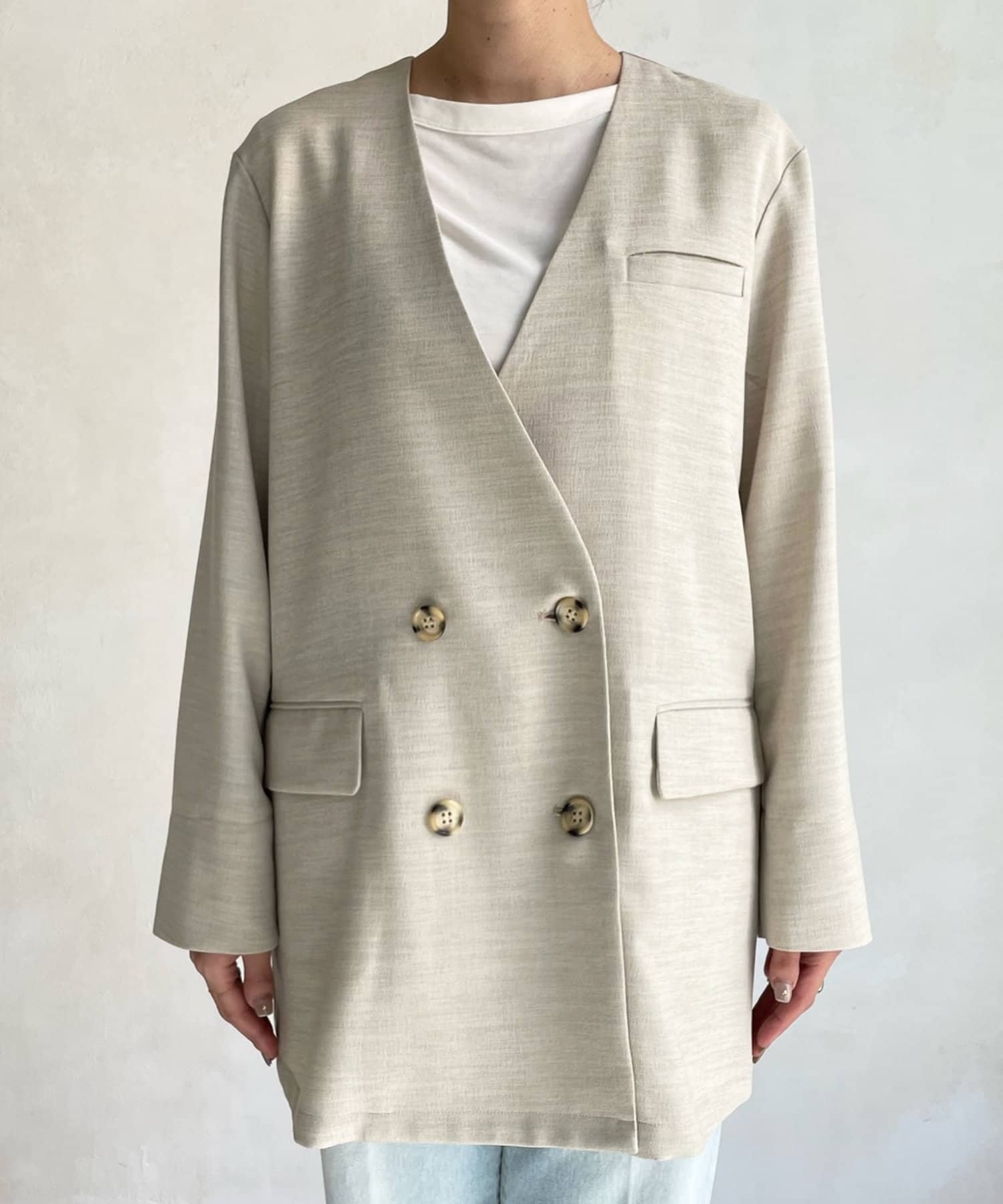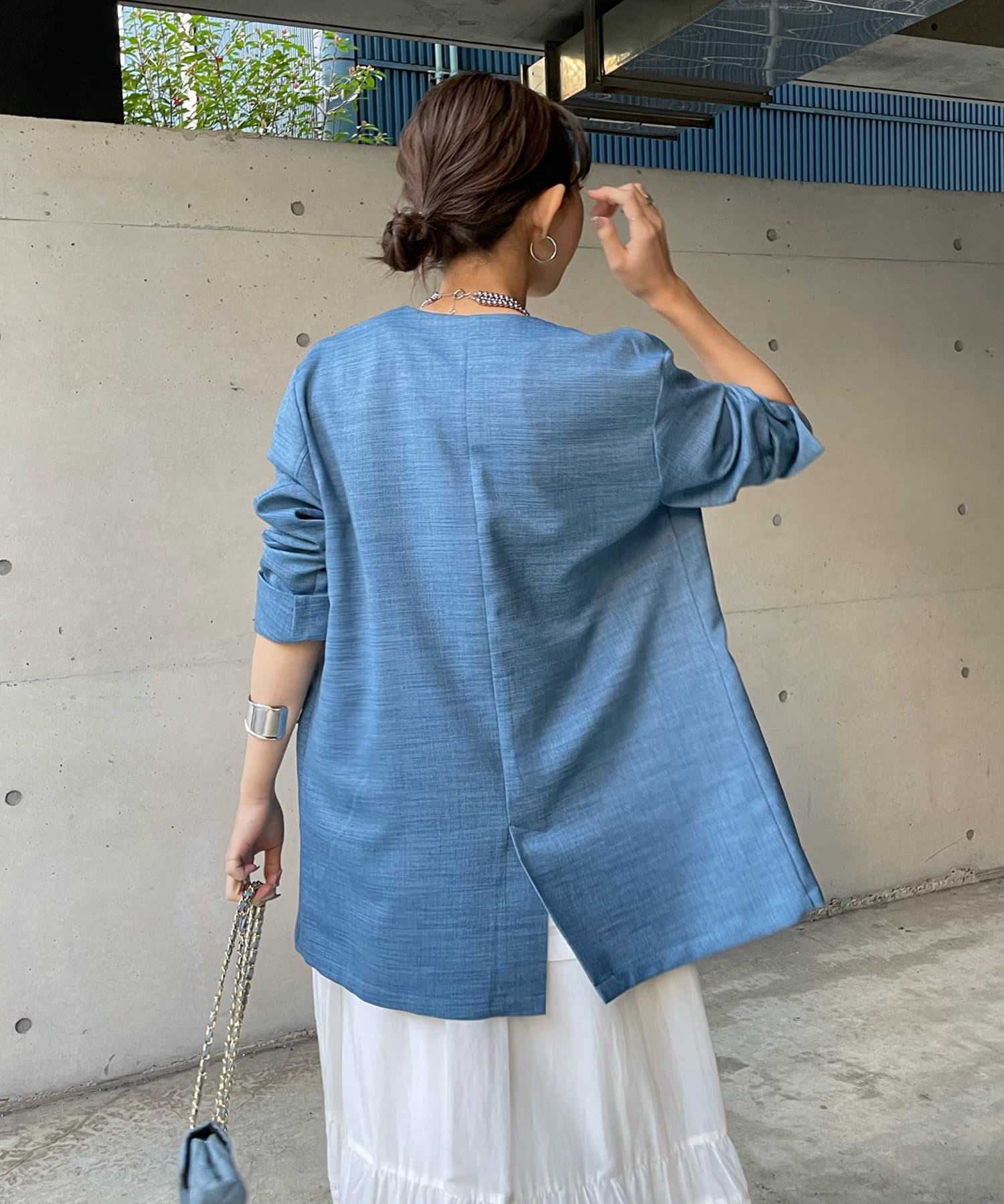 顔周りをすっきりと、そして春らしさをぐっと上げてくれるノーカラージャケット。