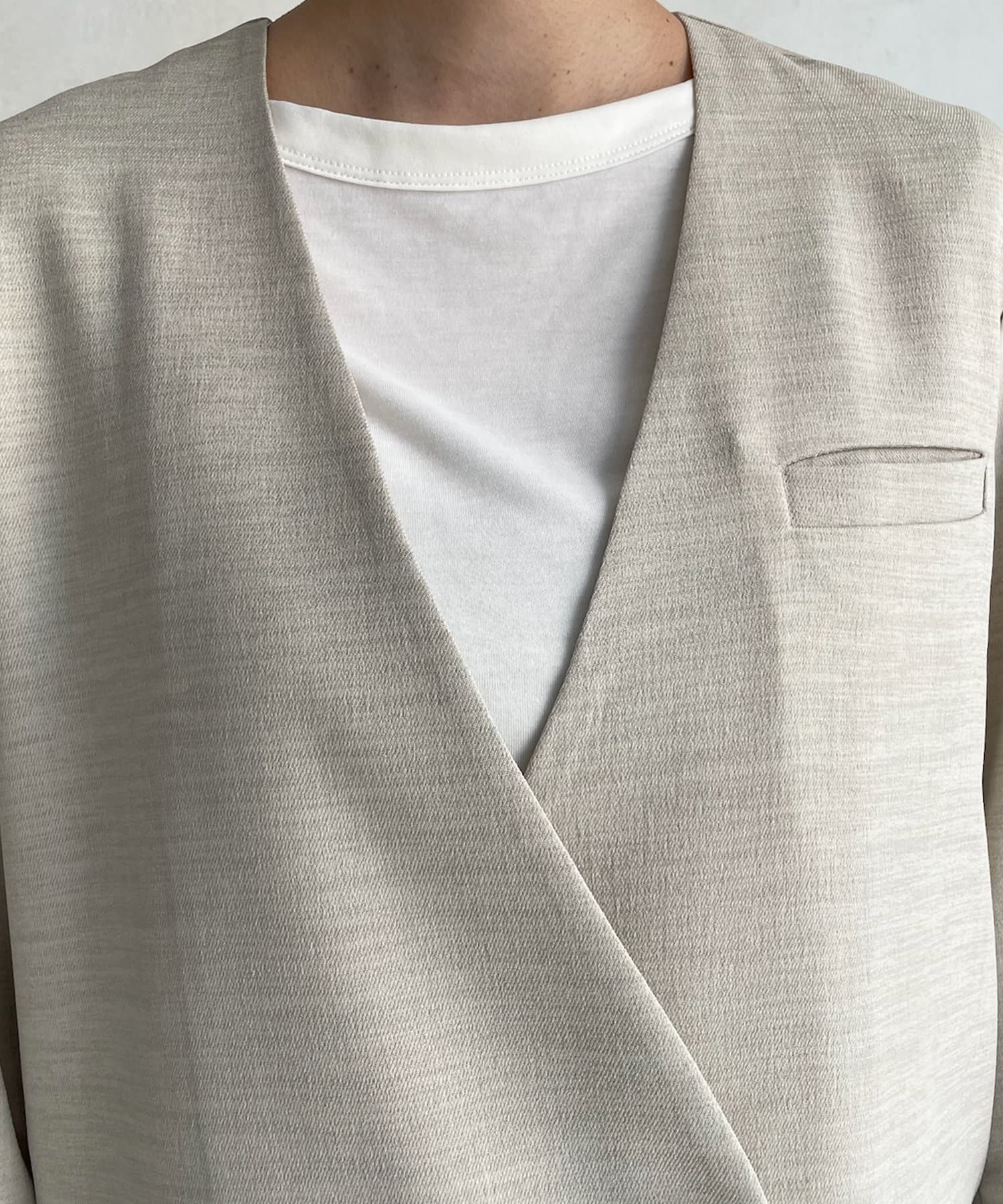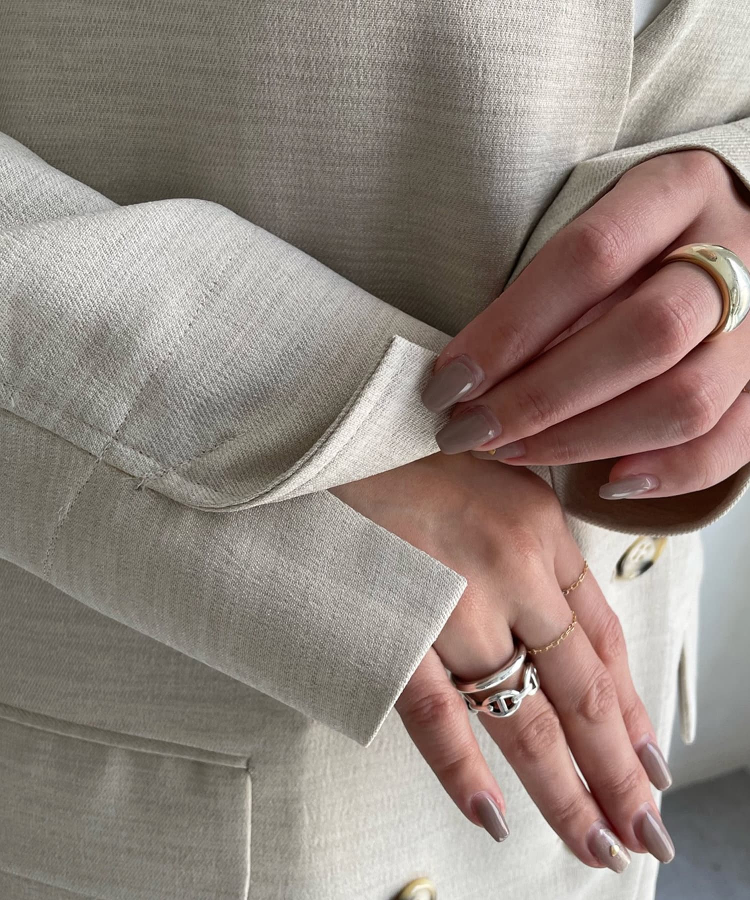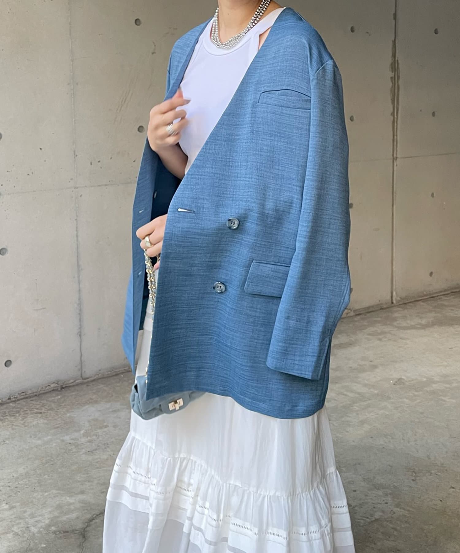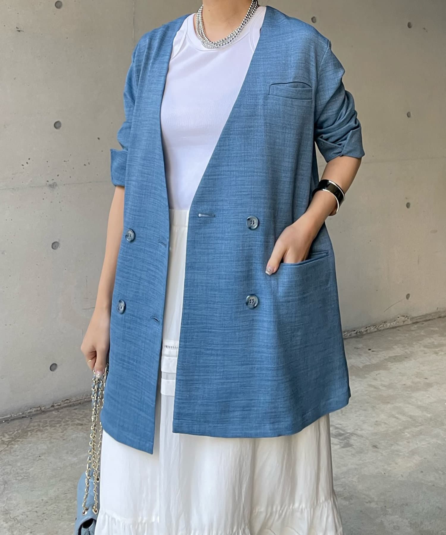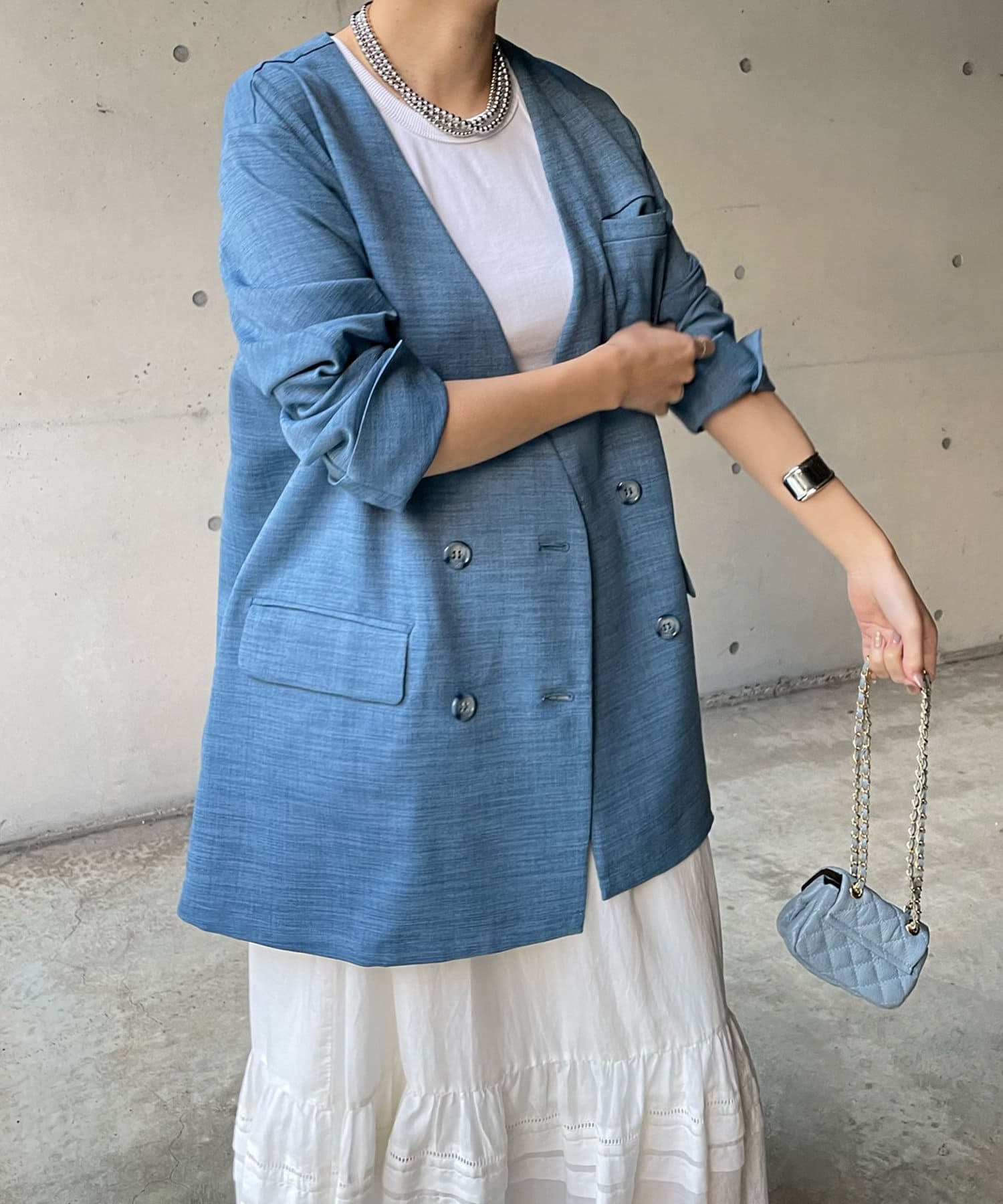 顔周りをすっきりと、そして春らしさをぐっと上げてくれるノーカラージャケット。