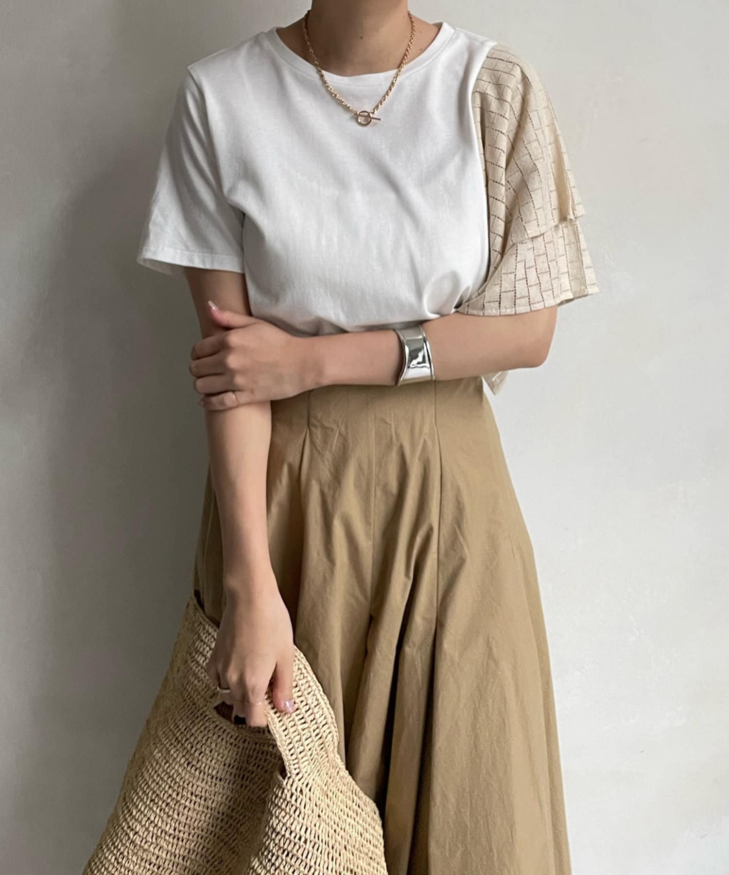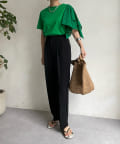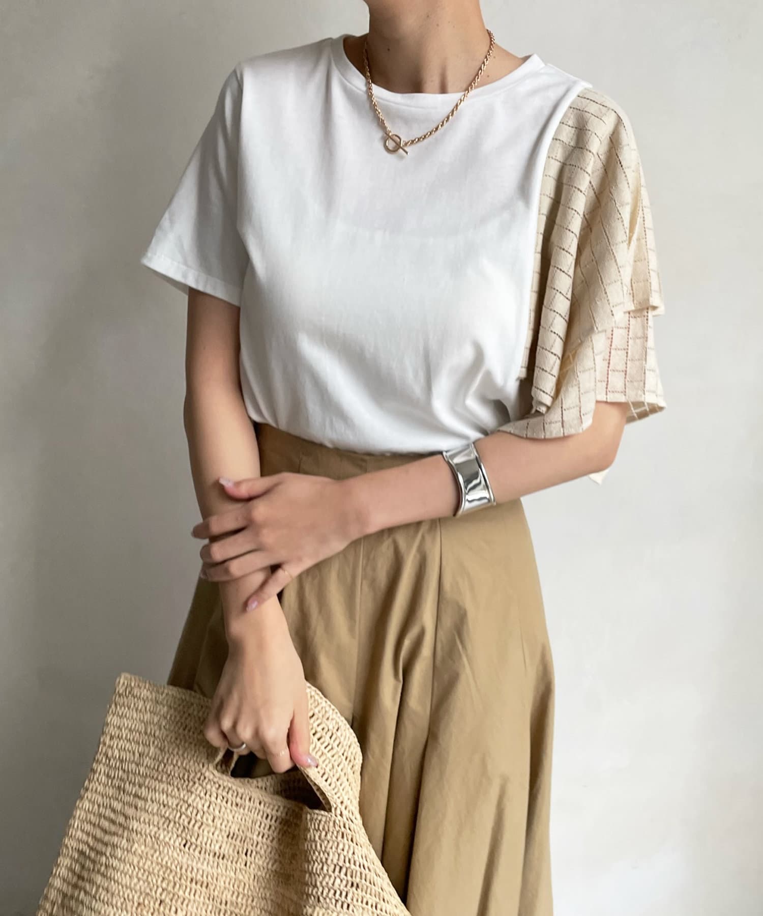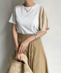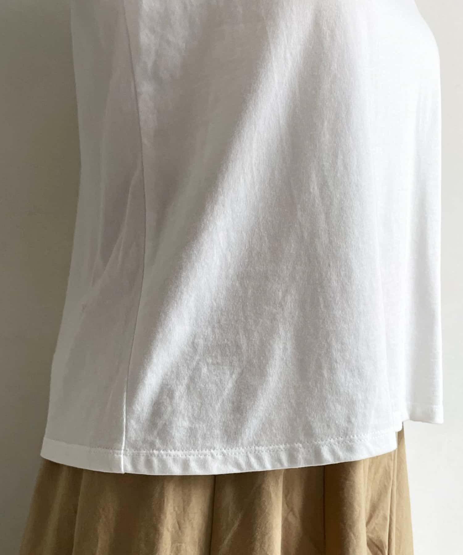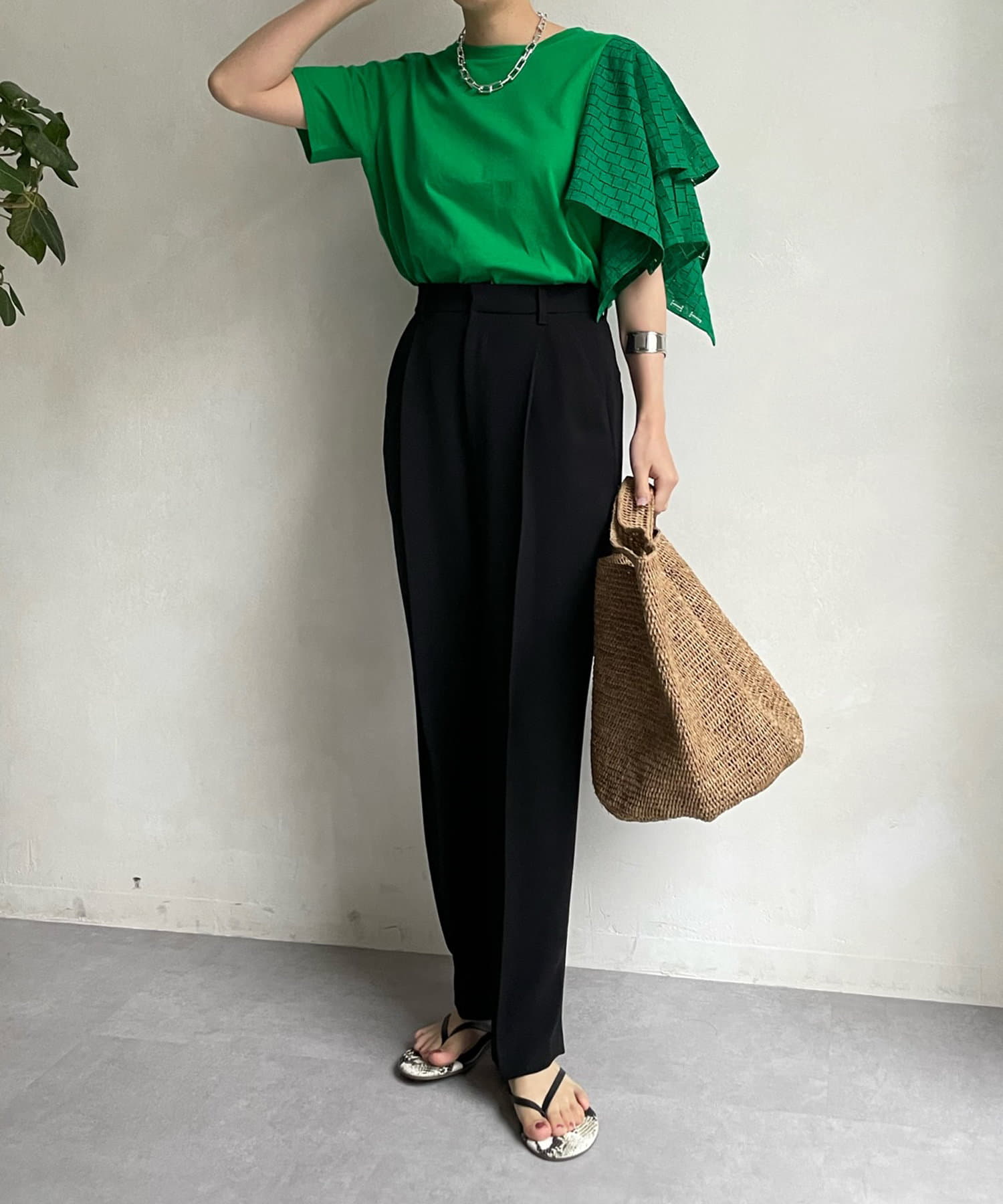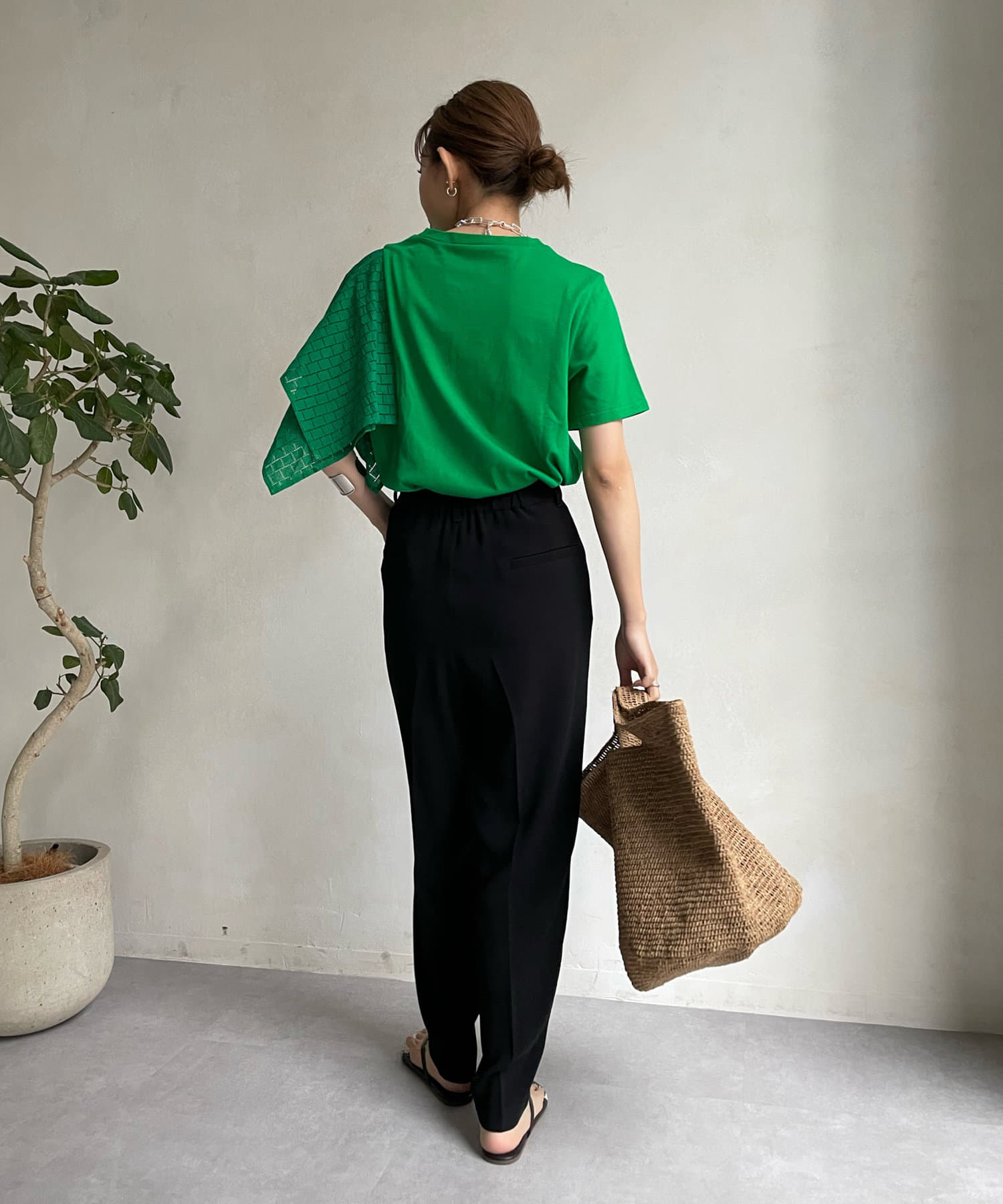 カットソー素材で程よくカジュアルな印象を与えてくれるので、スタイリングがバランス良く決まります。